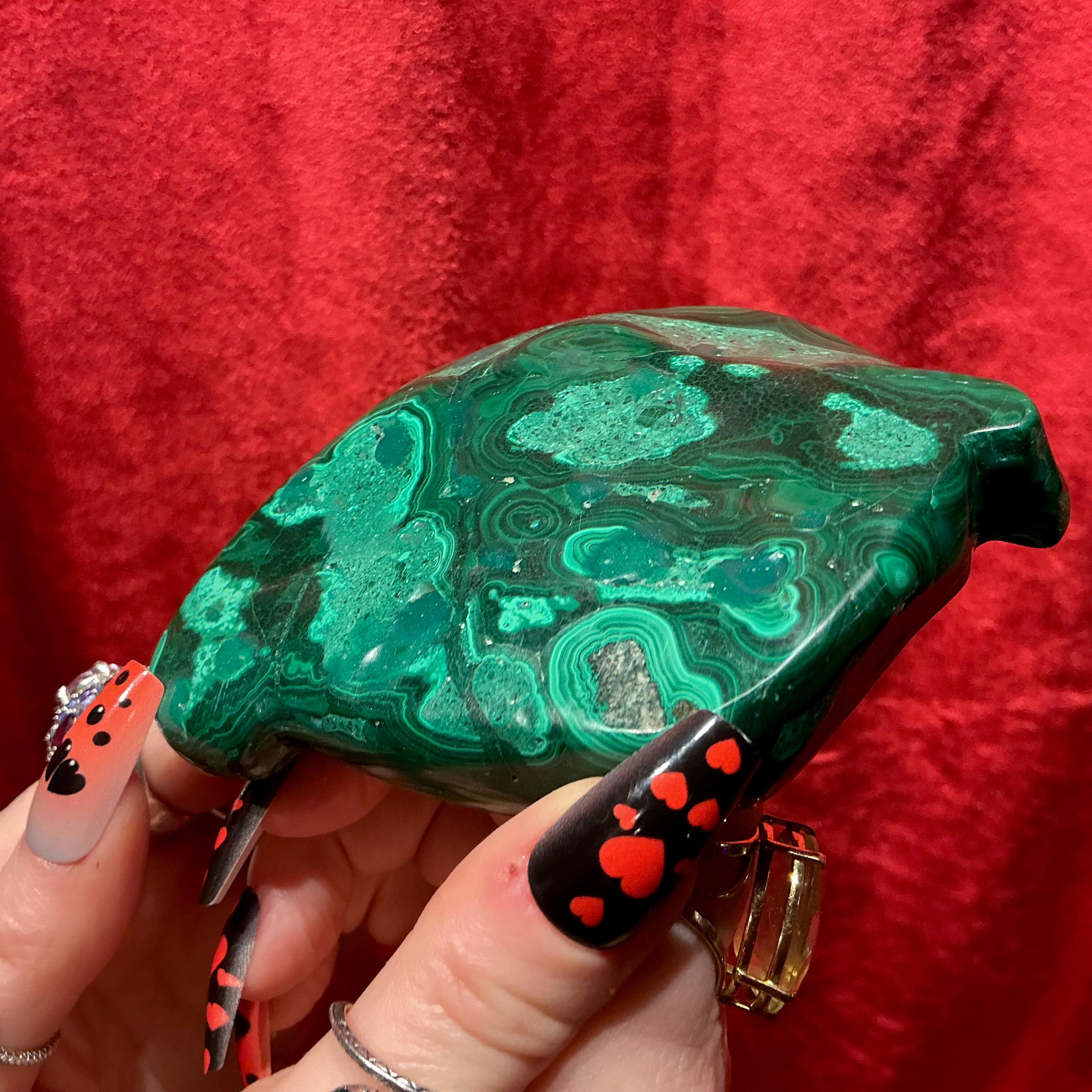 This piece of vintage Congo Malachite is so beautiful, so thick and its natural patina is not like the modern Malachite from China ~ its colors are so rich, and the detail of the stone is hand carved, making it a one-of-a-kind creation.