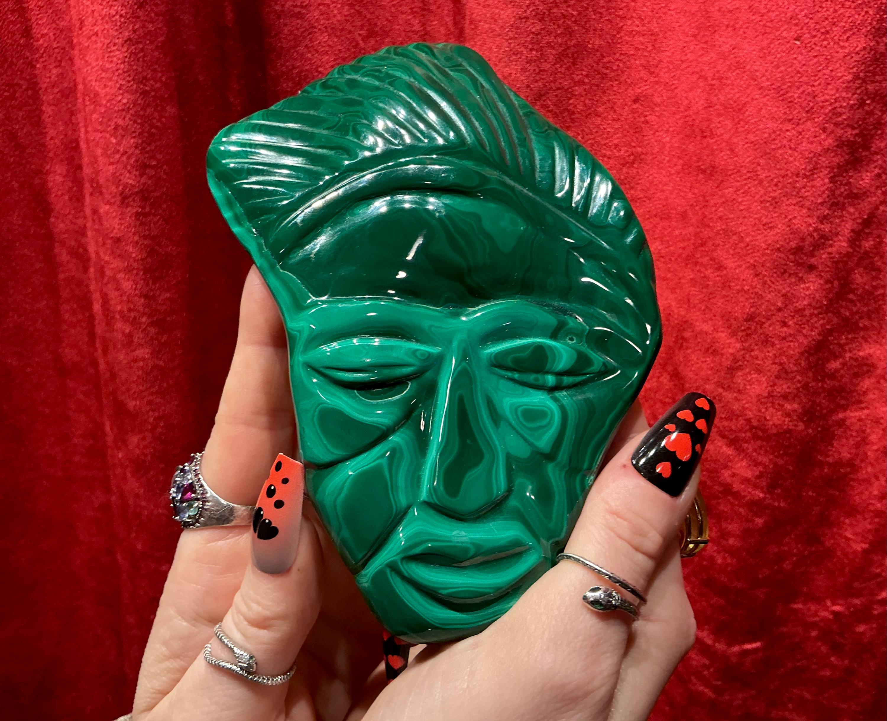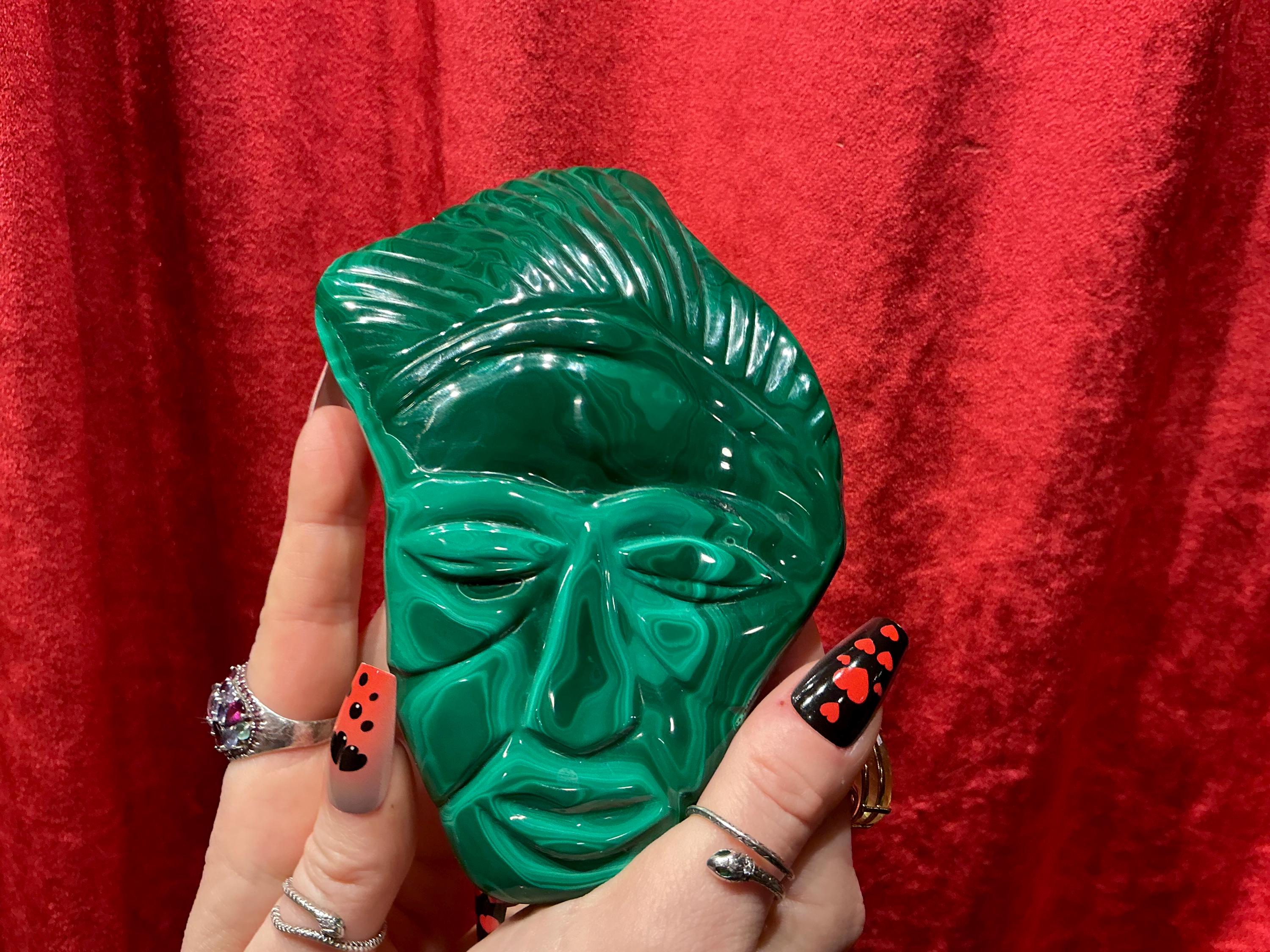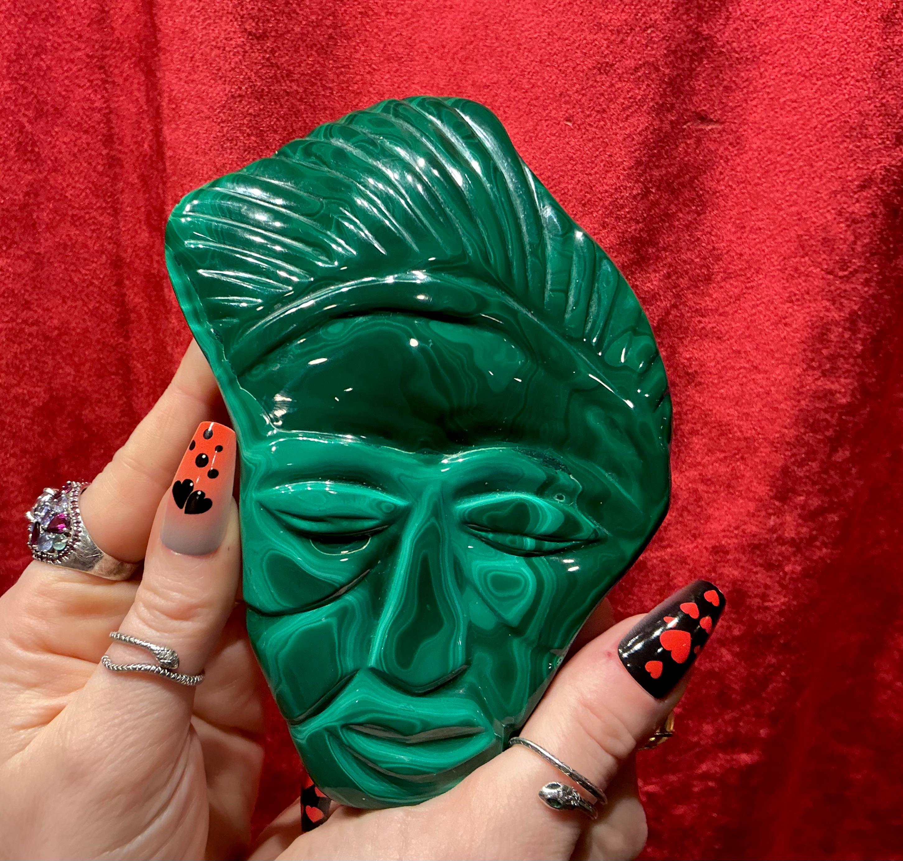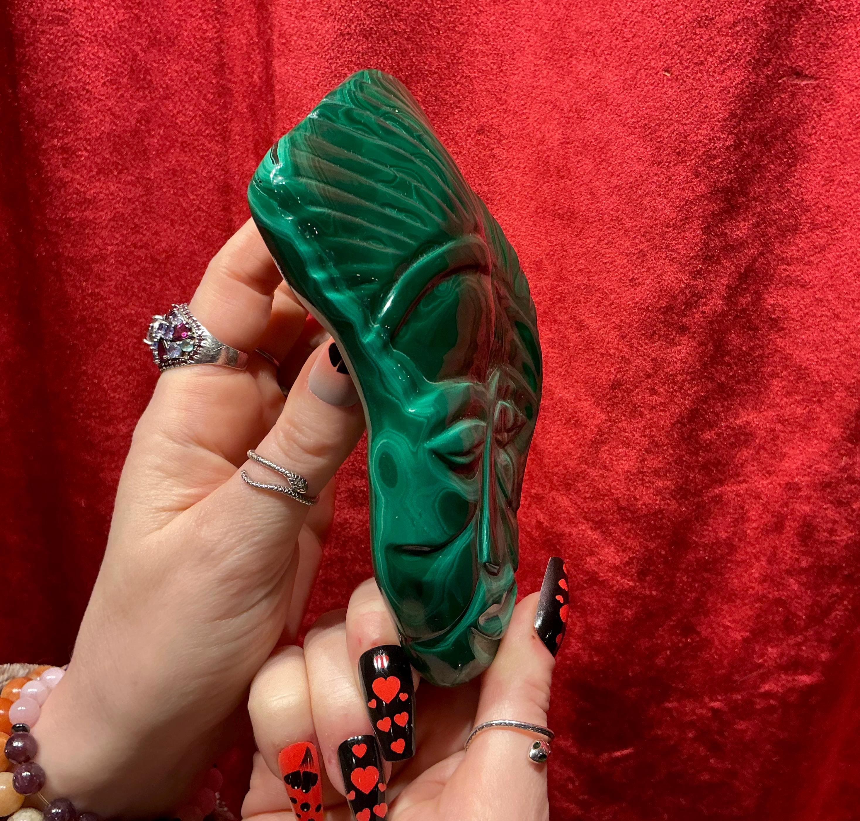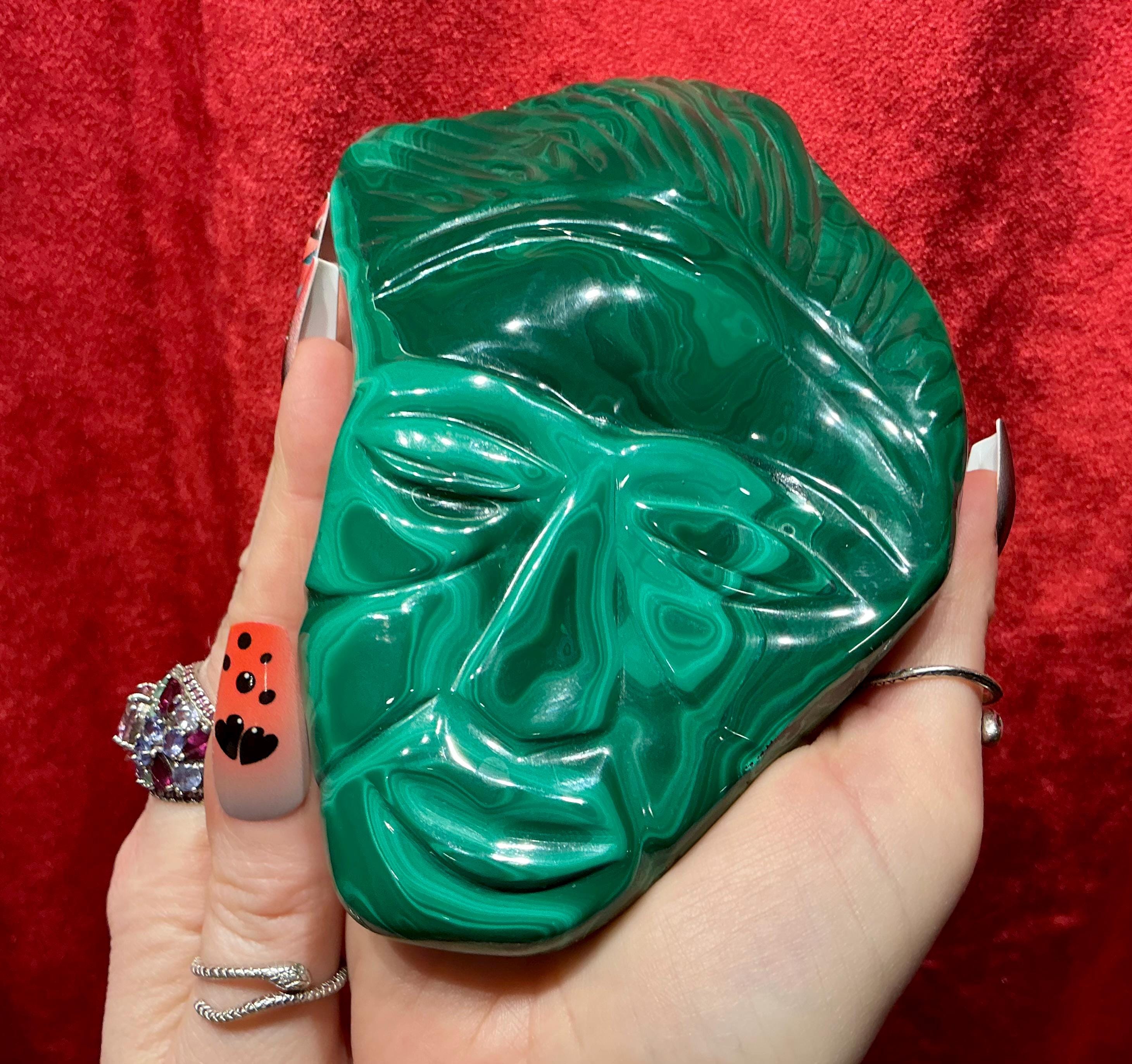 Malachite African Hand Carved Vintage Mask Large 1-pound 3 ounce ~ 6" Long ~ Stunning Museum Display Specimen ~ Gorgeous Green Mineral ~ Bulls Eye Swirls ~ Crystal Décor