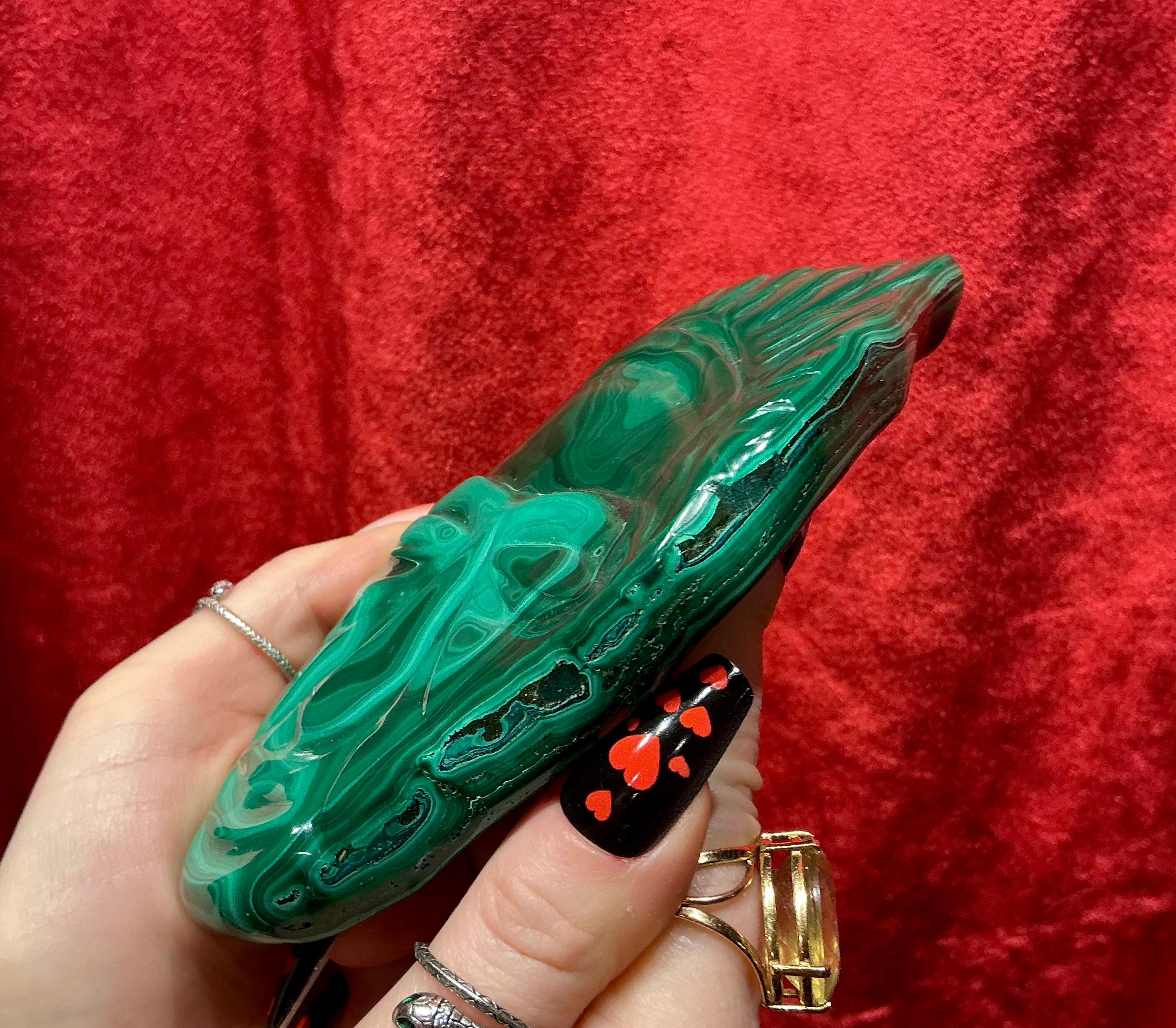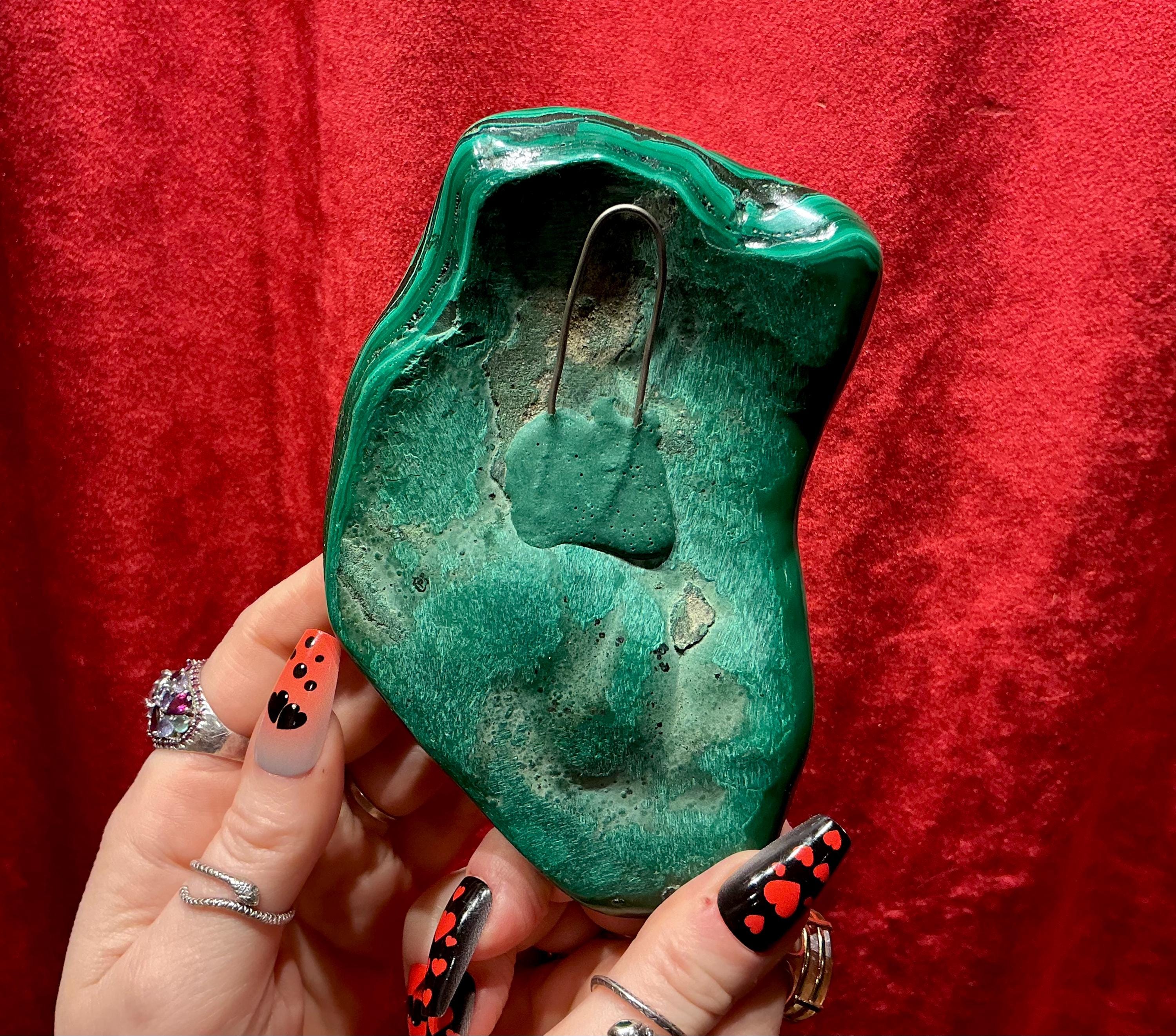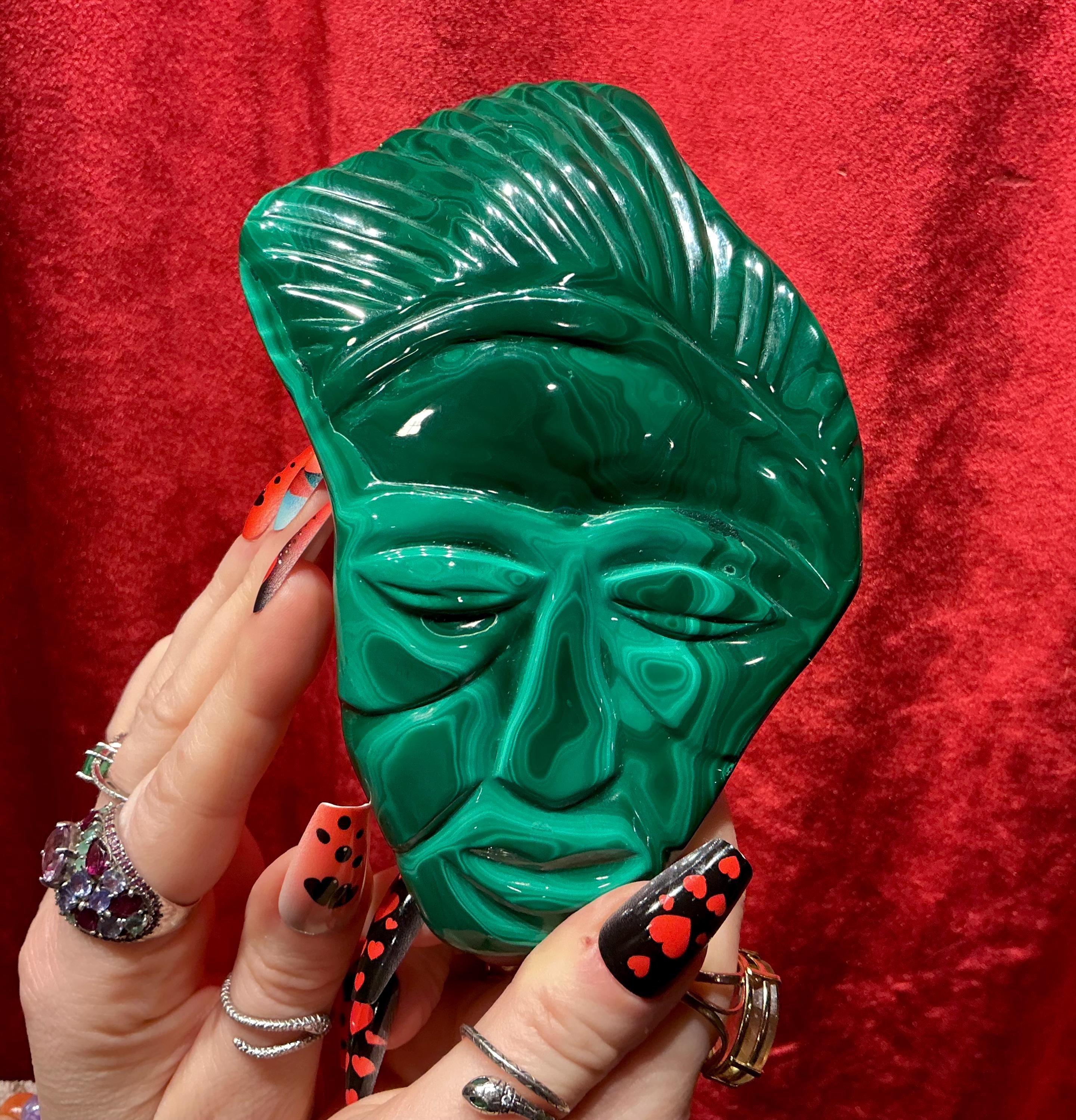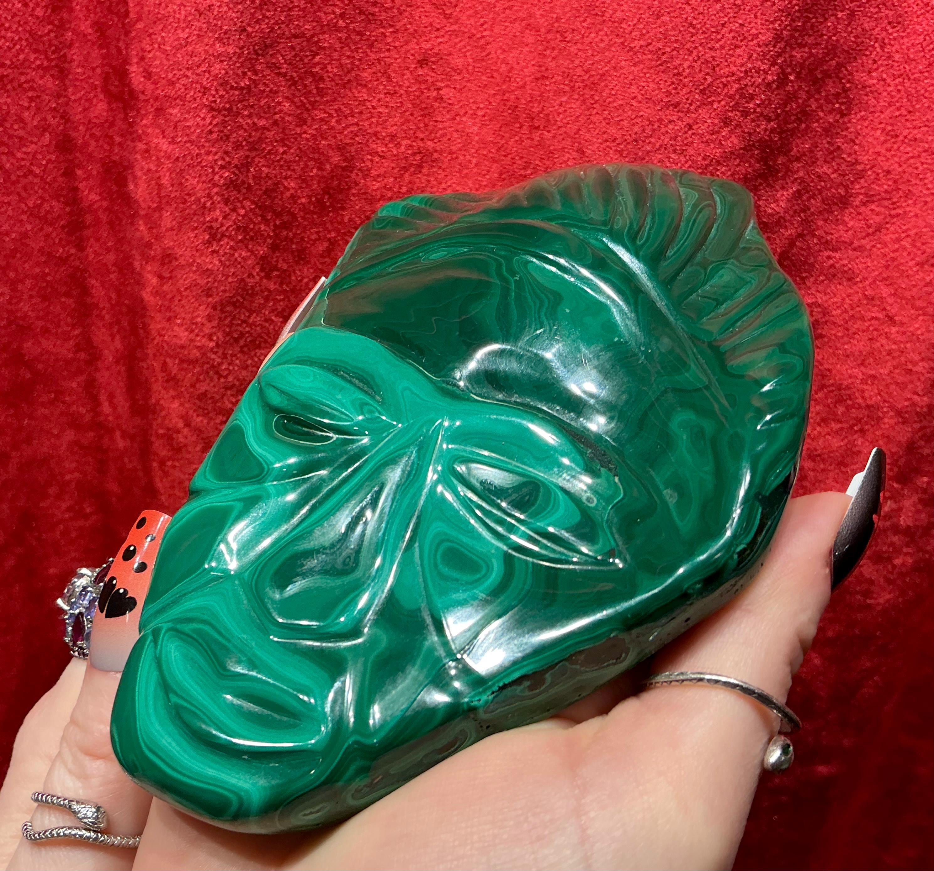 What makes this Malachite mask so special is age, patina, and its vintage deco free form style hand carved from the Congo not like the modern Malachite from China.