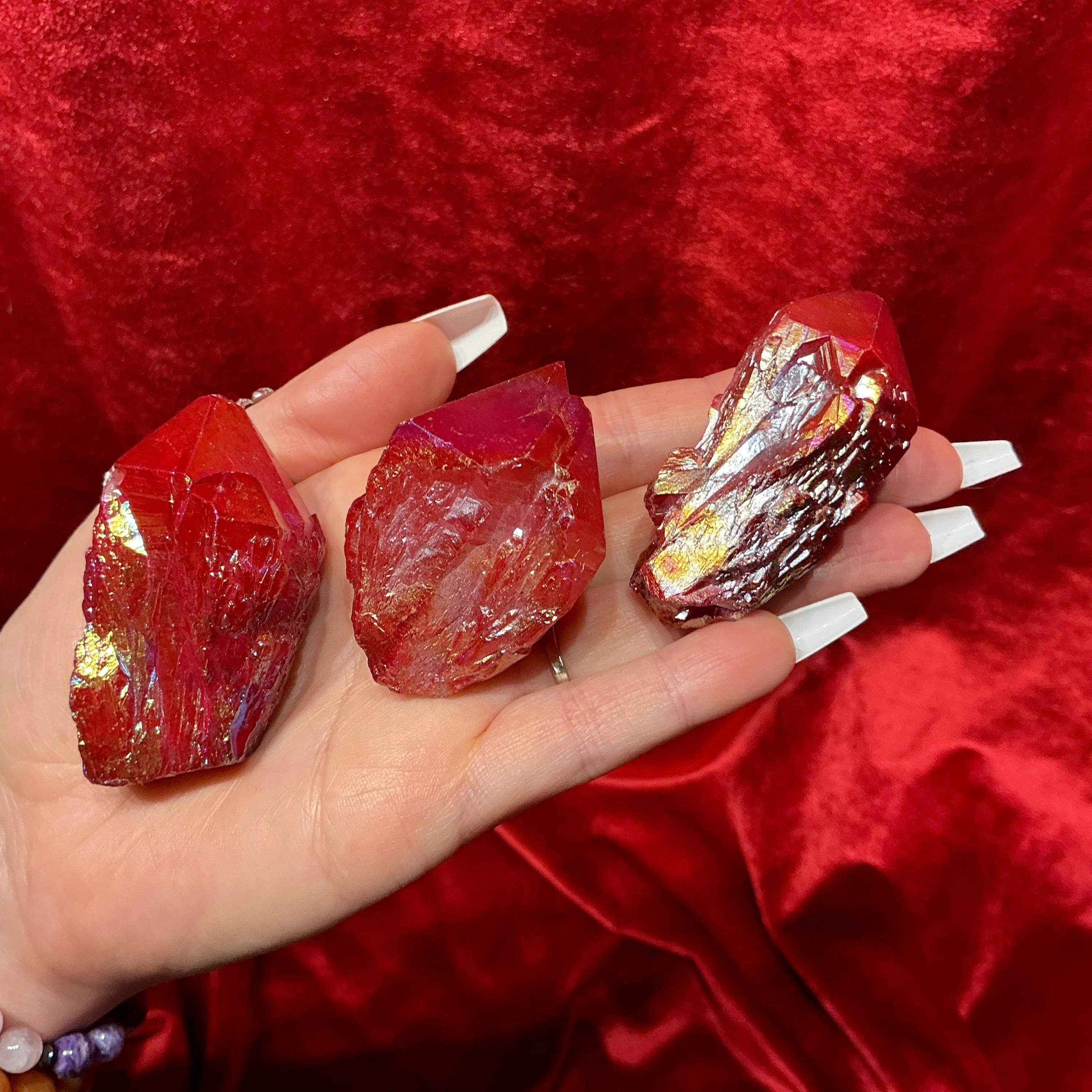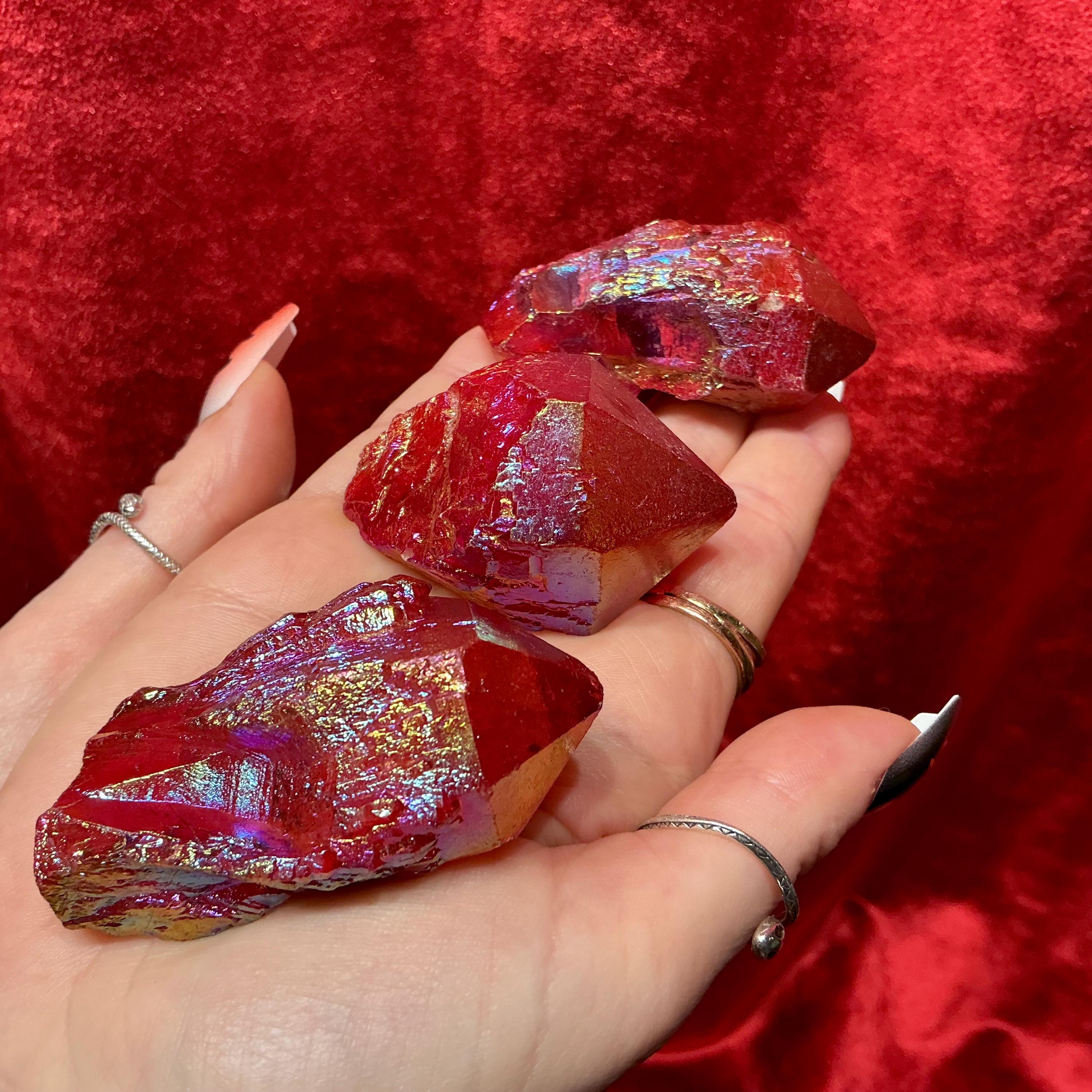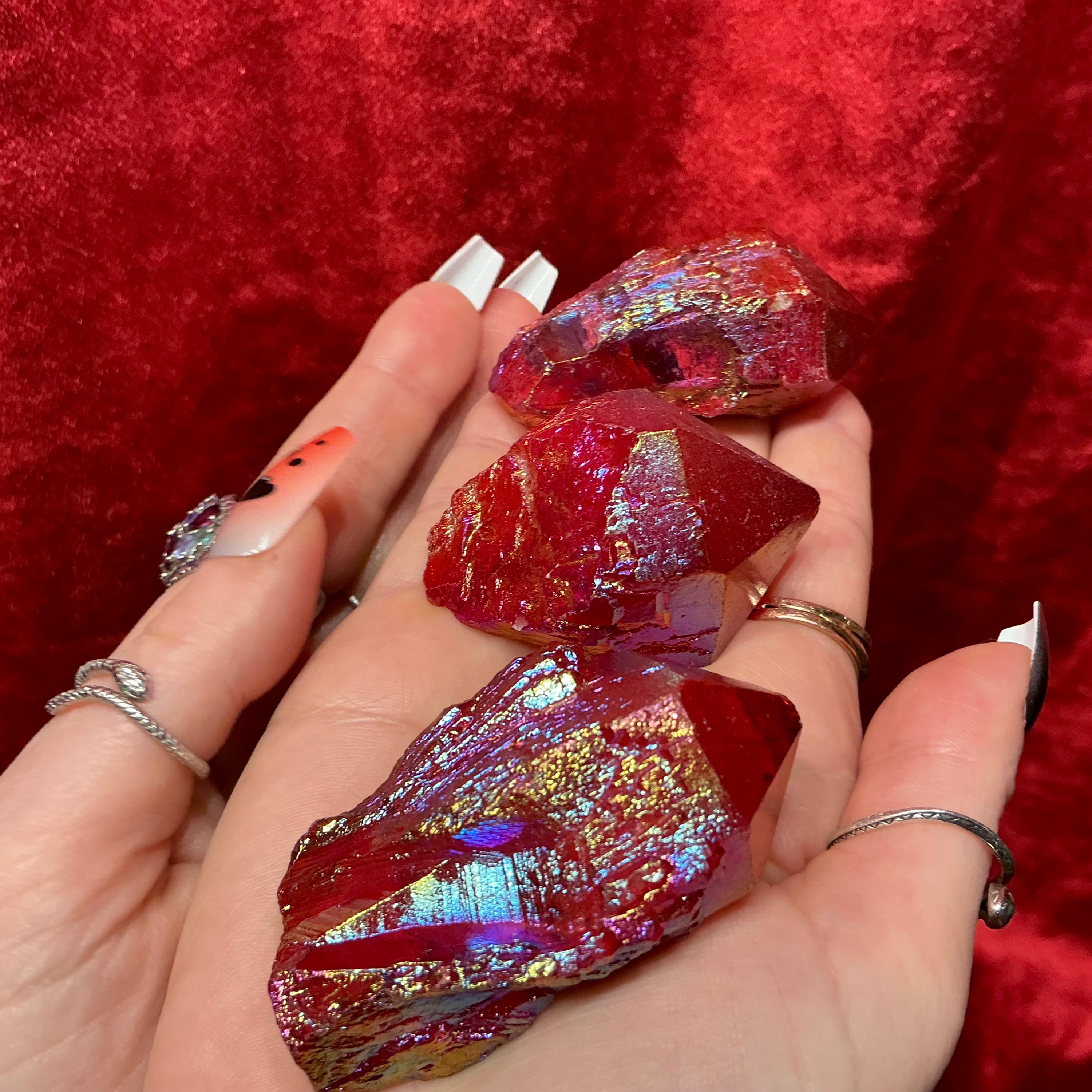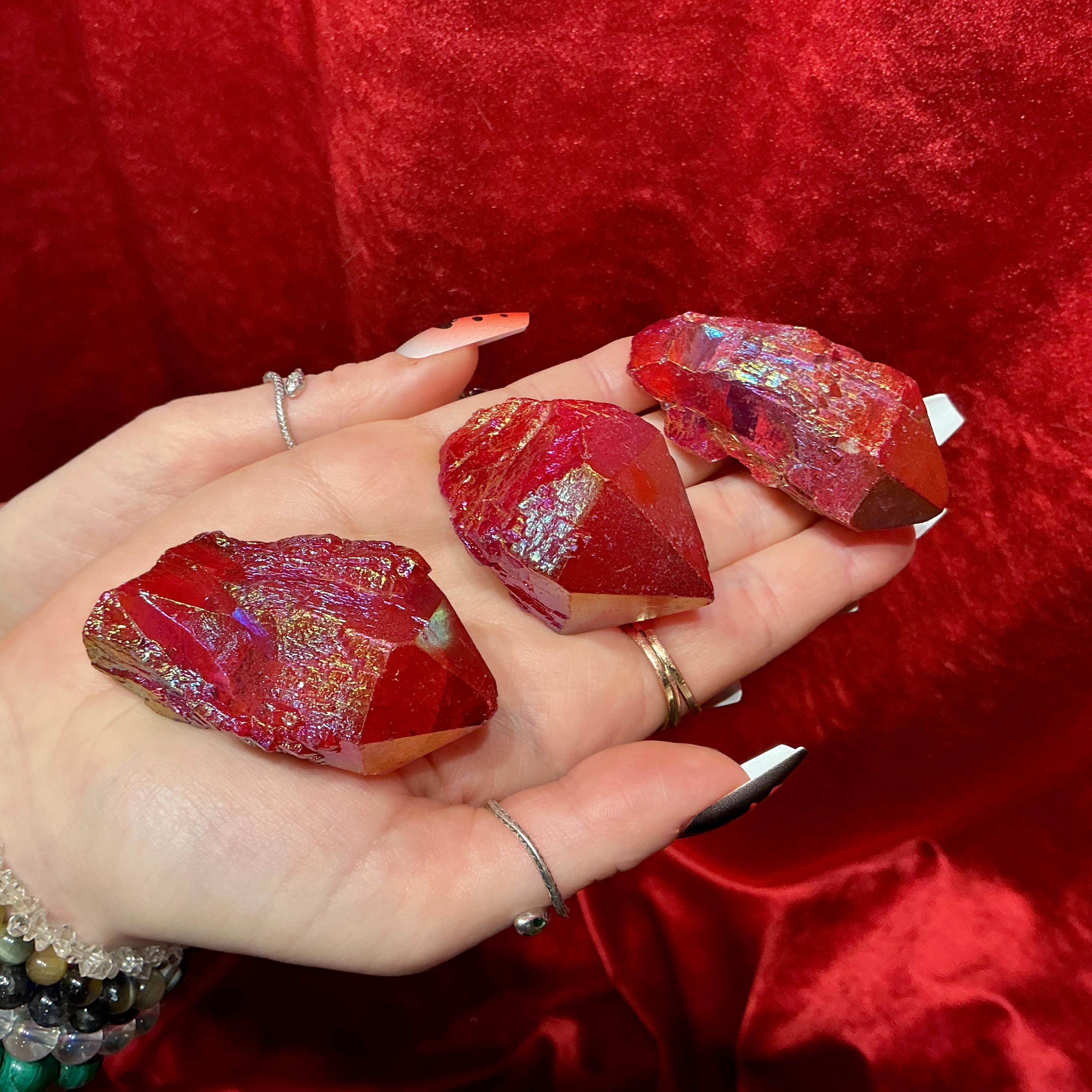 Elestial Aura Quartz Lights up like a flame when hit by the light and these beautiful set of three crystals weigh a total of 7 ounces and they measure approximately 2 inches long each, and 1 1/2 inches wide.