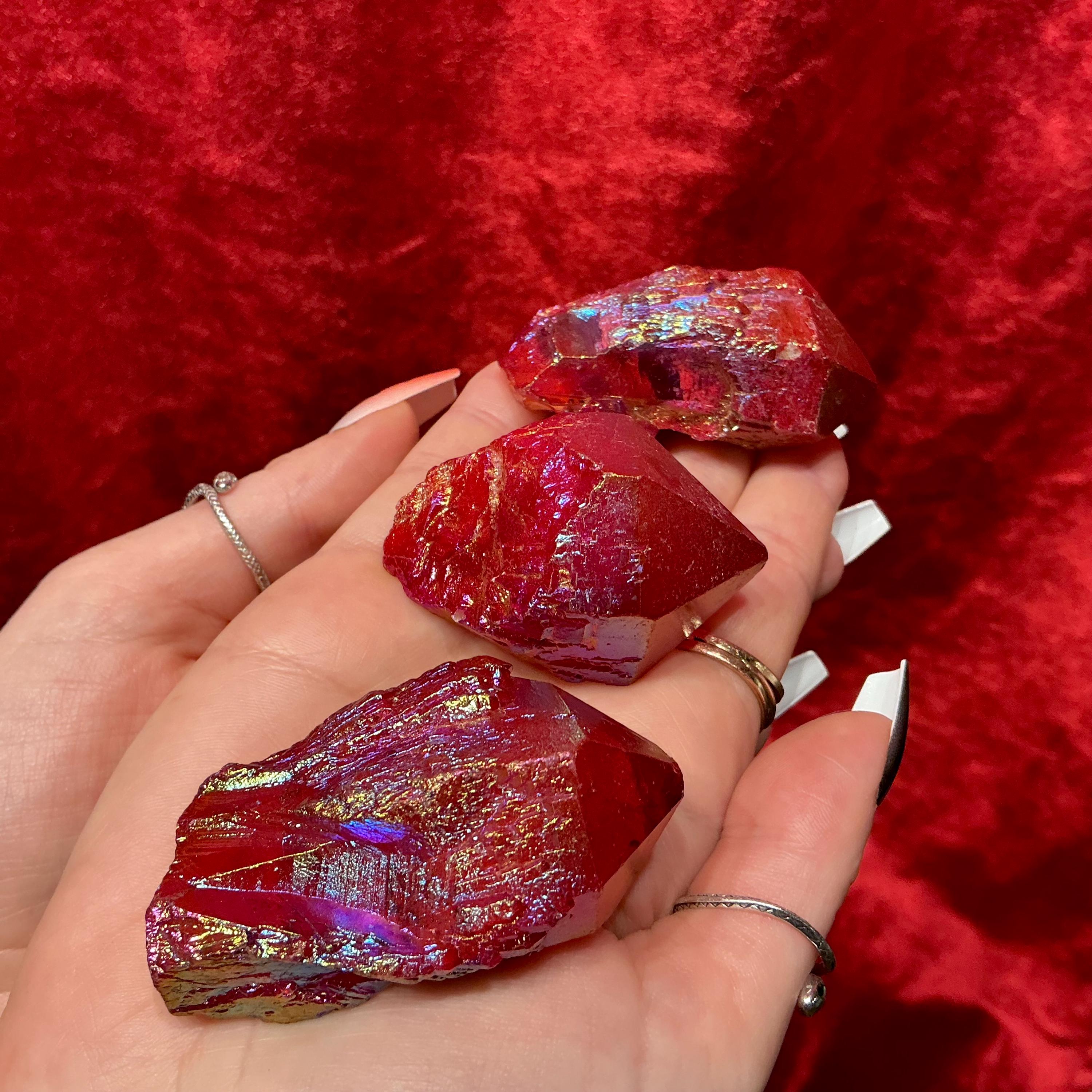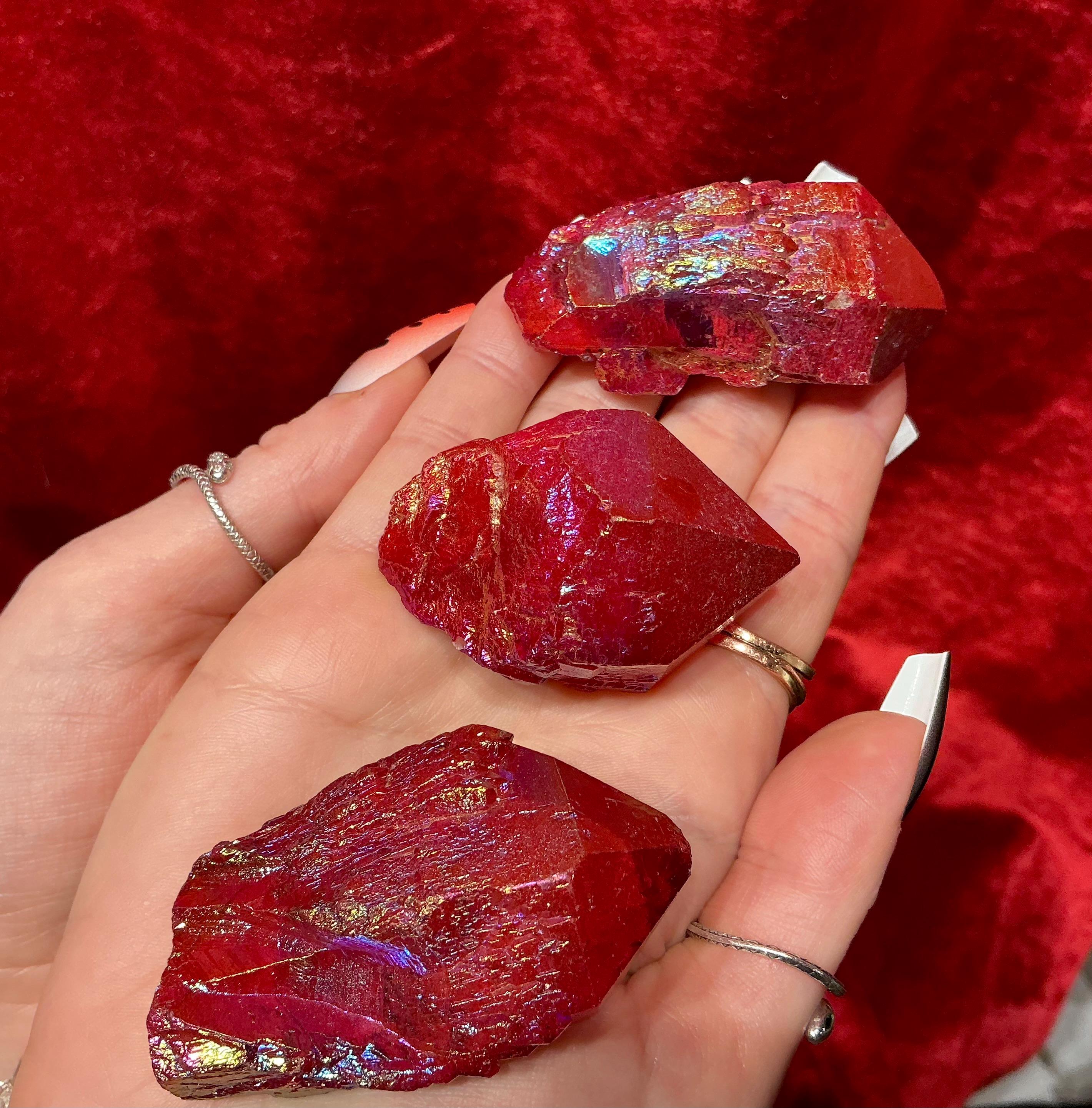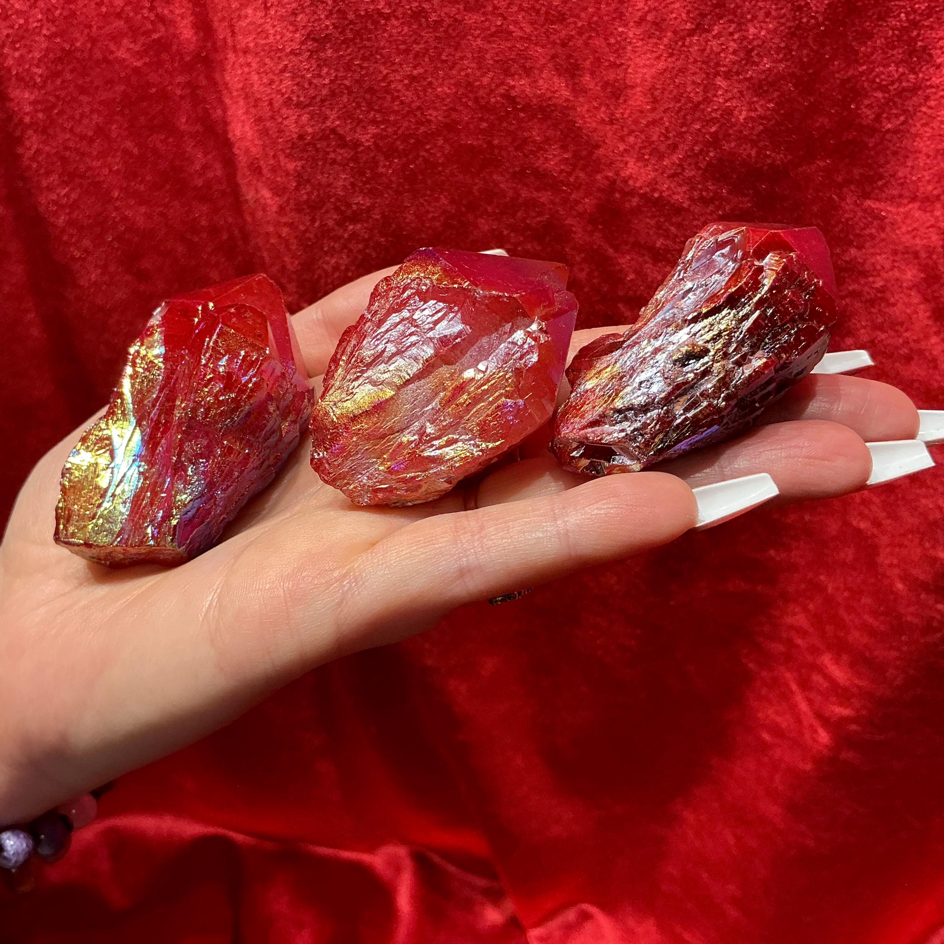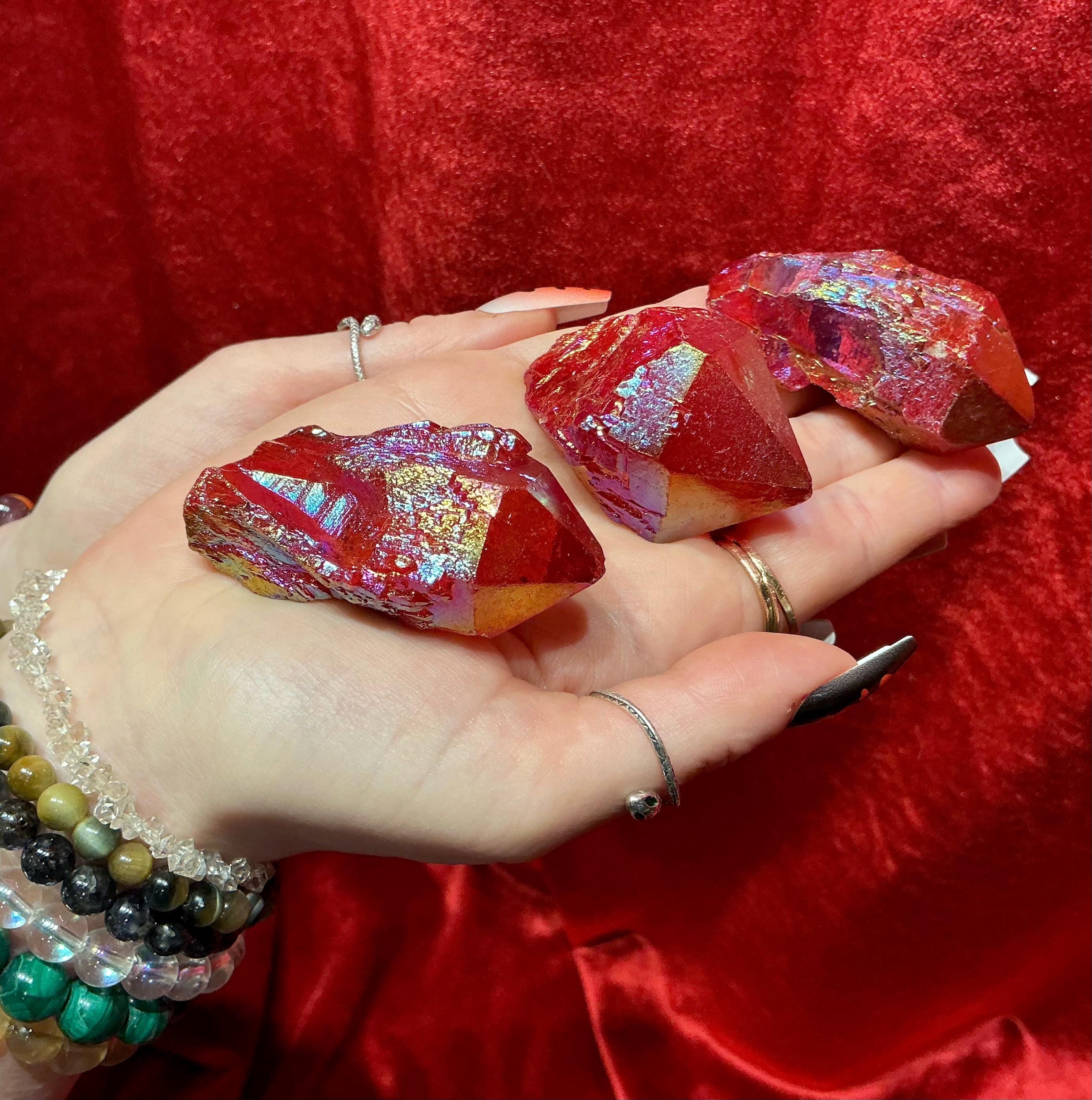 Elestial Aura Quartz Lights up like a flame when hit by the light and these beautiful set of three crystals weigh a total of 7 ounces and they measure approximately 2 inches long each, and 1 1/2 inches wide.