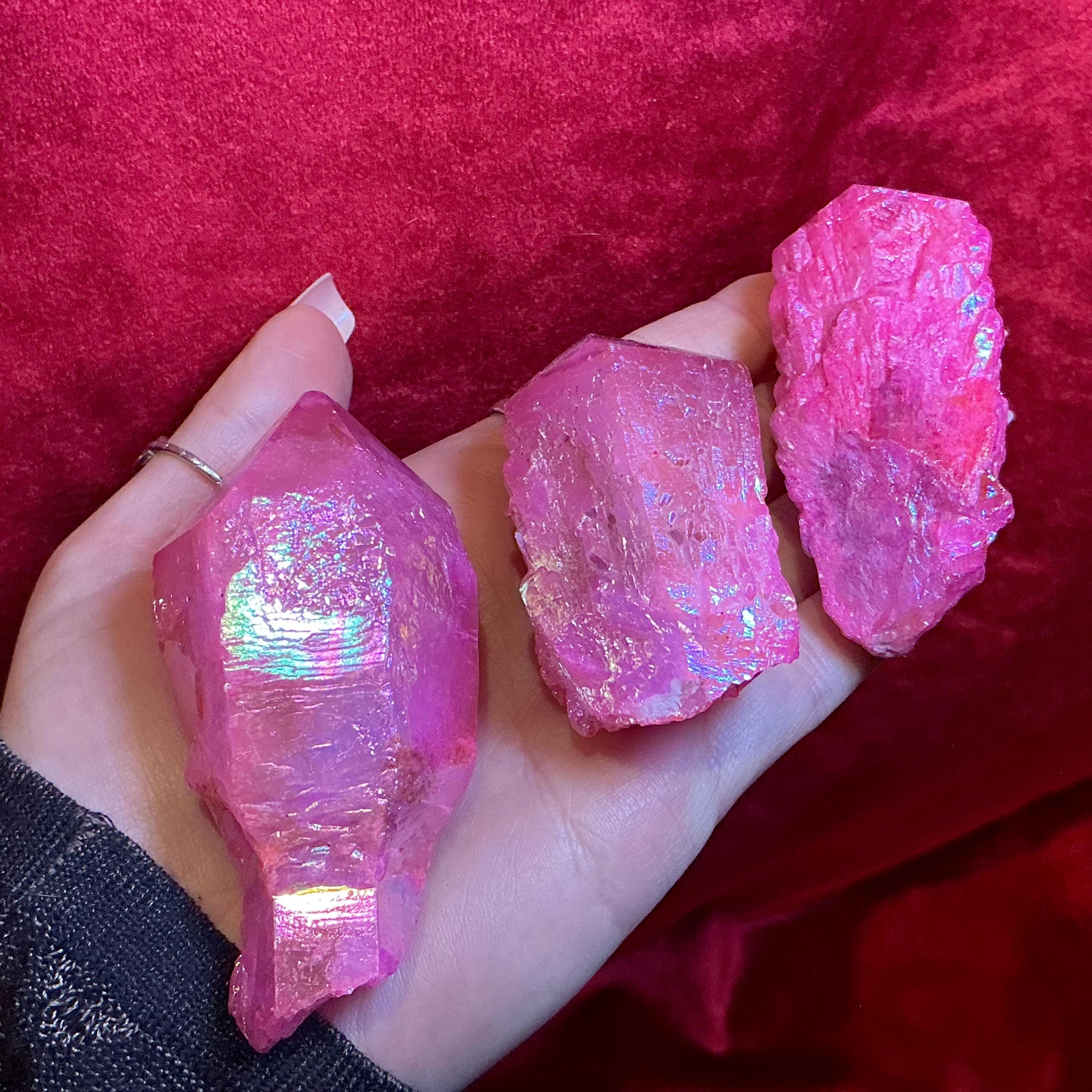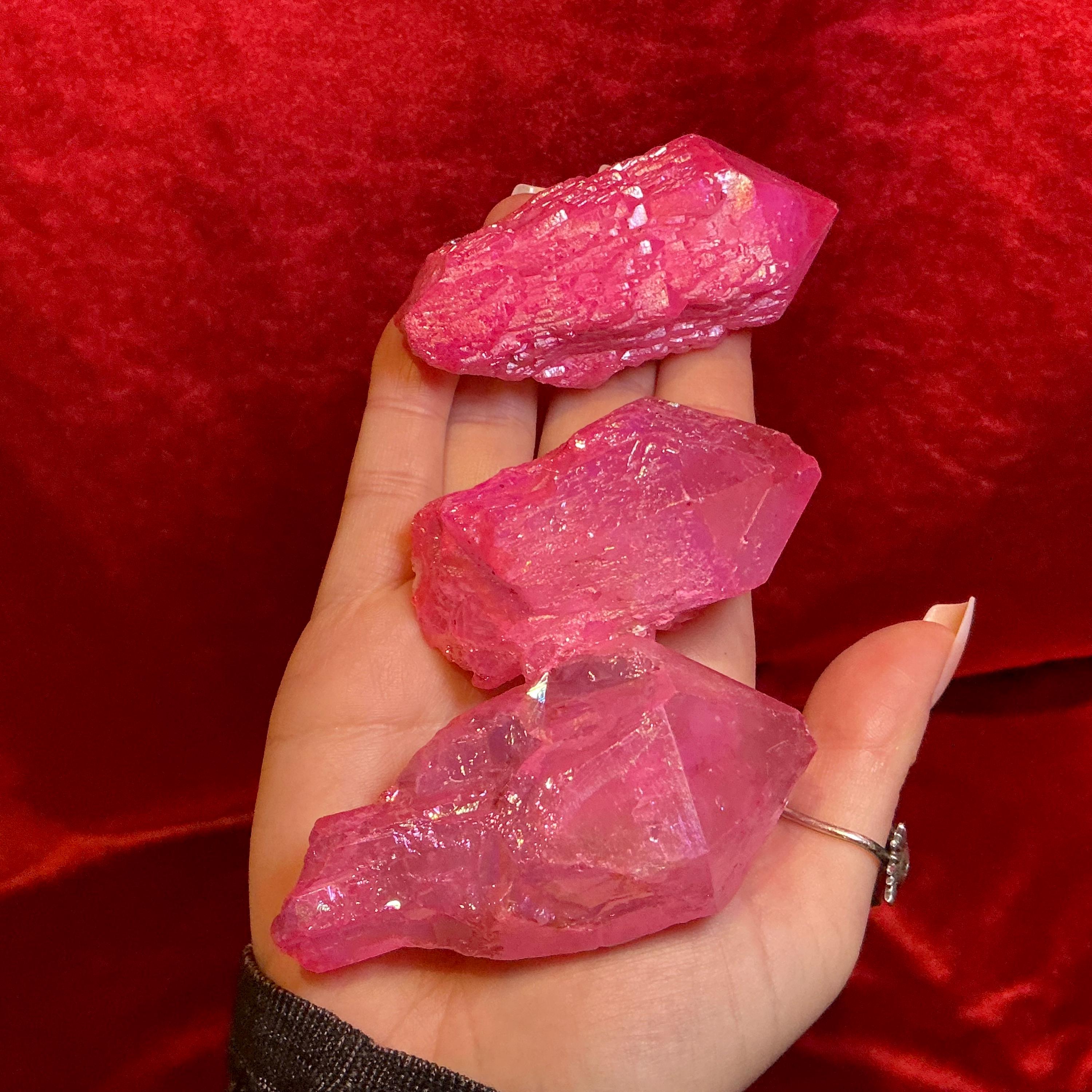 Pink Aura Elestial Quartz Crystal Cluster 3 Piece Set ~ 11 oz. Total Weight~ 2 1/2" Long ~ Rainbow Iridescent Electric Pink Points