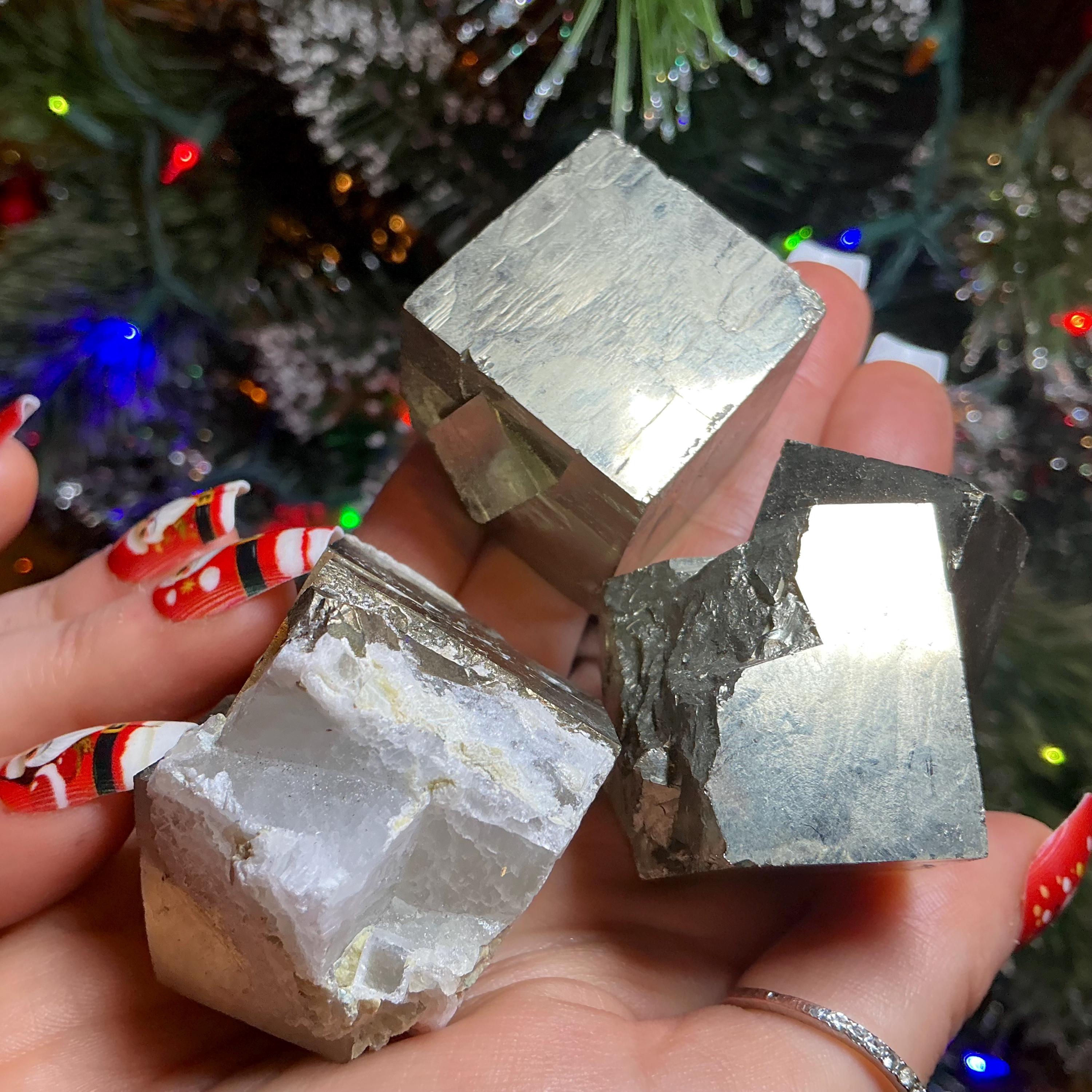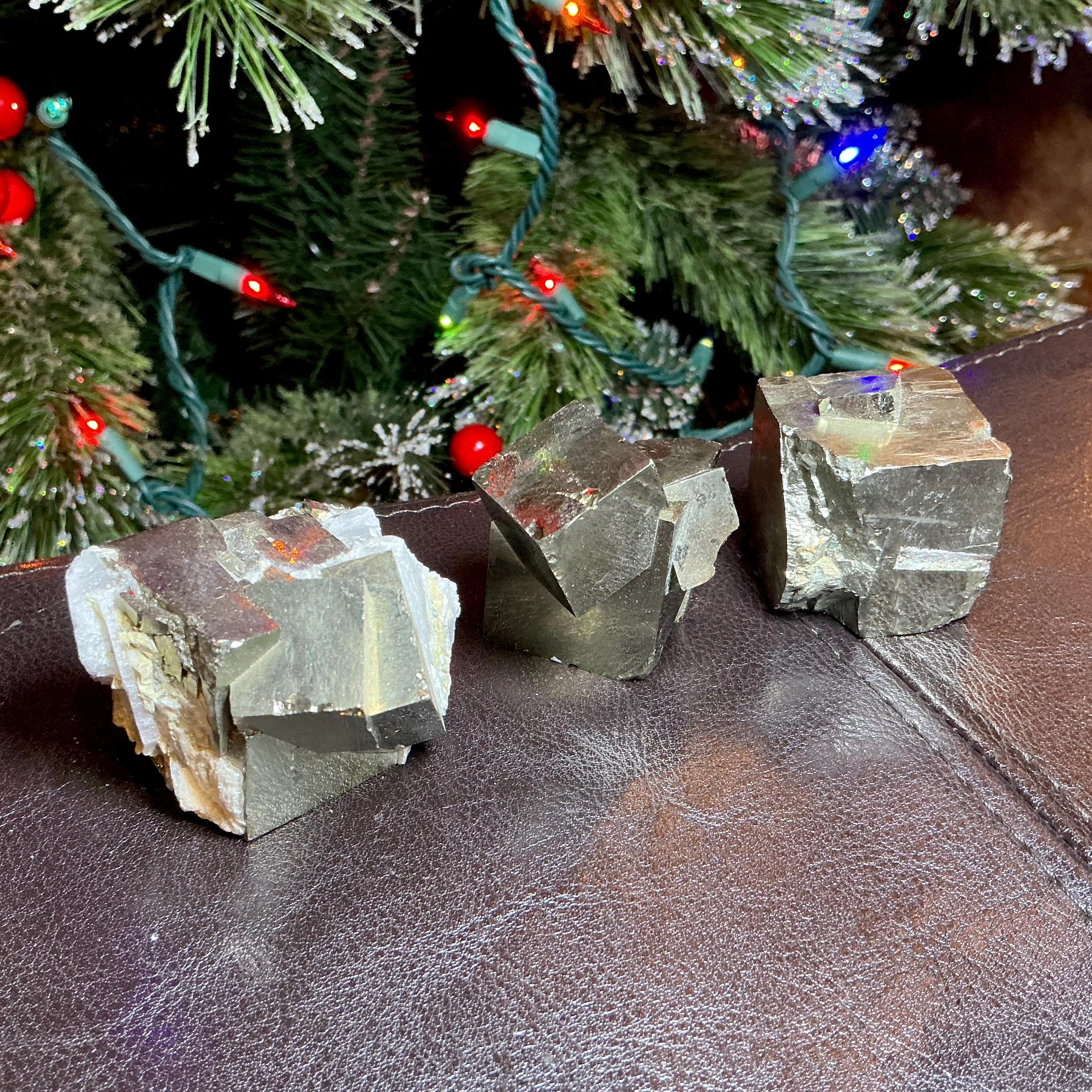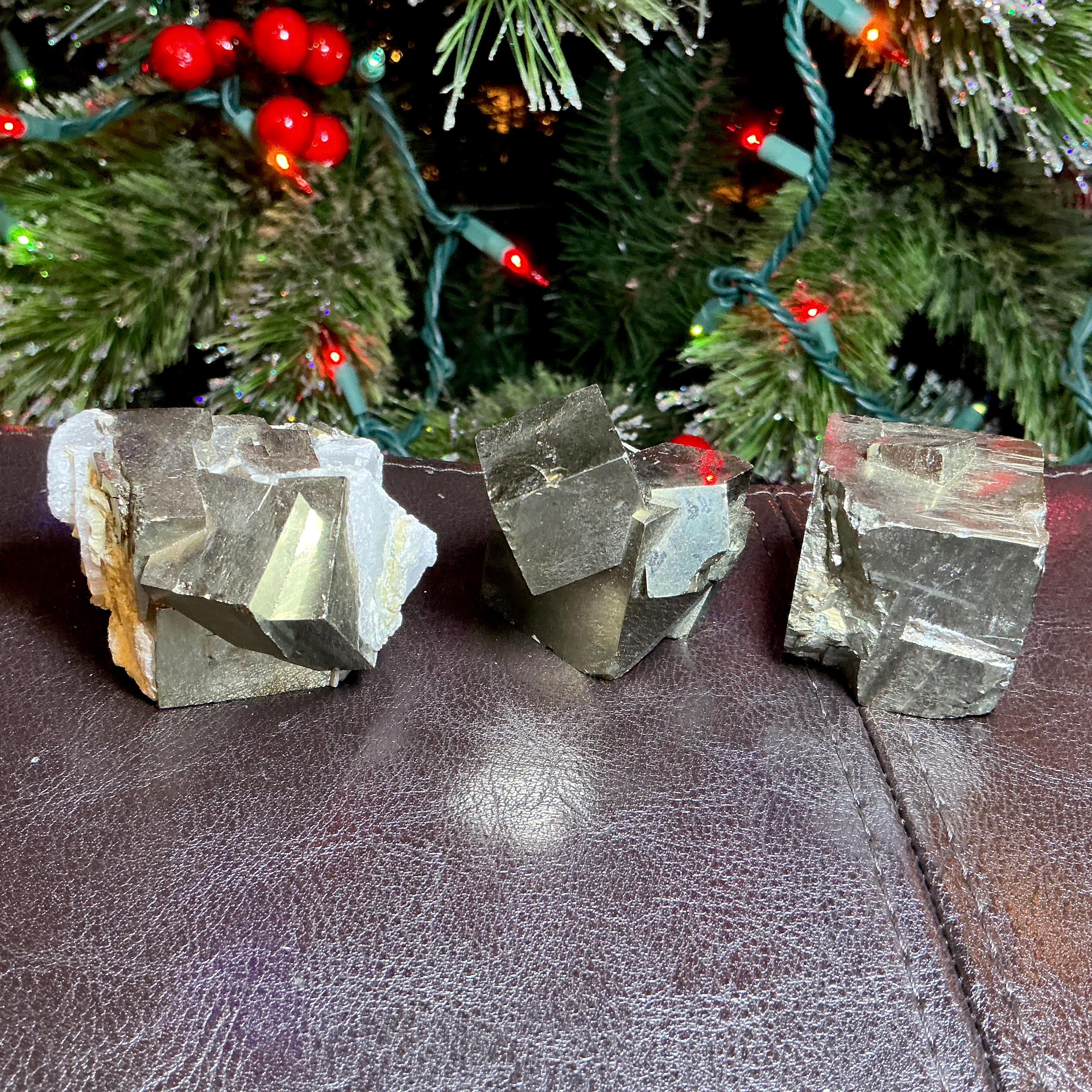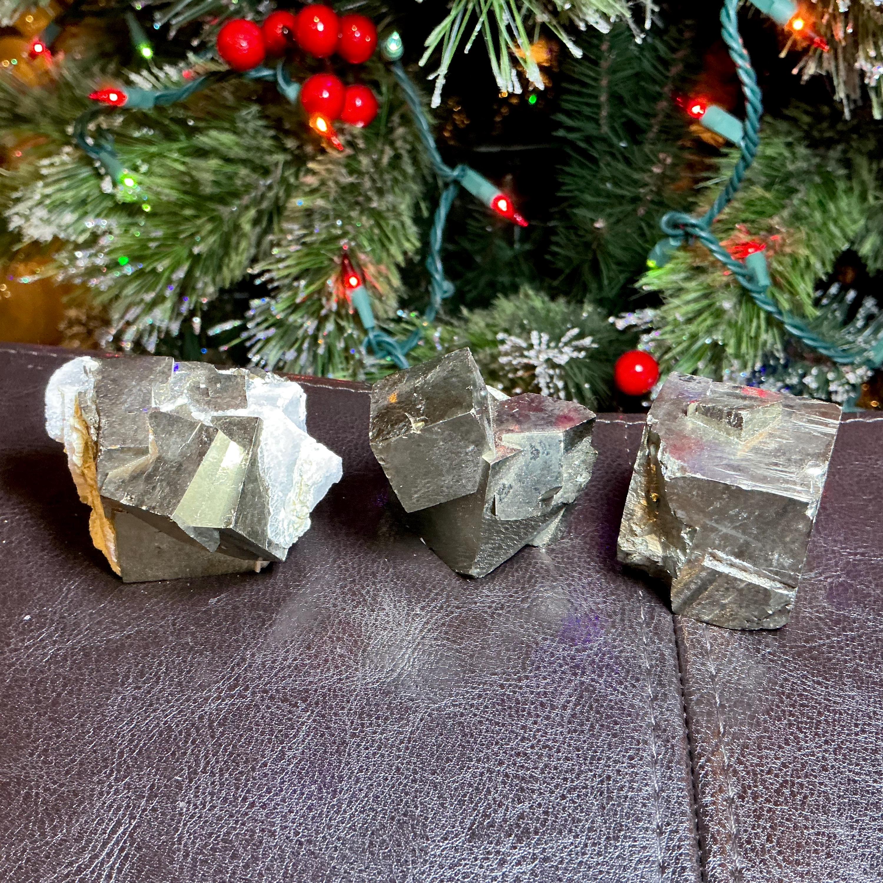 Pyrite Cubic Crystal 3 Piece Set ~ 15 oz. Total Weight ~ 1 1/2" Square ~ Naturally Sparkly Gold Mineral ~ Meditation Stone, Zen Room, Yoga Studio, Altar Display, Feng Shui Decor