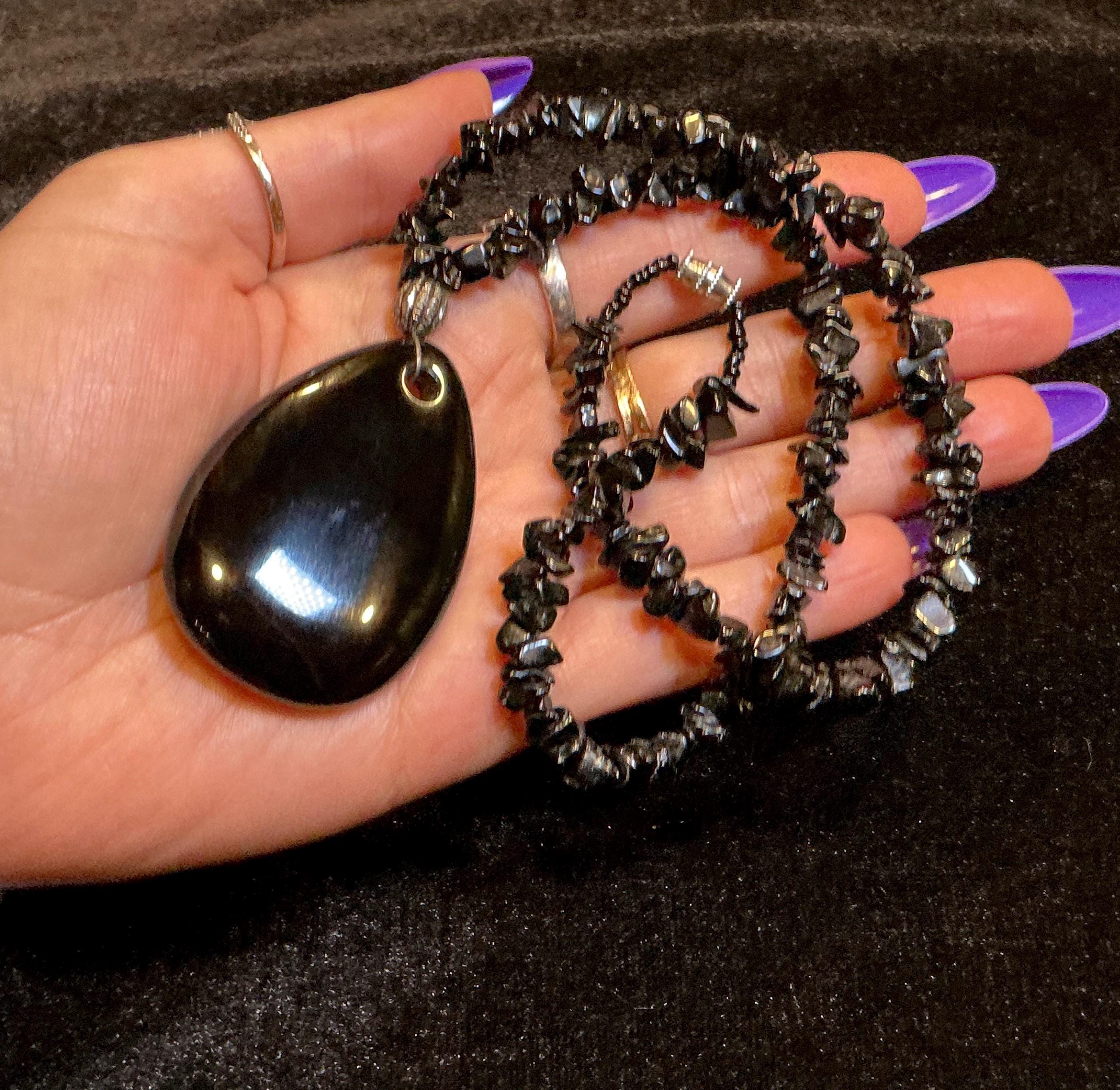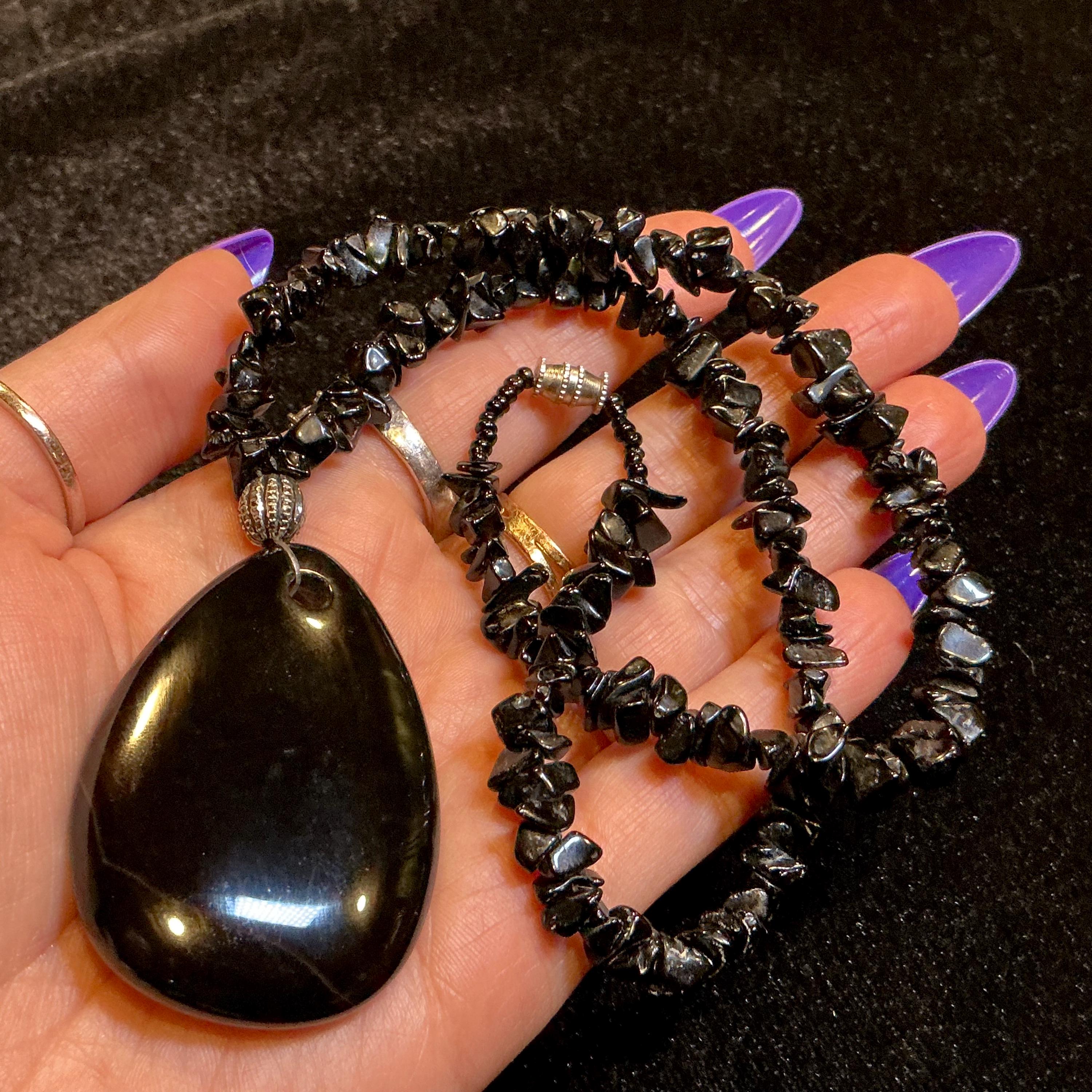 Vintage Black Obsidian Necklace ~ Pendant & Gemstone Beads ~ Crystal Goddess Sacred Adornment ~ 18 inches.