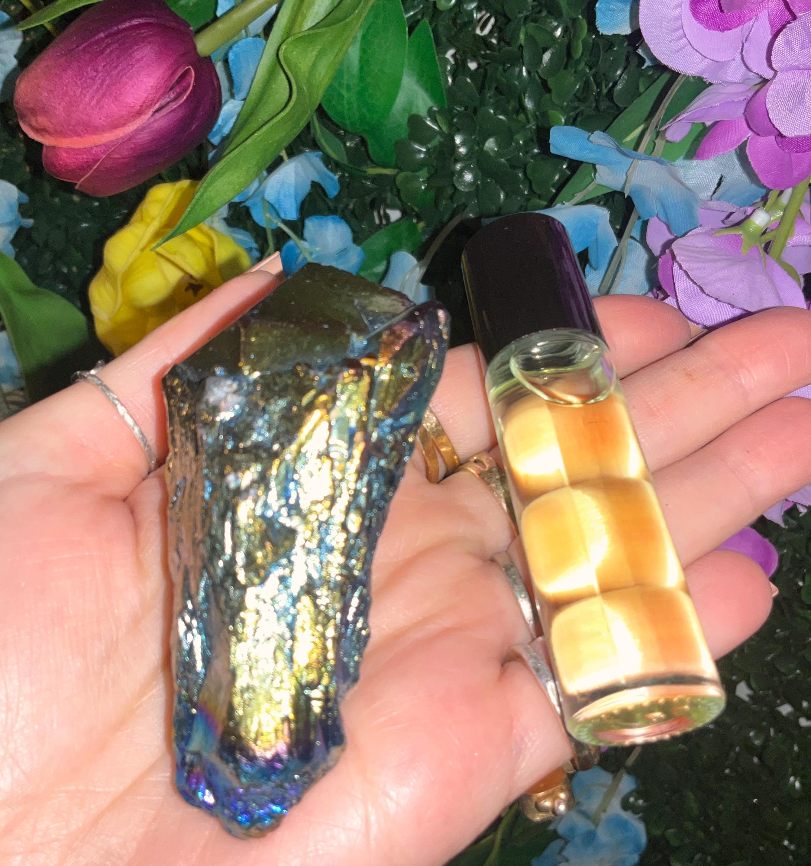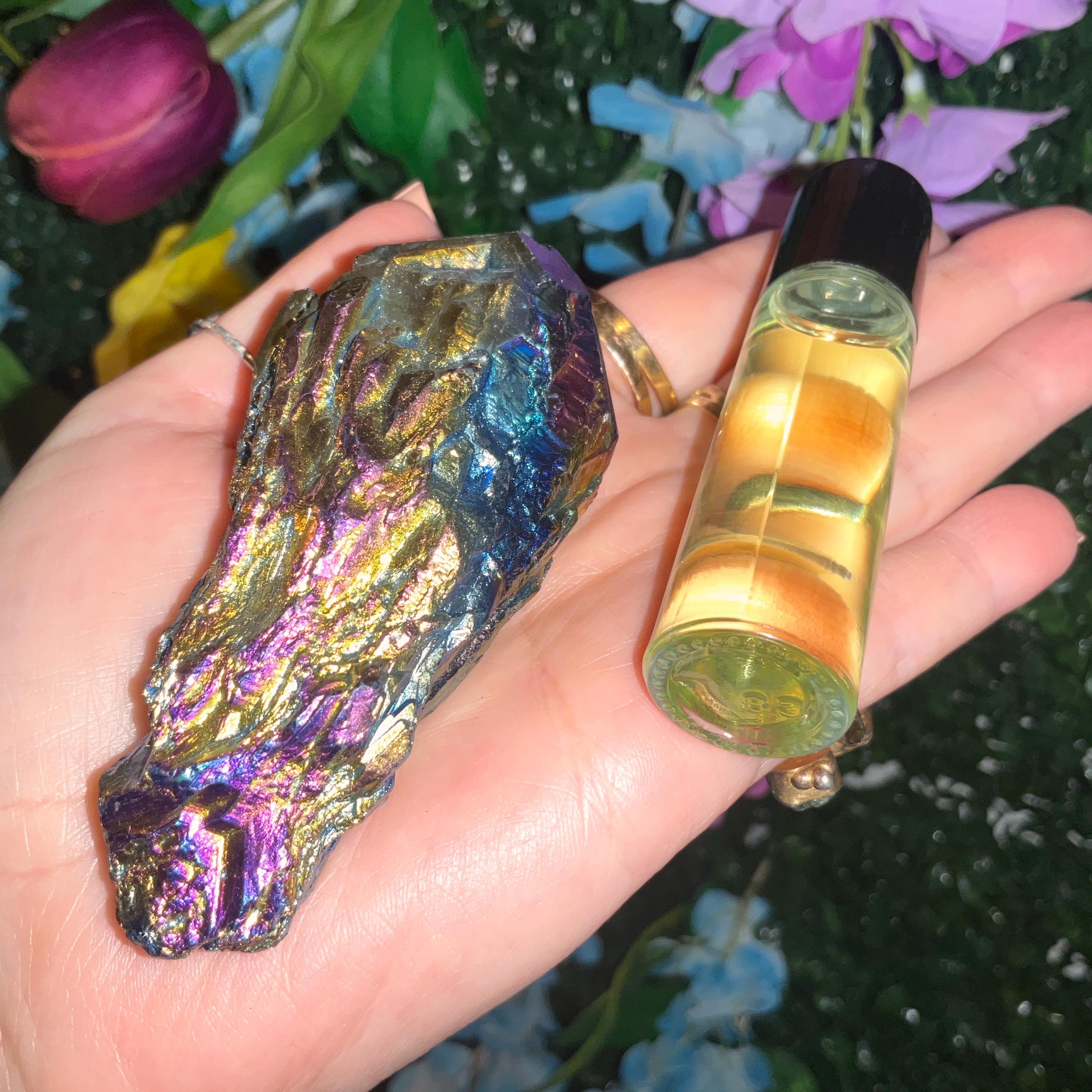 Titanium aura quartz lies in your palm like a tiny planet, its metal sheen refracting the citrus β€” you watch the stone spin the colors inward until every color answers the next: red, orange, gold, green, blue, indigo, a fine silver that edges the crown.