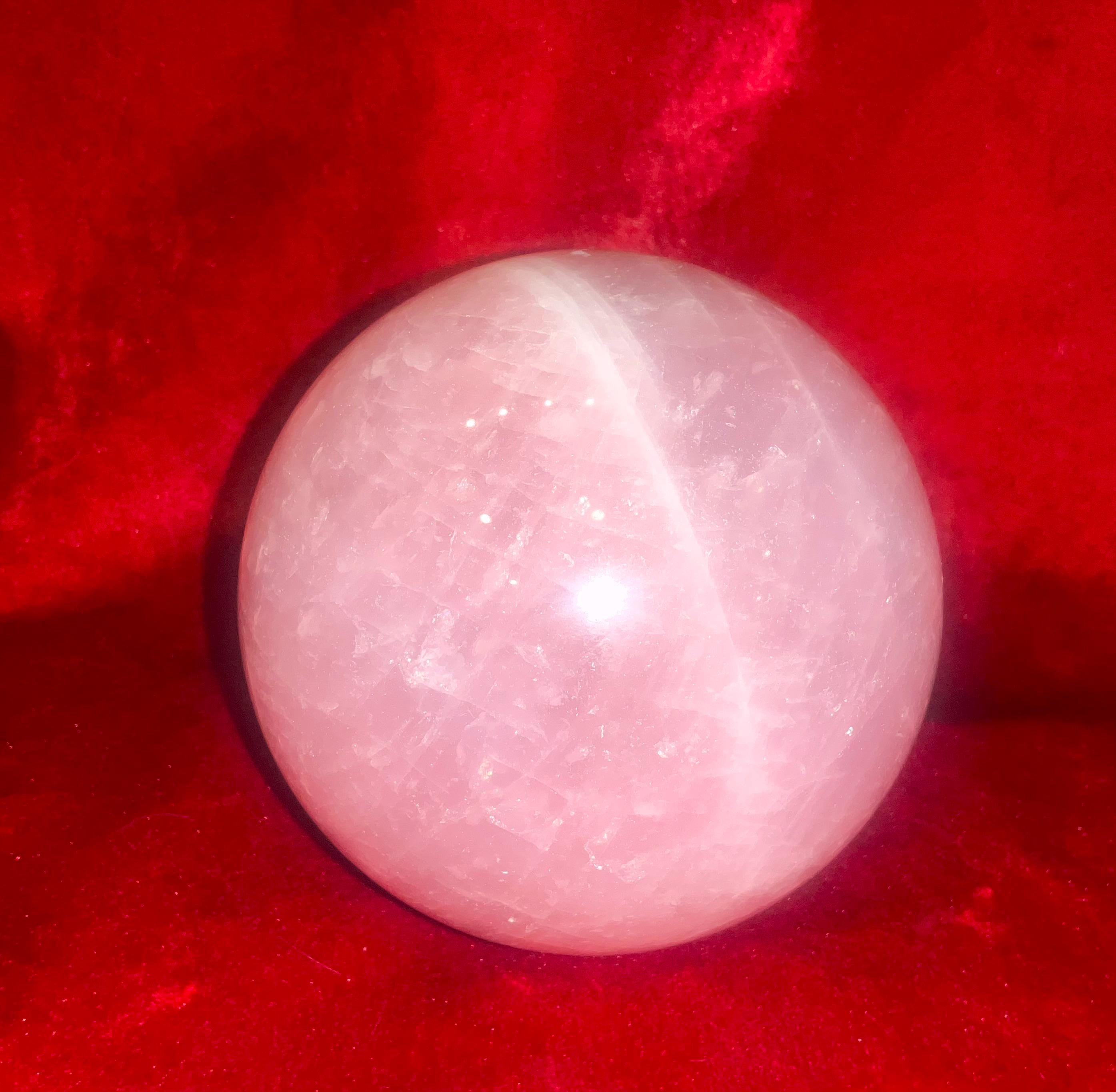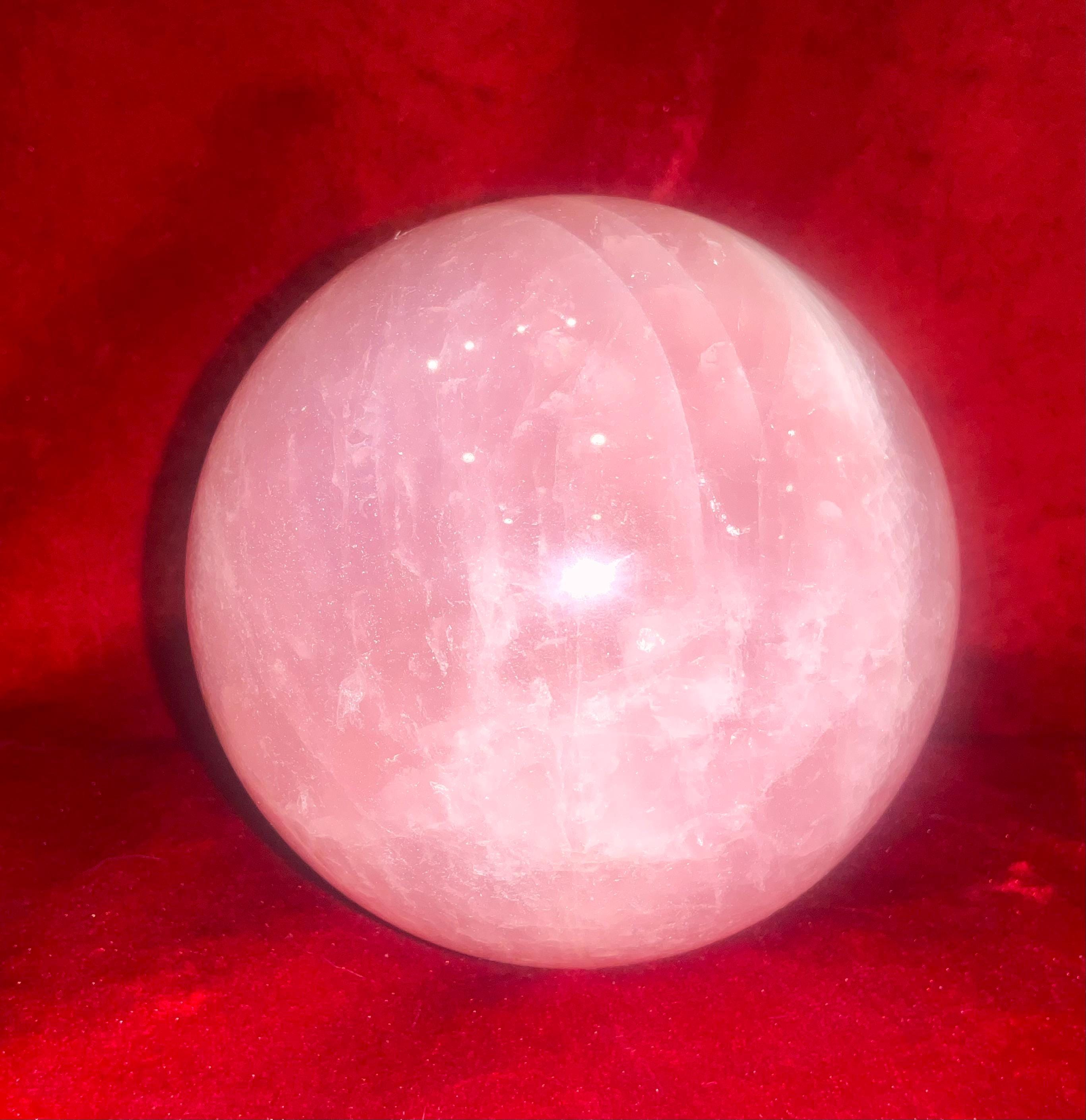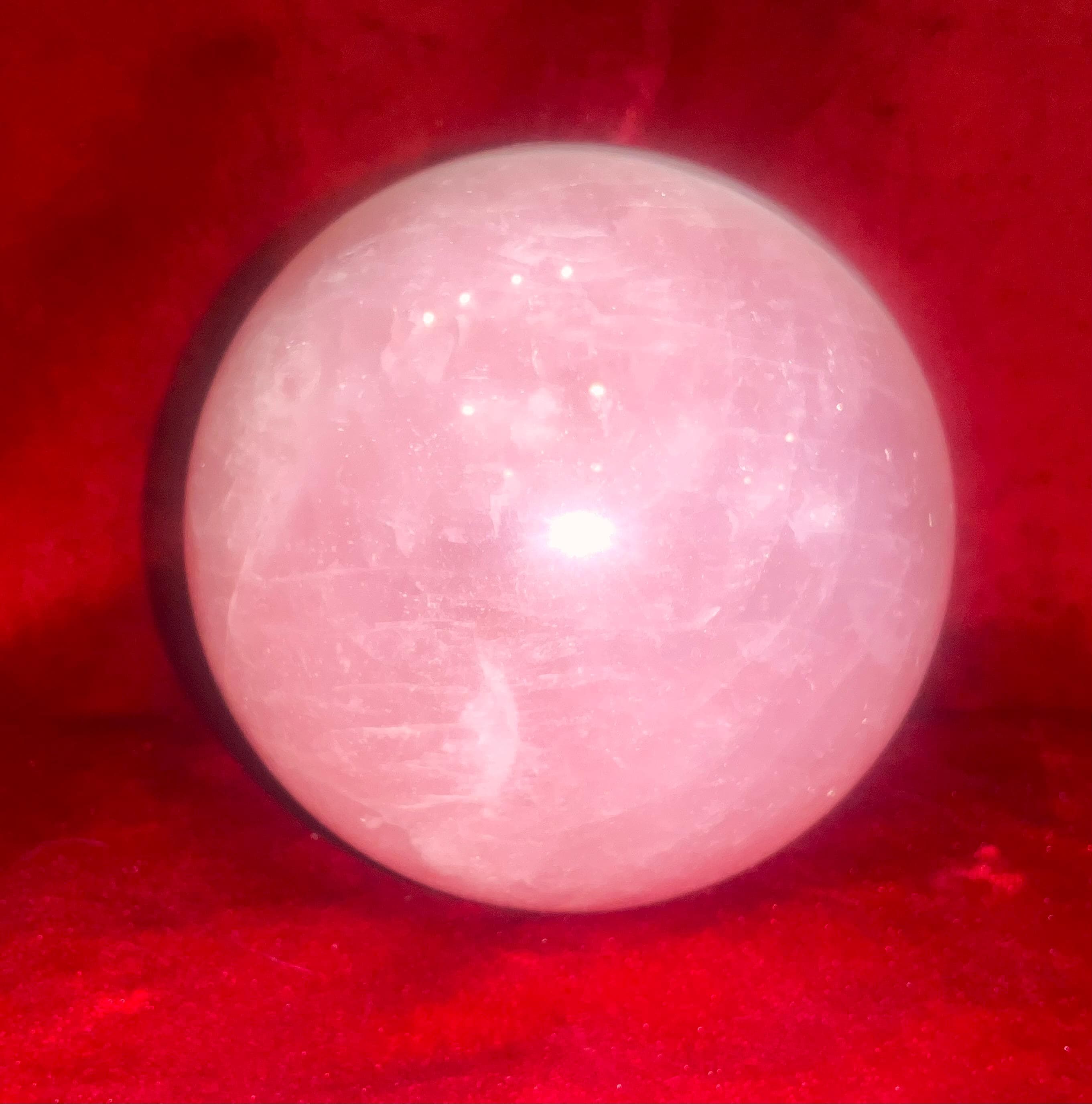 I am very happy to pass along this MIGHTY 4-pound 4-ounce pink rose quartz sphere which has been privately owned by my husband and me for the last 5 years.