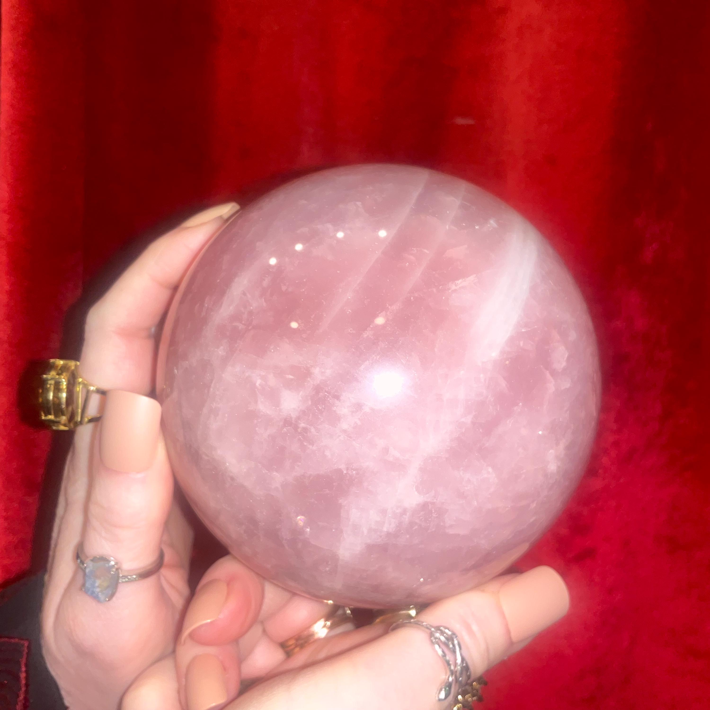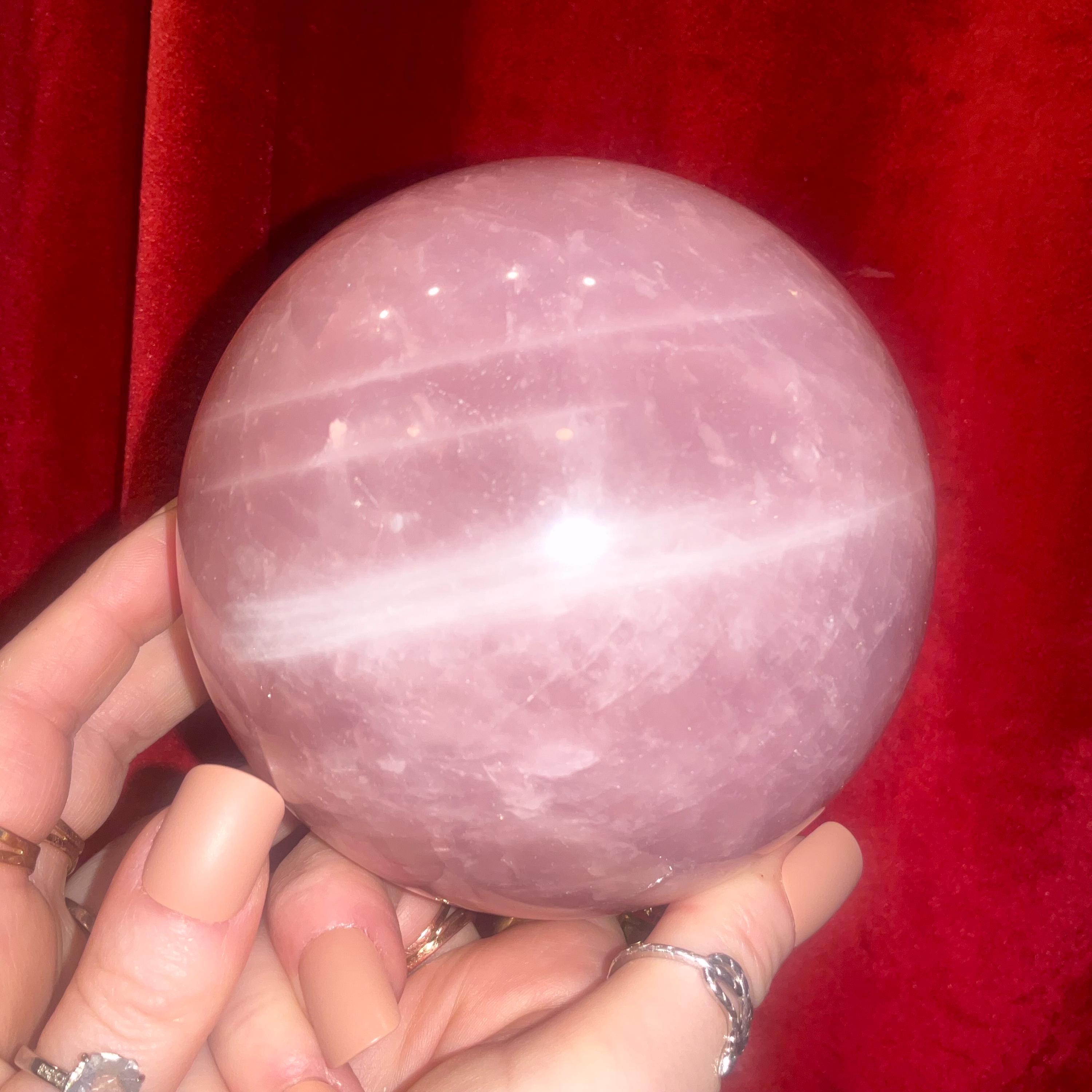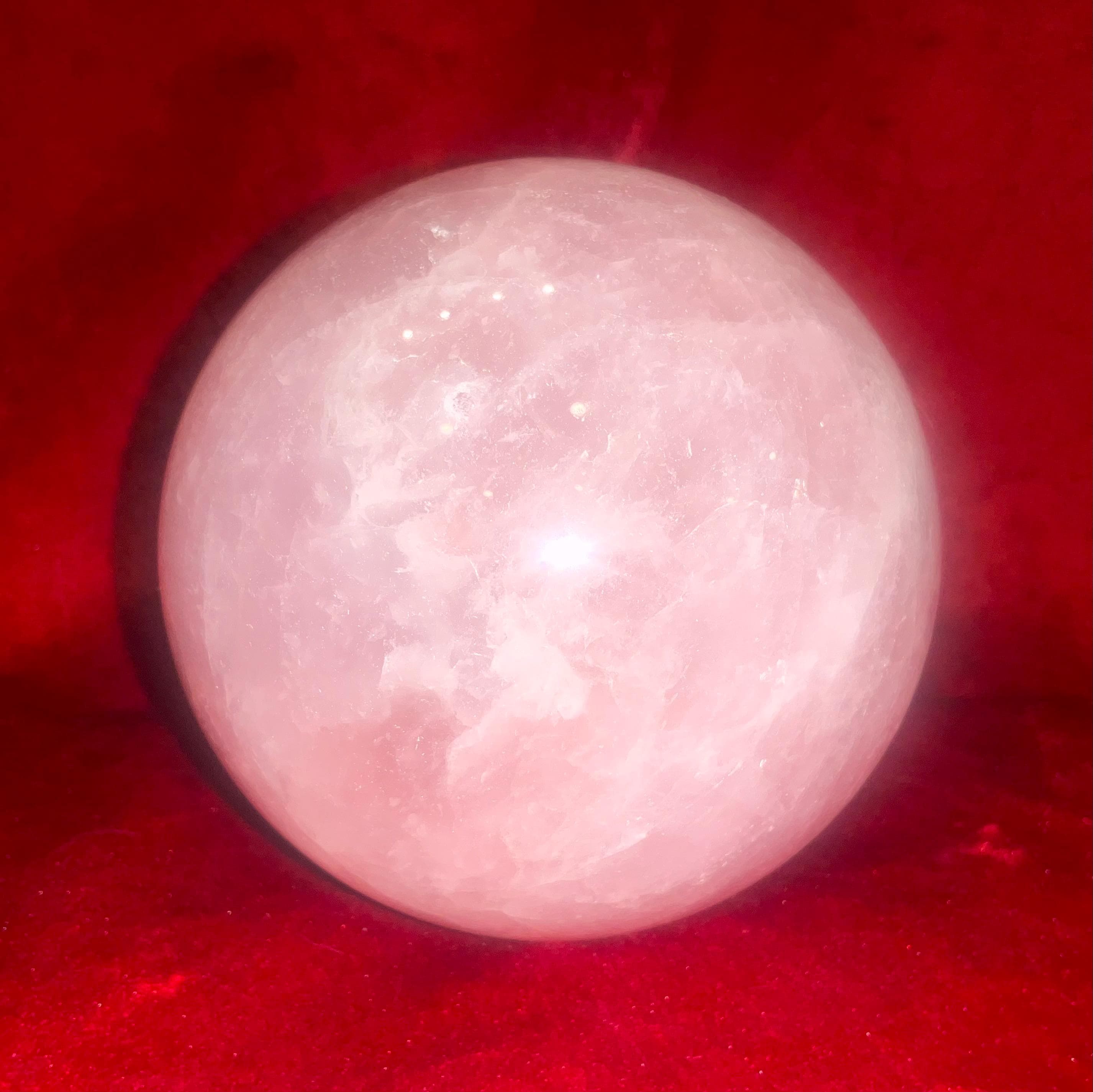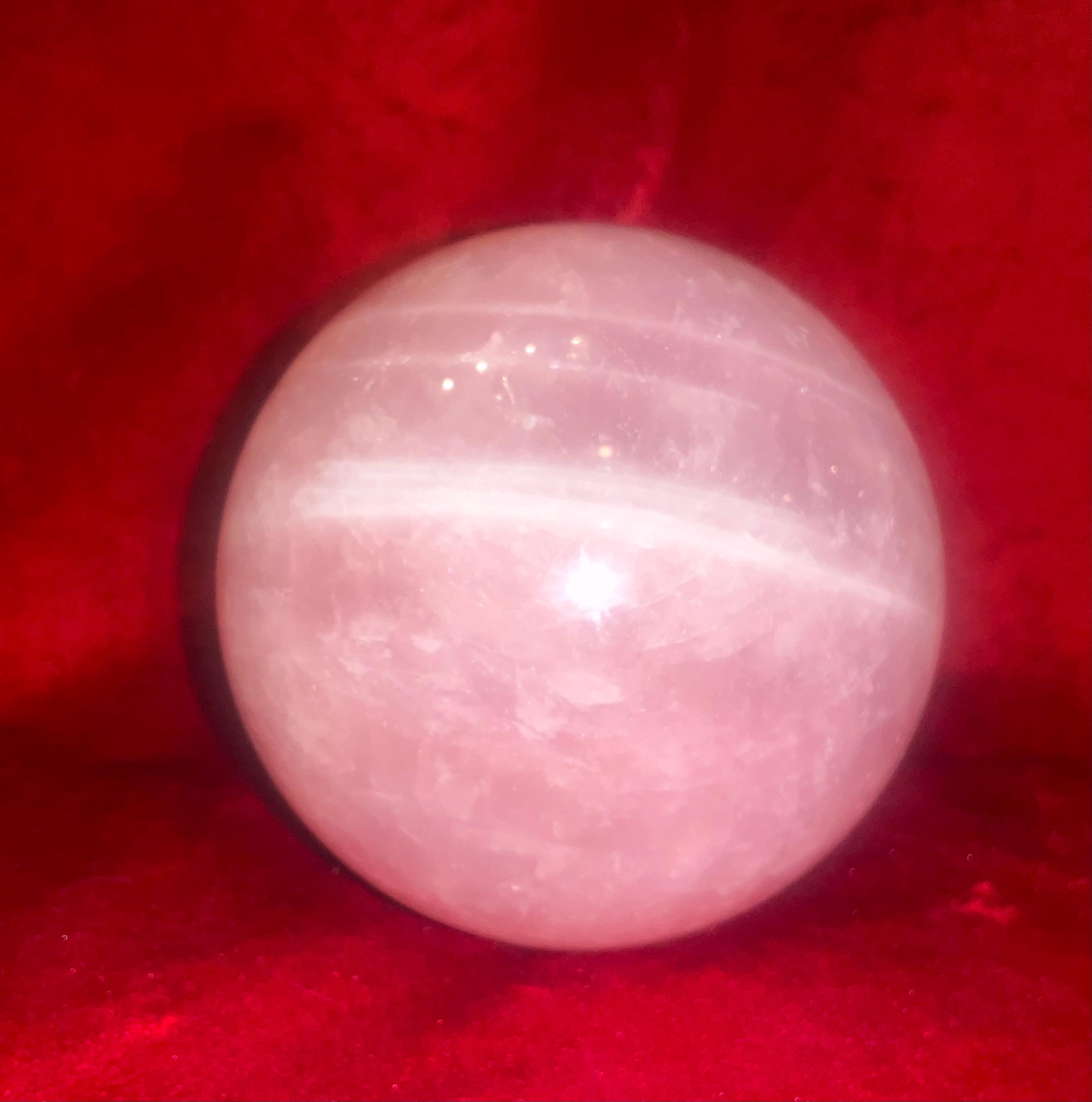 I am very happy to pass along this MIGHTY 4-pound 4-ounce pink rose quartz sphere which has been privately owned by my husband and me for the last 5 years.