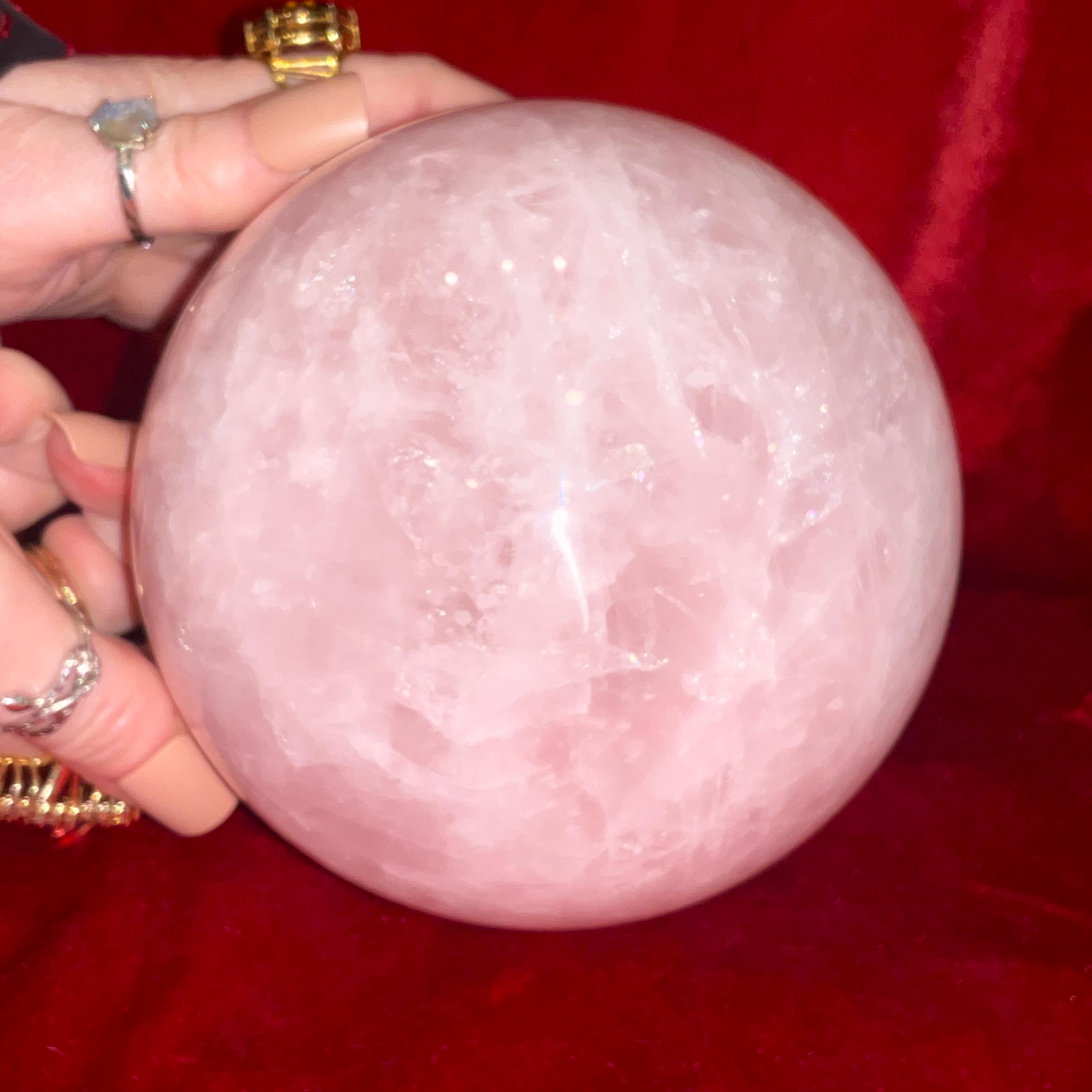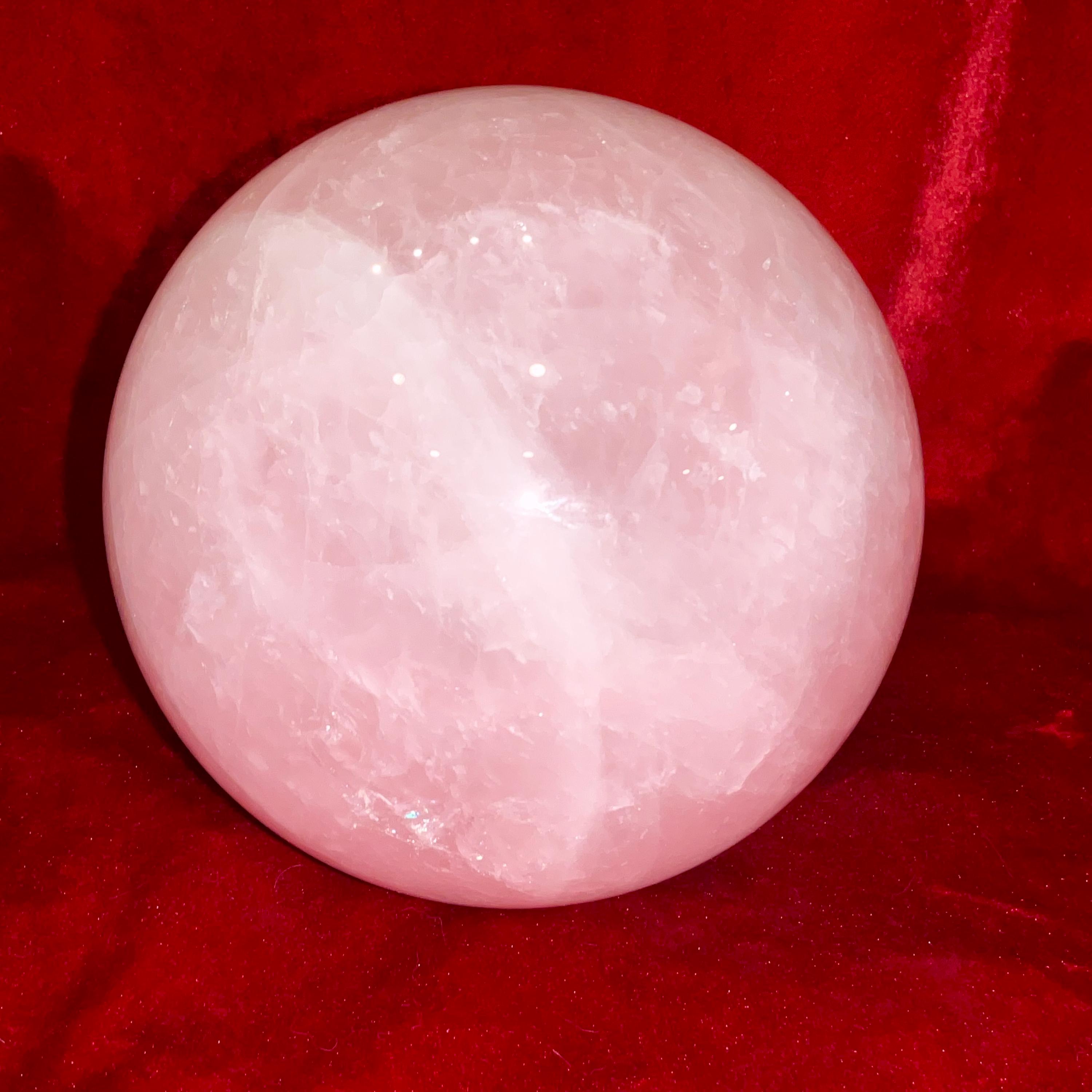 I am very happy to pass along this MIGHTY 6-pound 8-ounce pink rose quartz sphere which has been privately owned by my husband and me for the last 5 years.