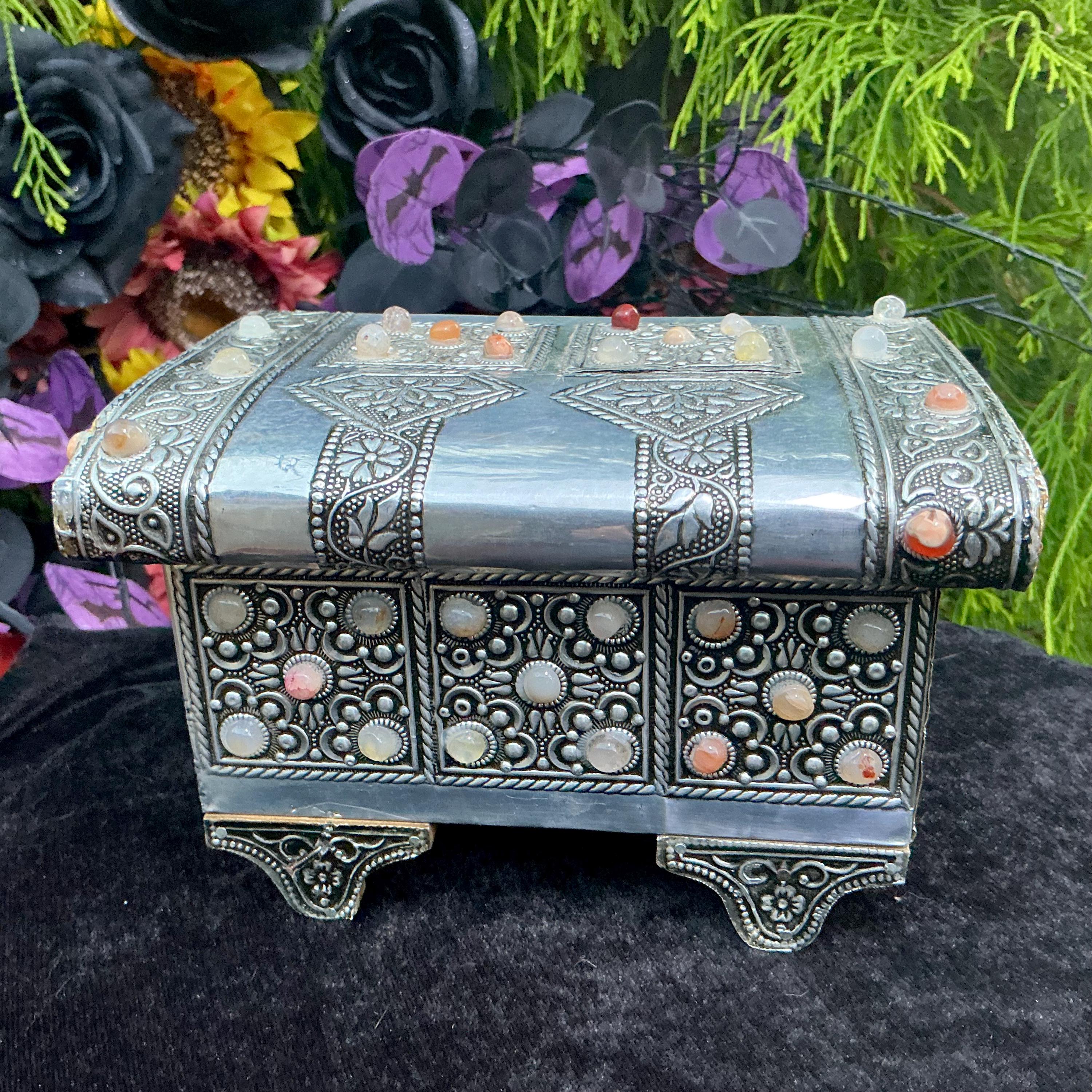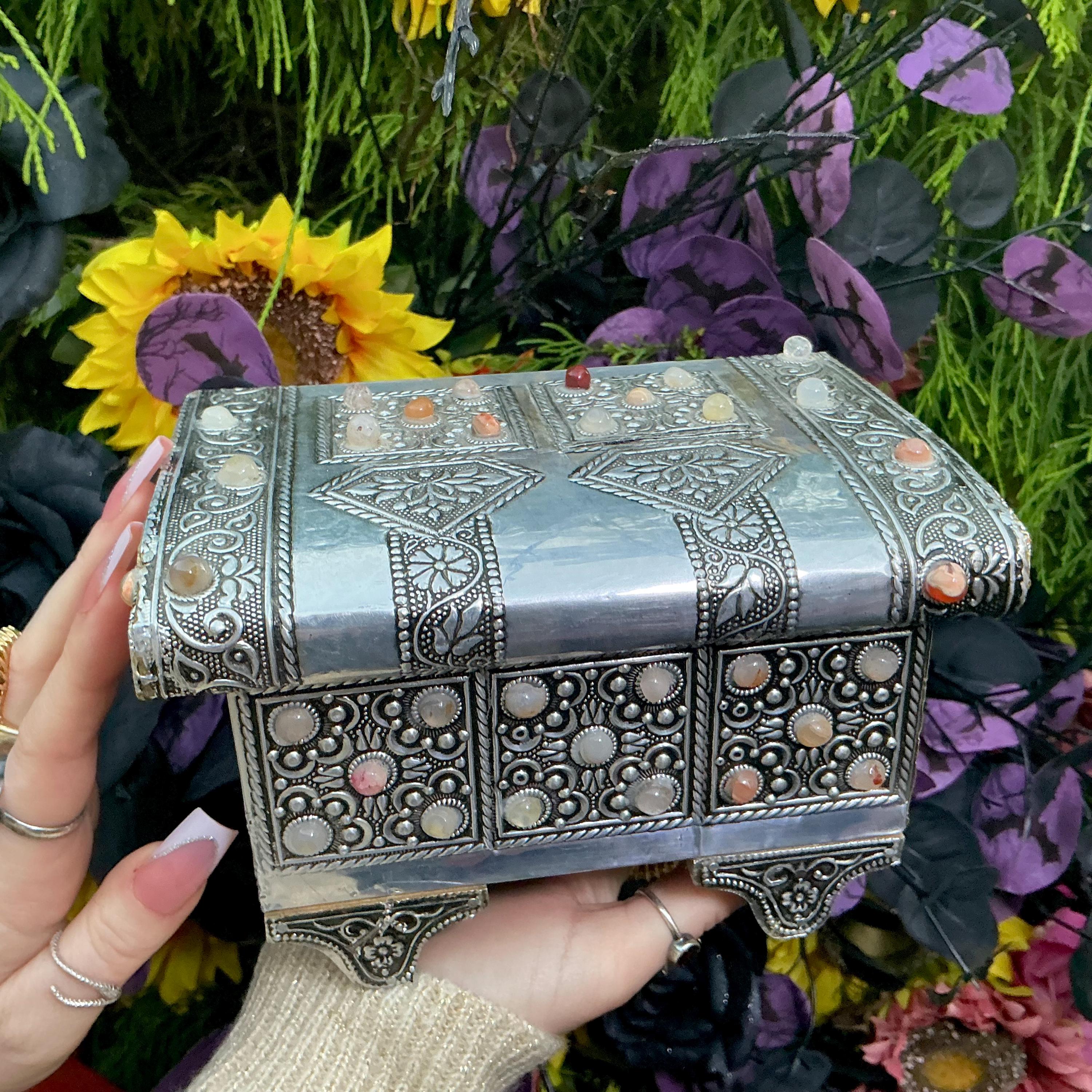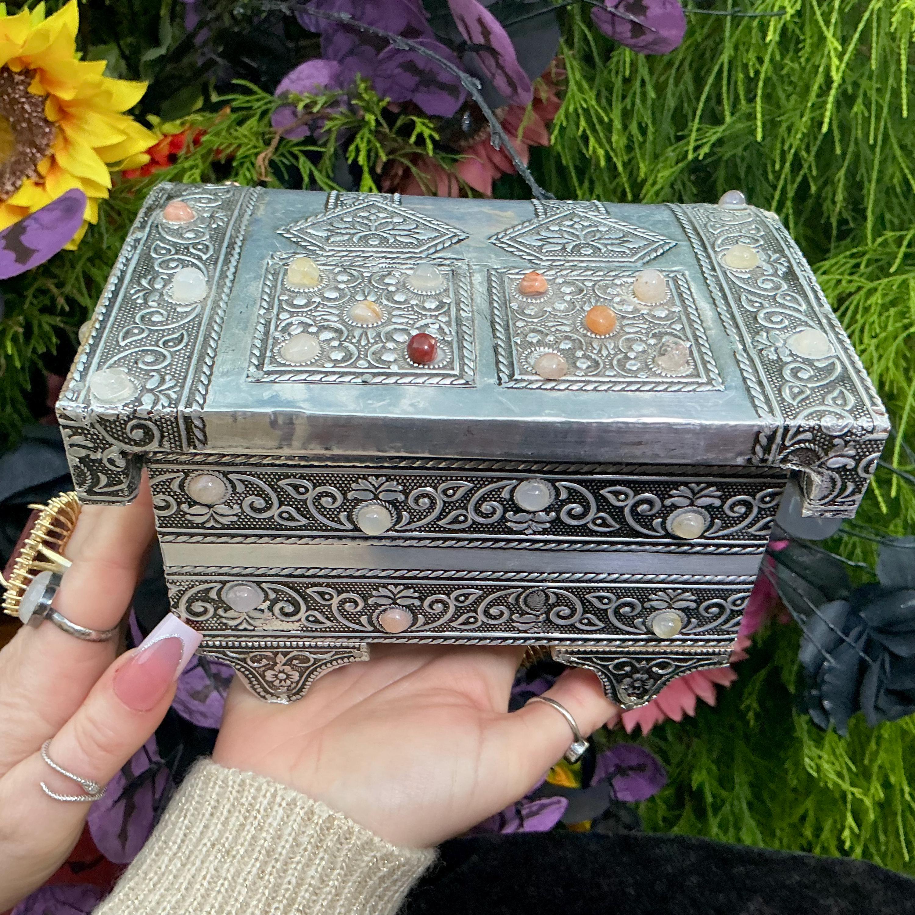 The Vintage Moroccan jewelry box is inlaid with semi-precious agate stones and covered with silvered metal filigree.