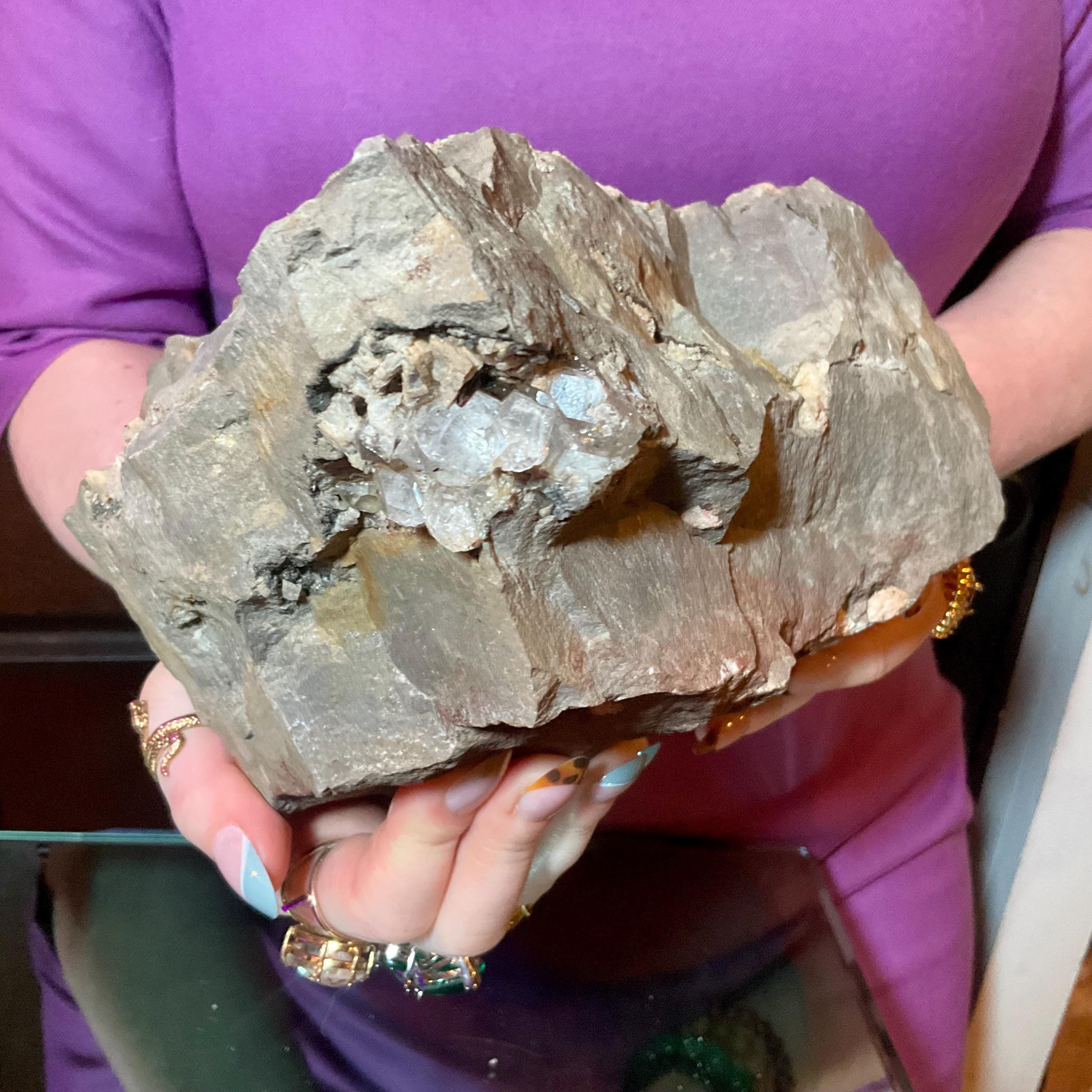 This stone is so beautiful because it is a natural cluster cut from solid stone with an undisturbed pocket of Herkimer Diamonds surrounded by natural druzy crystal caves full of sparkling colorful rainbows and gorgeous black inclusions deep within the crystal points growing in the center of the natural matrix making this a truly a one-of-a-kind treasure.