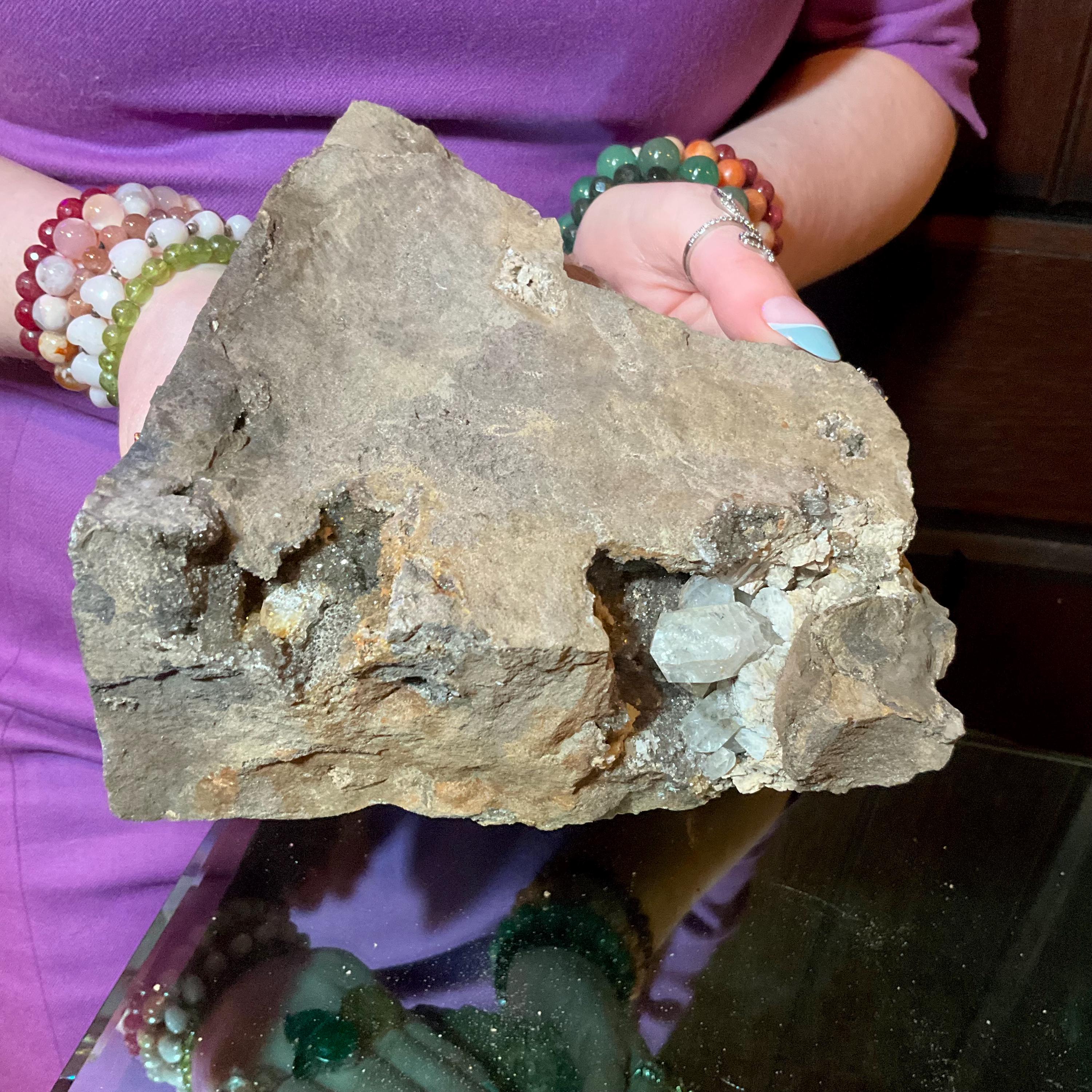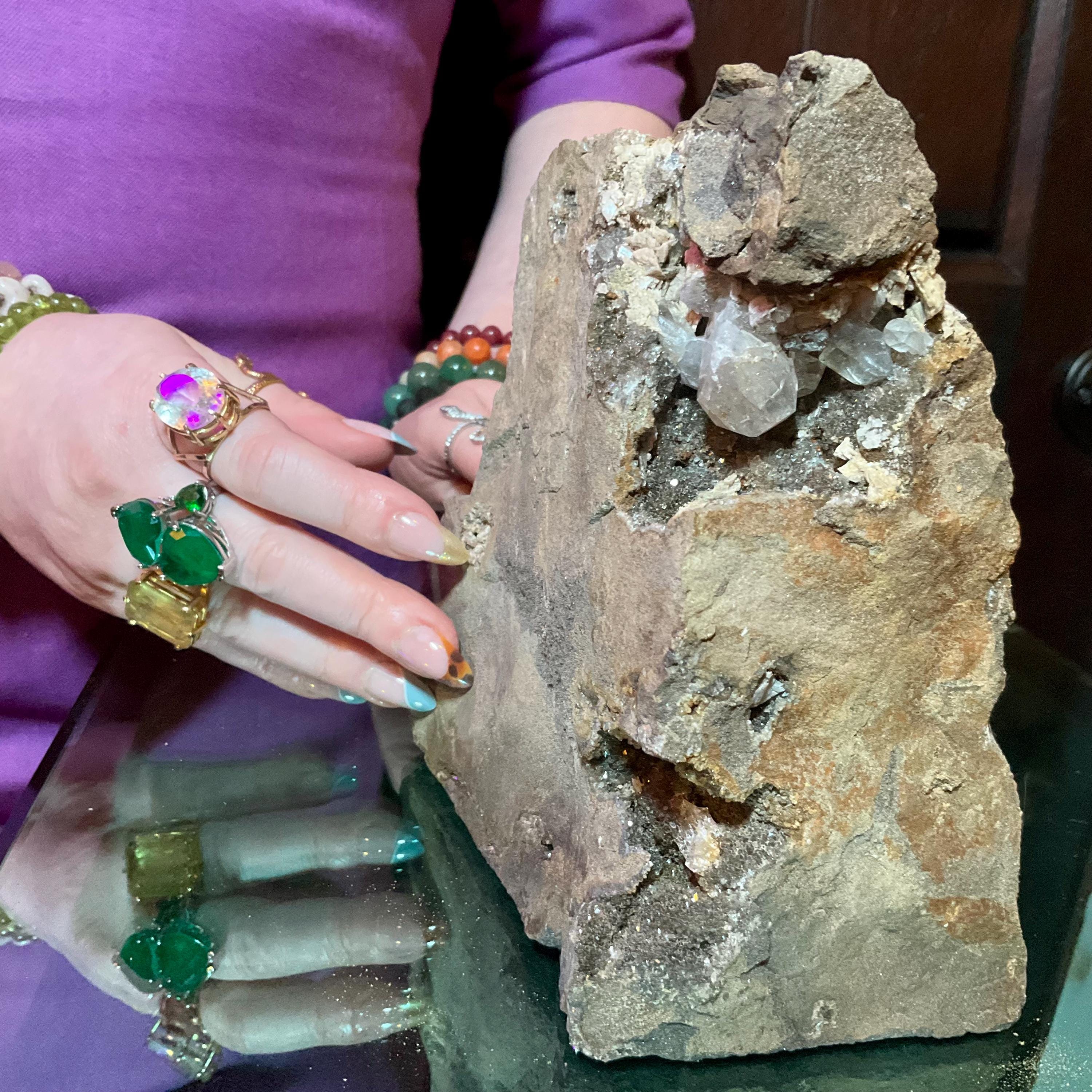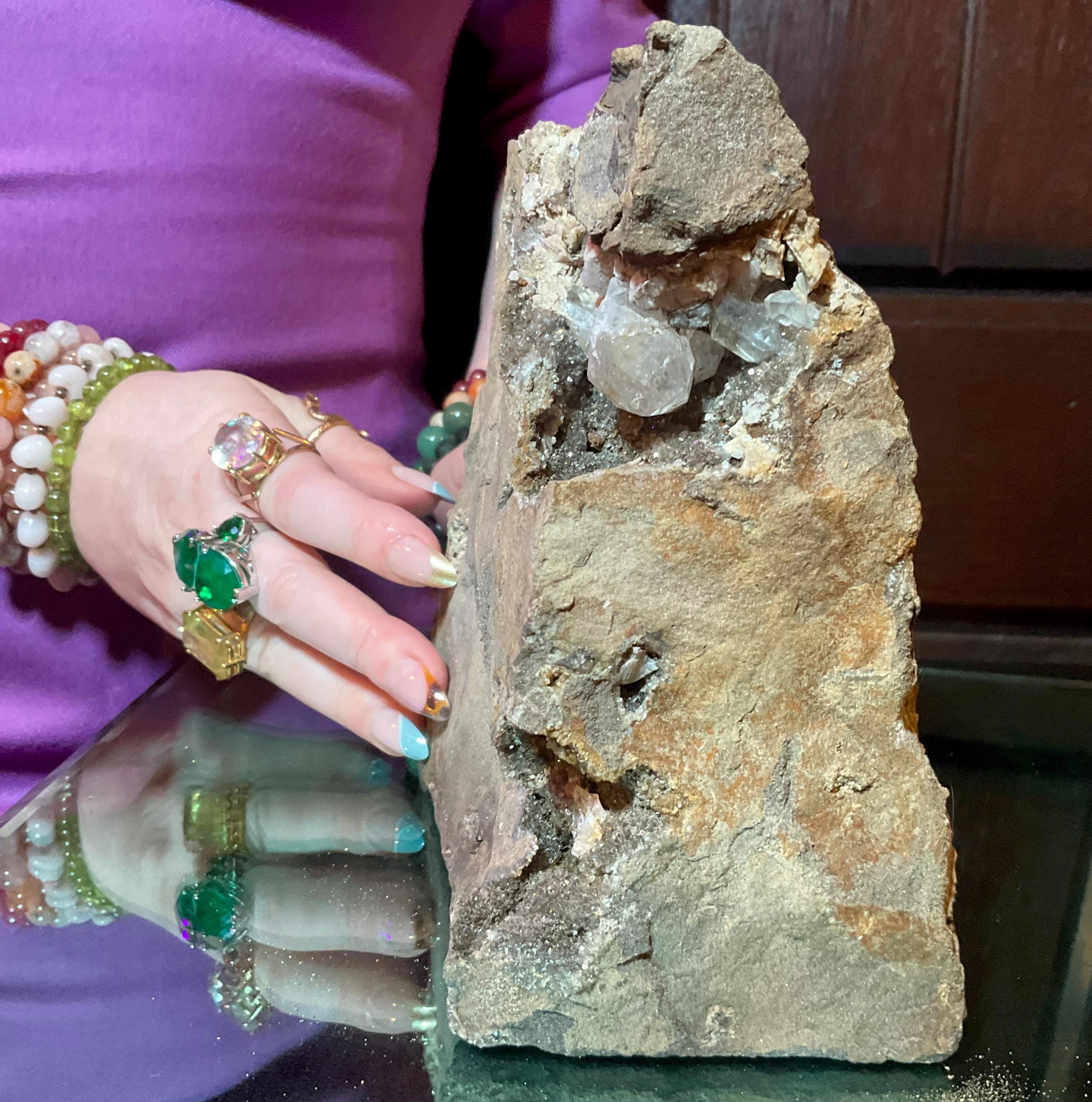This stone is so beautiful because it is a natural cluster cut from solid stone with an undisturbed pocket of Herkimer Diamonds surrounded by natural druzy crystal caves full of sparkling colorful rainbows and gorgeous black inclusions deep within the crystal points growing in the center of the natural matrix making this a truly a one-of-a-kind treasure.