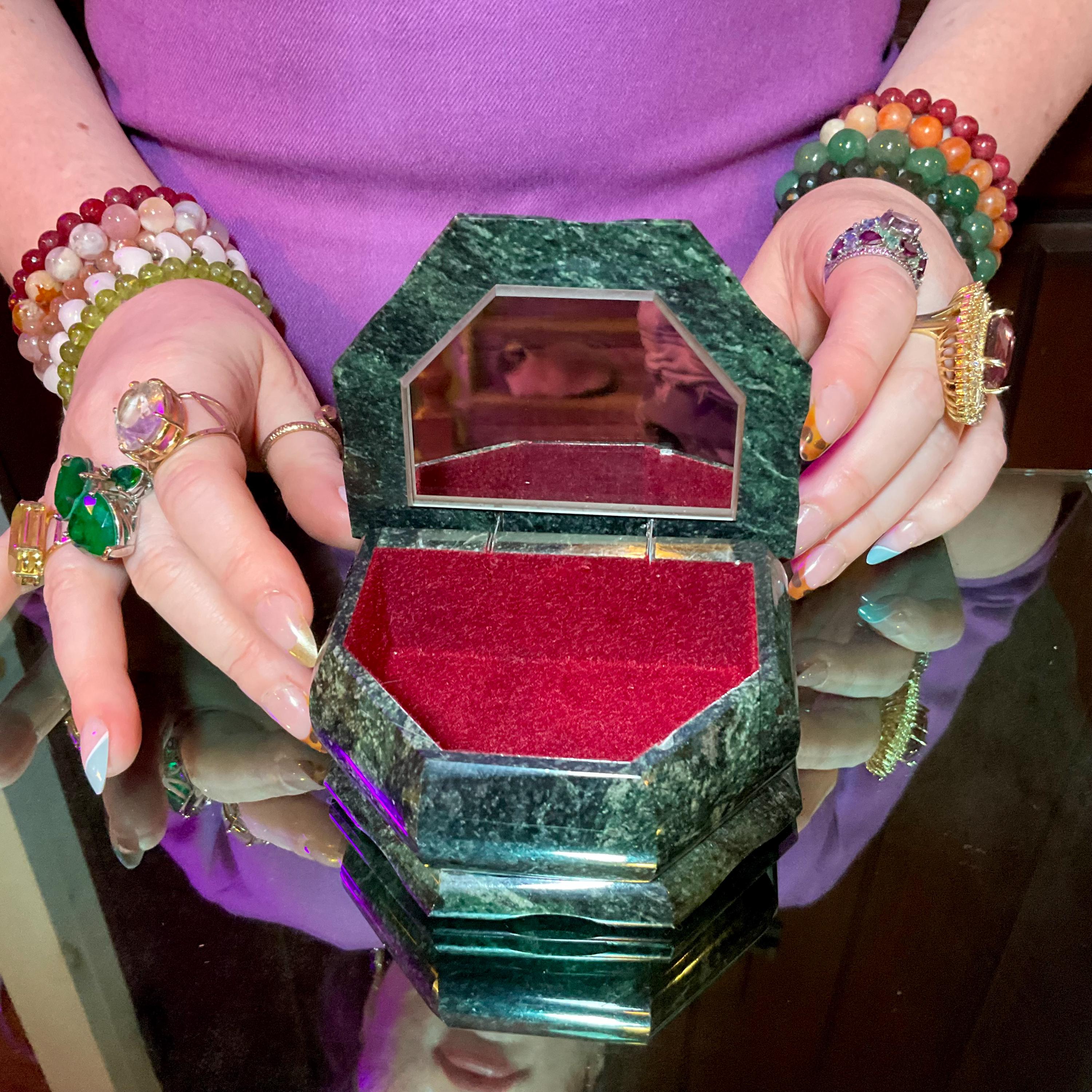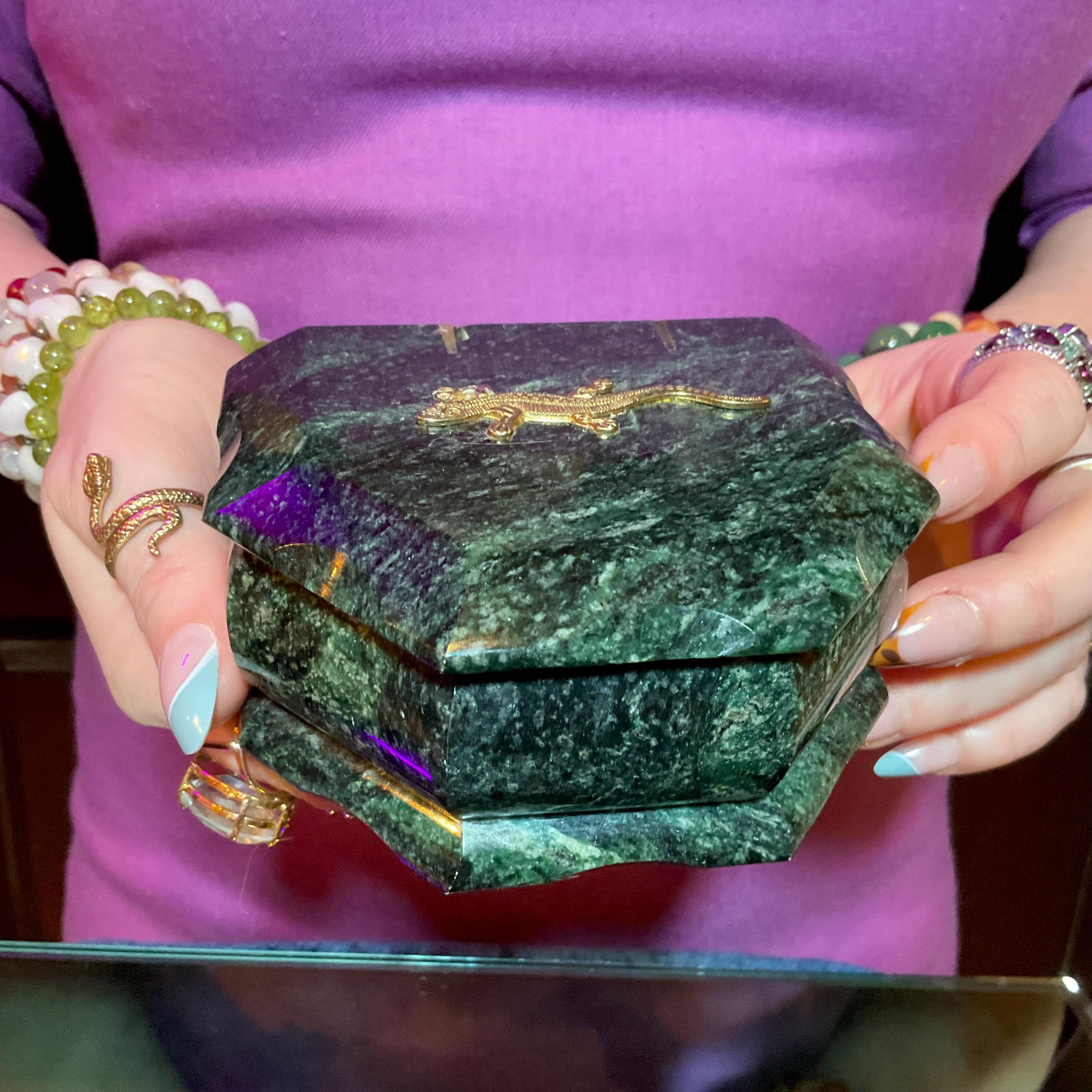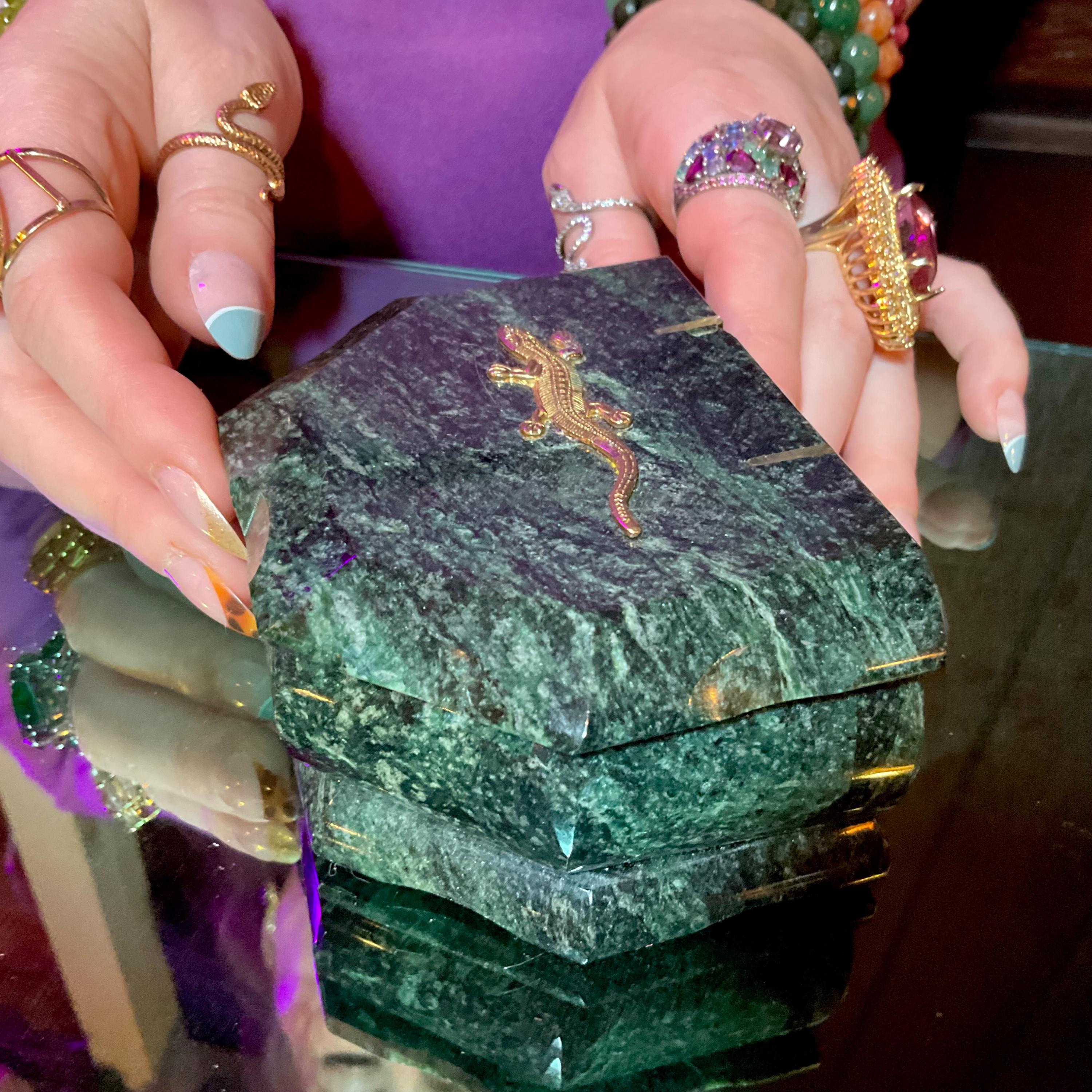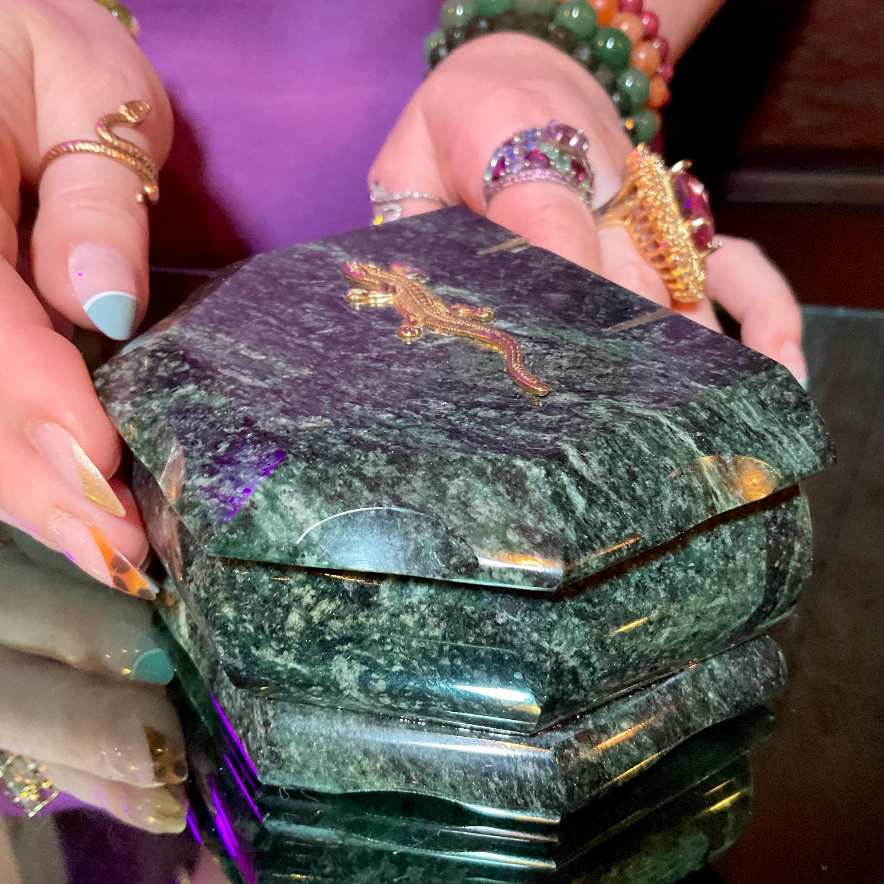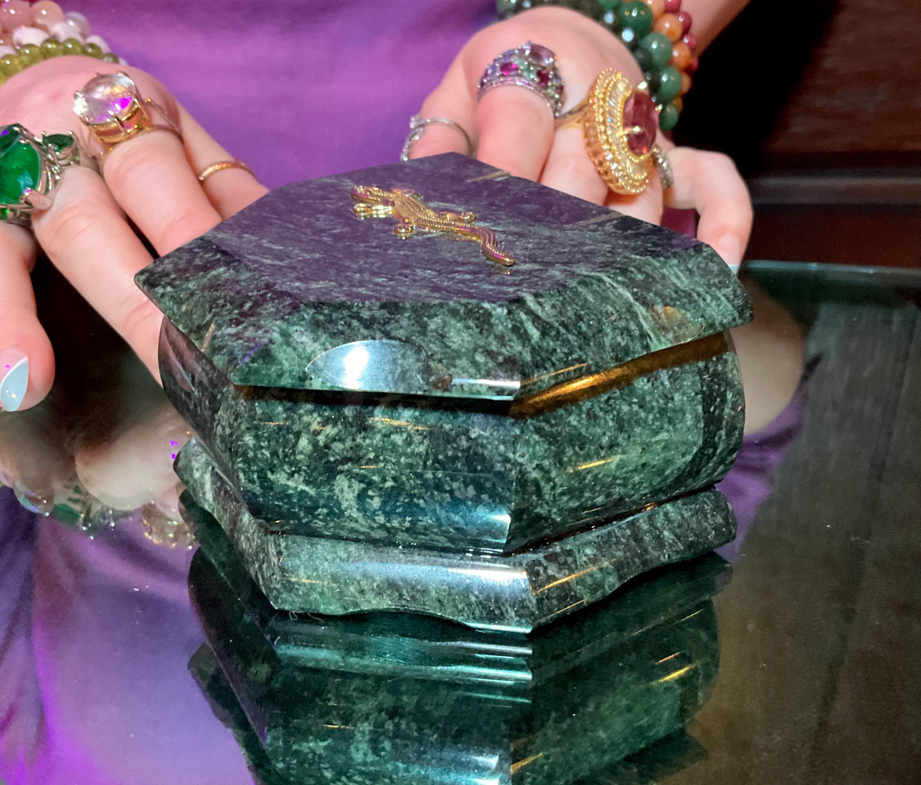 This is a one-of-a-kind crafted Green Serpentine Jewelry Box, and what makes this a fine artesian labor of love making it a true treasure designed by a master craftsman.