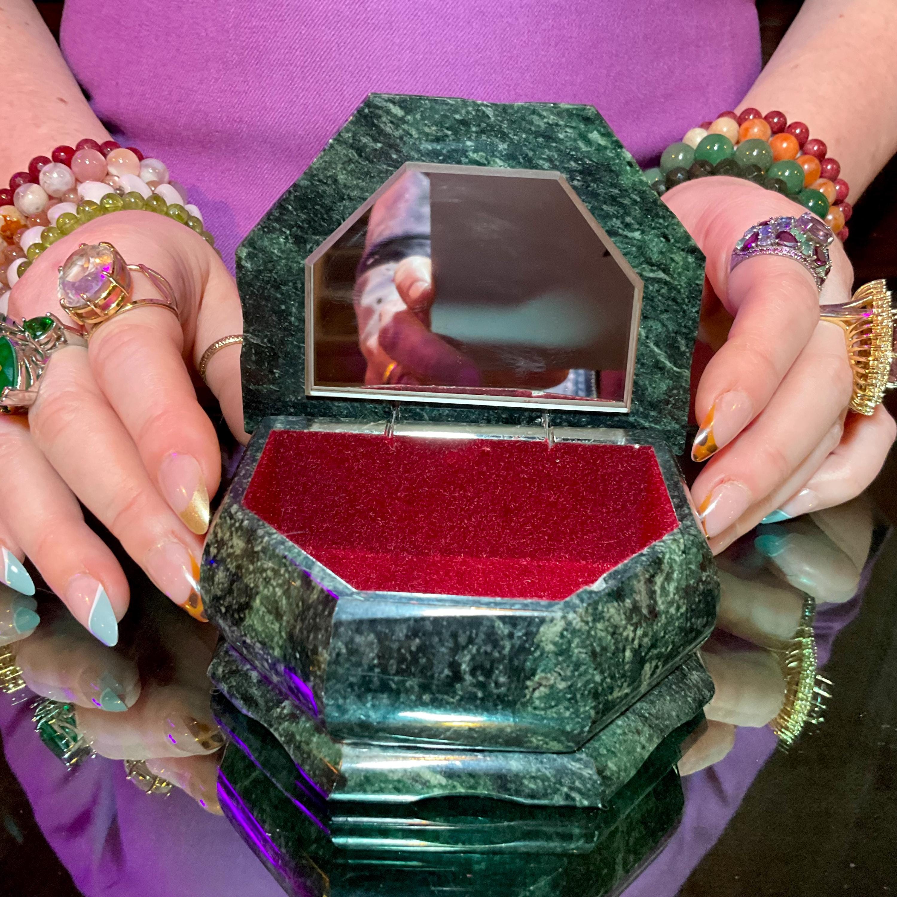 The Green Serpentine Jewelry Box It is hand made to perfection, and it measures, 3 inches long, 3 inches wide, and 2 inches tall, making this a great display item.