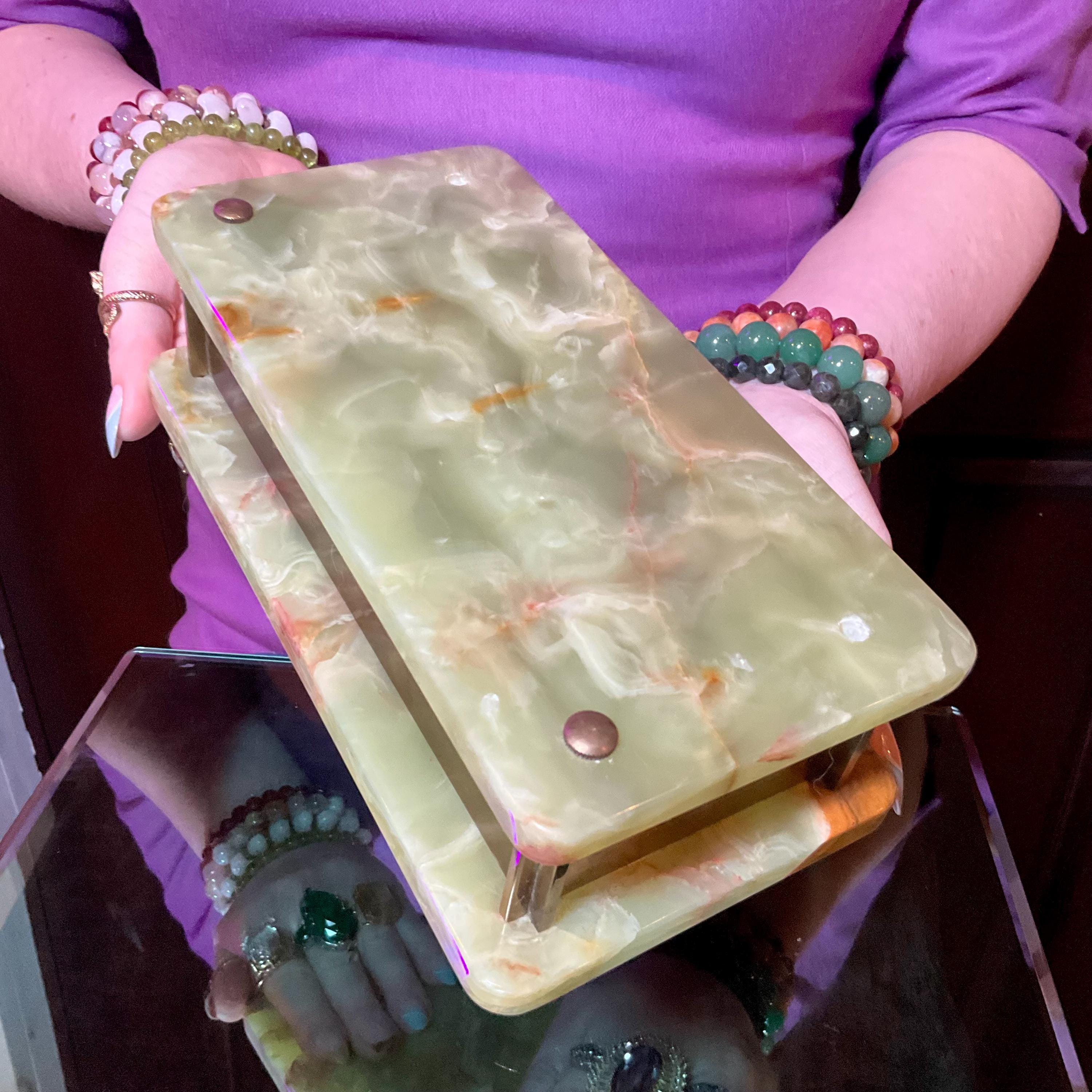 This is a one-of-a-kind carved Afghan Jade Jewelry Box that can also be used as a charging box for your crystals.
