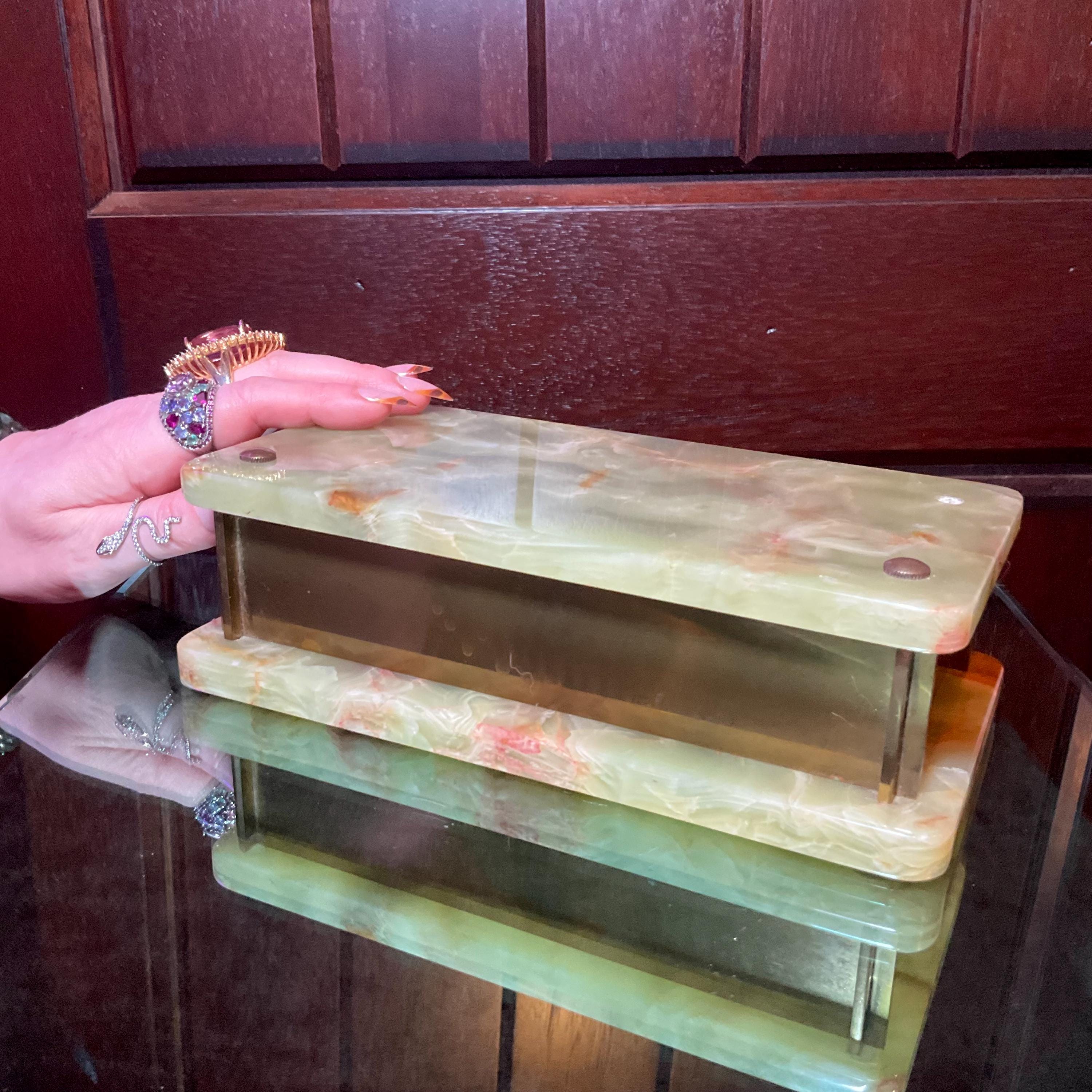 Afghan Jade Jewelry Box with Hinged Lid ~8 1/2" Long ~ Vintage Hand Carved Display Charging Box ~ Swirling Green, White & Golden Pattern