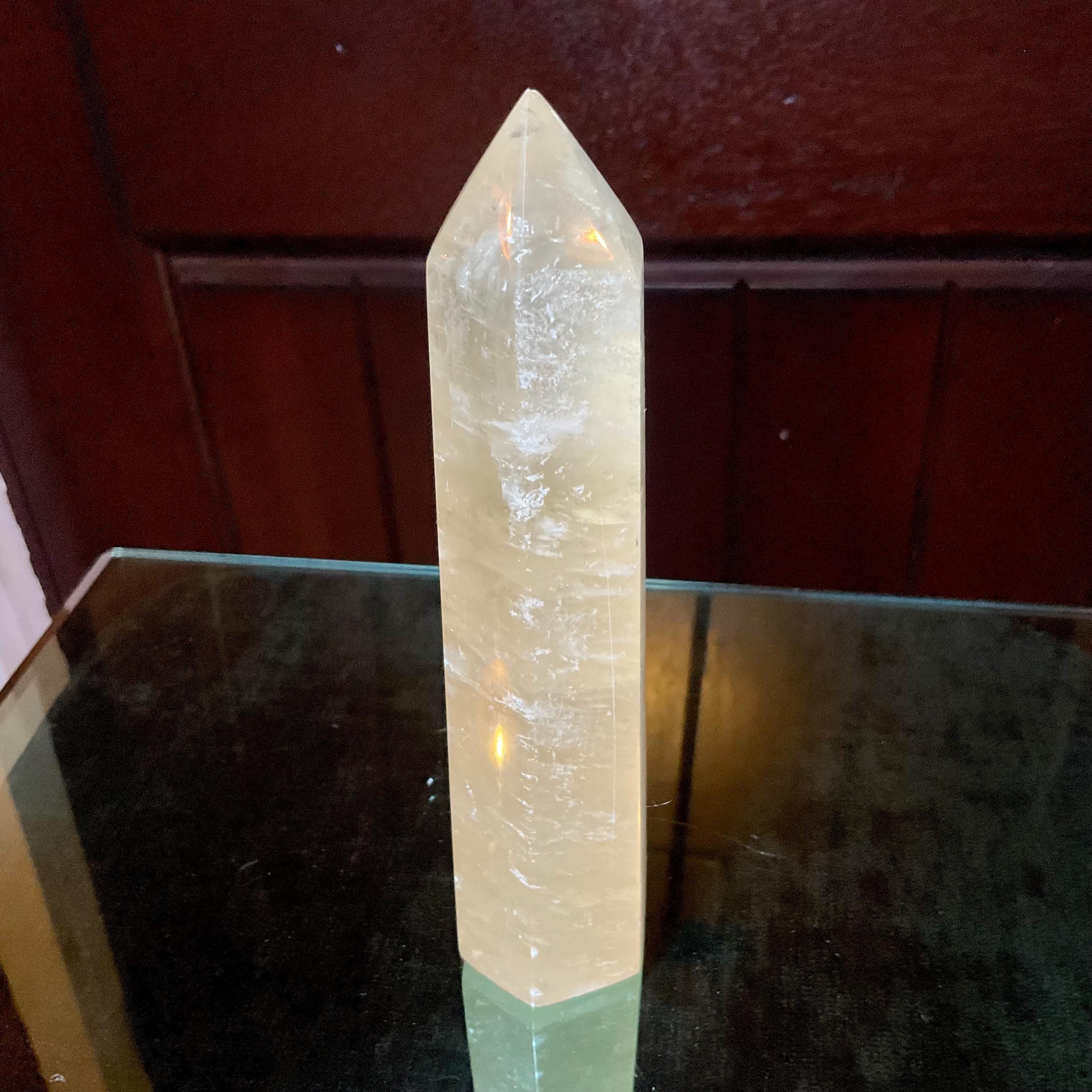 This beautiful stunning natural Clear Sunshine Yellow Golden Honey Calcite generator that measures 6 inches tall, 1 1/2 inches wide and weighs a mighty 13 1/2 ounces.