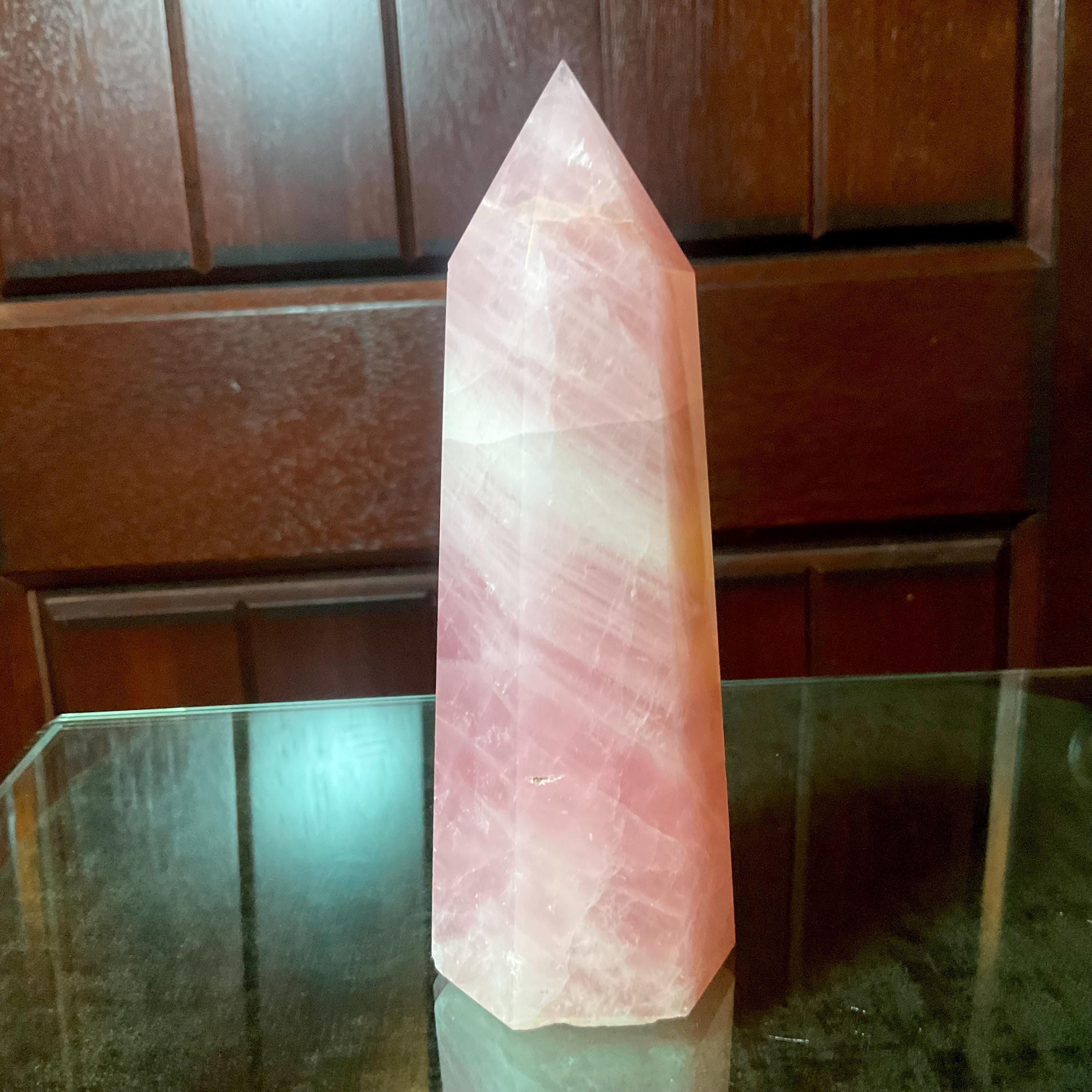 This is such a beautiful specimen of rose quartz, it is beautifully gem cut, the point is perfection, the generator is highly polished, and it is a large, glorious, chunky generator.