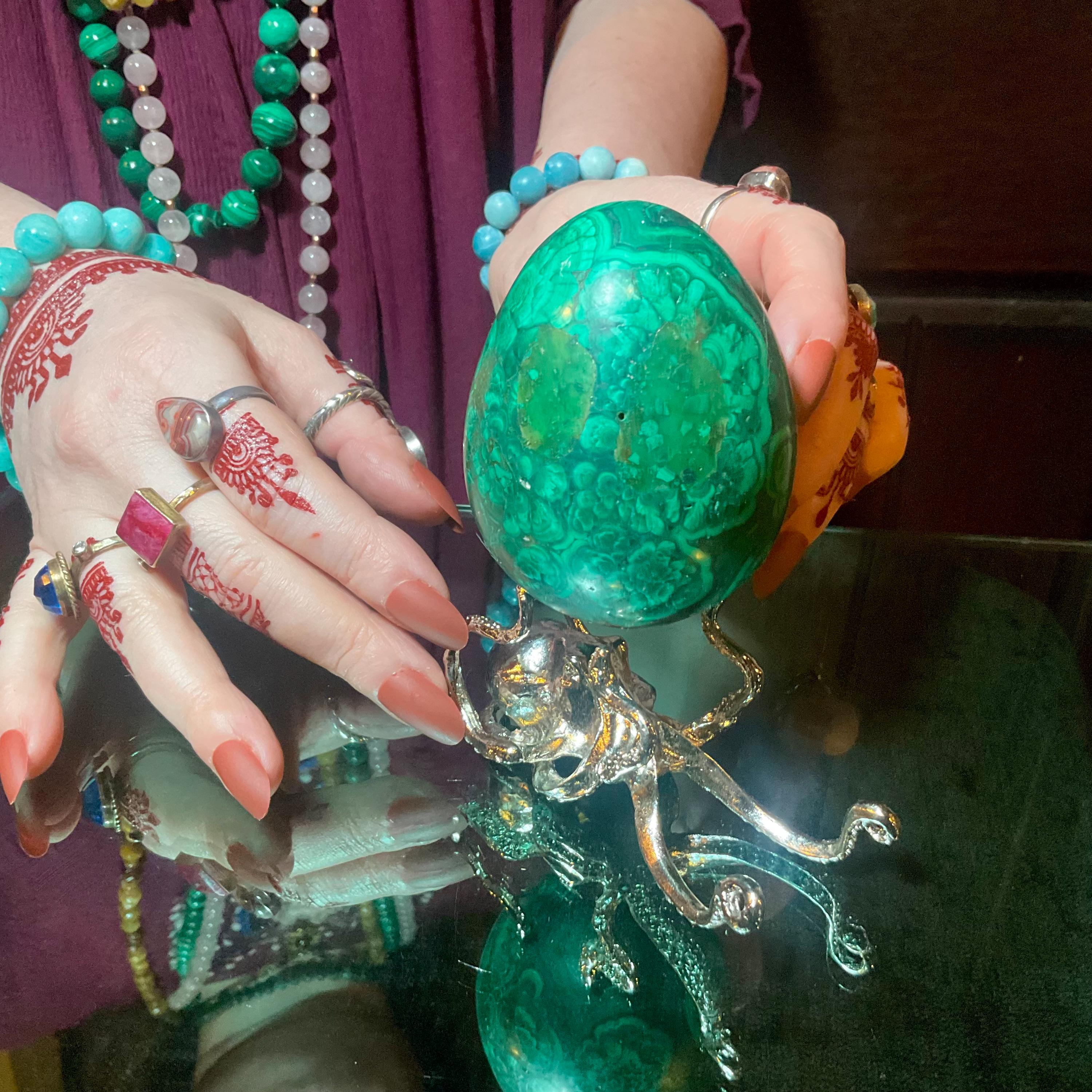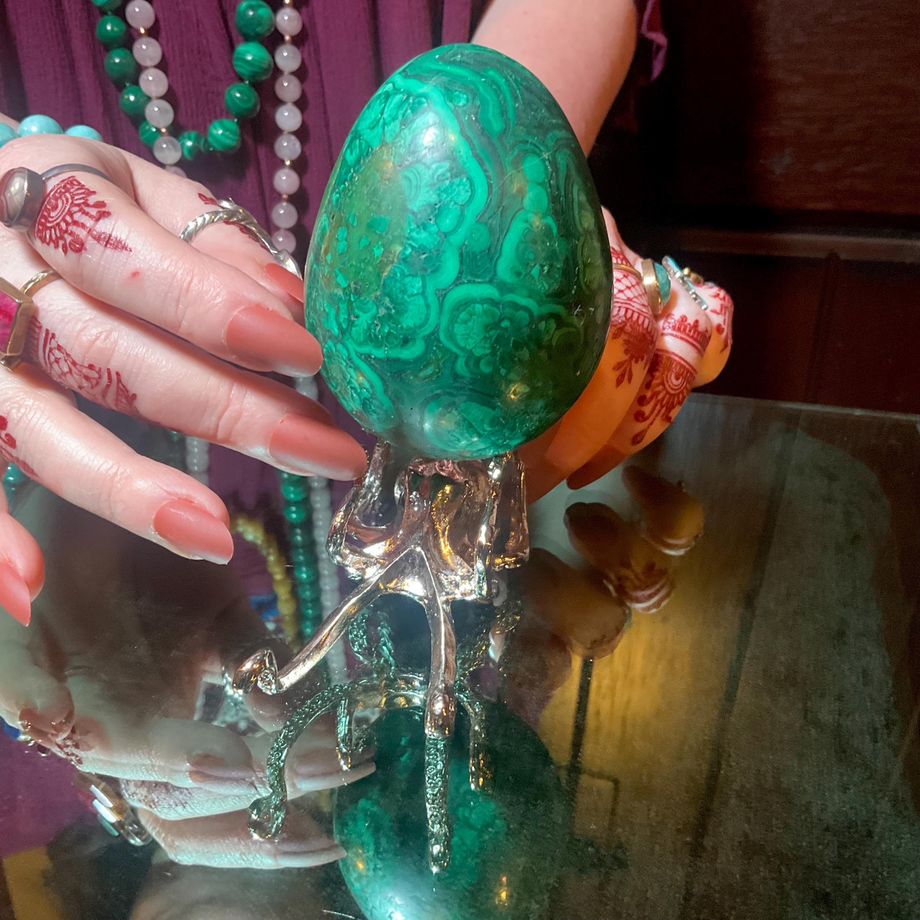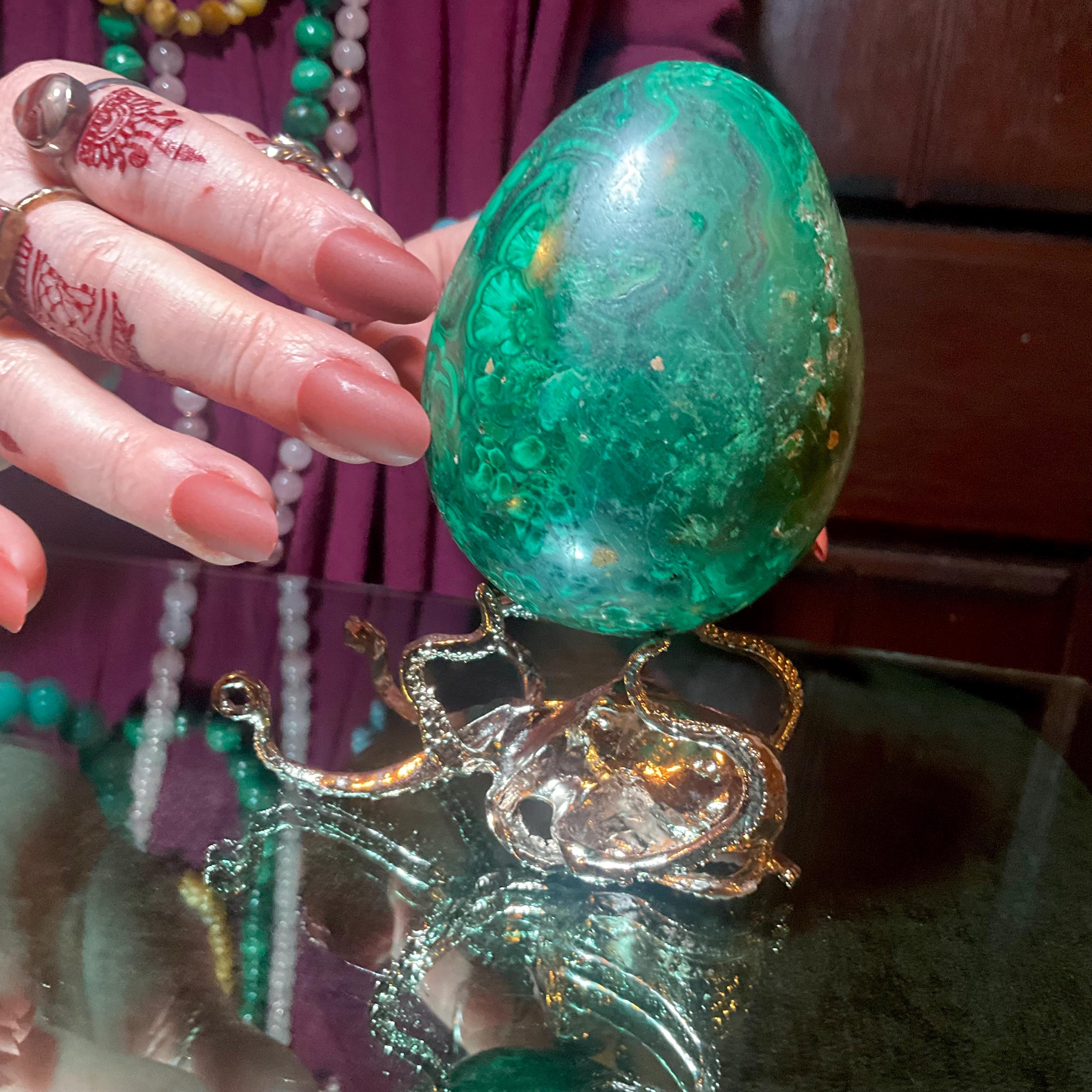 What makes this Malachite Egg so special is age, patina, and its vintage deco free form style.