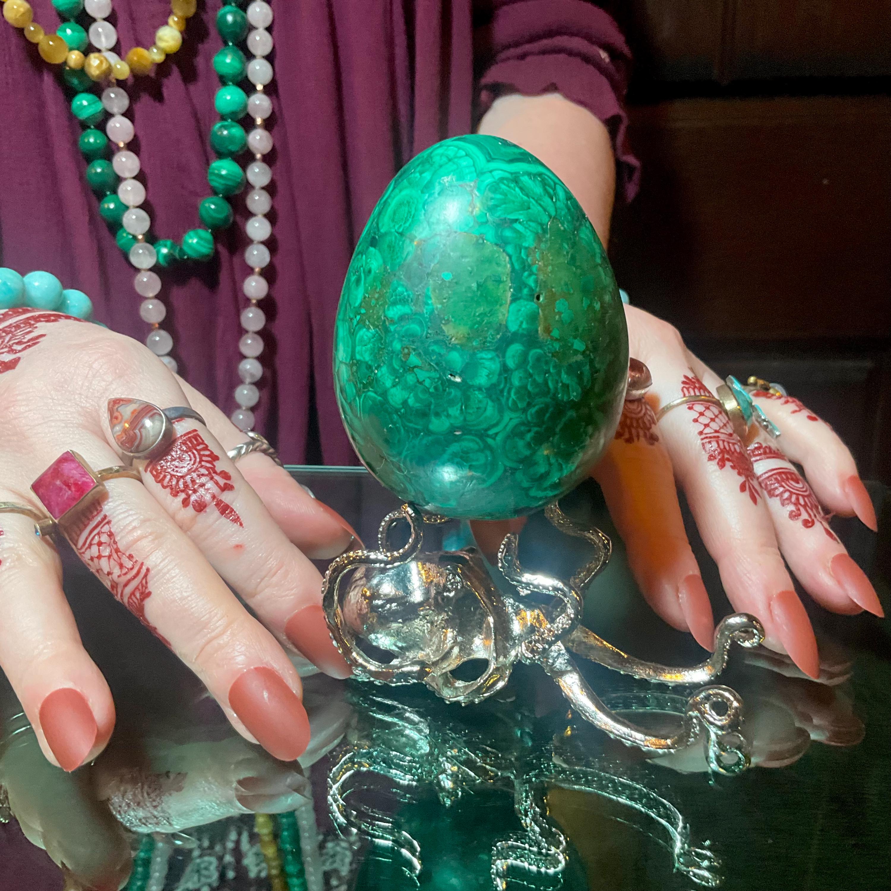 Malachite Egg Large 1 Lb. with Stand ~3" Tall ~ Hand Carved from Congo Africa ~ Swirling Bull's Eyes Patterns