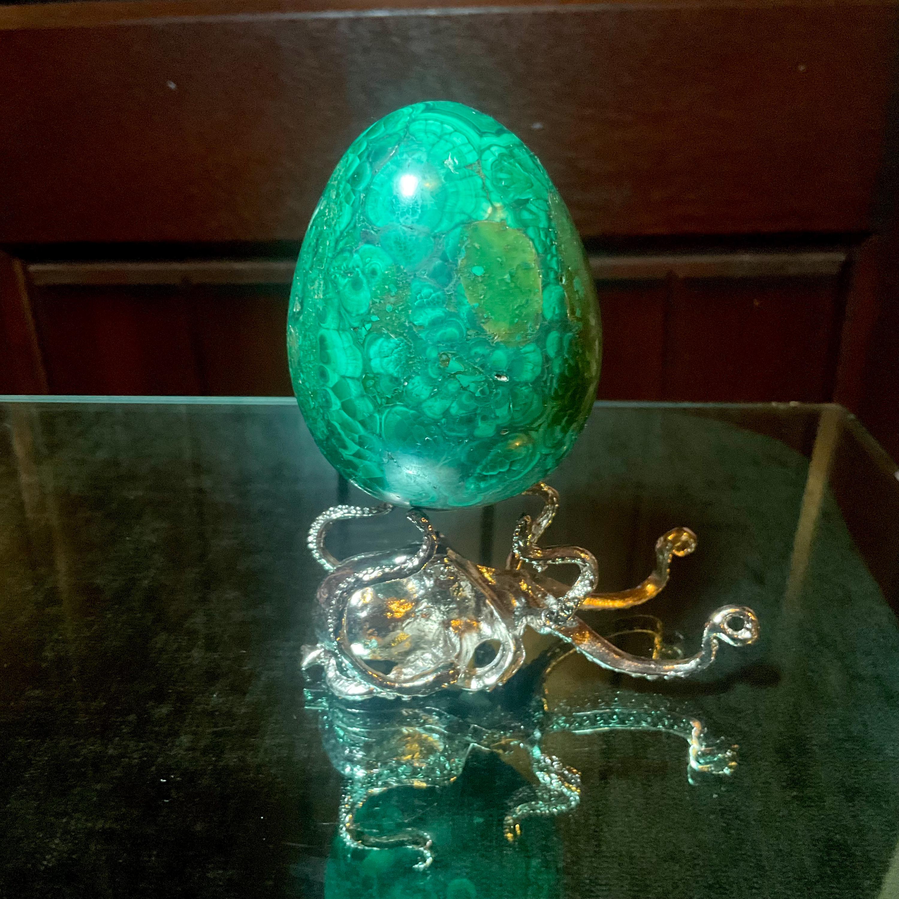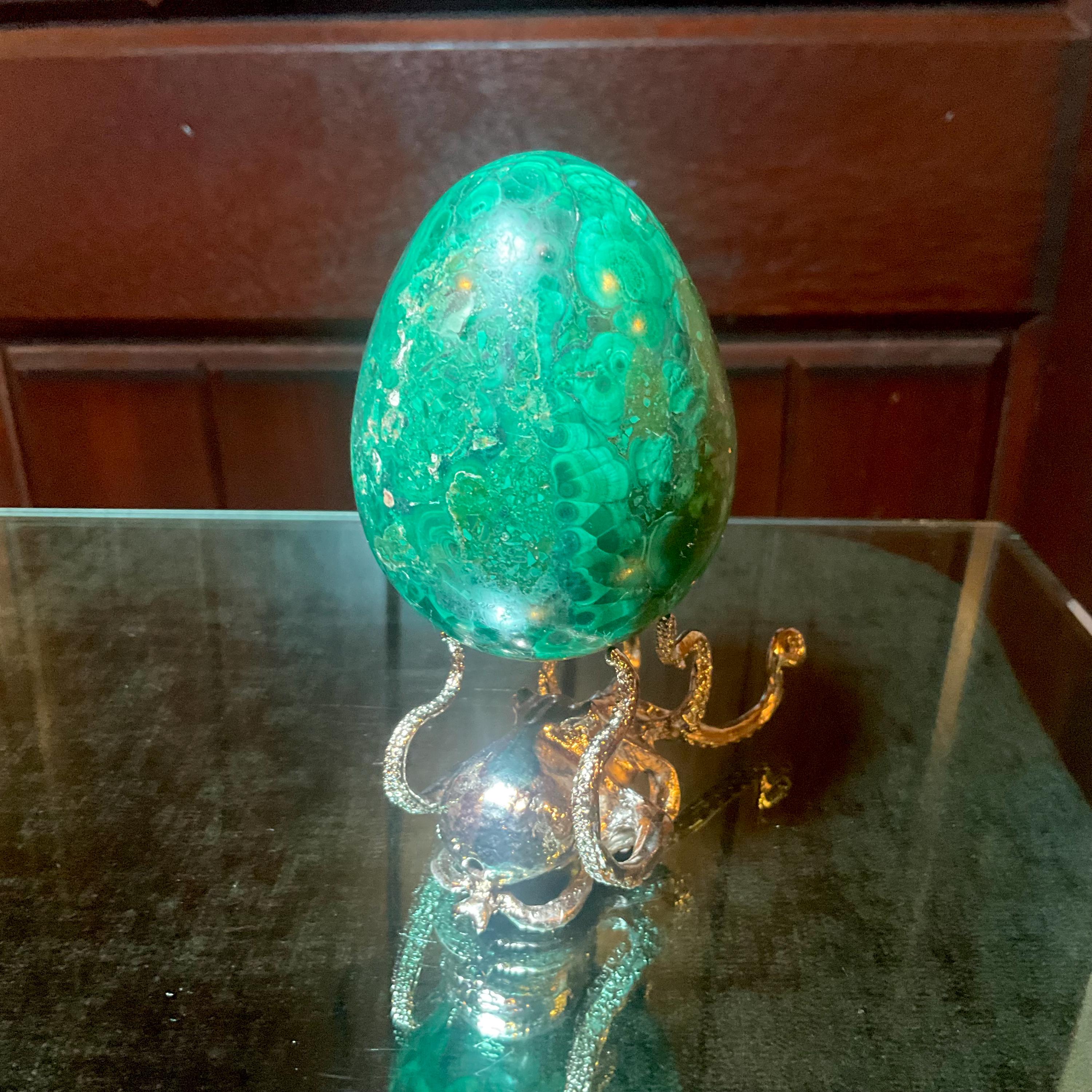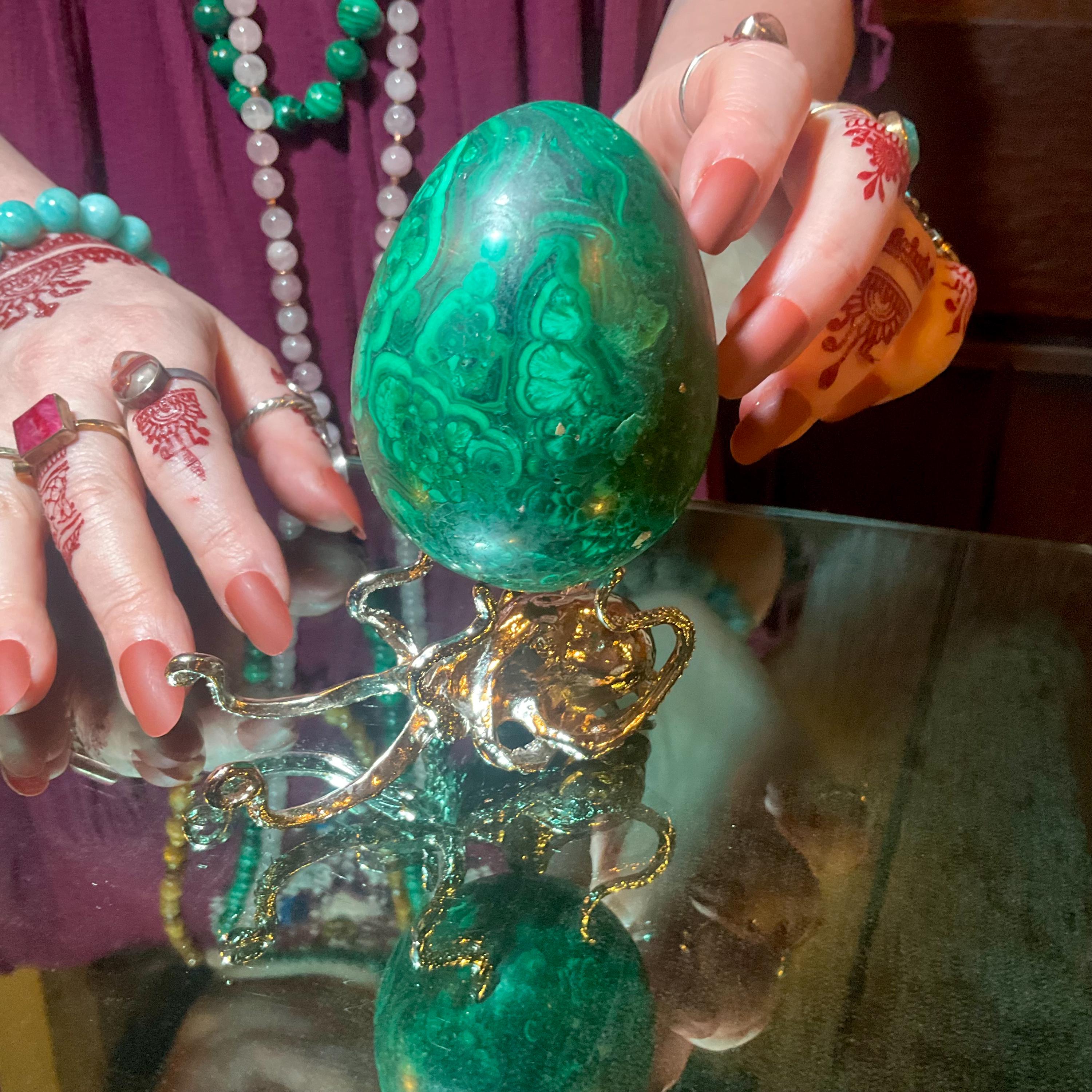 This is a one-of-a-kind carved malachite oval shaped egg.