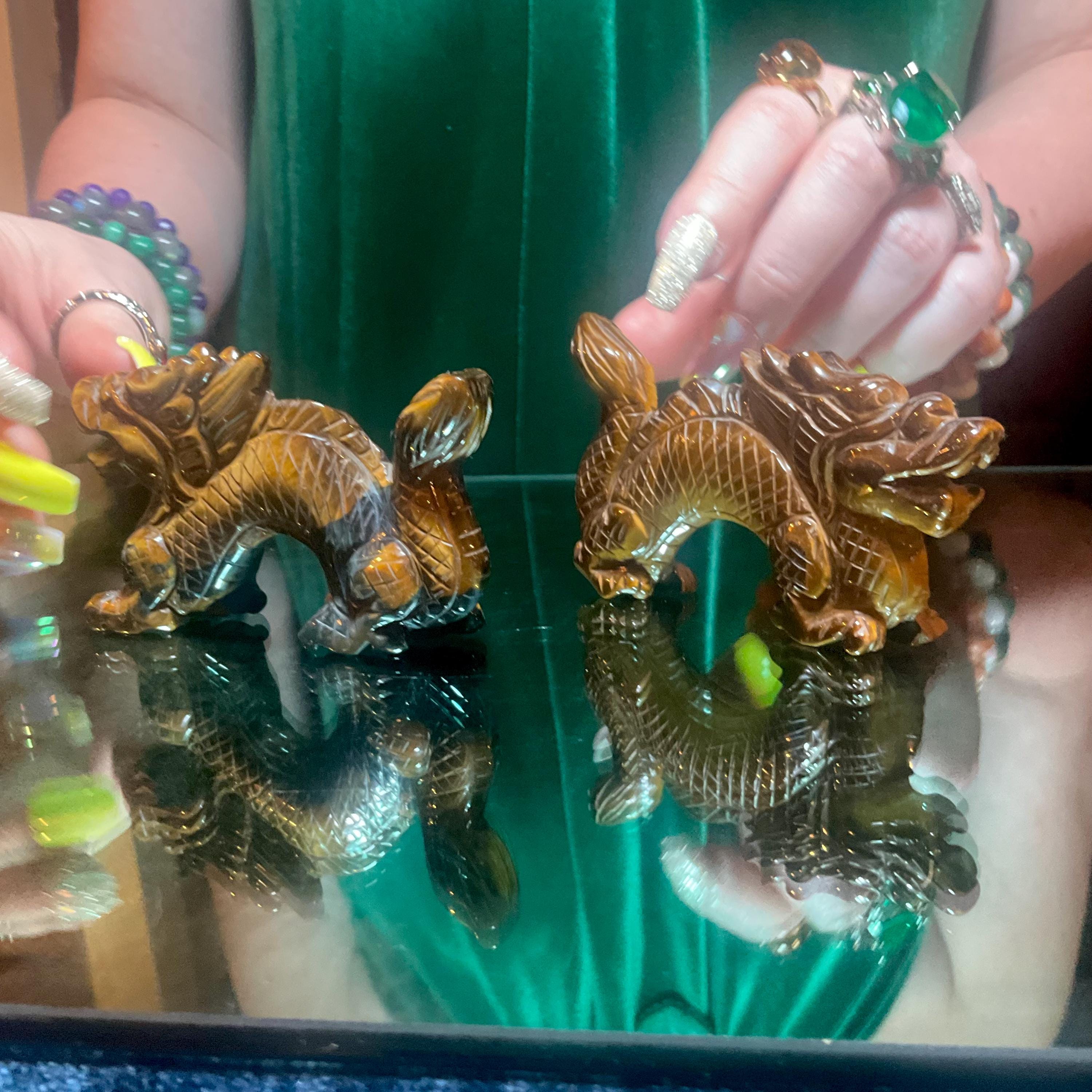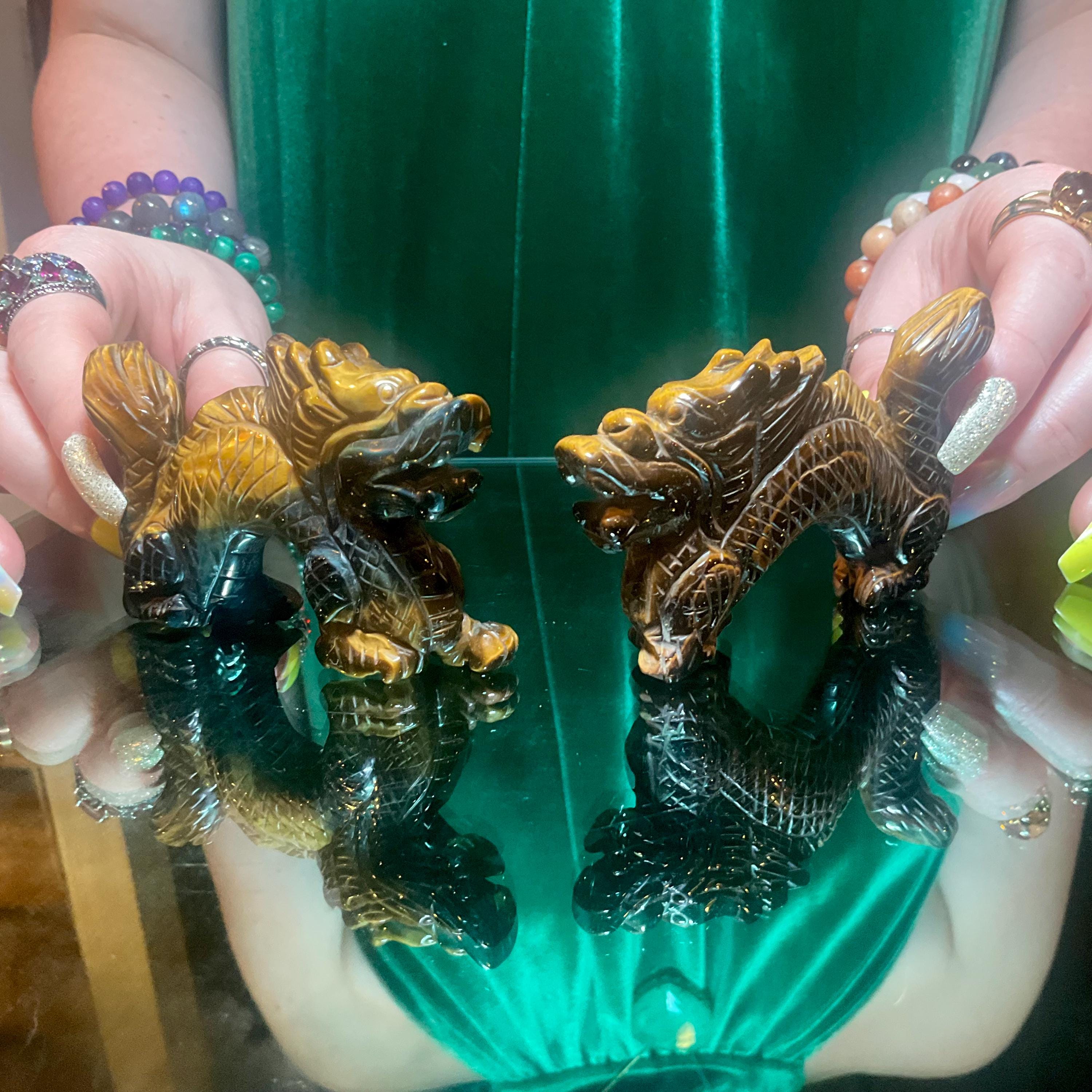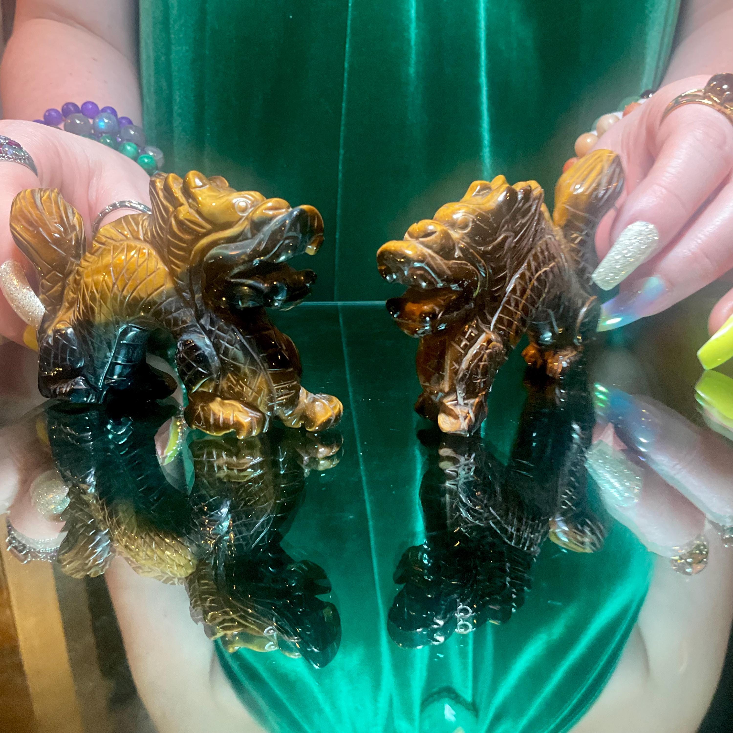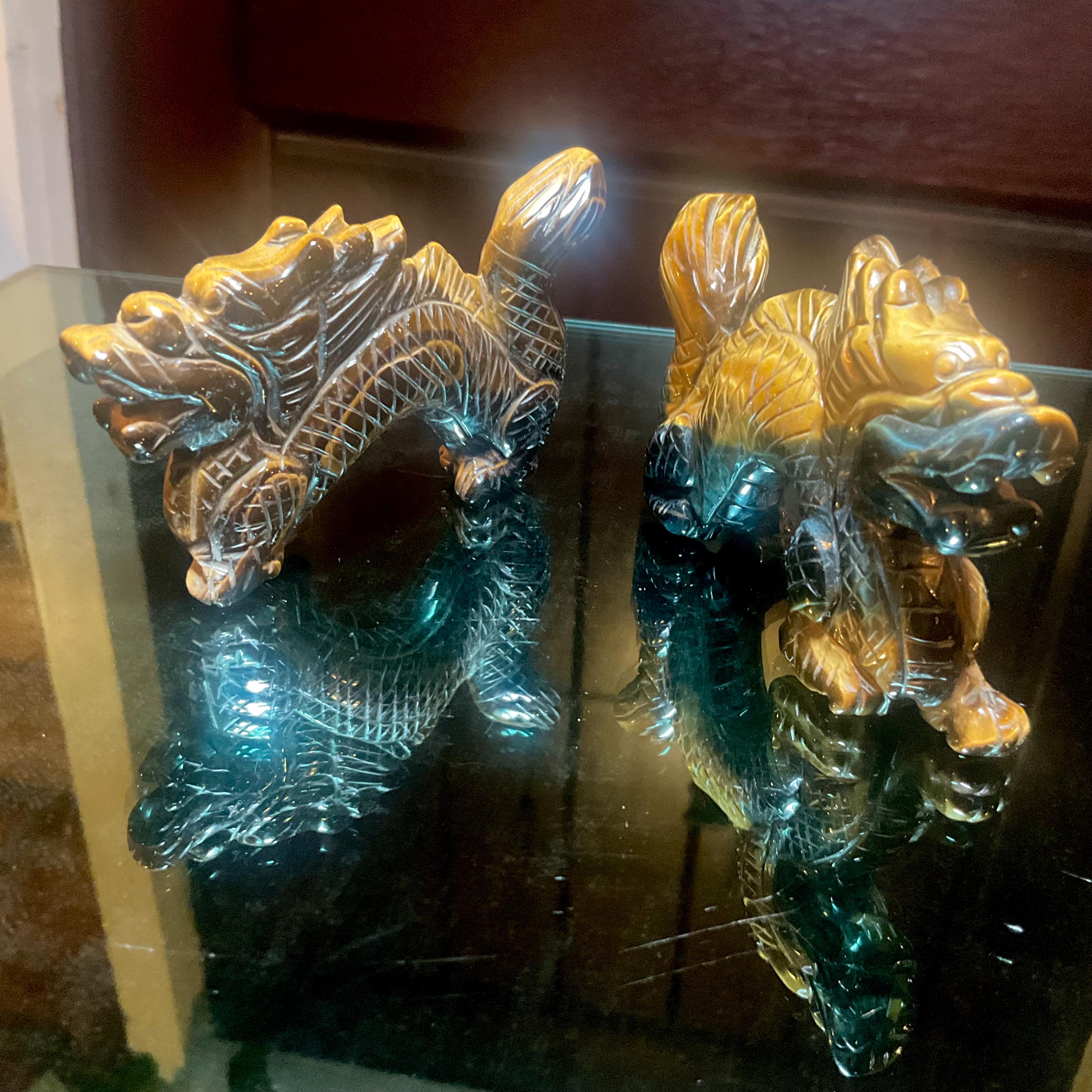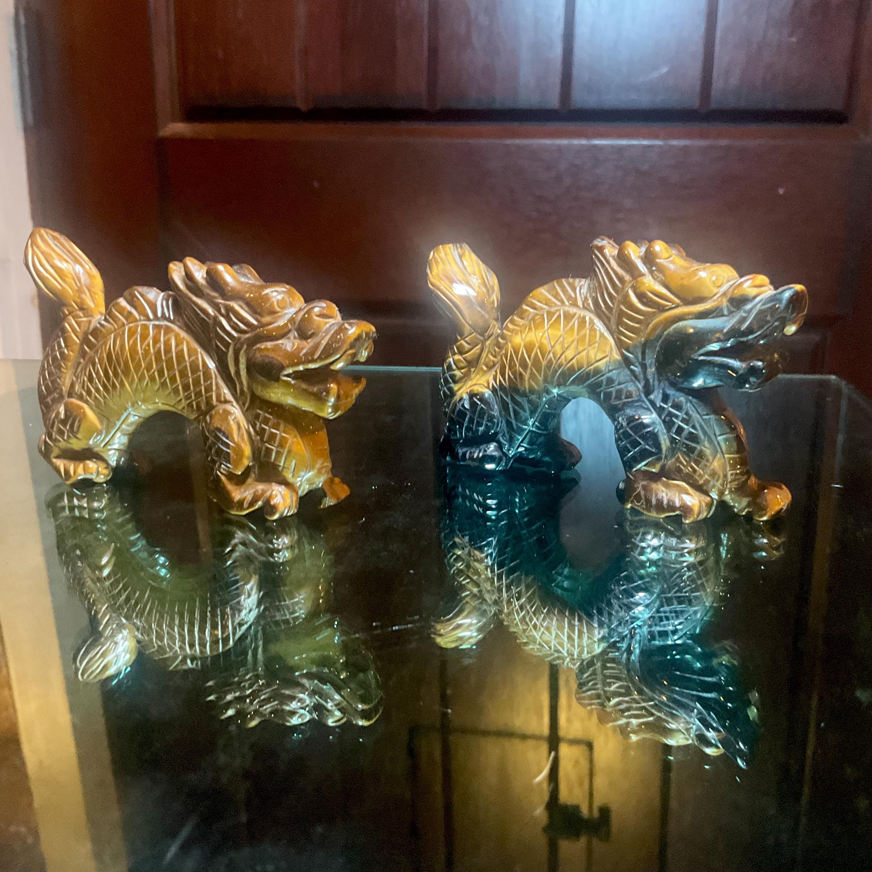 Tigers Eye Crystal Foo Dog Pair~ 4" Long ~ Hand Carved from South Africa ~ Sparkling Gold, Blue & Black Colors