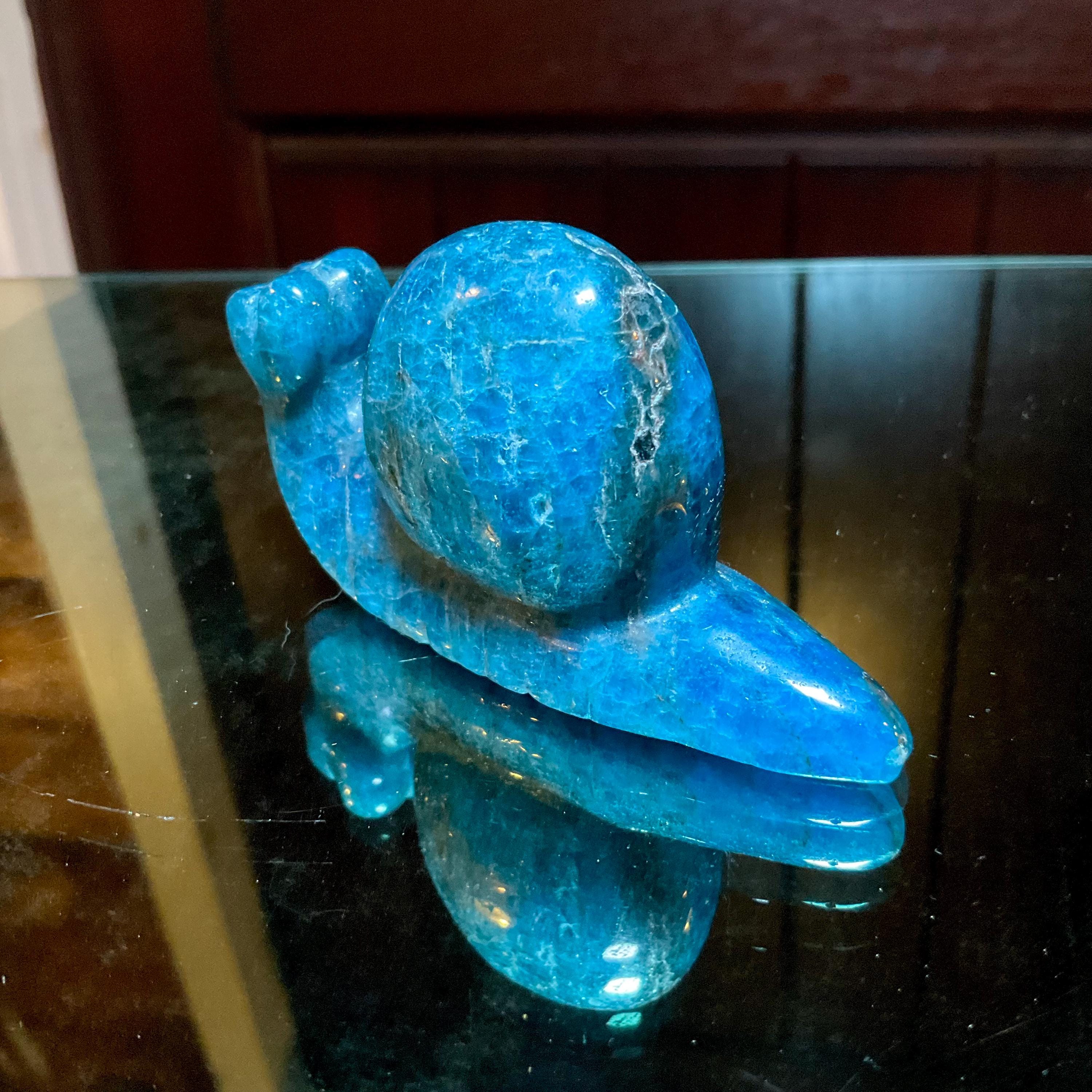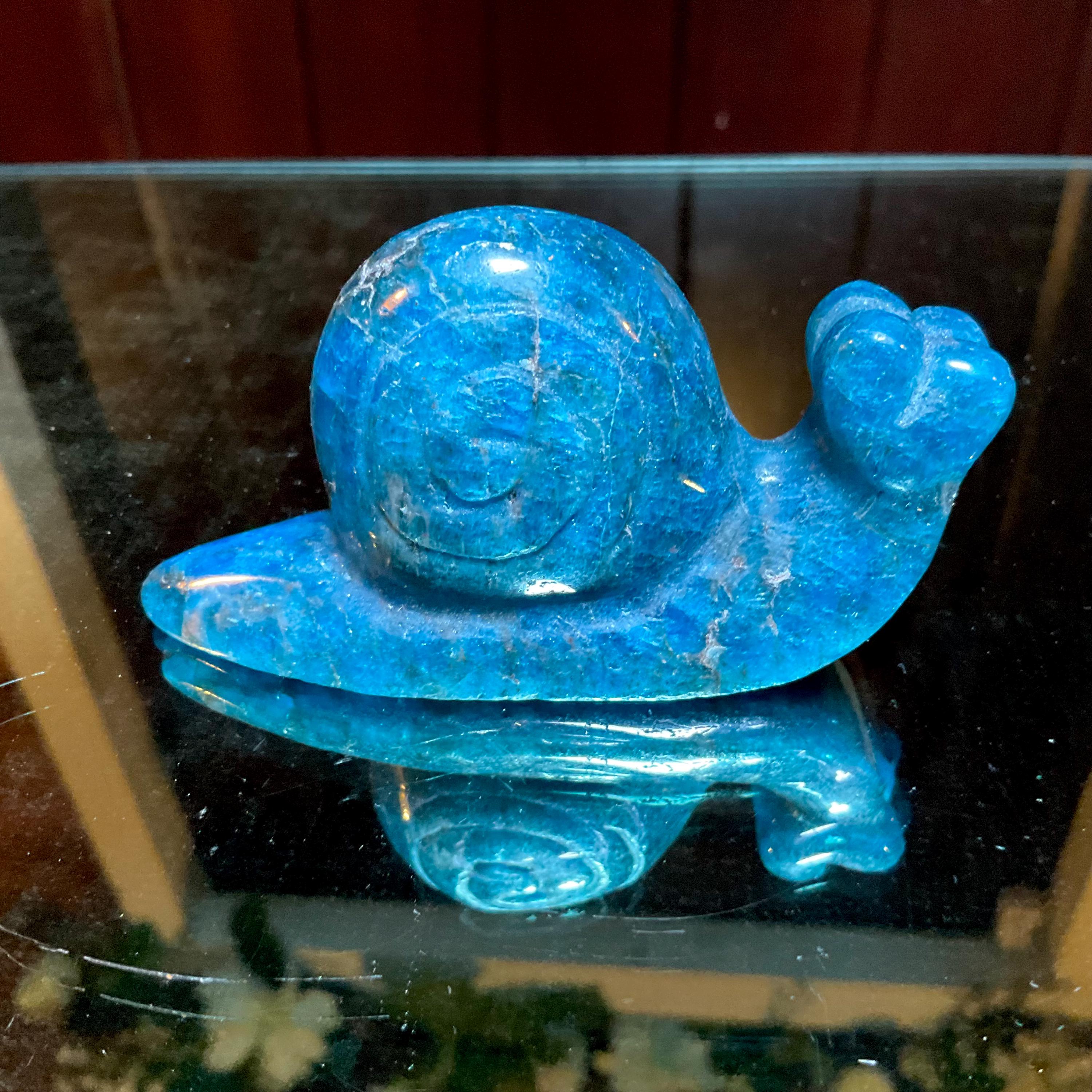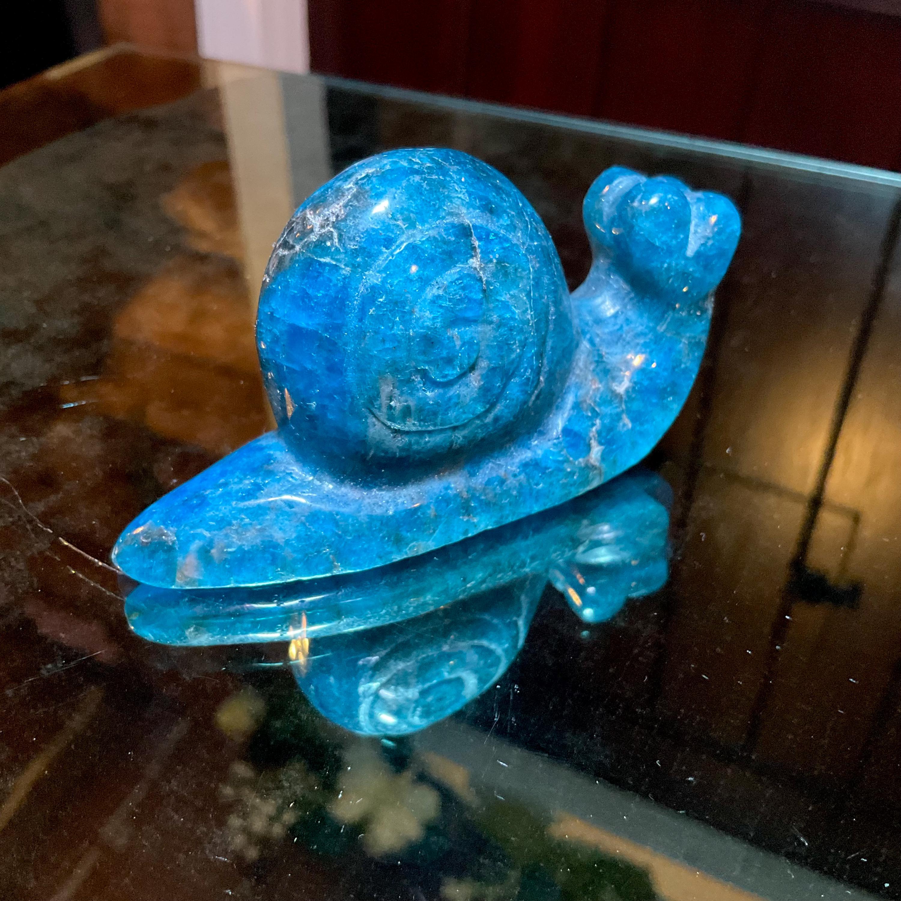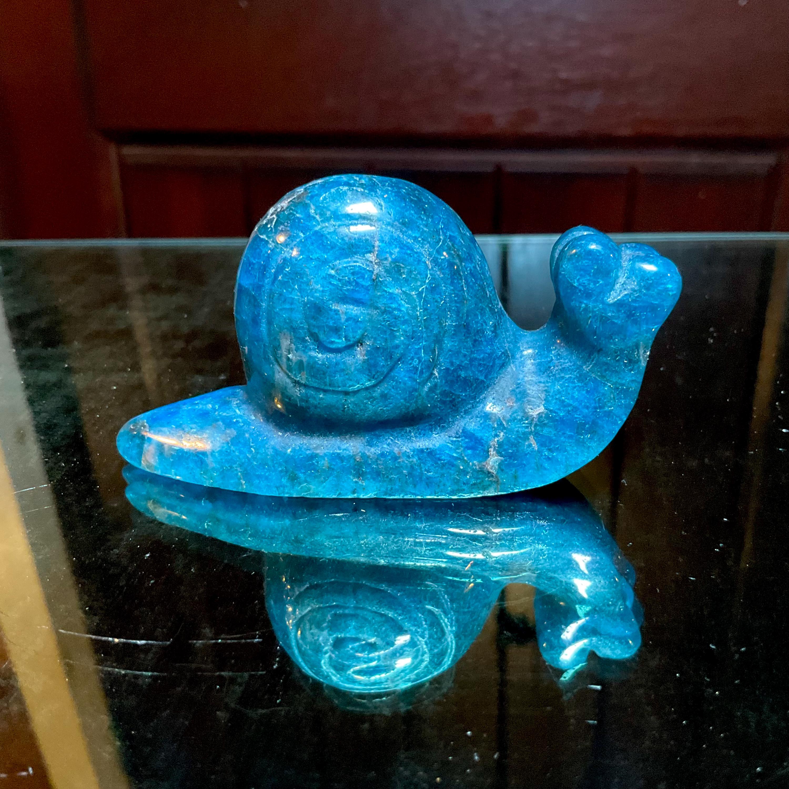 This is a one-of-a-kind carved Blue Apatite Crystal snail.