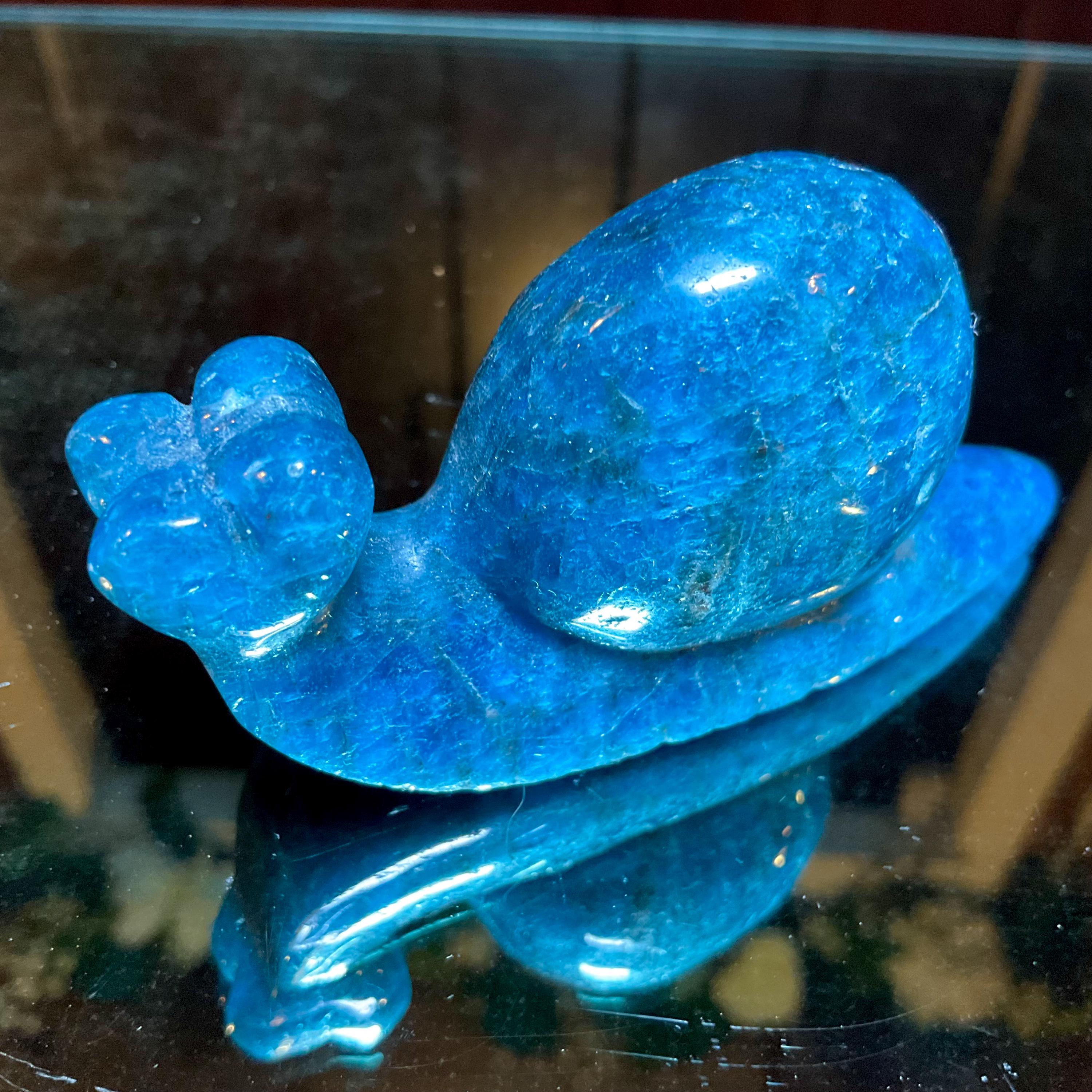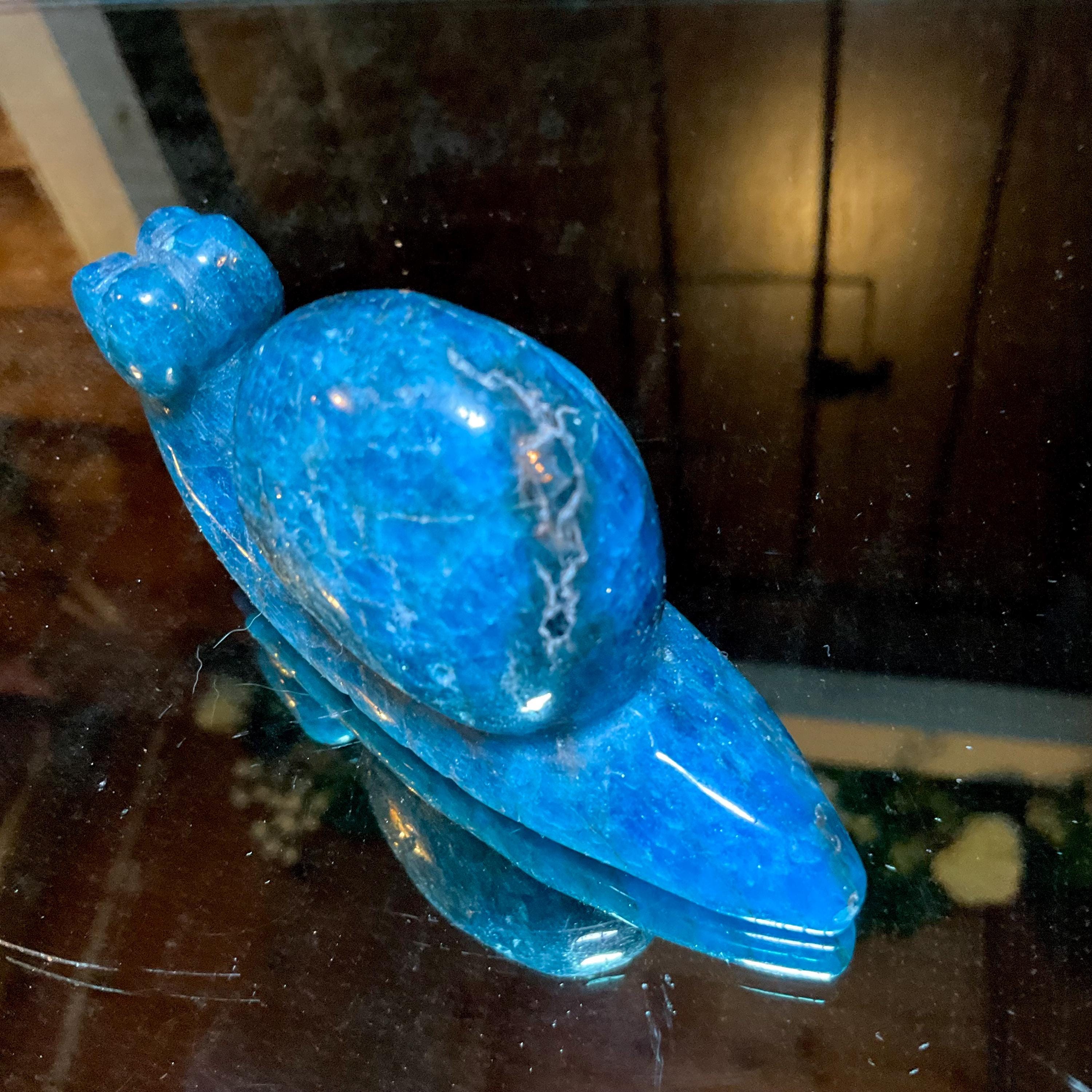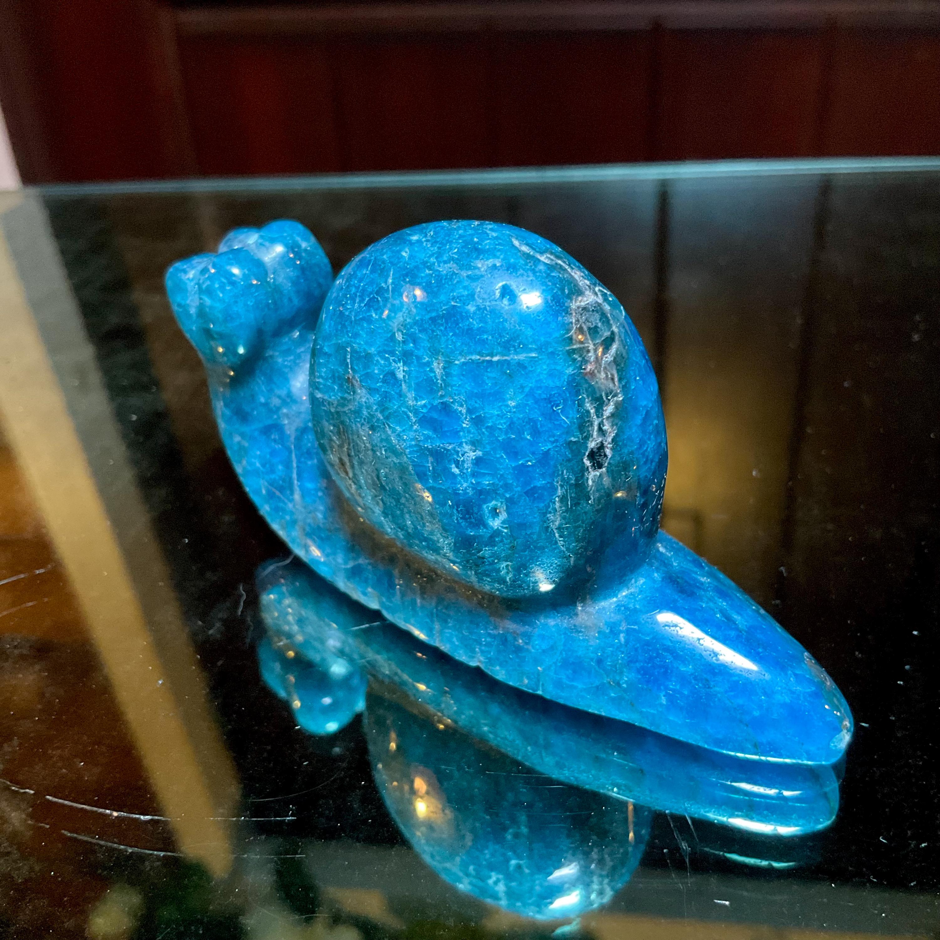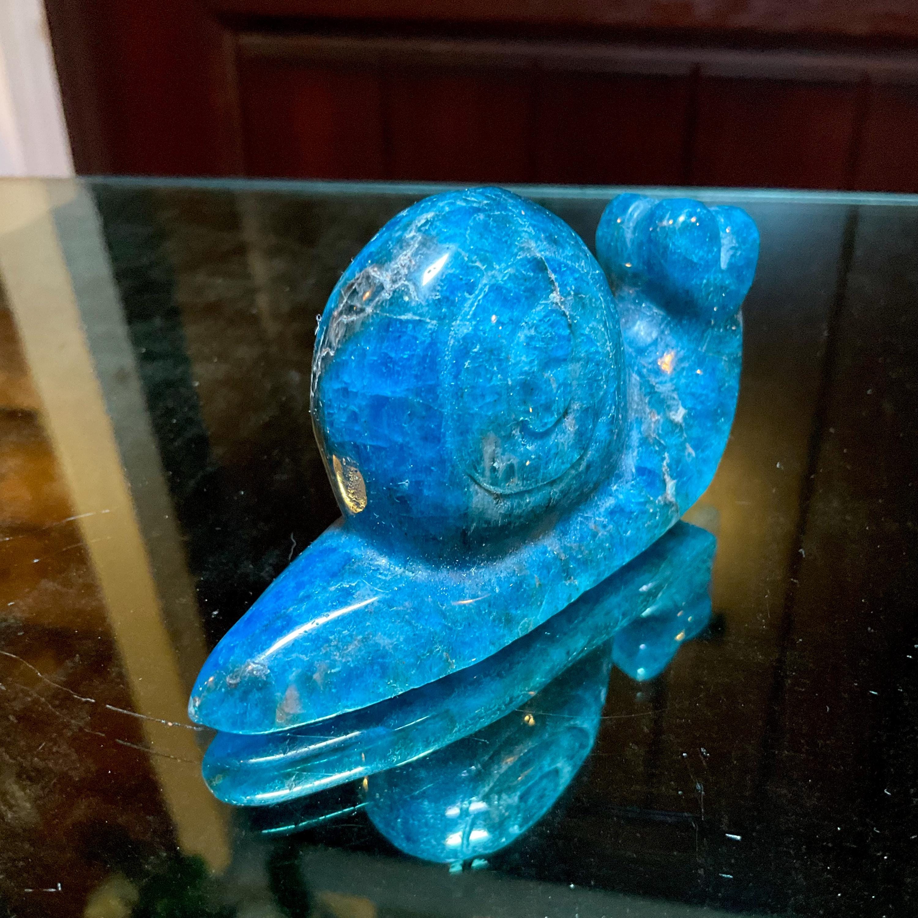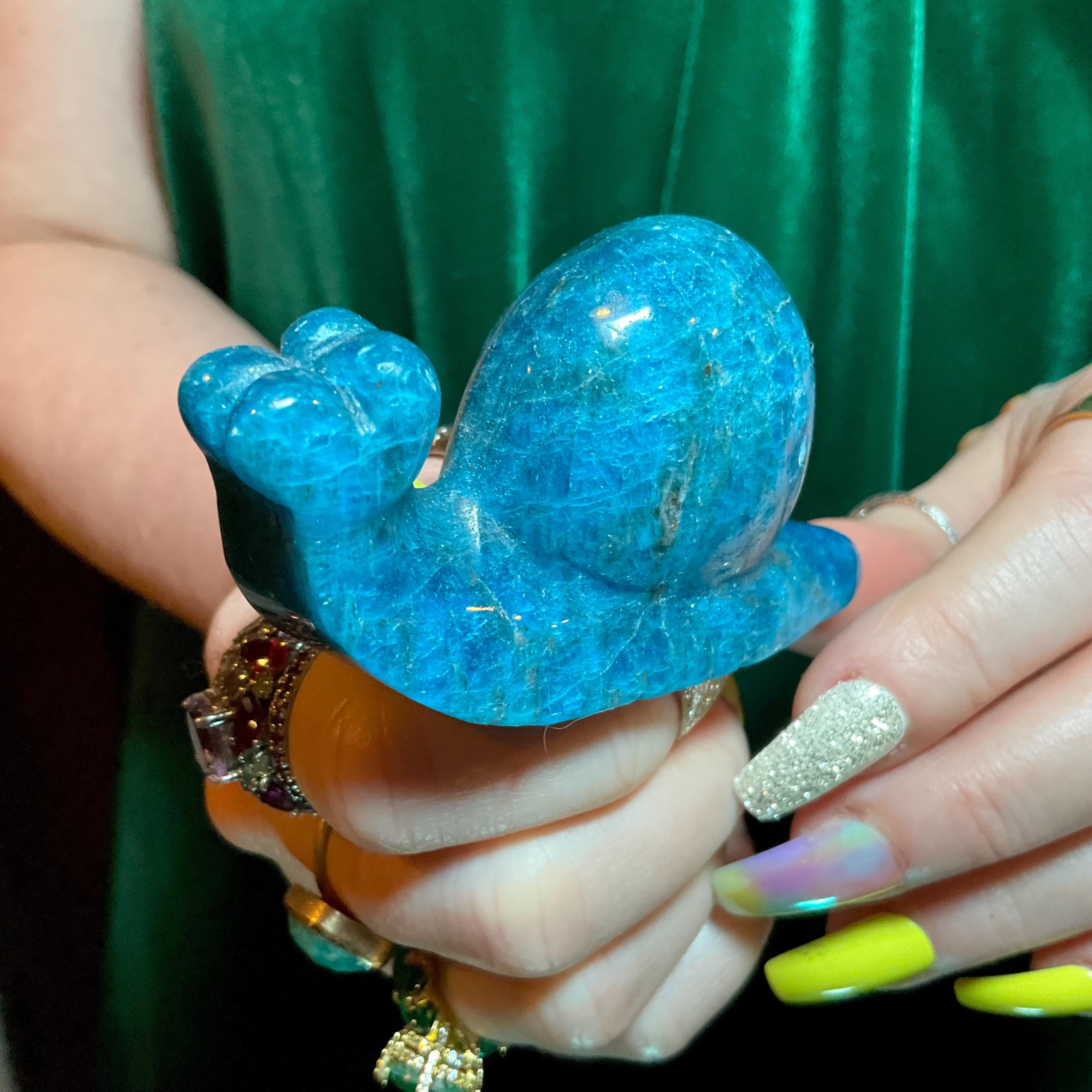 This is a one-of-a-kind carved Blue Apatite Crystal snail.