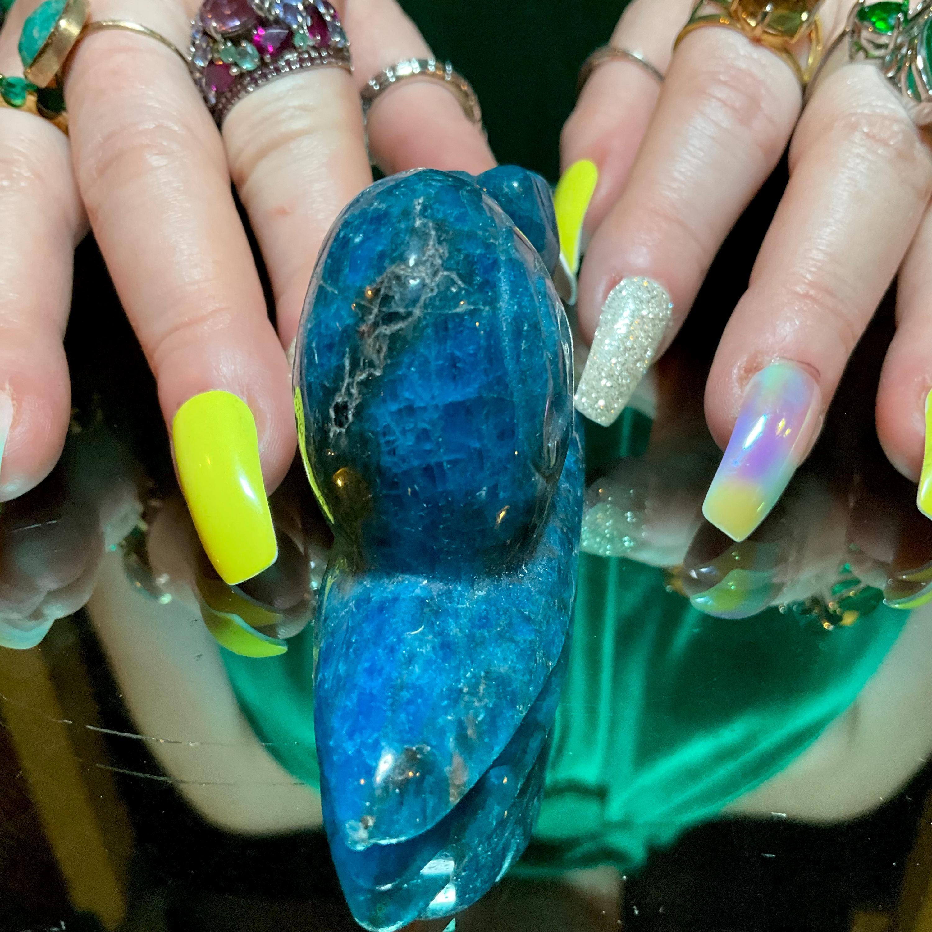 This is not the modern Blue Apatite Crystal machine made from China this is the real deal, vintage Blue Apatite Crystal with great carving, amazing detail that you only get from Brazil.