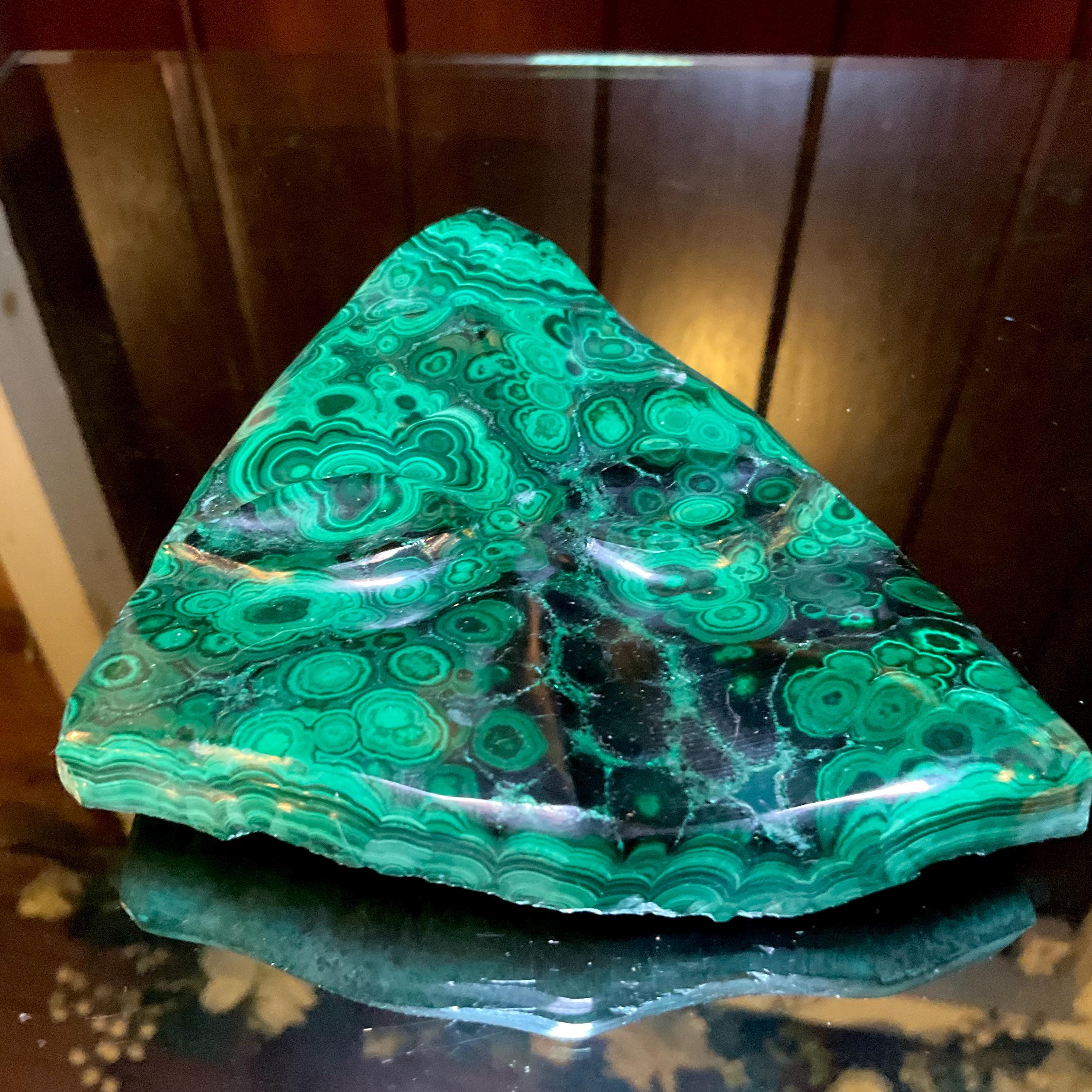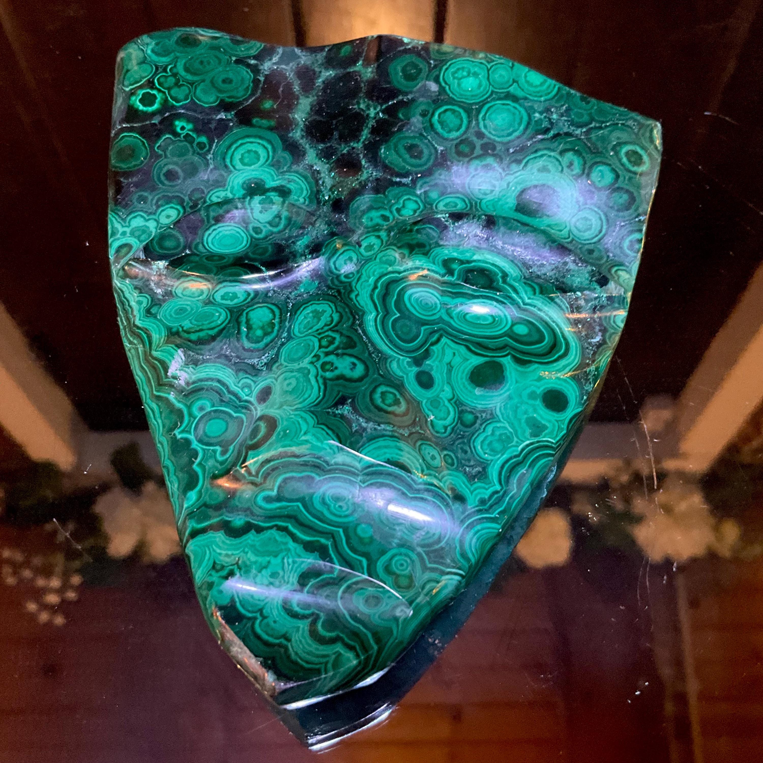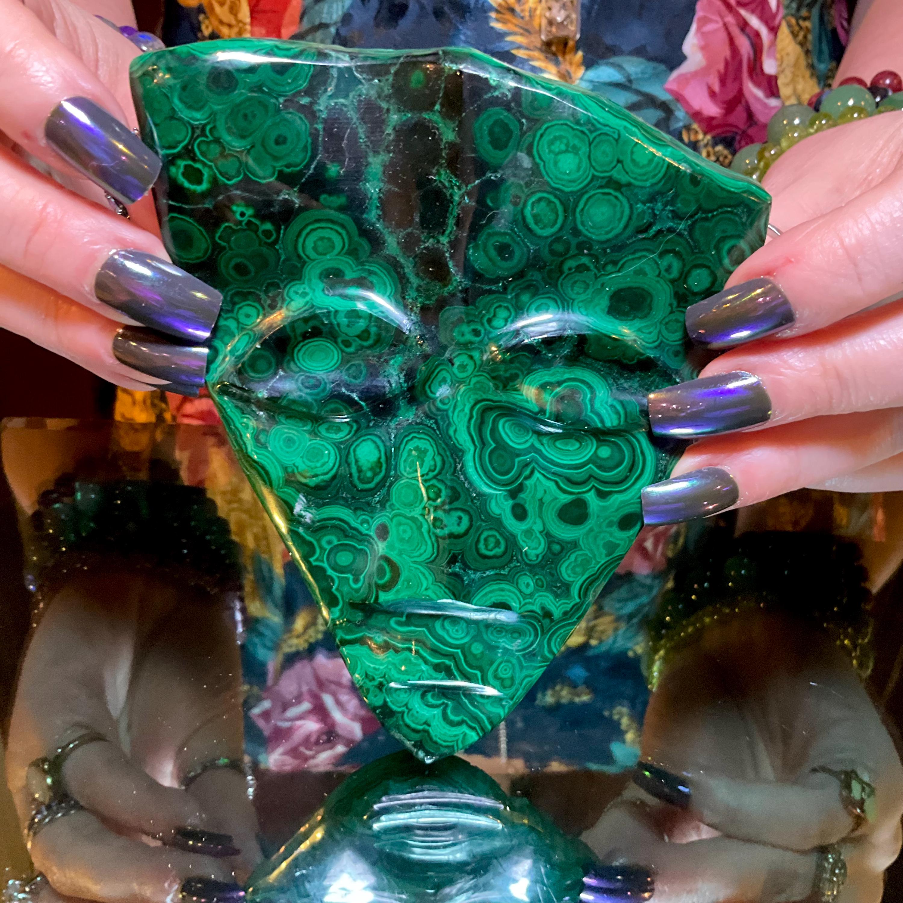 What makes this Malachite mask so special is age, patina, and its vintage deco free form style hand carved from the Congo not like the modern Malachite from China.