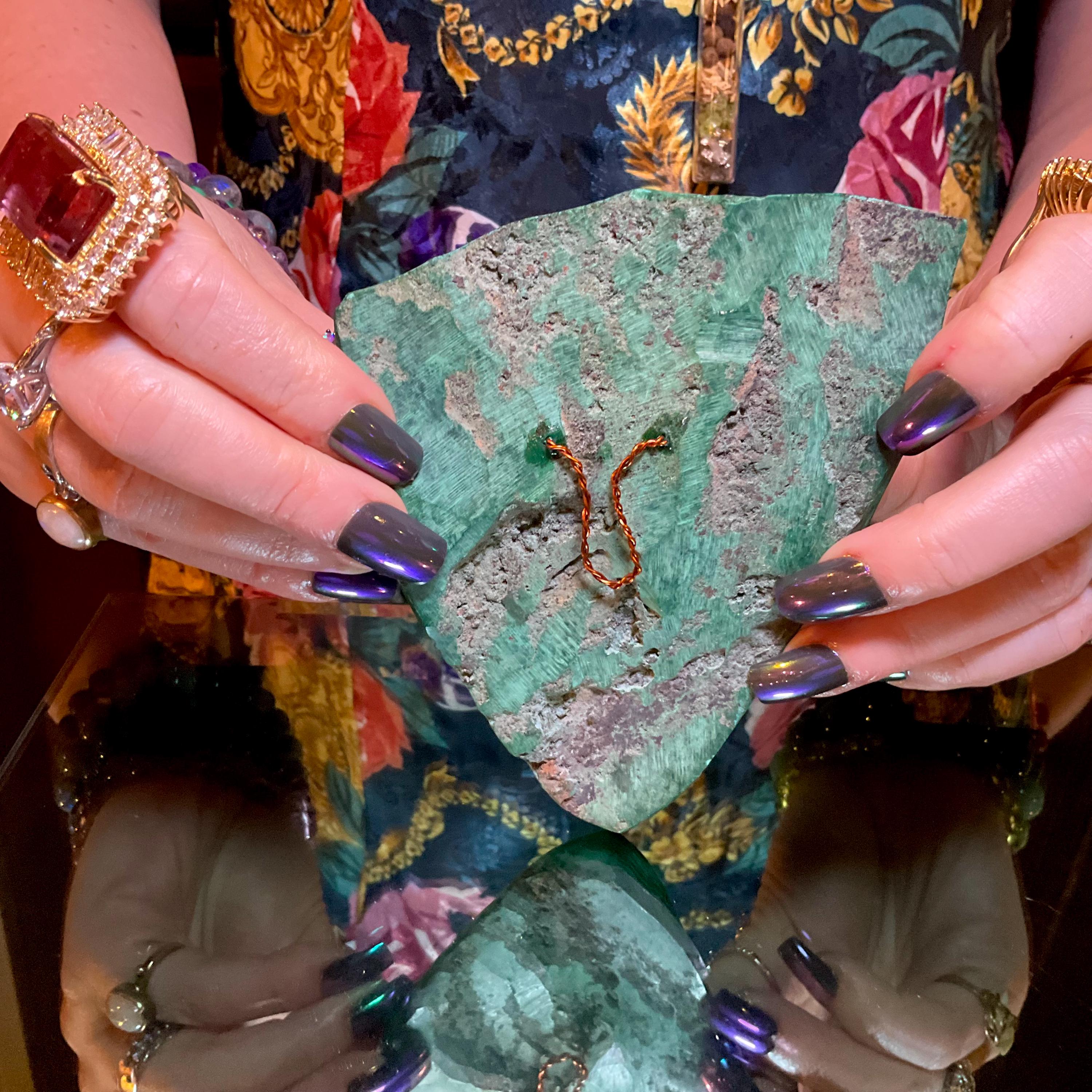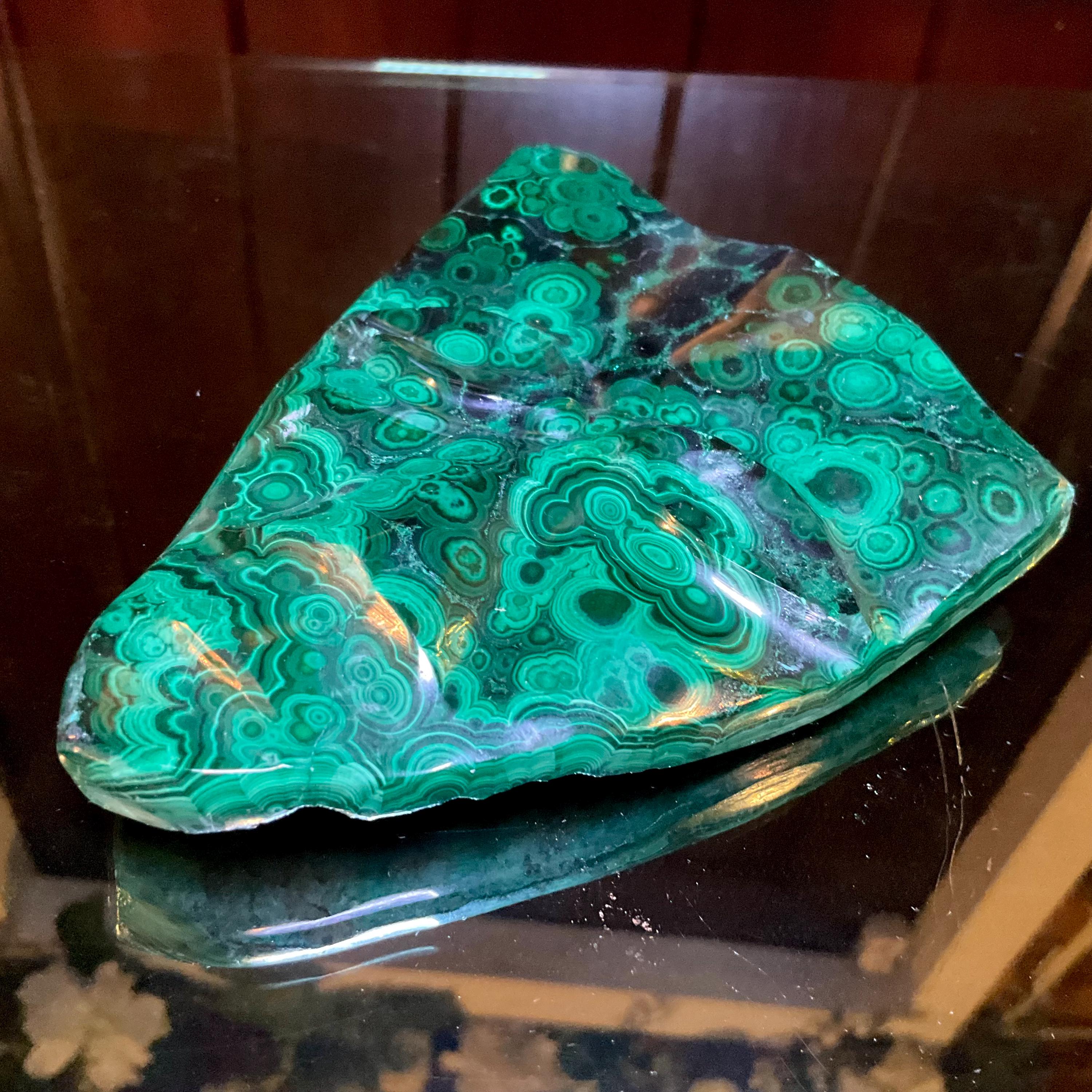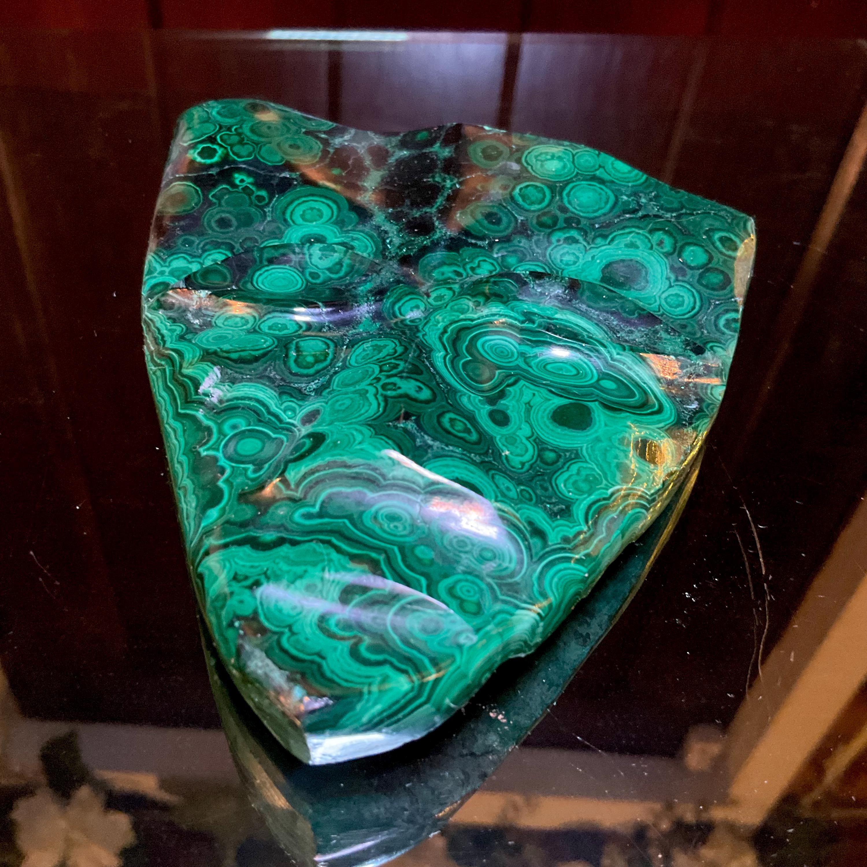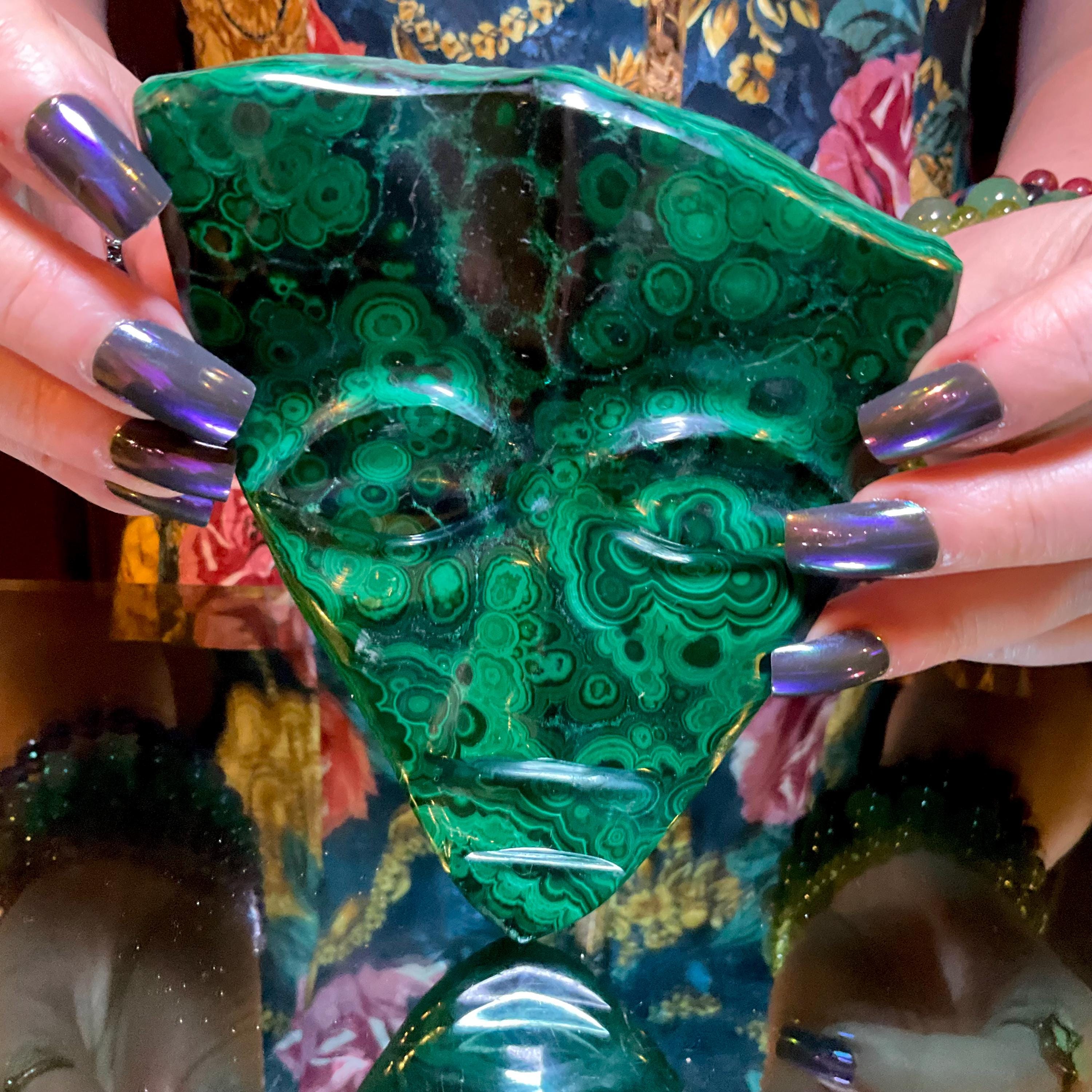 What makes this Malachite mask so special is age, patina, and its vintage deco free form style hand carved from the Congo not like the modern Malachite from China.