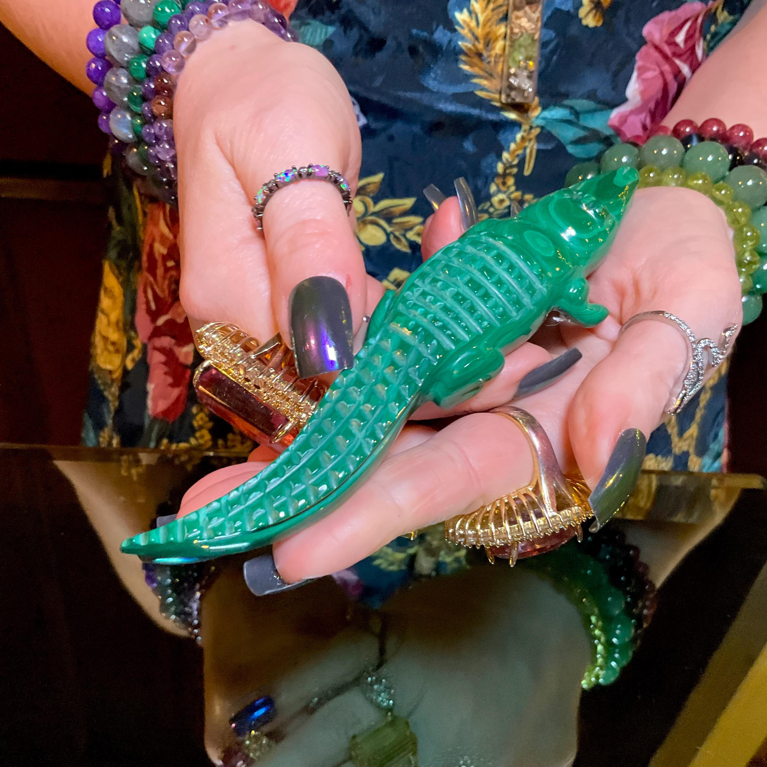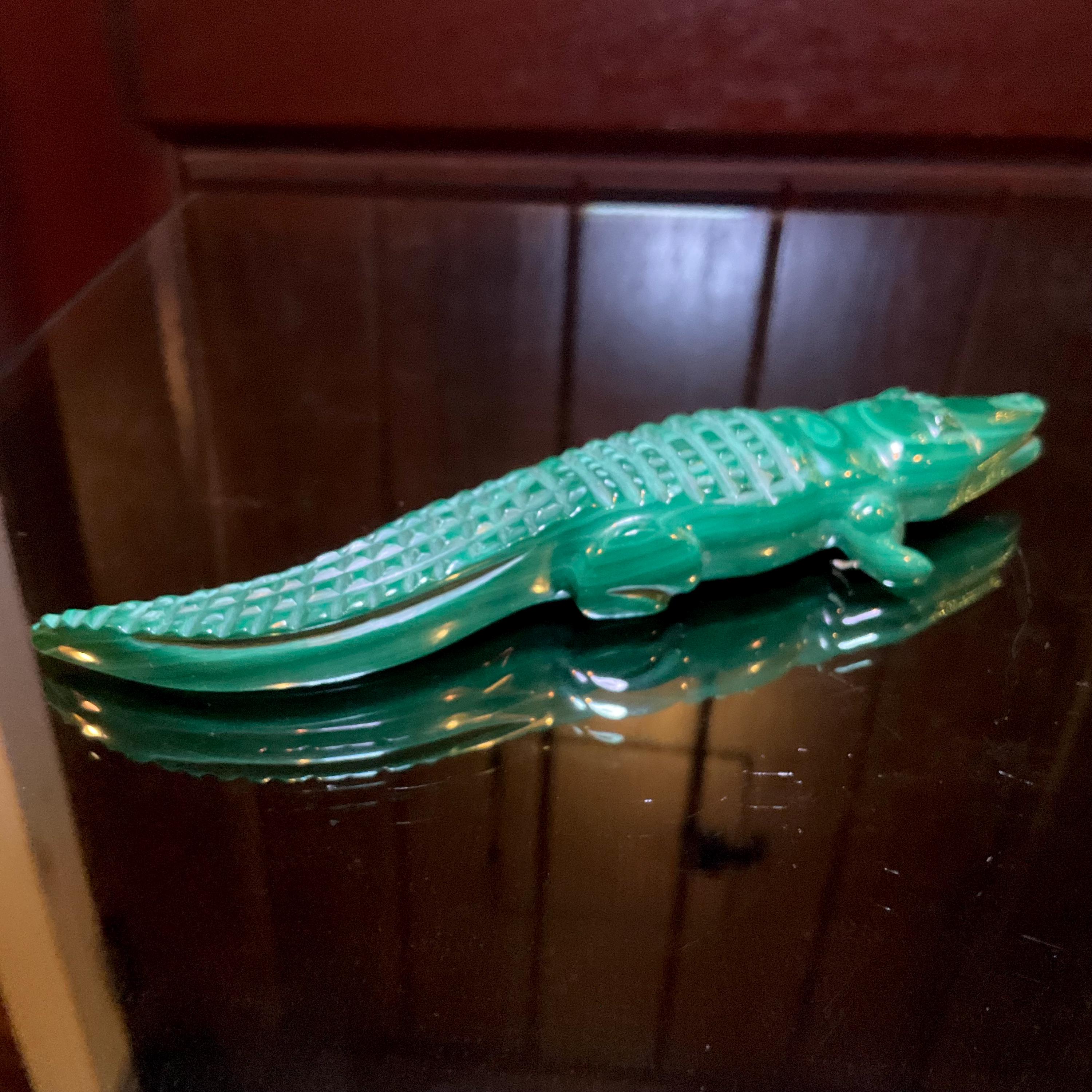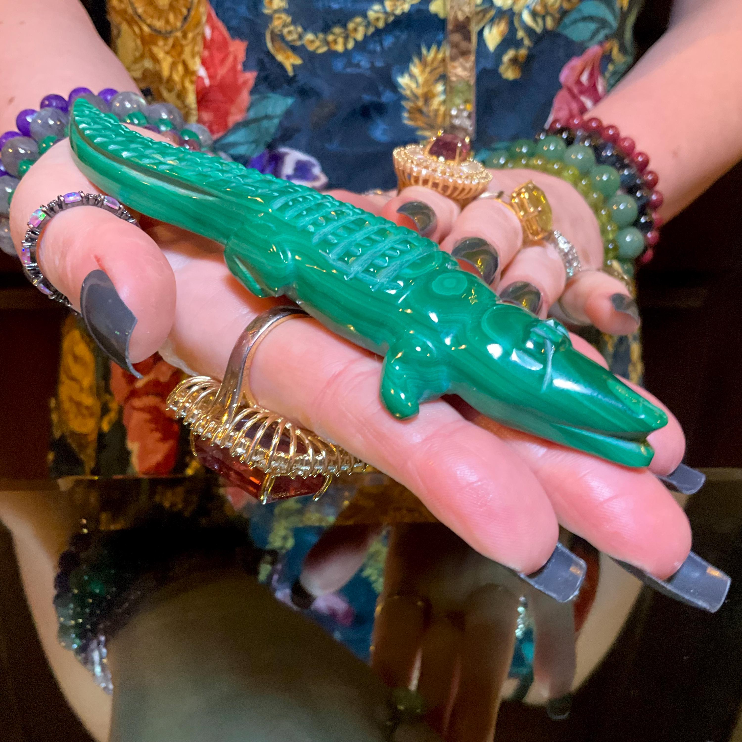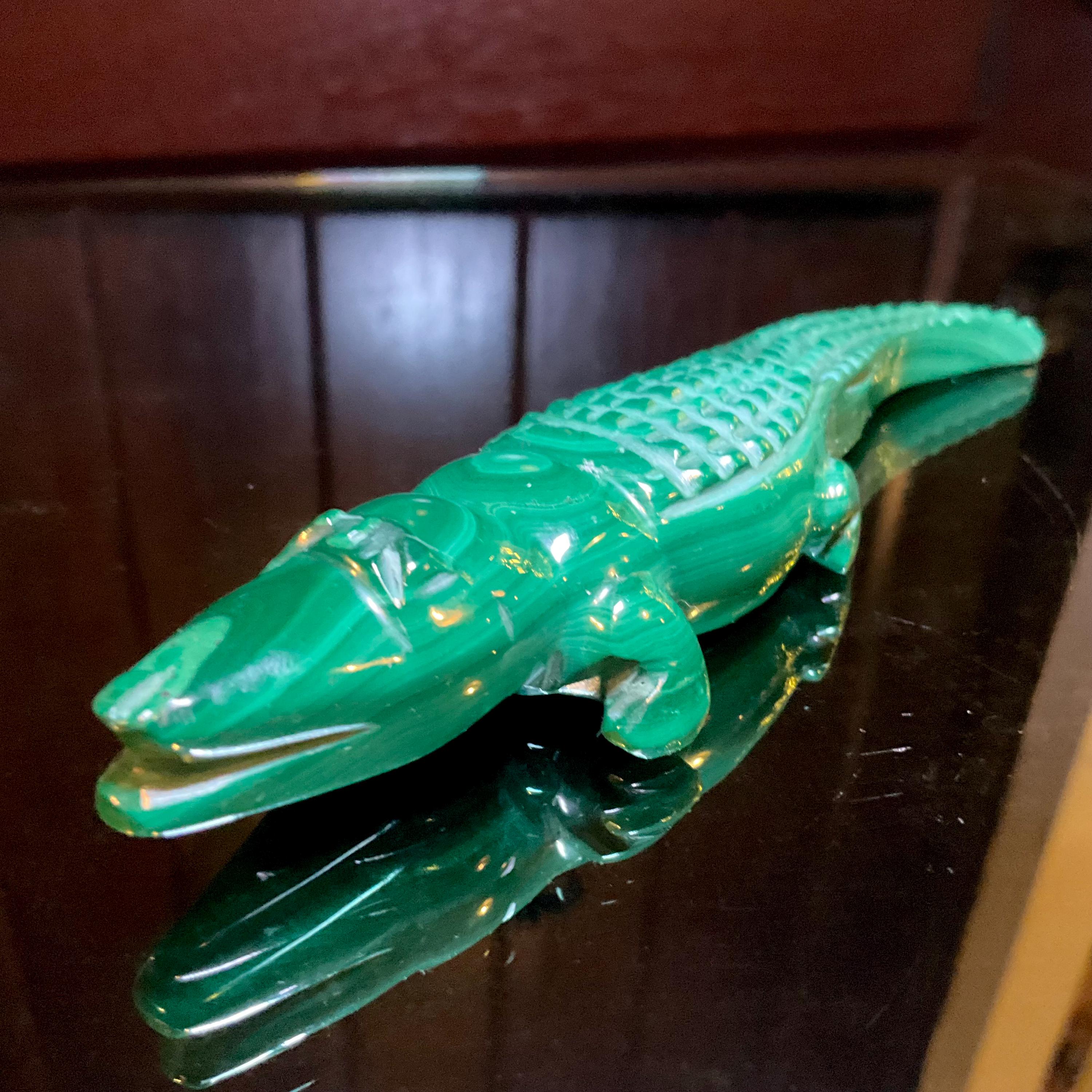 This is a one-of-a-kind carved Malachite Alligator.