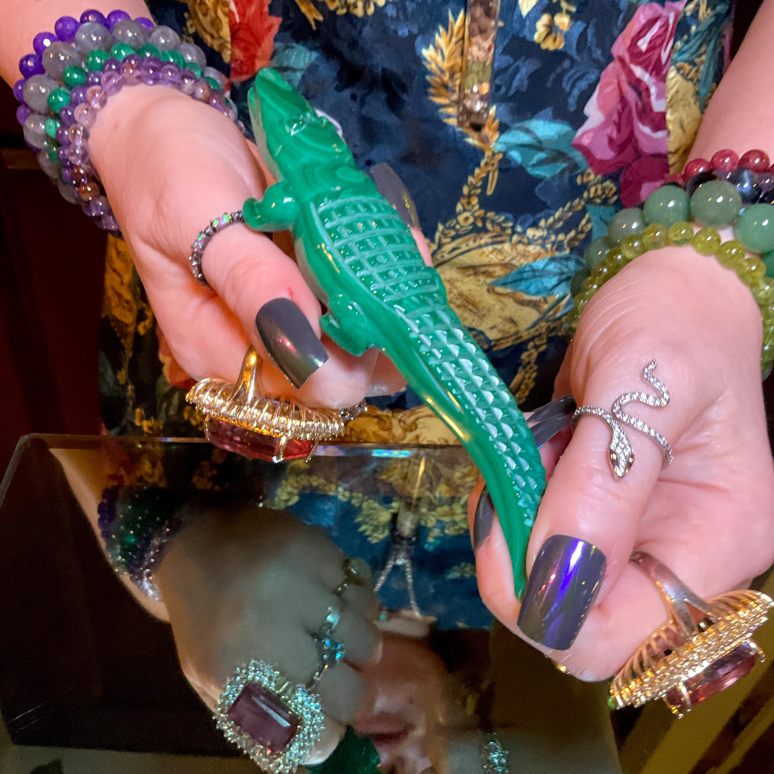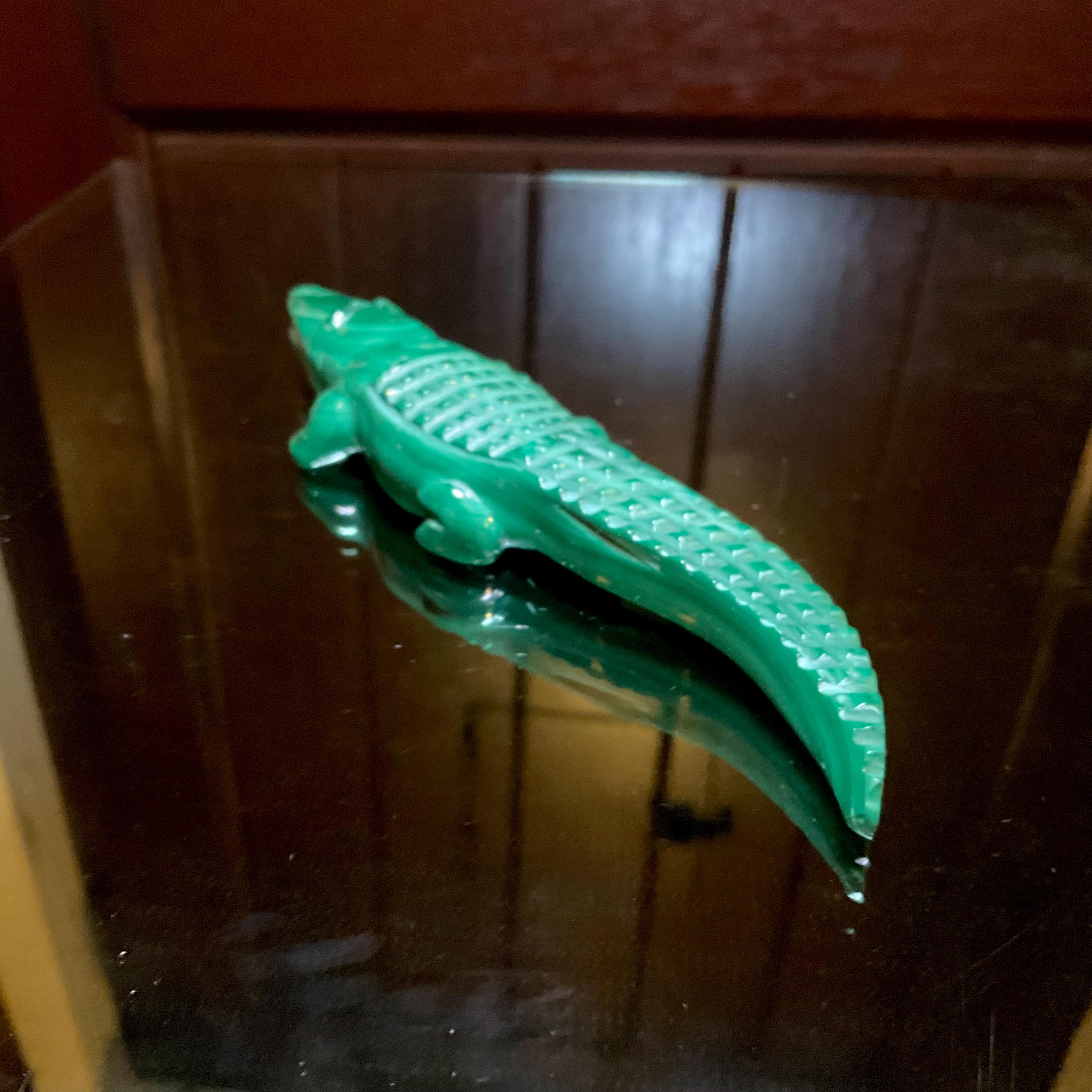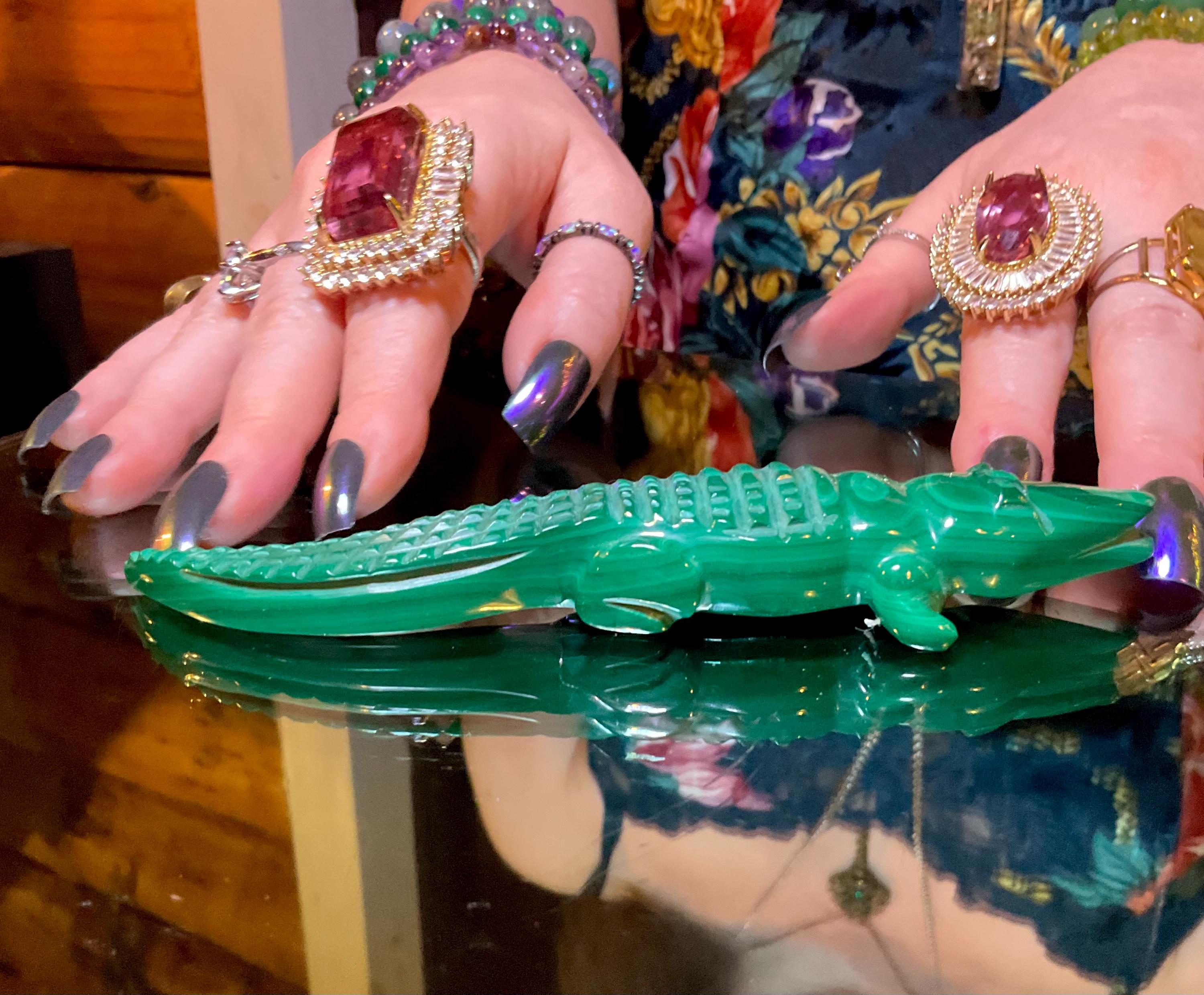 This is a one-of-a-kind carved Malachite Alligator.