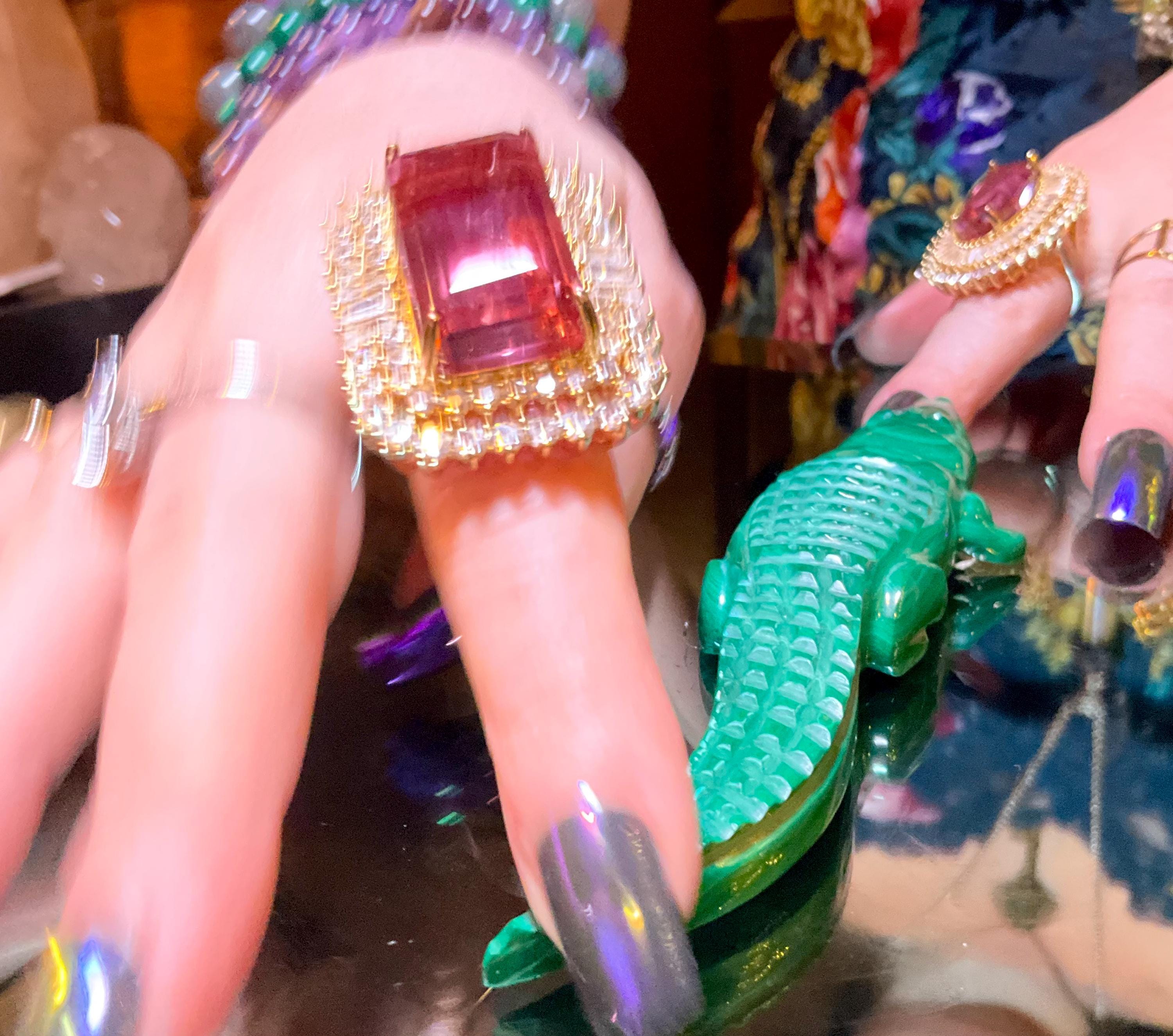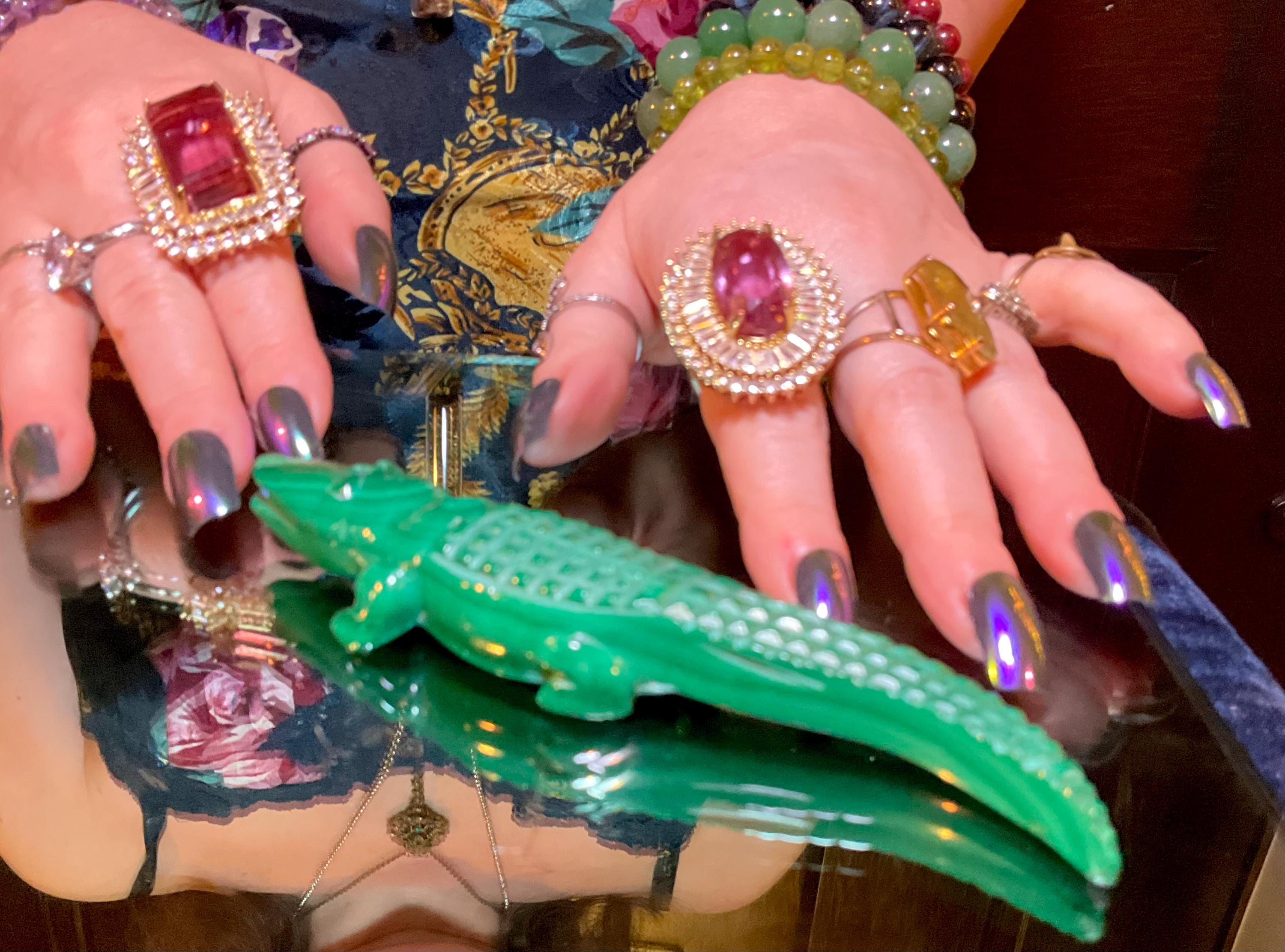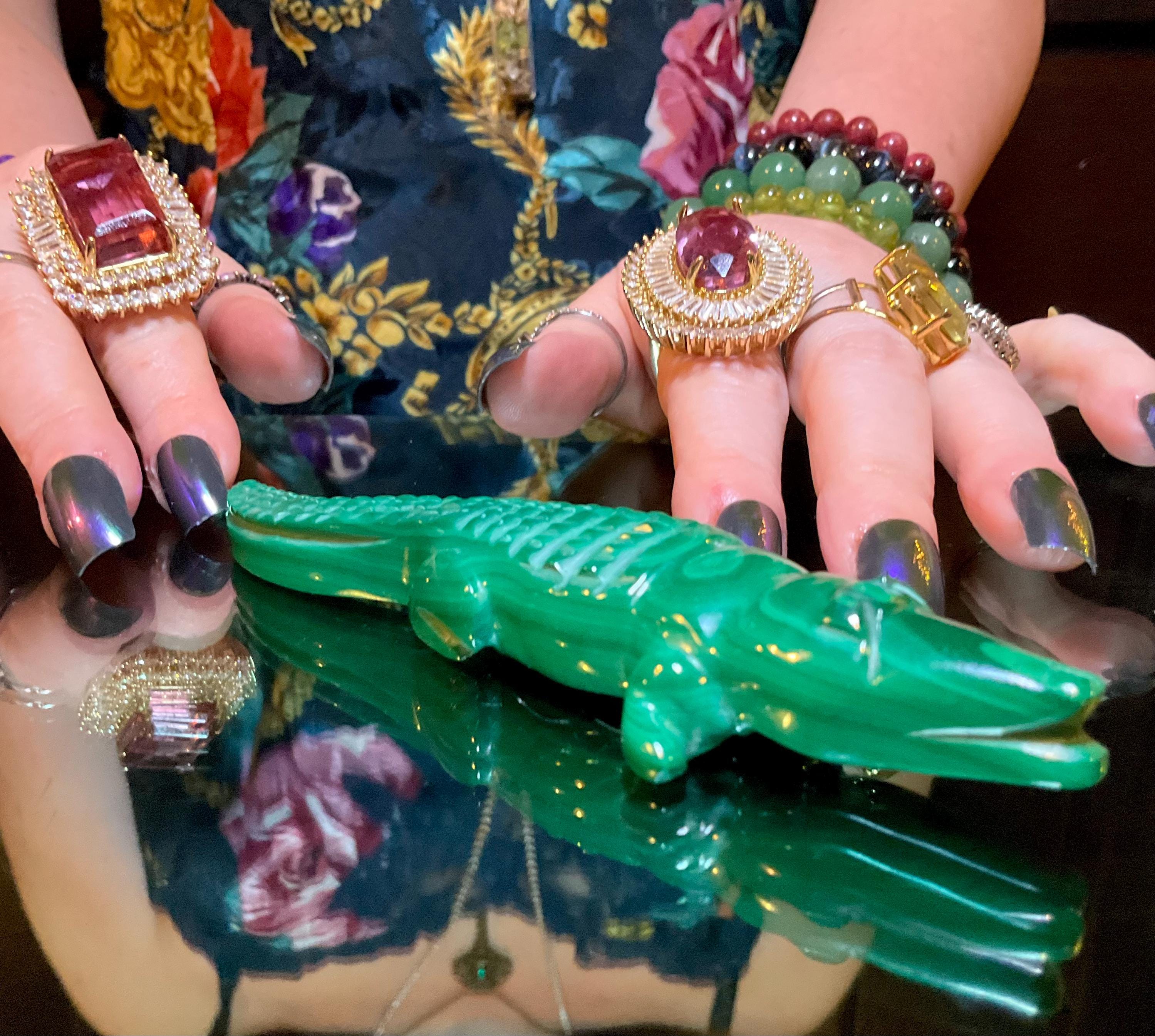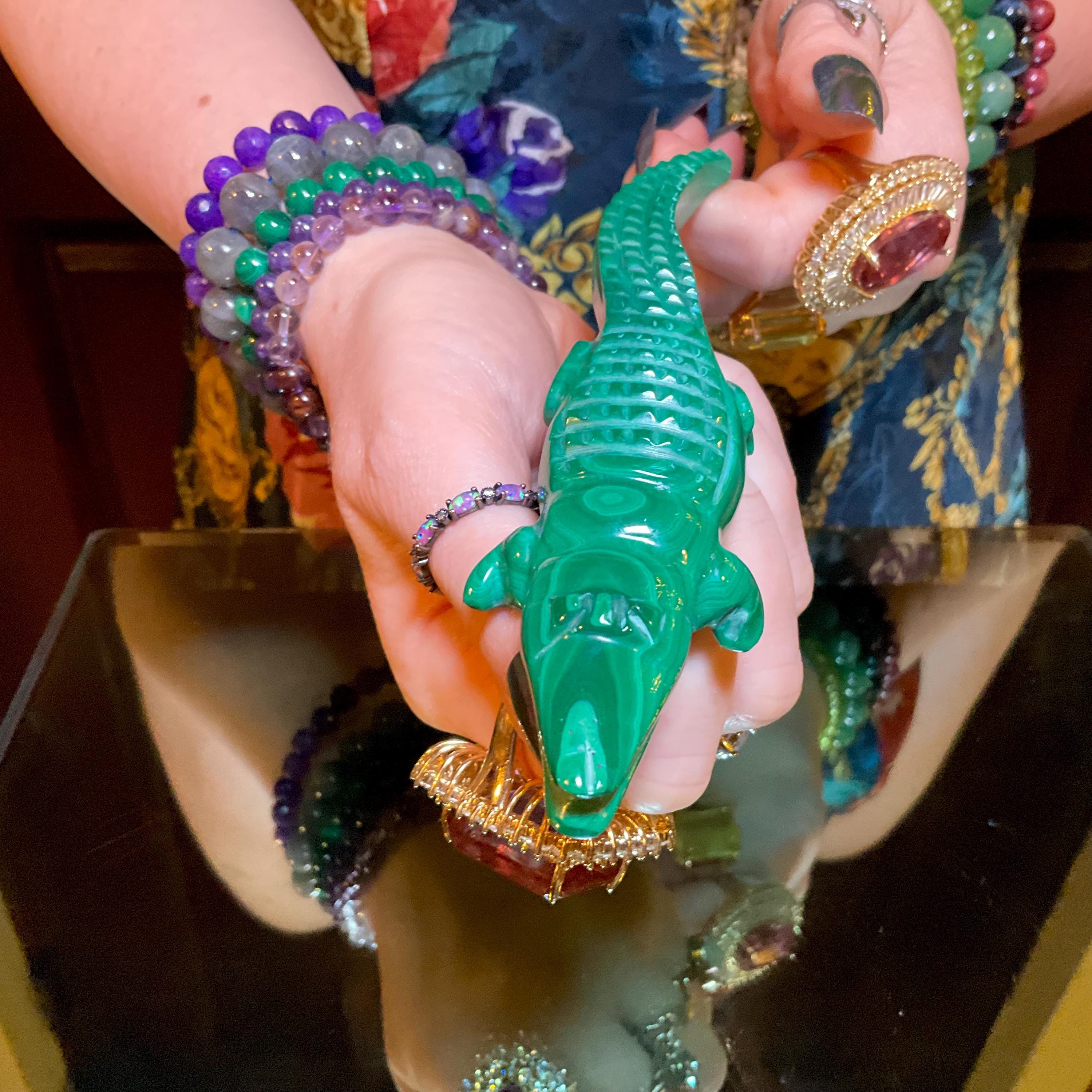 This is a one-of-a-kind carved Malachite Alligator.