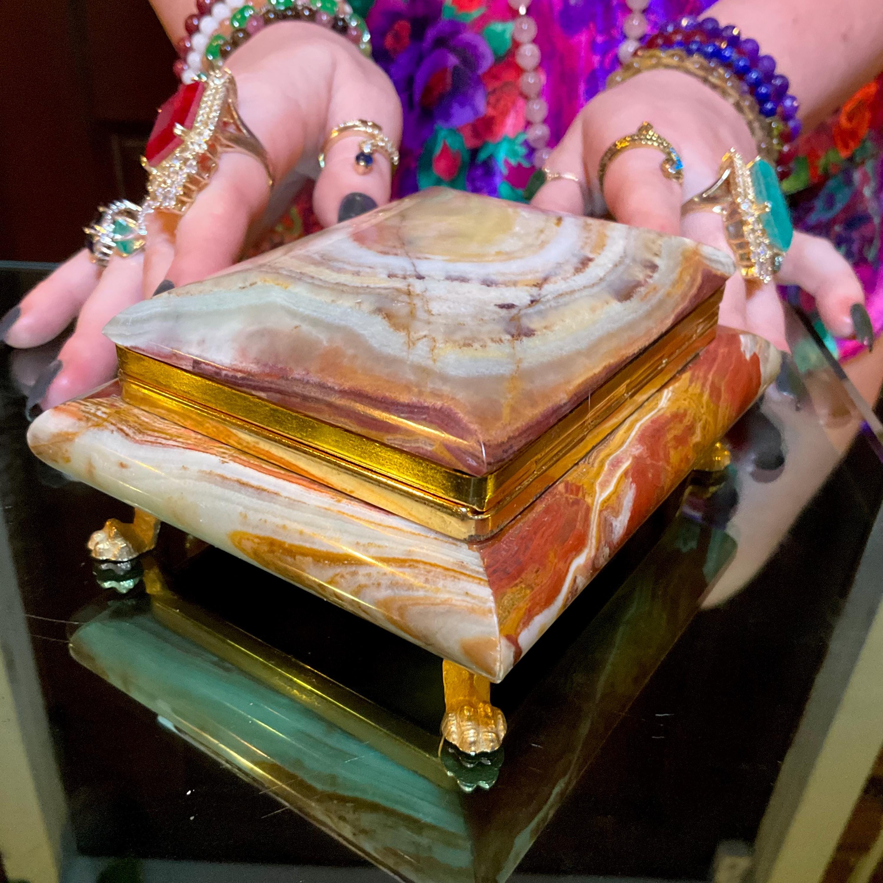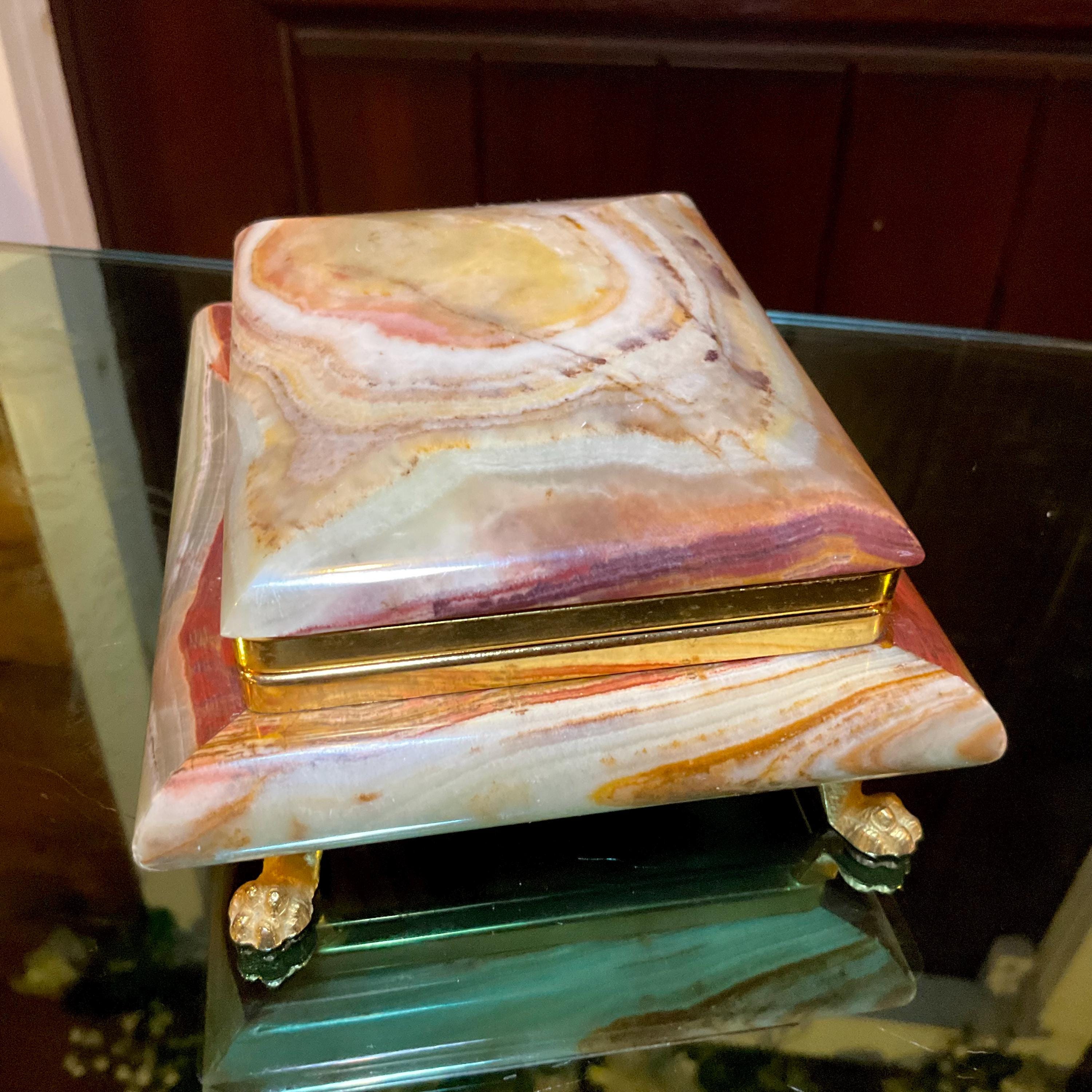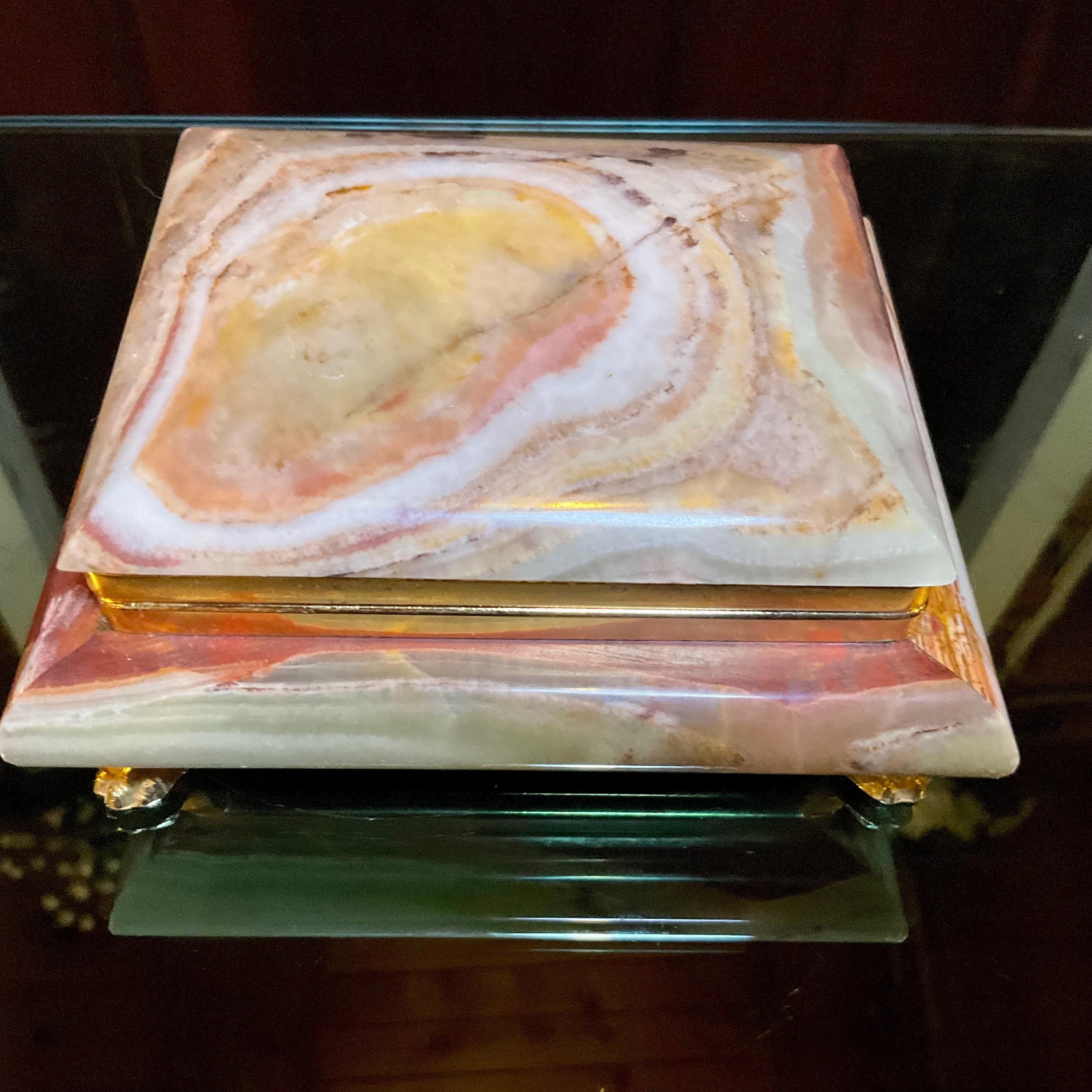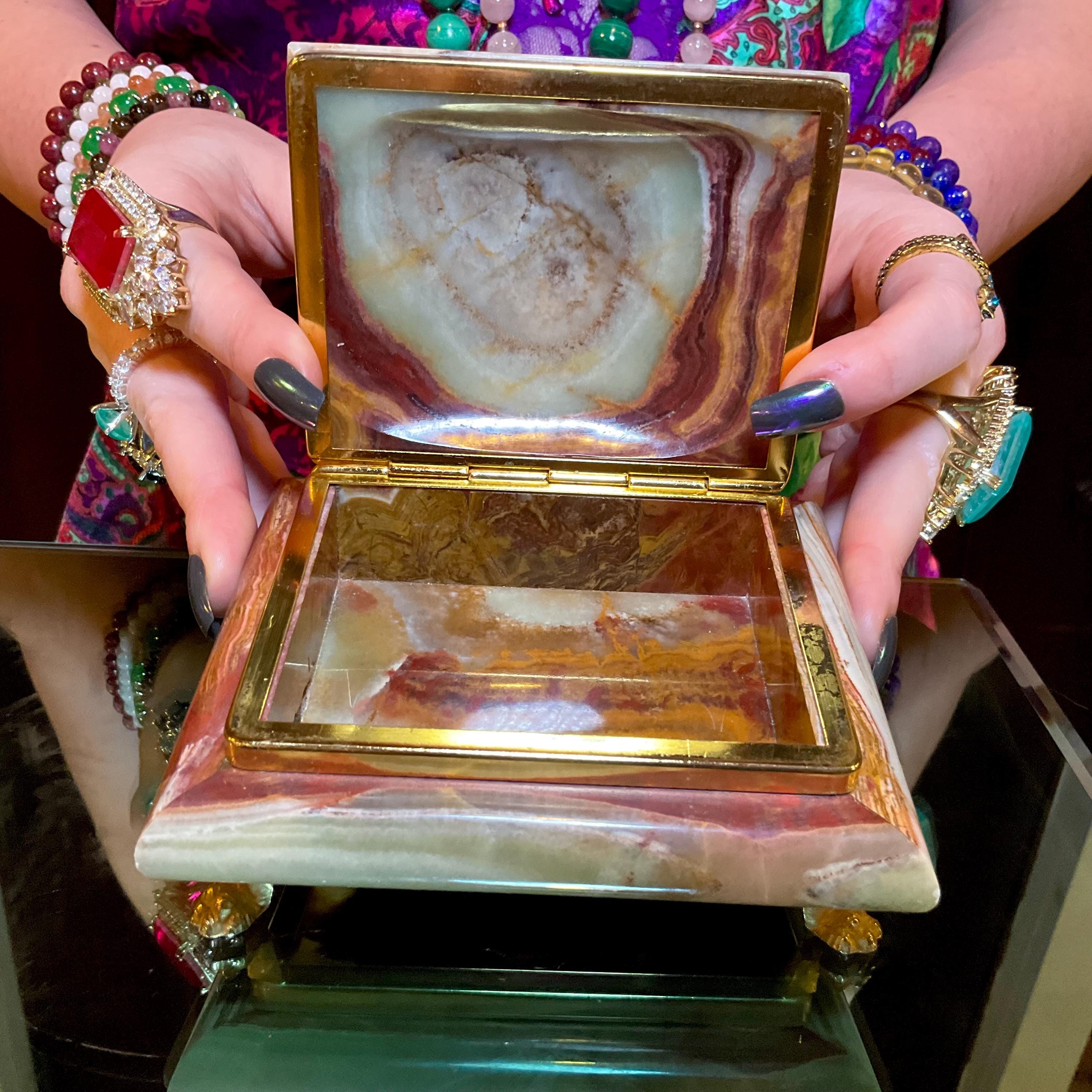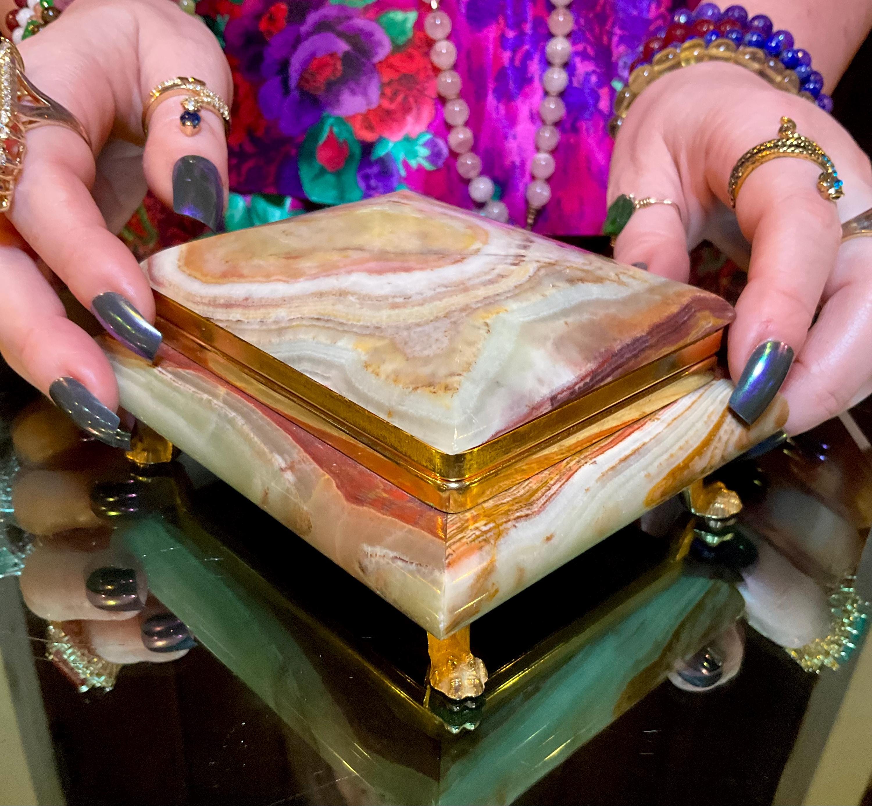 It is loaded with Swirling green, white, yellow & golden-brown pattern's swirling throughout making this a one-of-a-kind treasure box.