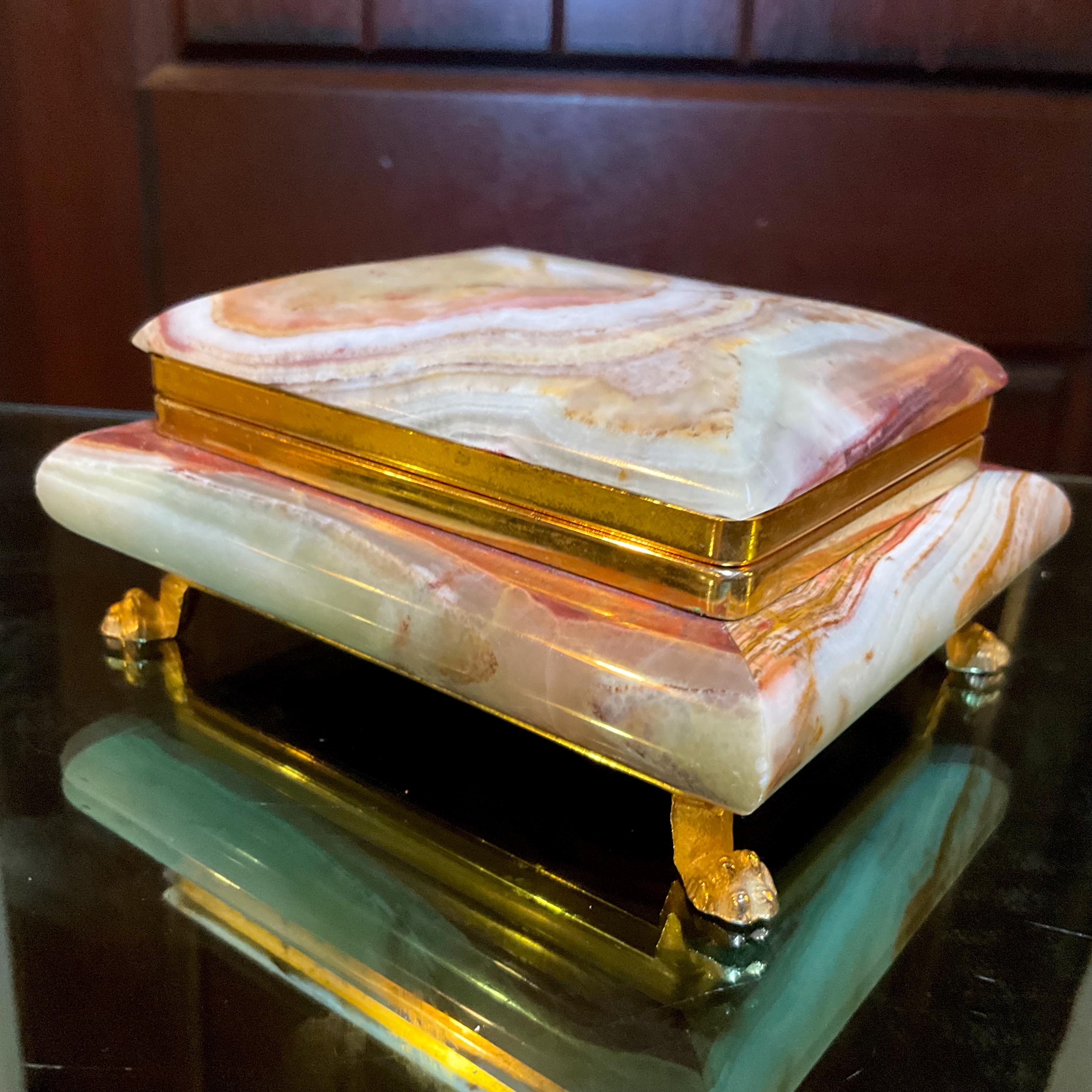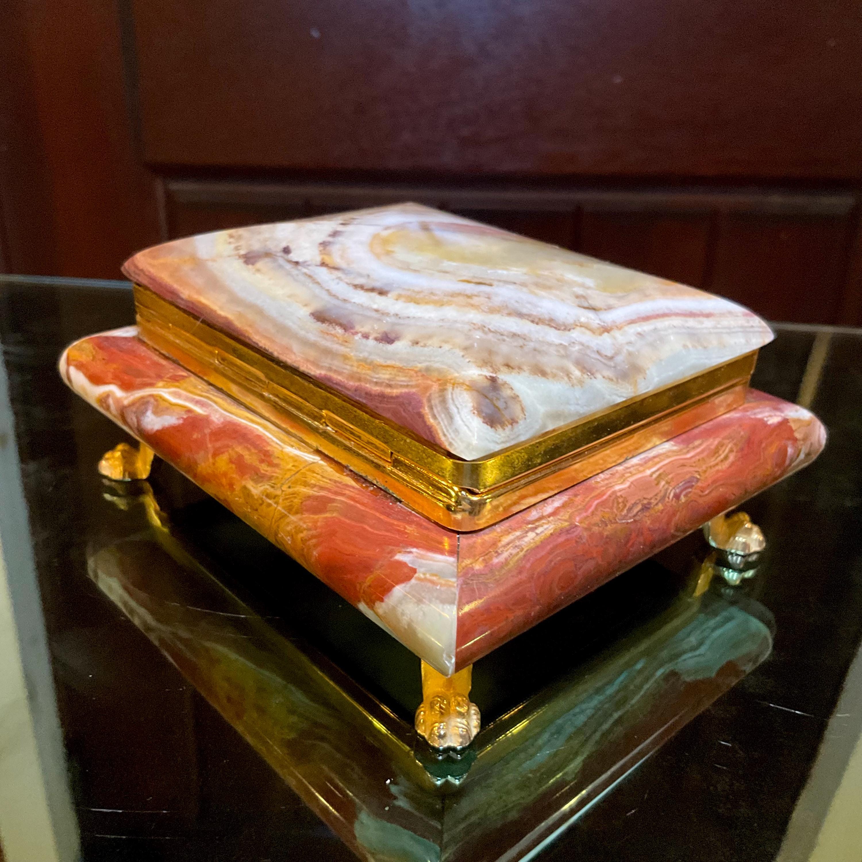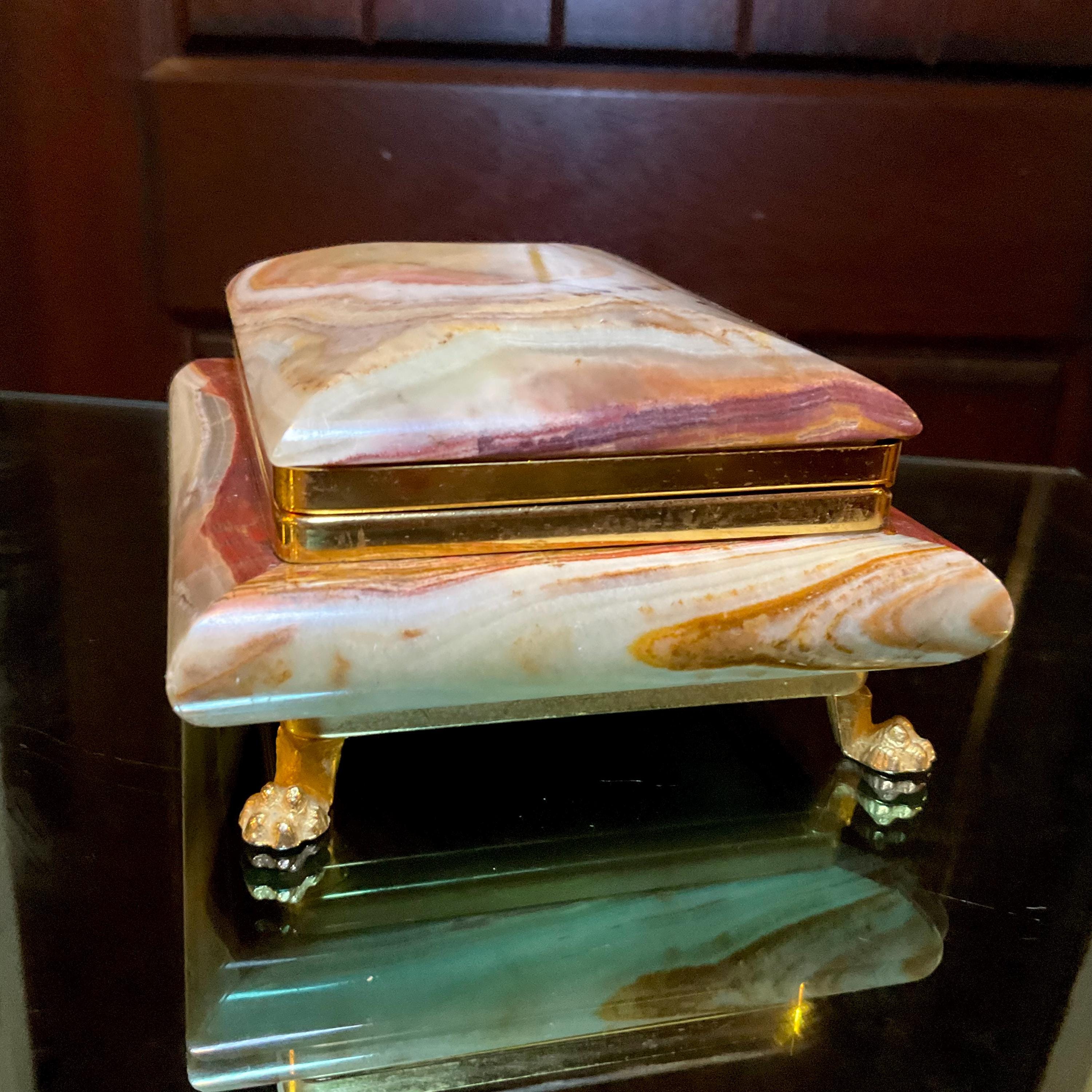 This stunning jewelry box stands out; it is so beautifully carved with a beveled lid curved sides with brass trim with four brass lions' feet. It is beautifully lined with a detailed brass trim with a hinged lid.