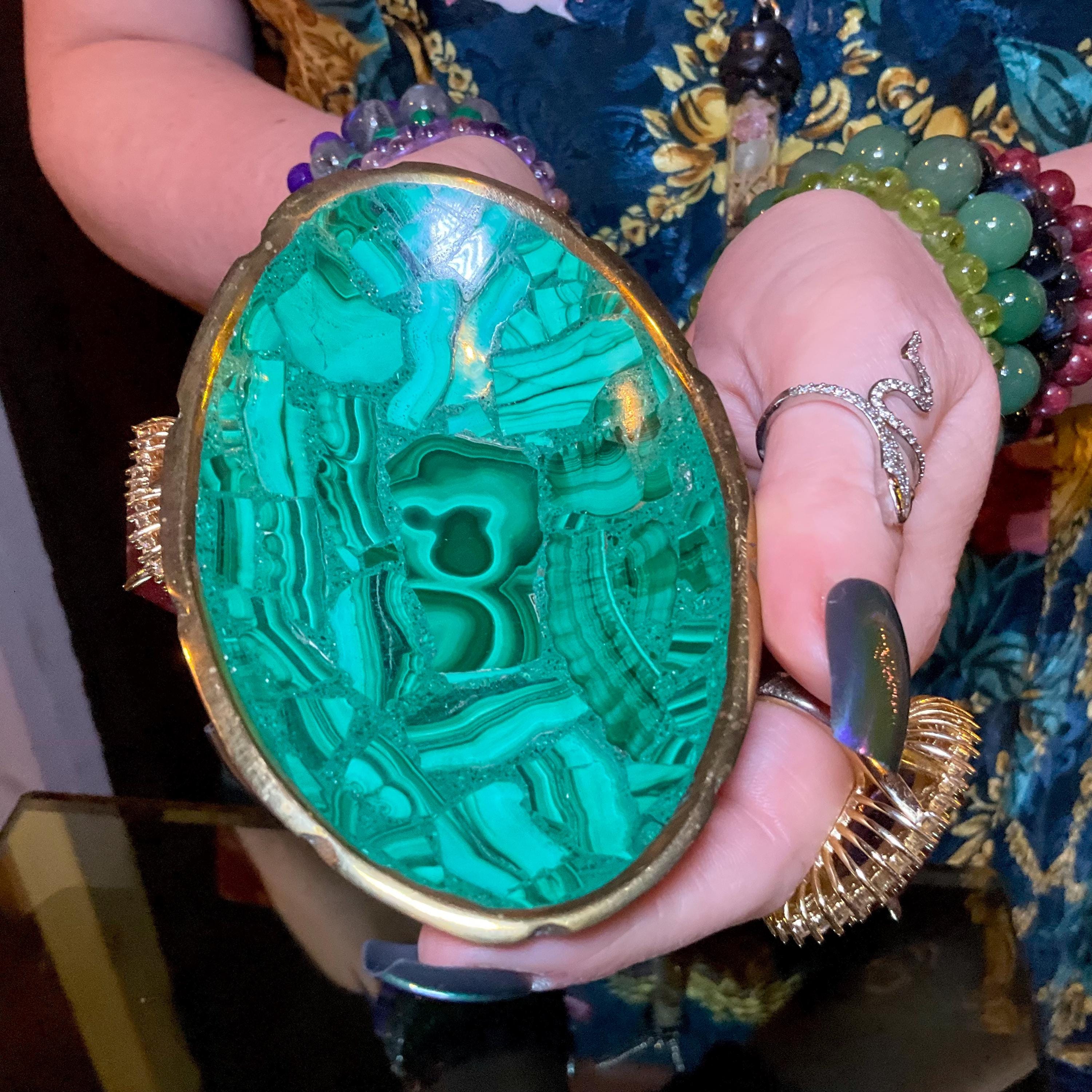 This piece of vintage Malachite is so beautiful, so thick and its natural patina is not like the modern Malachite ~ its colors are so rich, and the detail of the stone is hand carved, making it a one-of-a-kind creation.