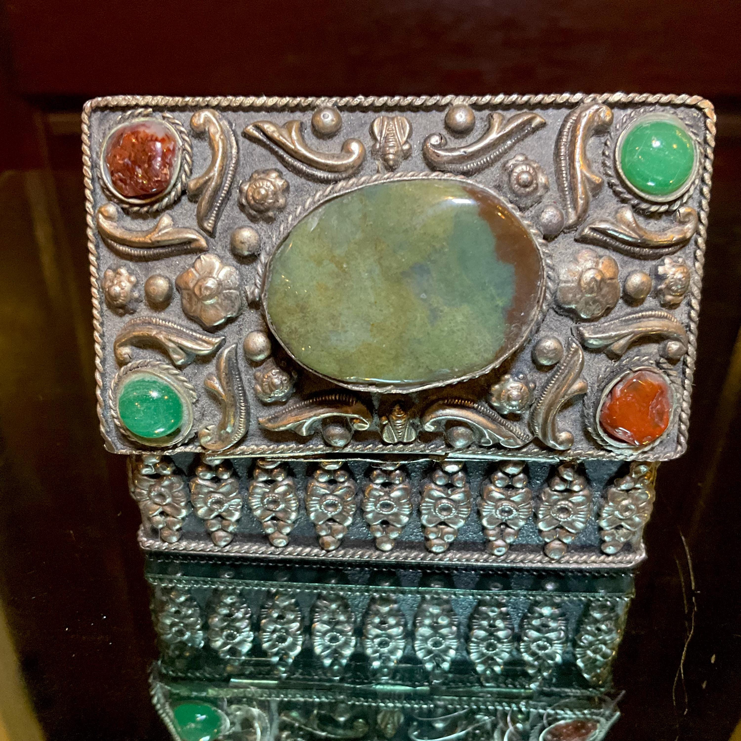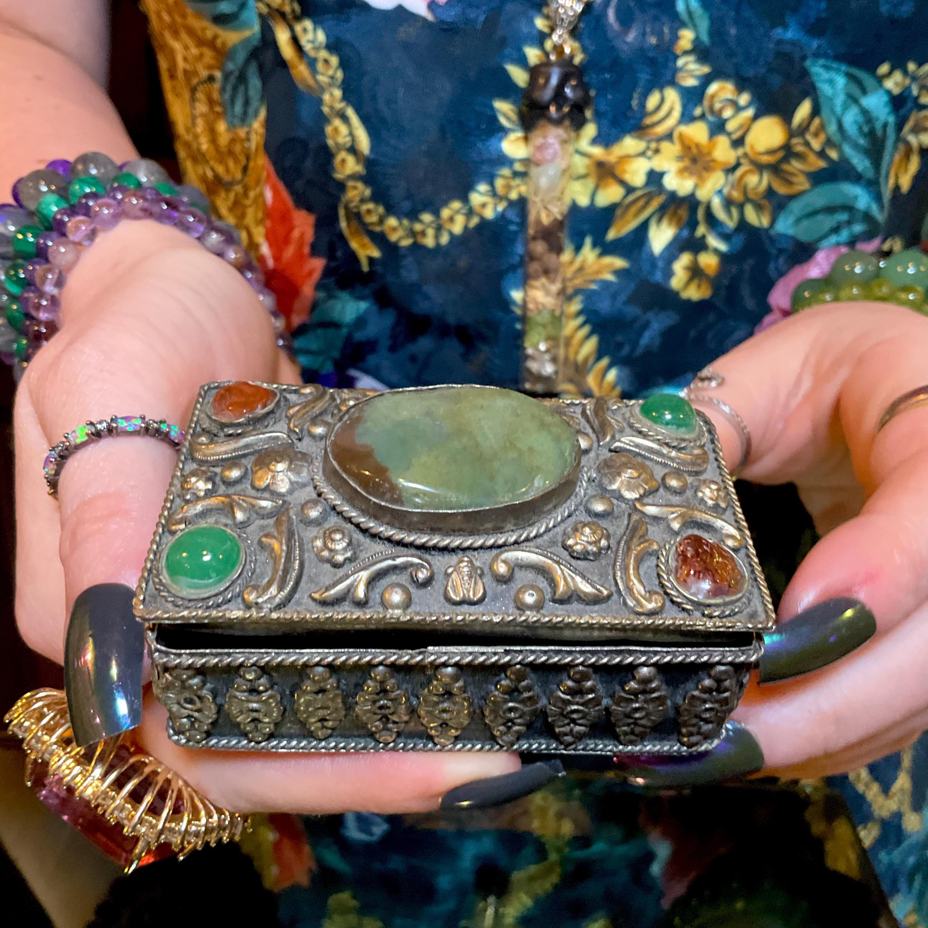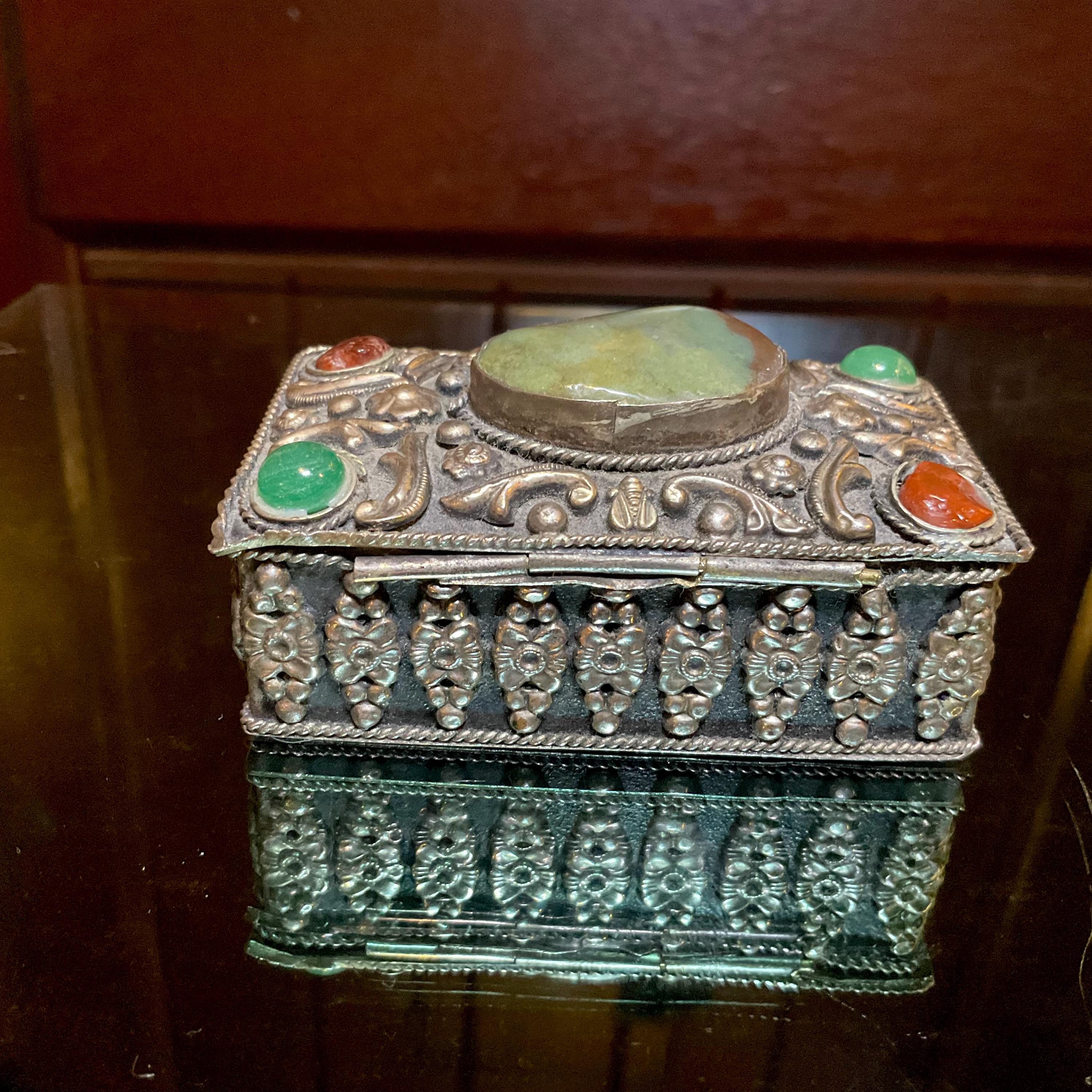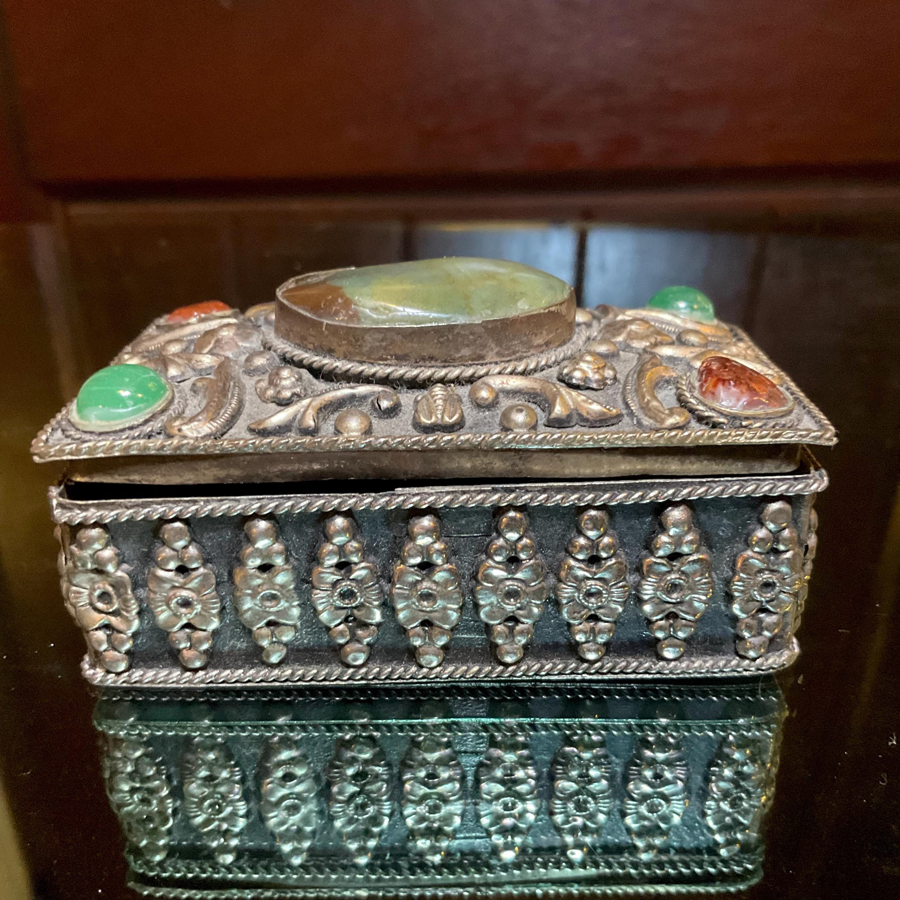 The Vintage Moroccan jewelry box is inlaid with semi-precious agate stones and covered with silvered metal filigree.