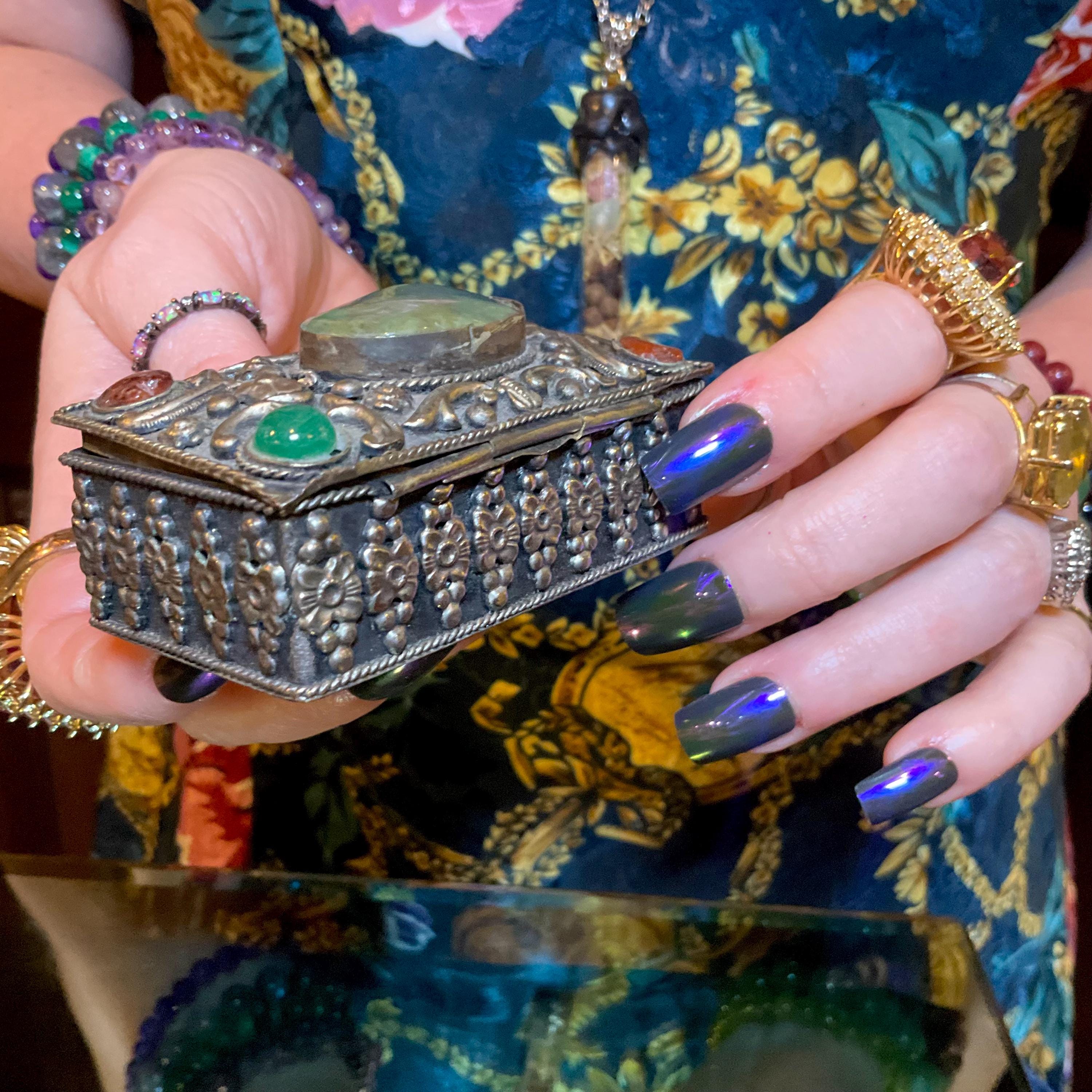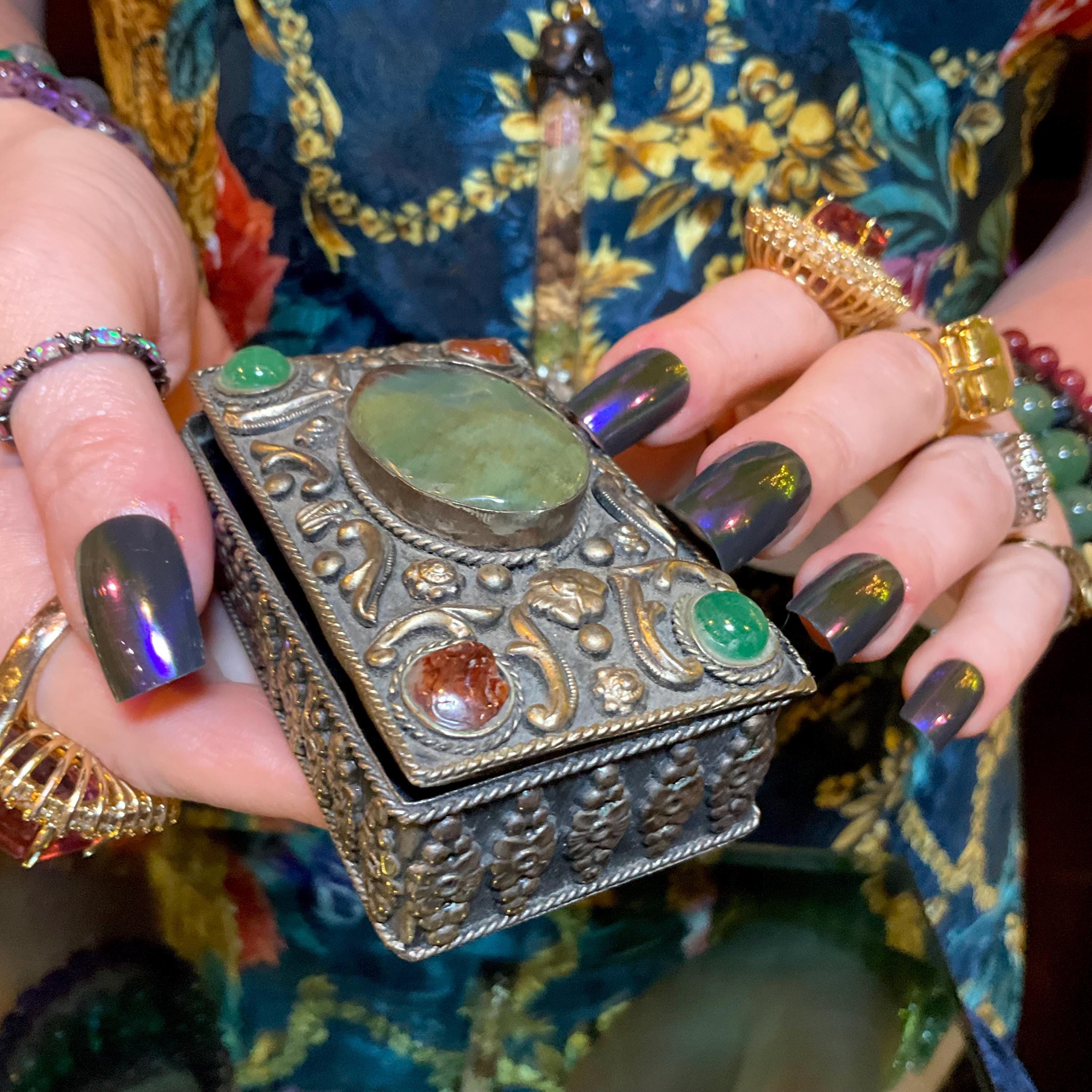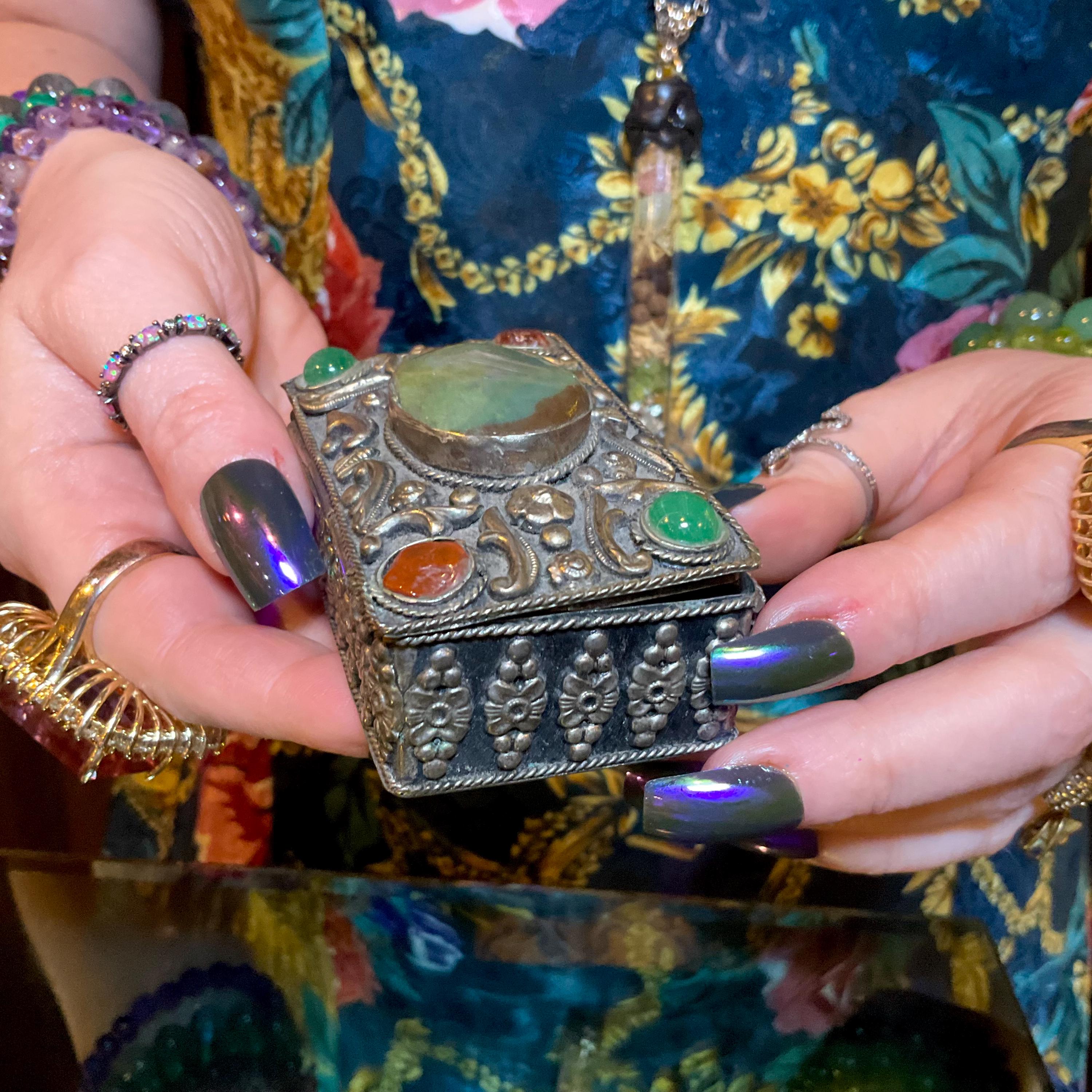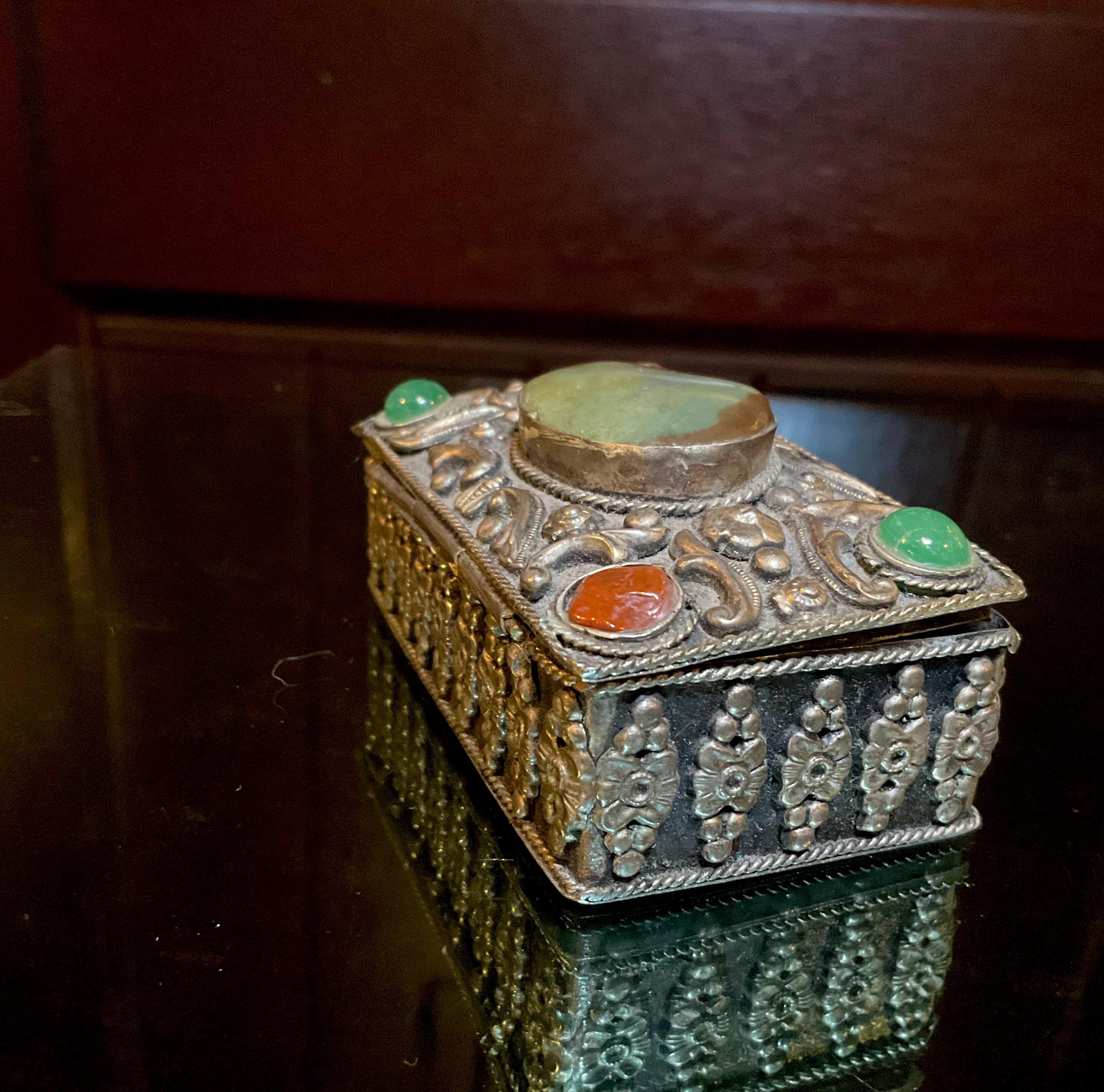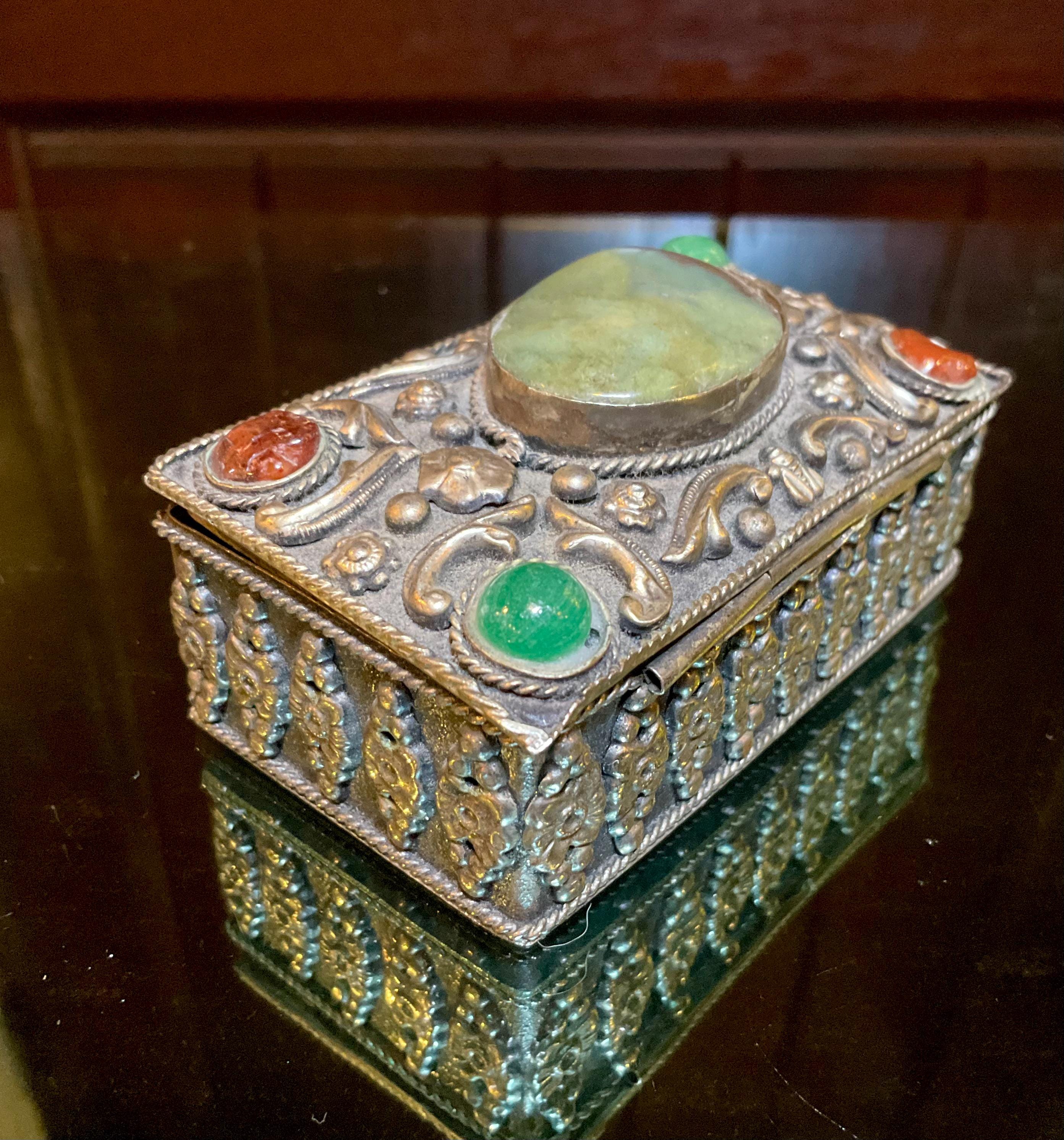 The Vintage Moroccan jewelry box is inlaid with semi-precious agate stones and covered with silvered metal filigree.