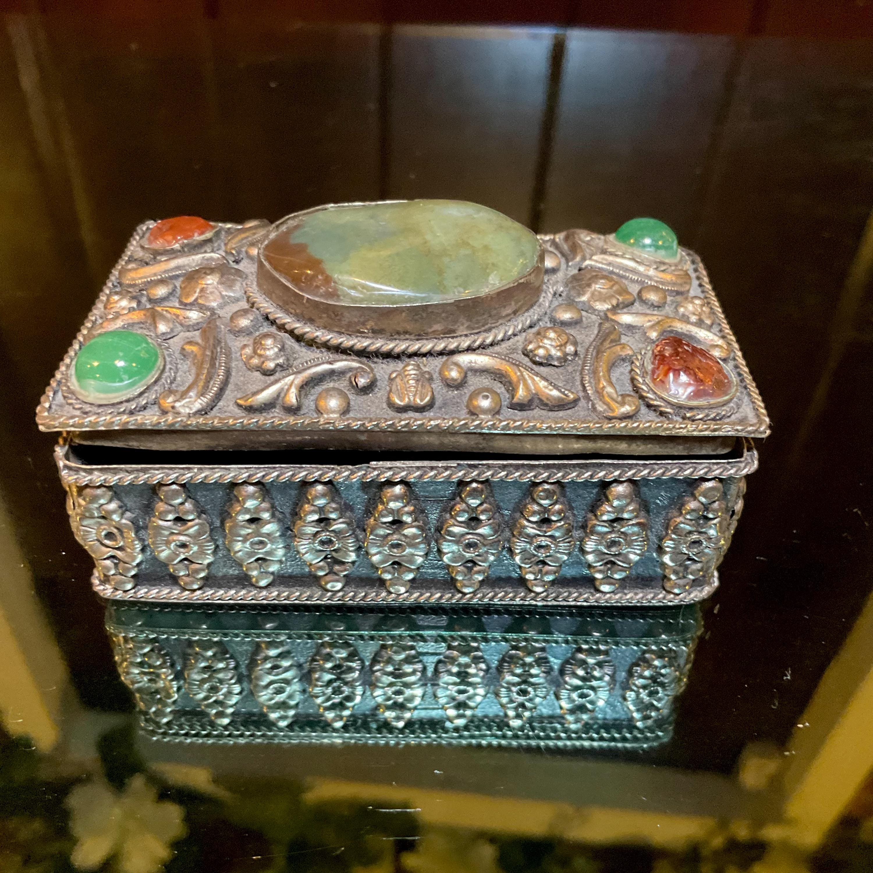 Vintage Agate Inlaid Moroccan Jewelry Box ~ 3" Long with Semi Precious Stones ~ Handmade from Morocco Covered with Silvered Metal Filigree