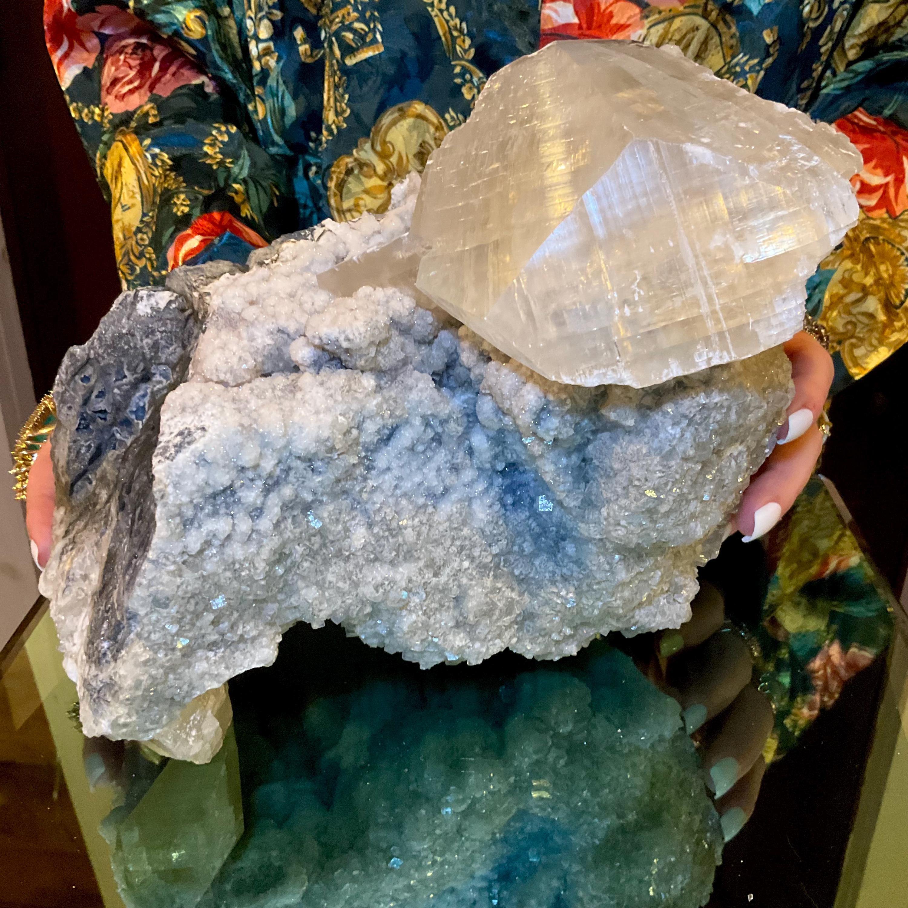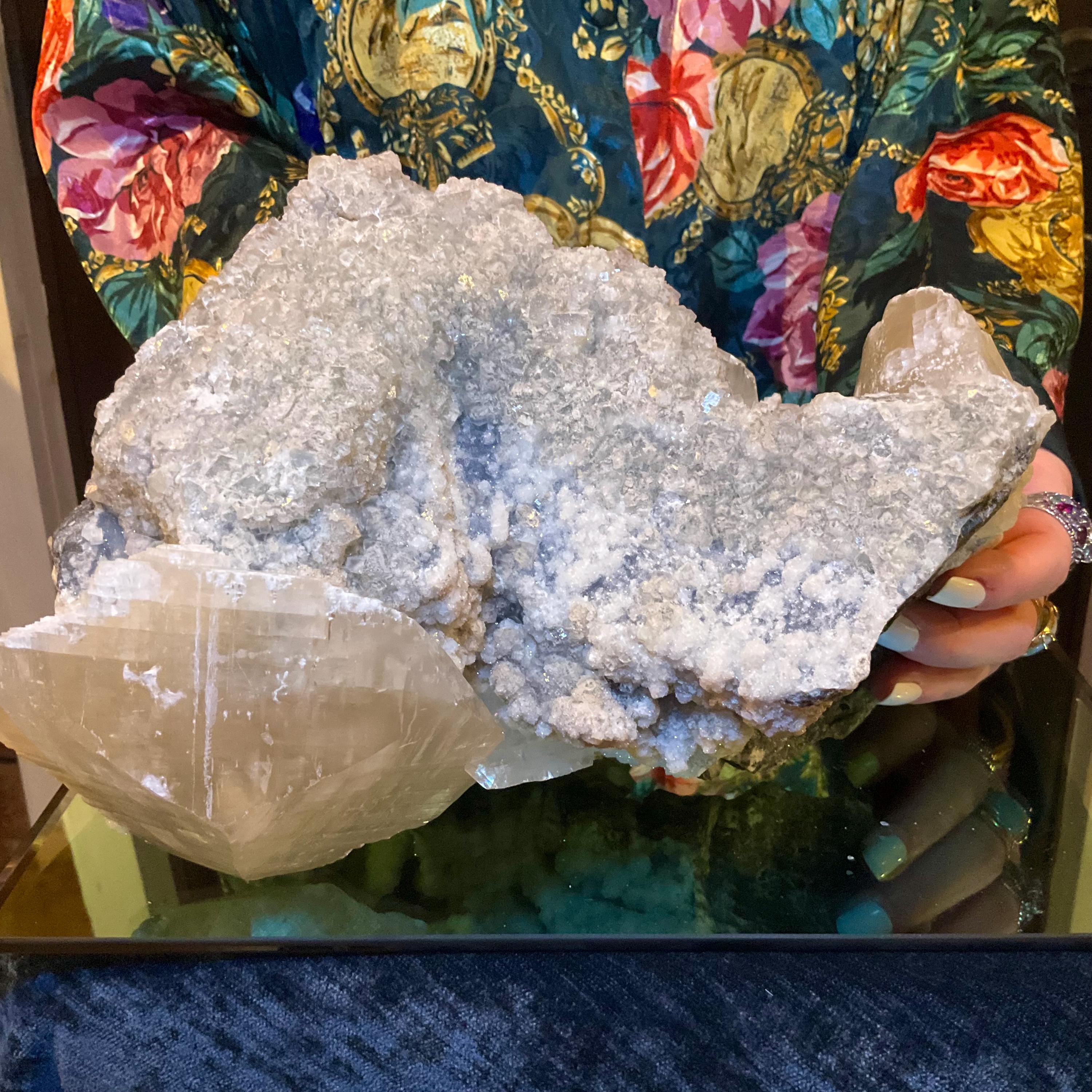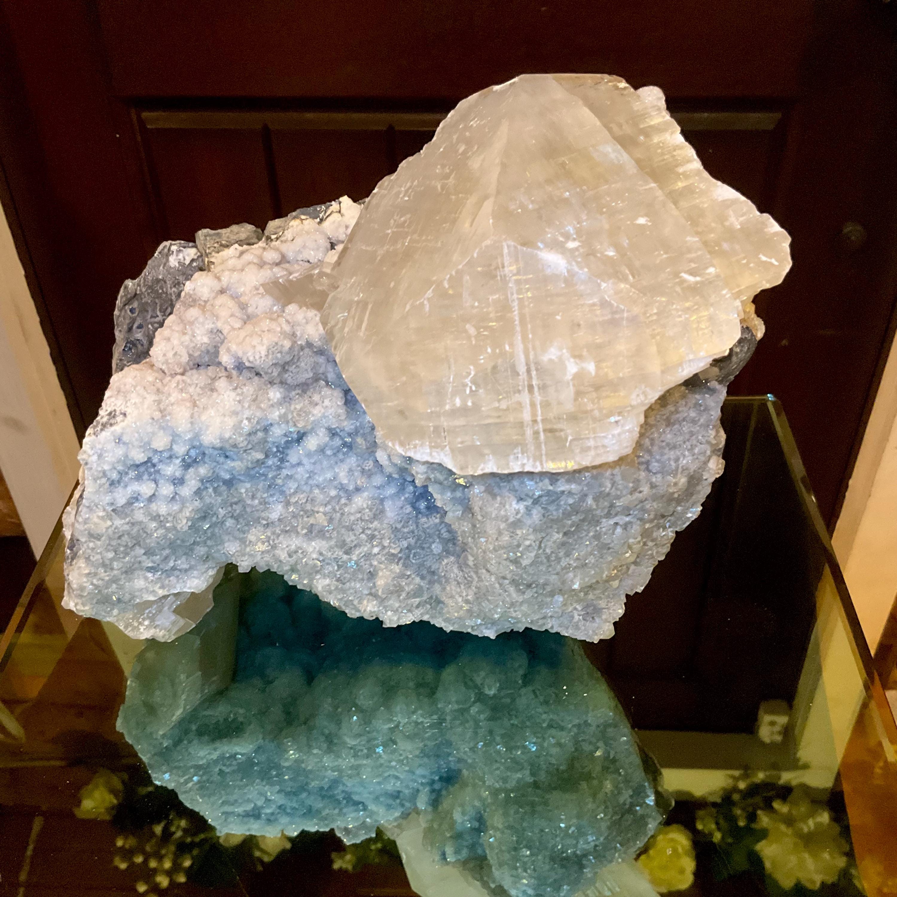 It is a collage of Sparkling, Glowing Clear Calcite and sparkling iridescent blue fluorite spread throughout the top of this magnificent cluster.