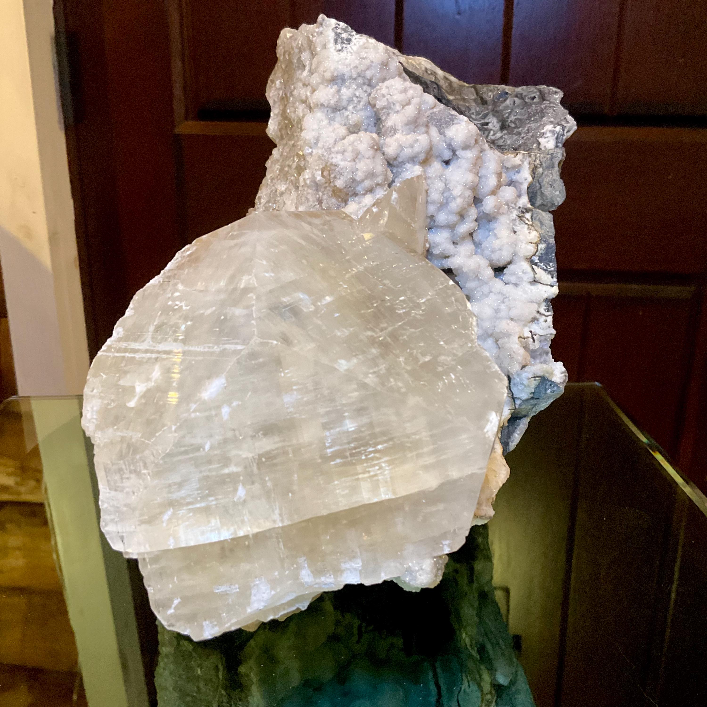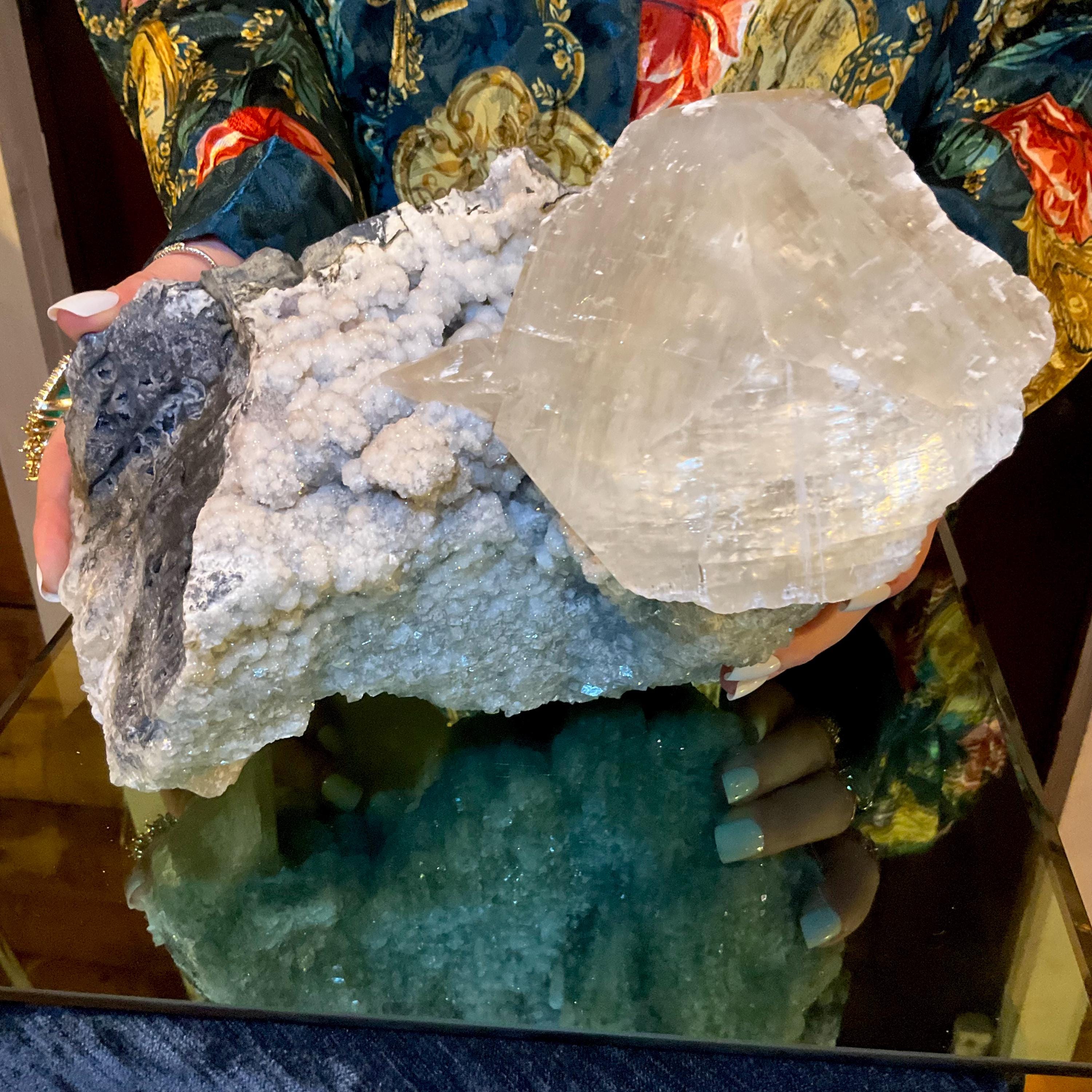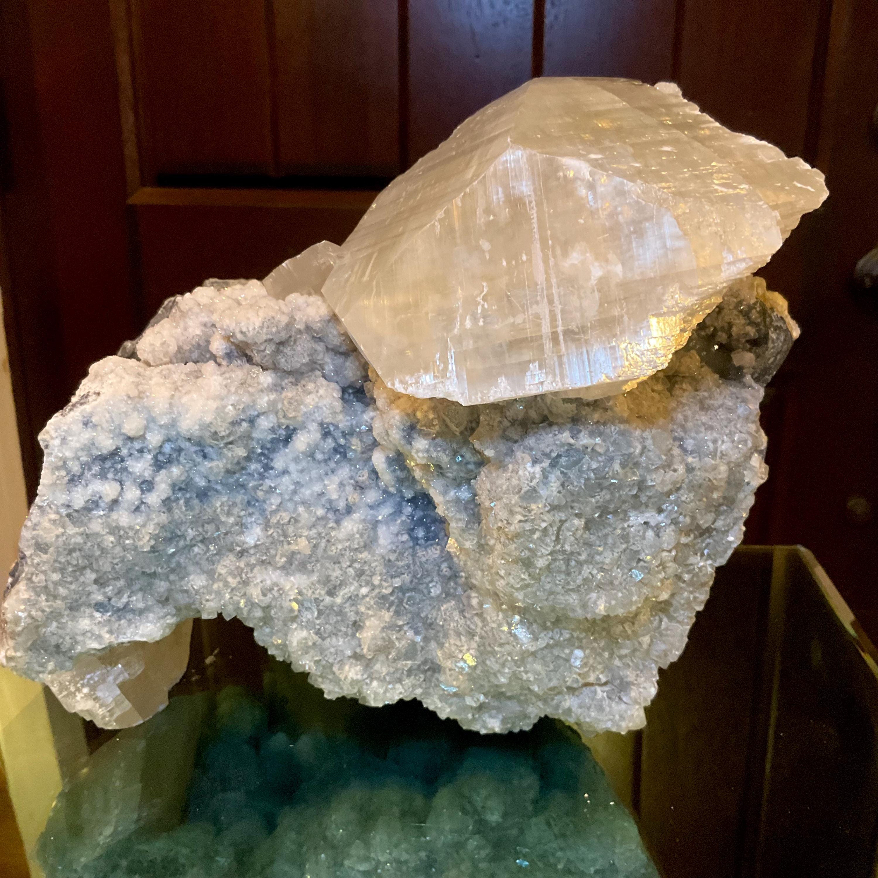 It is a collage of Sparkling, Glowing Clear Calcite and sparkling iridescent blue fluorite spread throughout the top of this magnificent cluster.