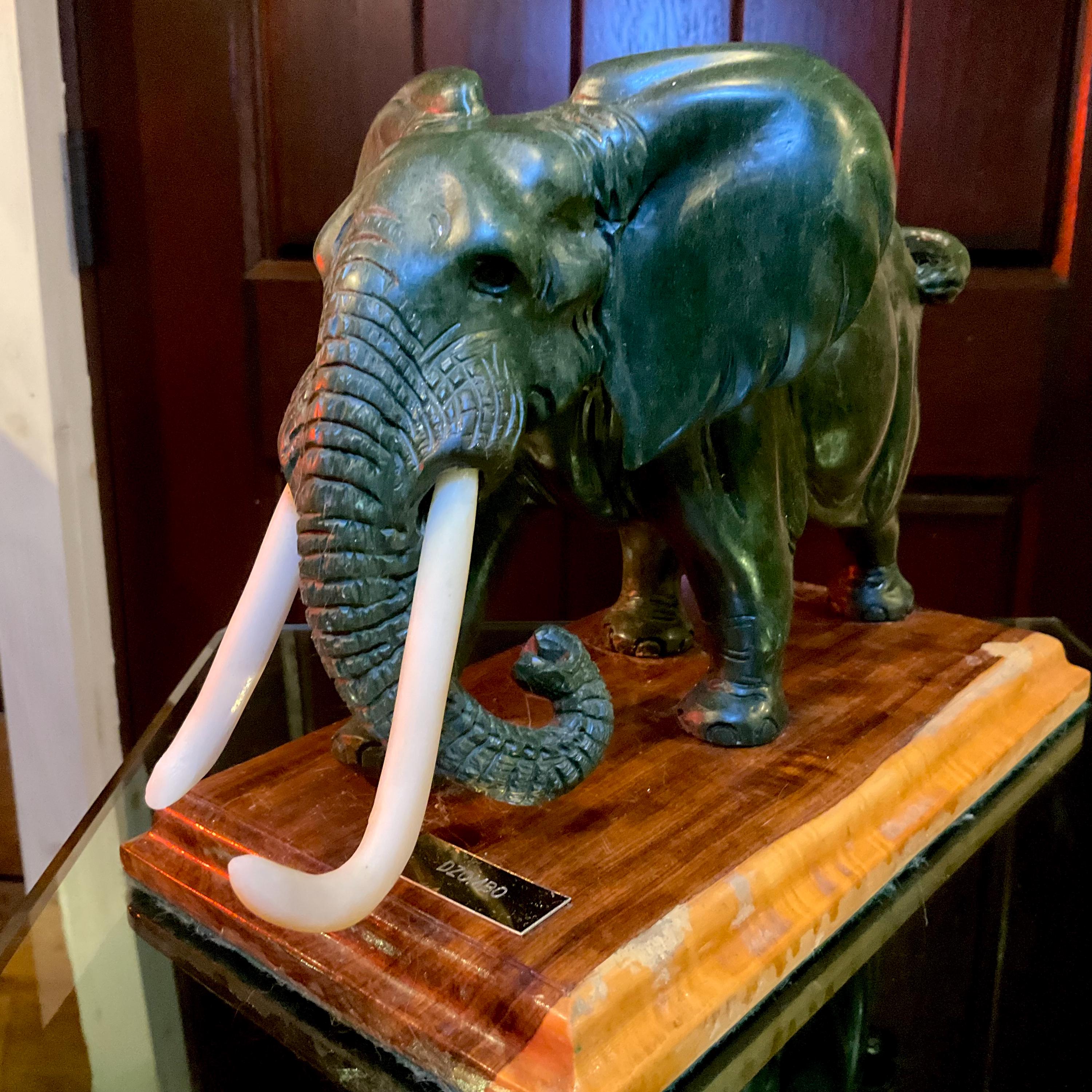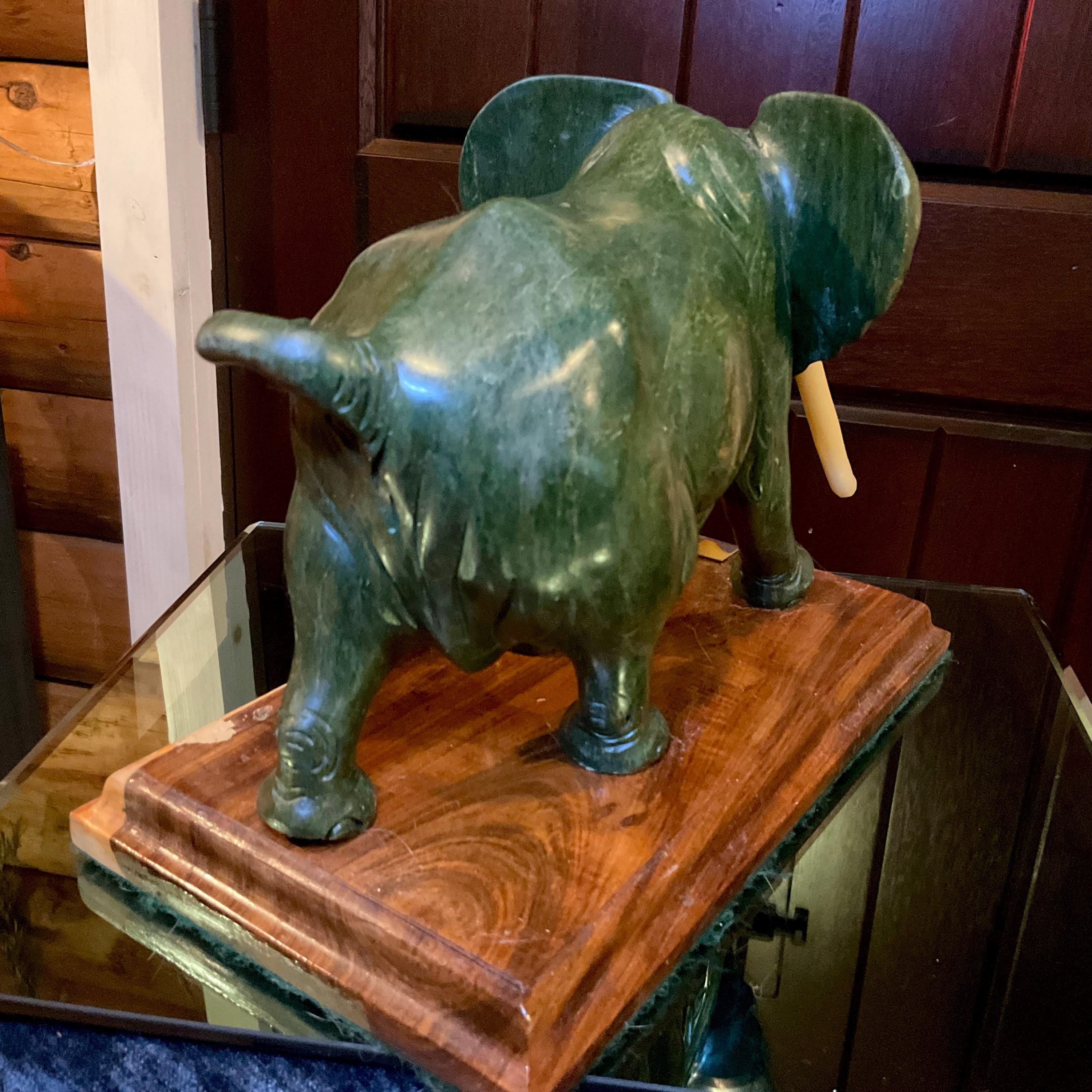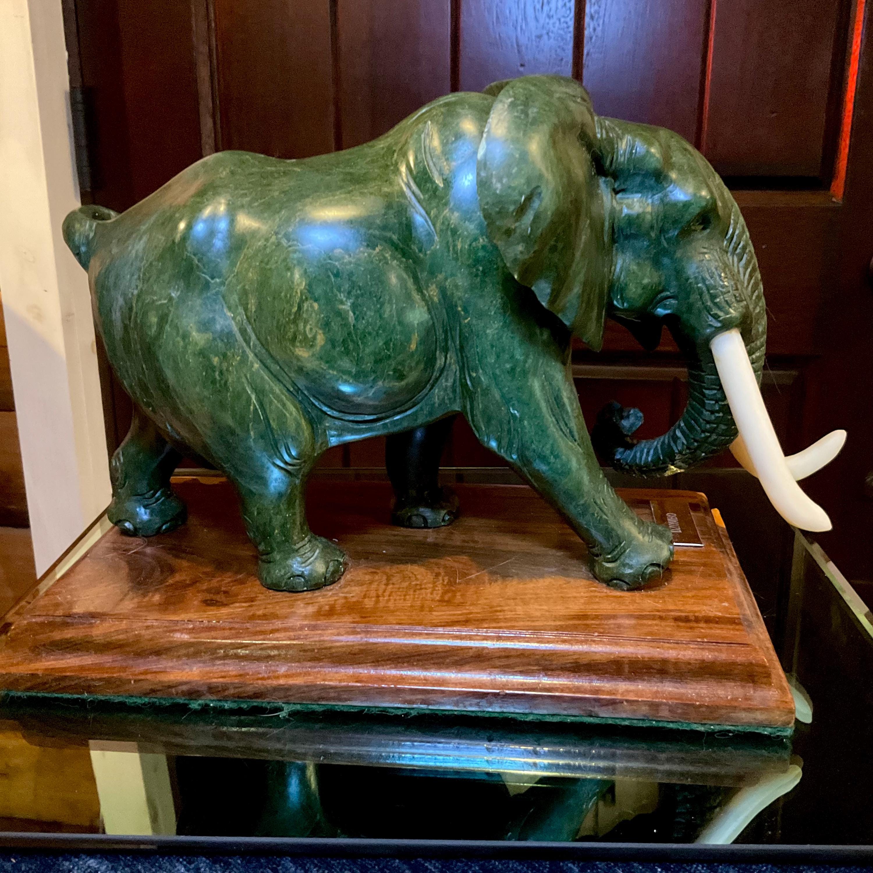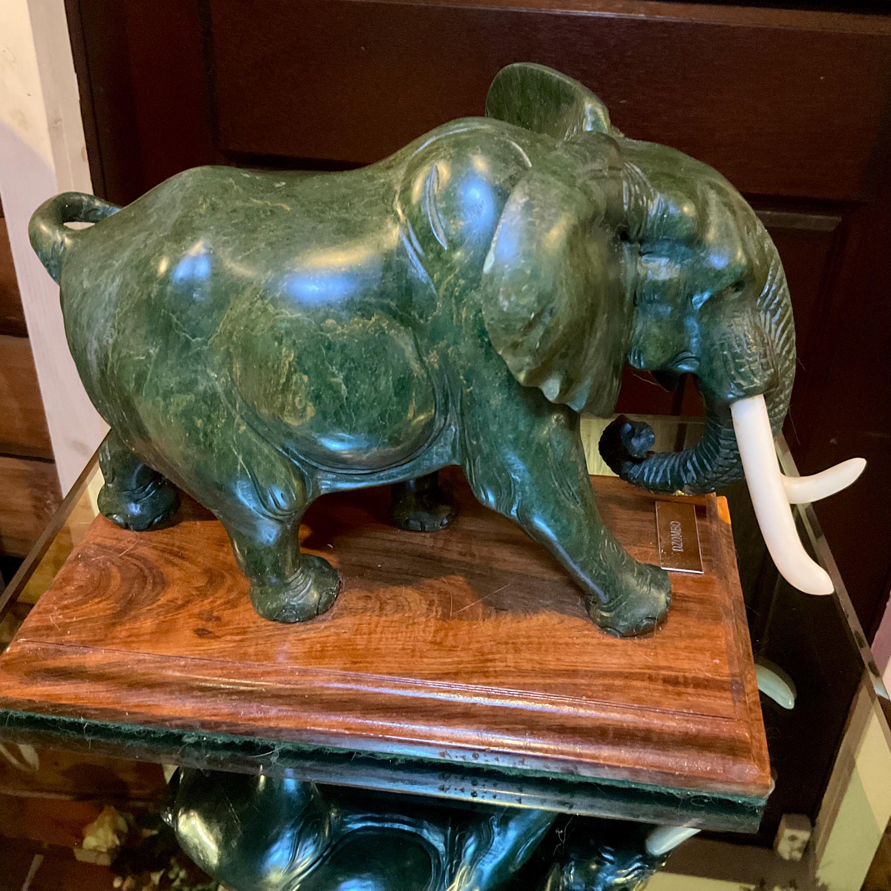 This is a one-of-a-kind carved Verdite Elephant, with one tusk longer than the other.