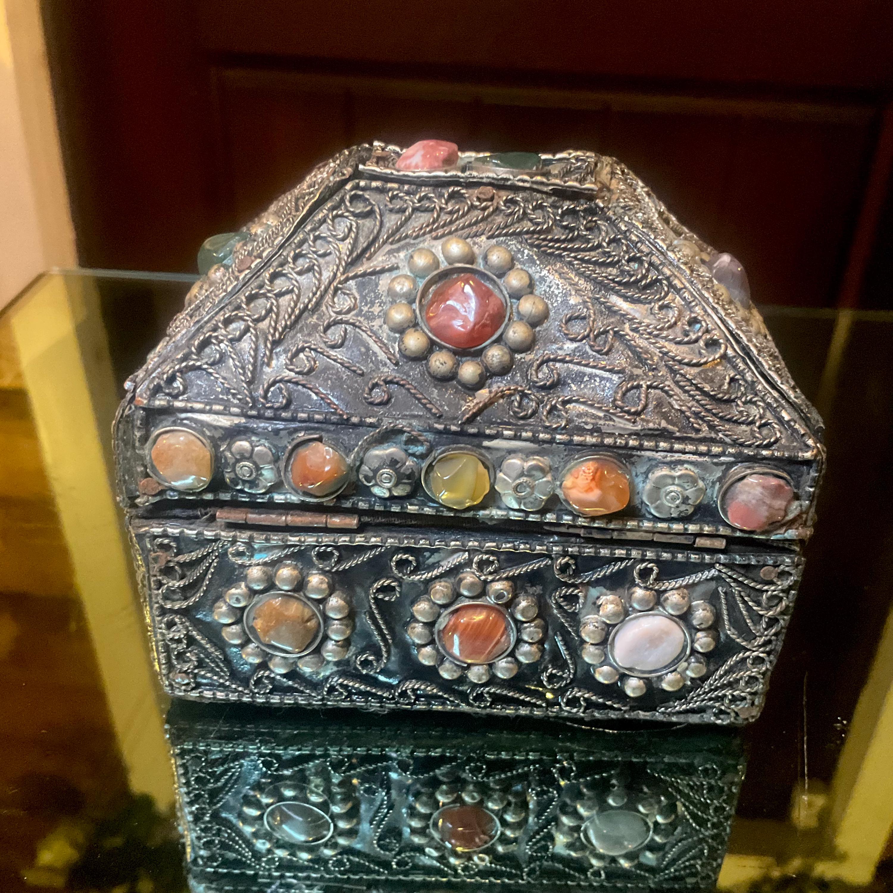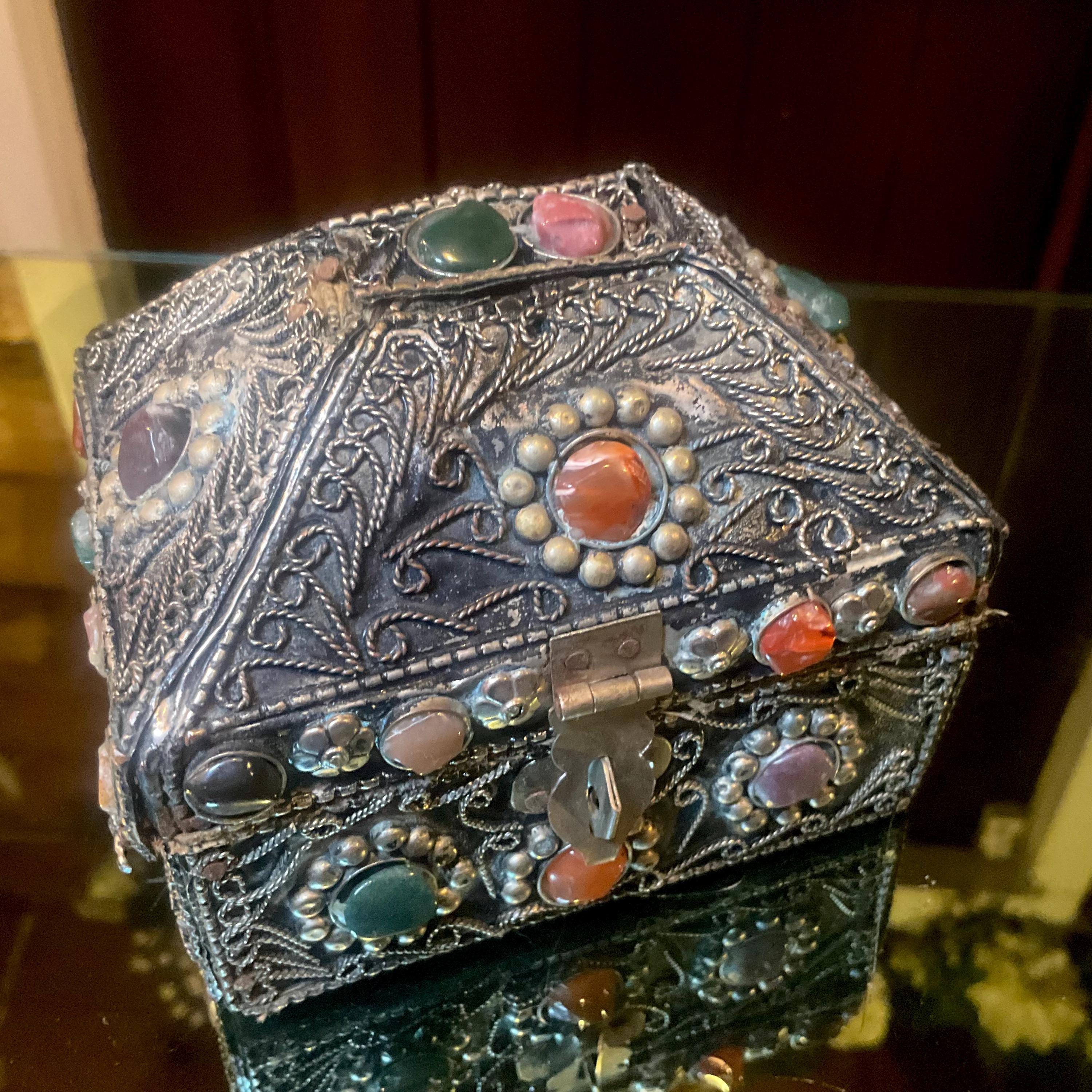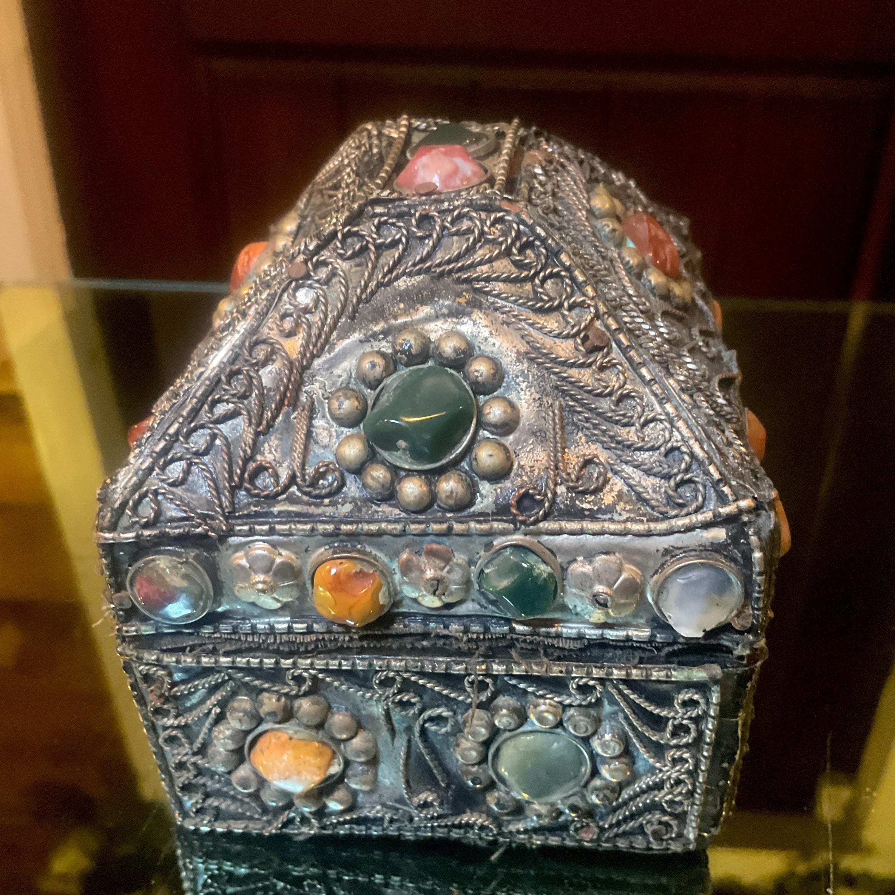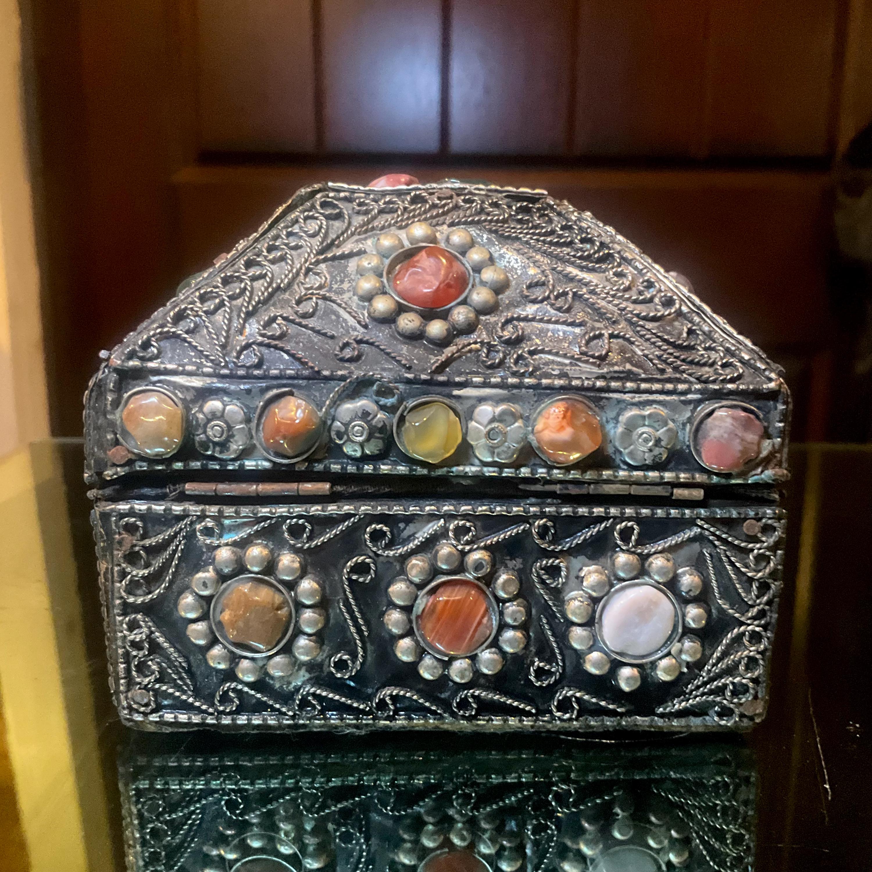 The Vintage Moroccan jewelry box is inlaid with semi-precious agate stones and covered with silvered metal filigree.