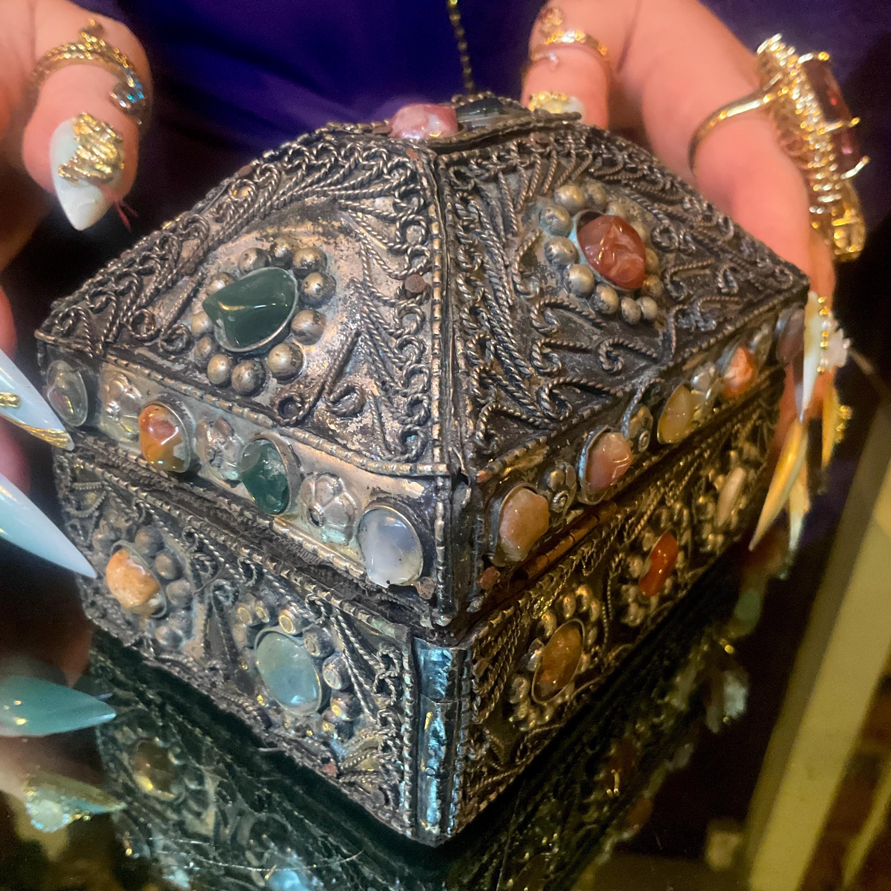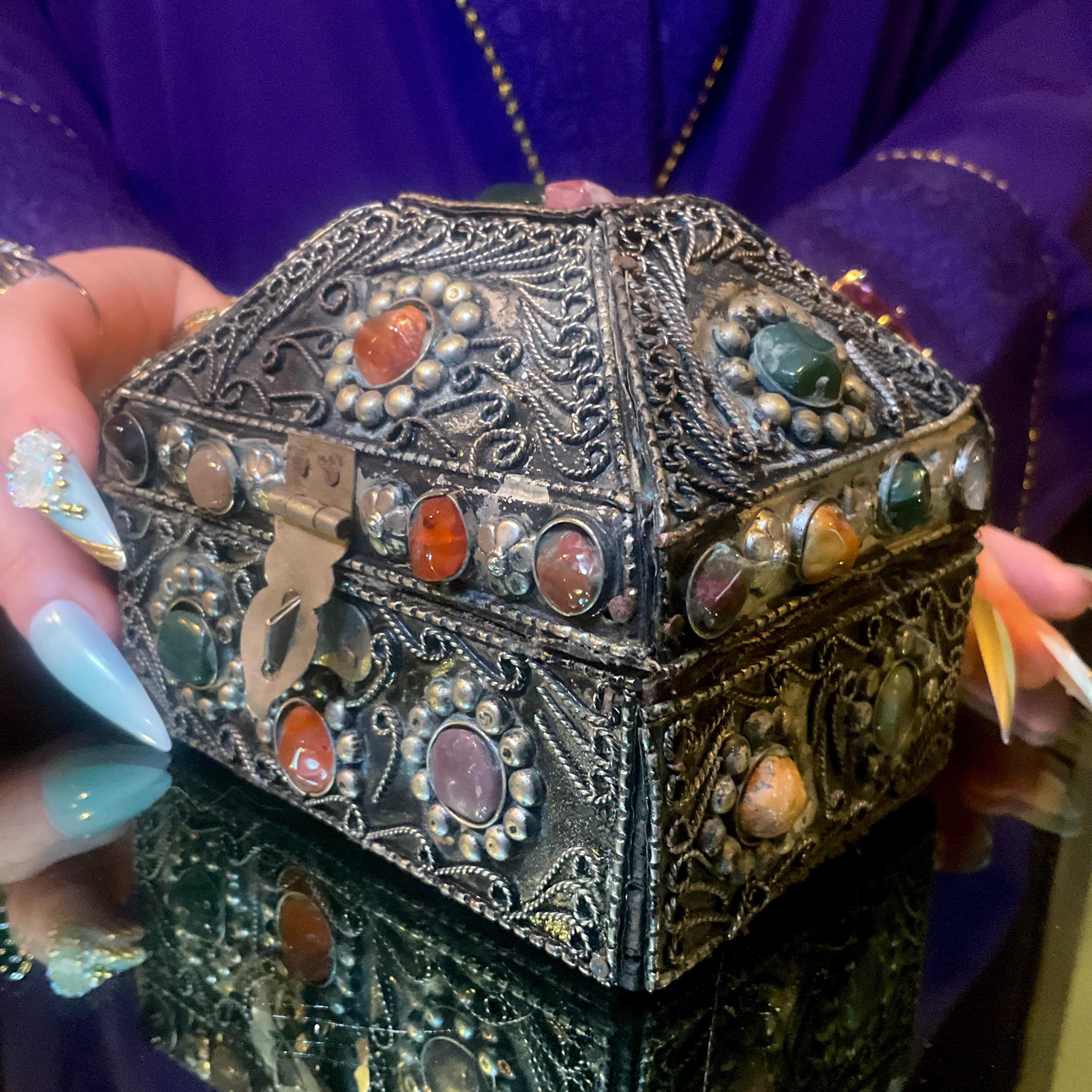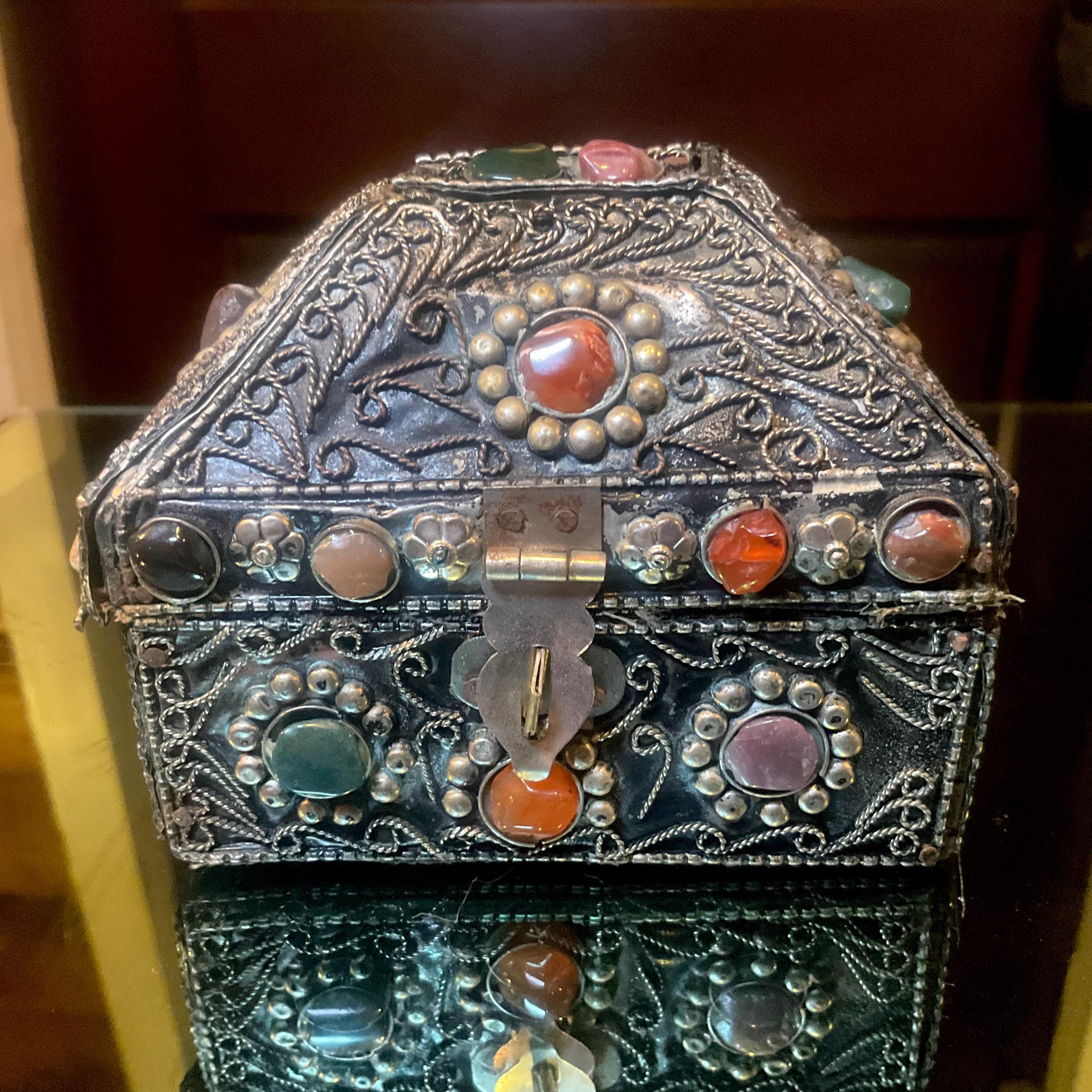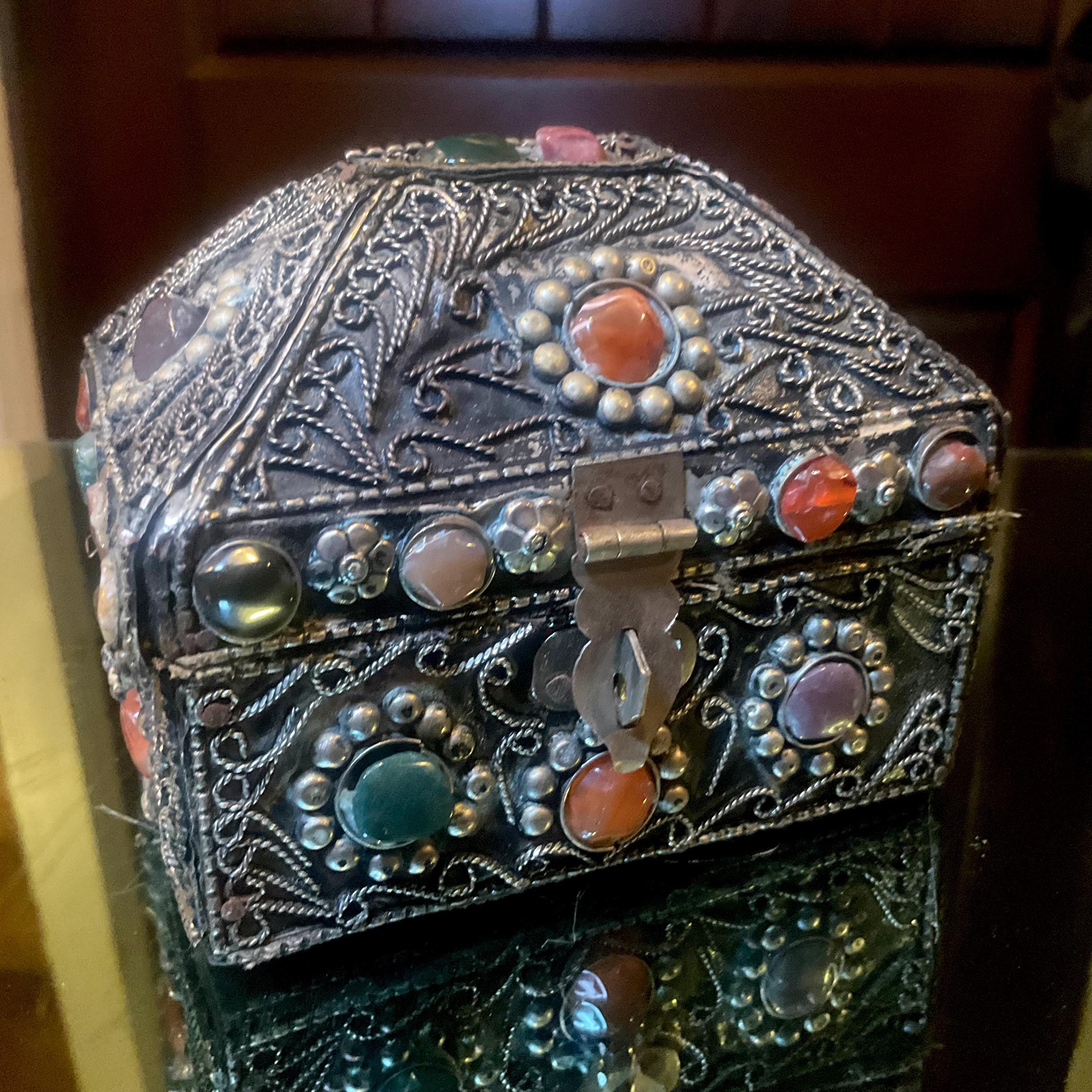 The Vintage Moroccan jewelry box is inlaid with semi-precious agate stones and covered with silvered metal filigree.