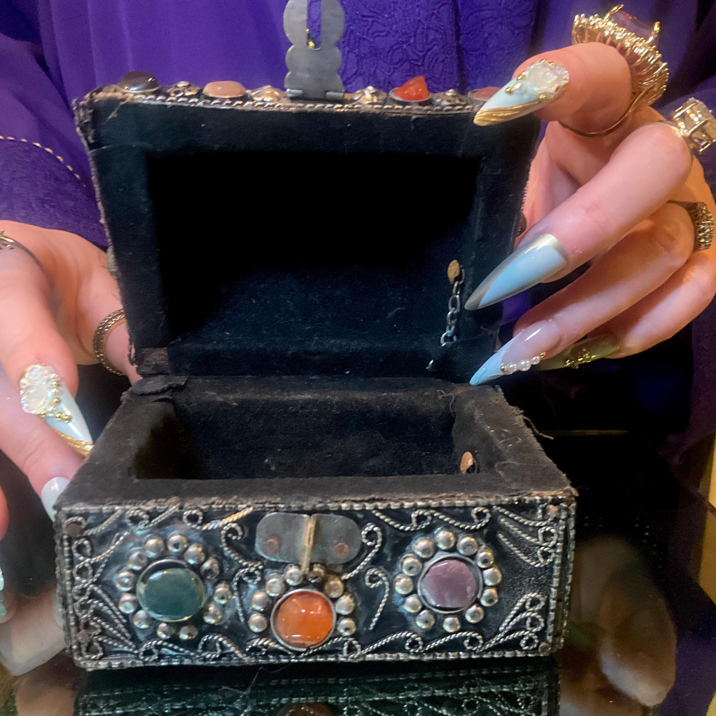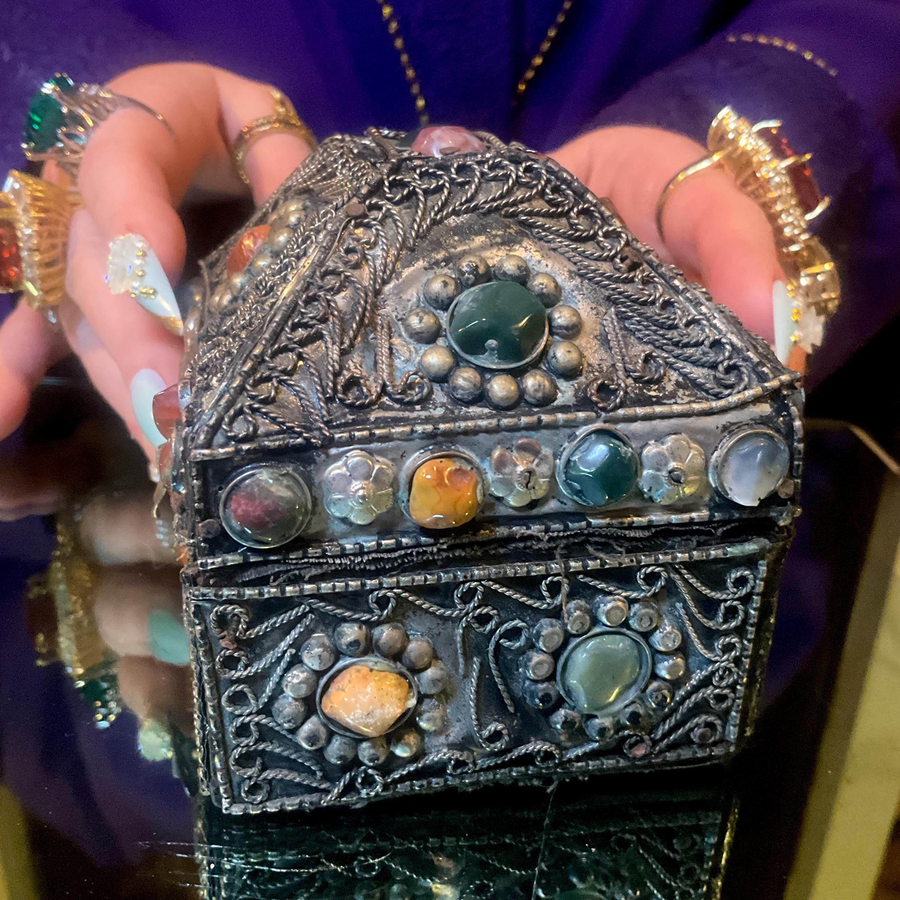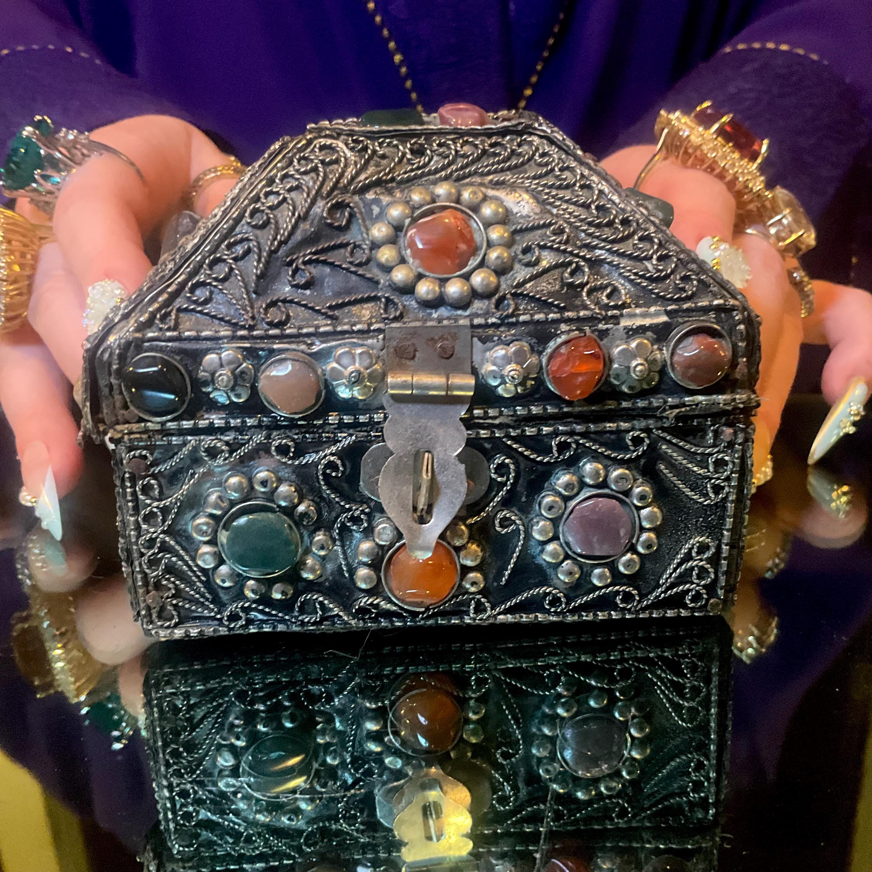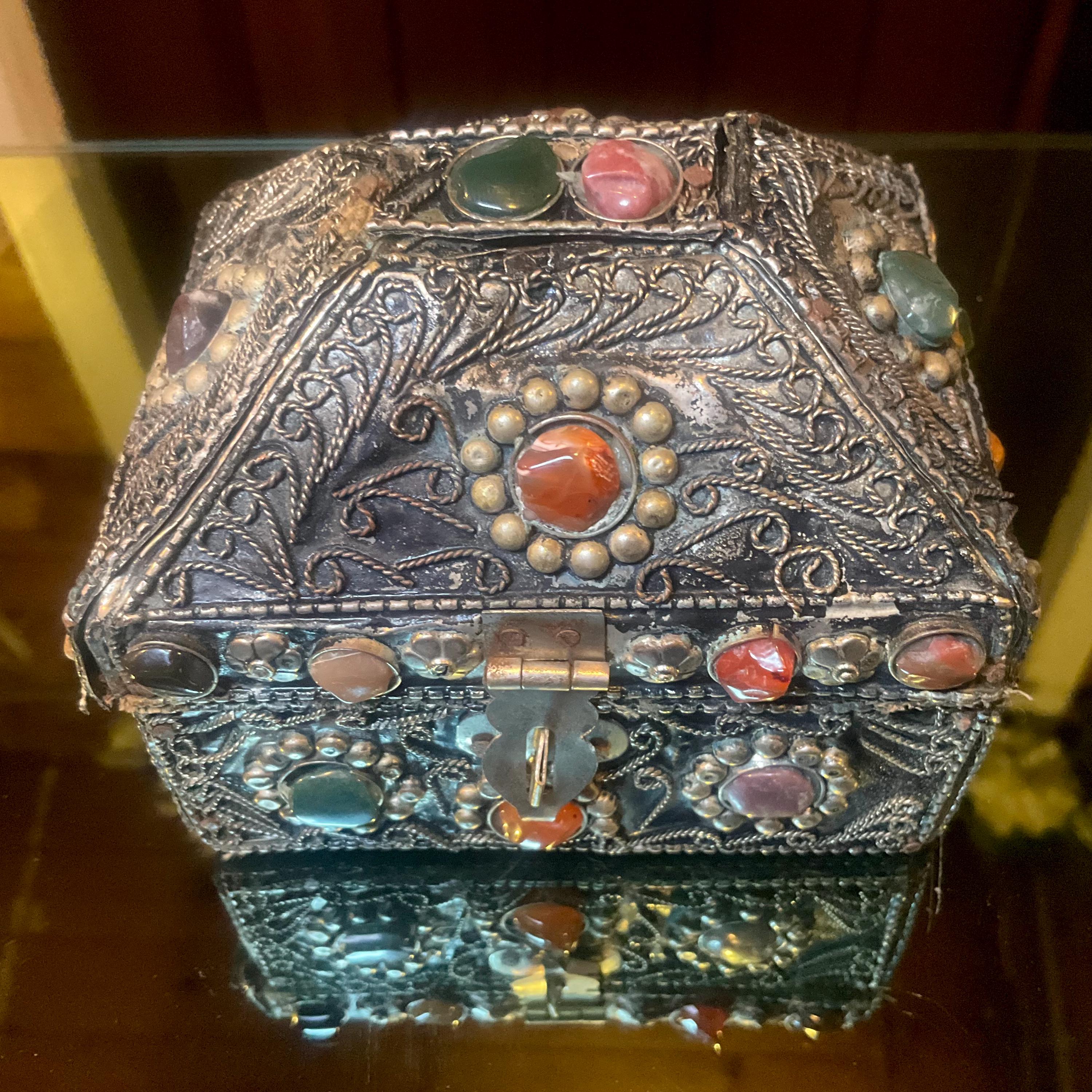 The Vintage Moroccan jewelry box is inlaid with semi-precious agate stones and covered with silvered metal filigree.