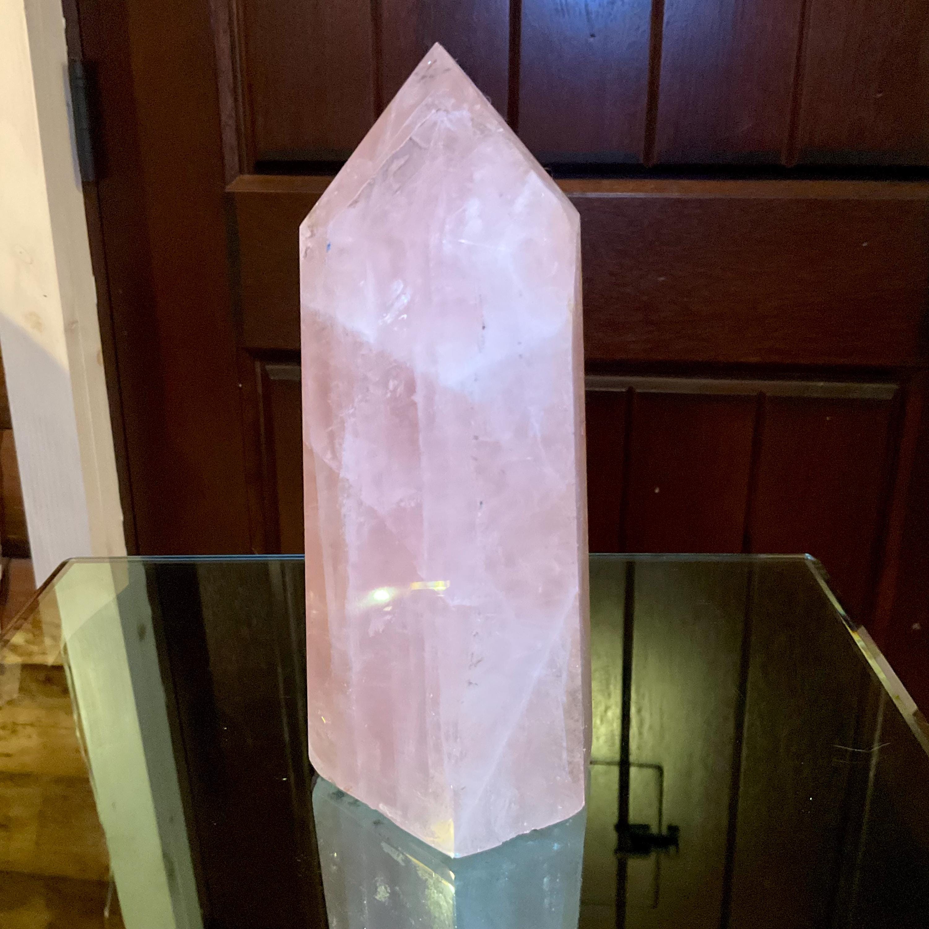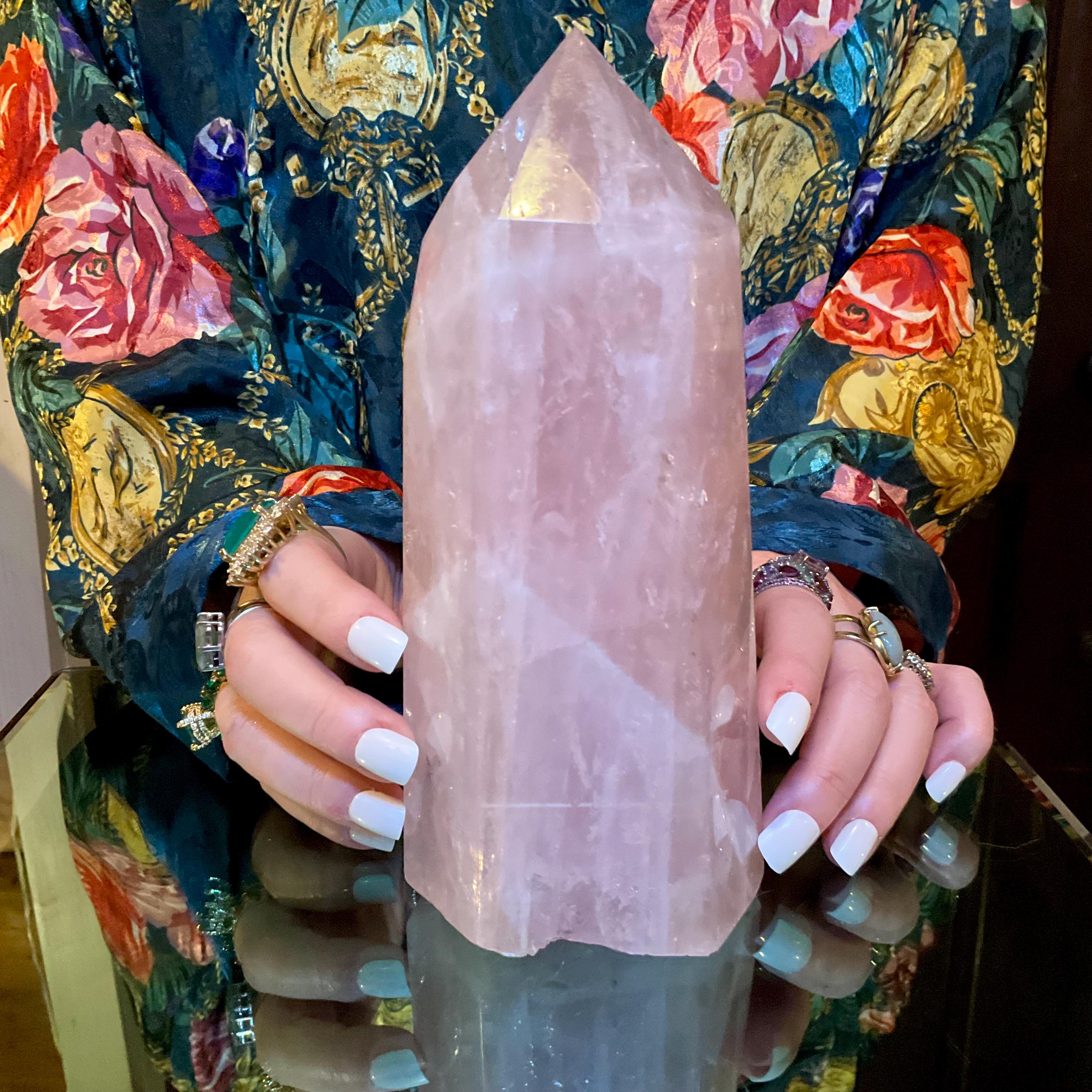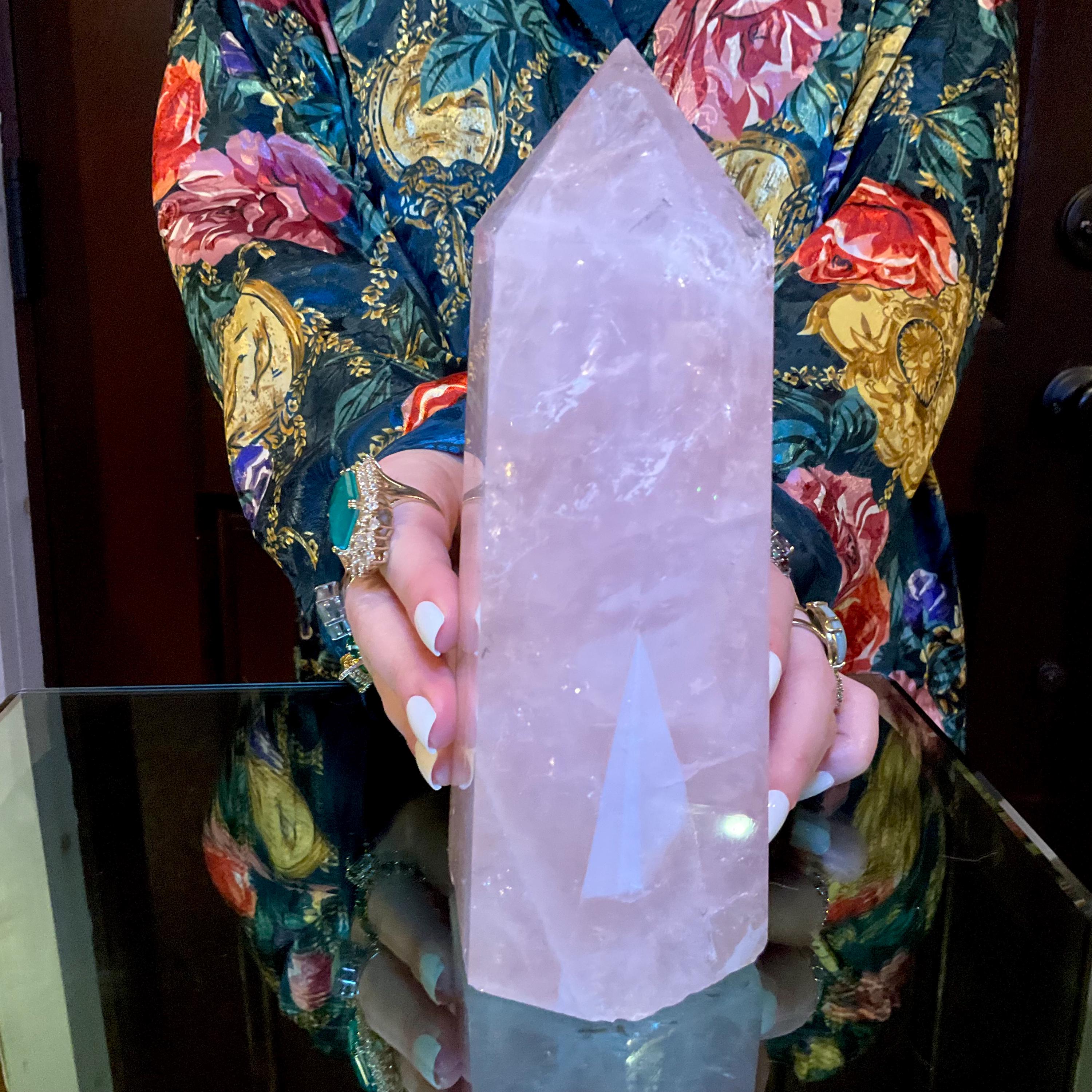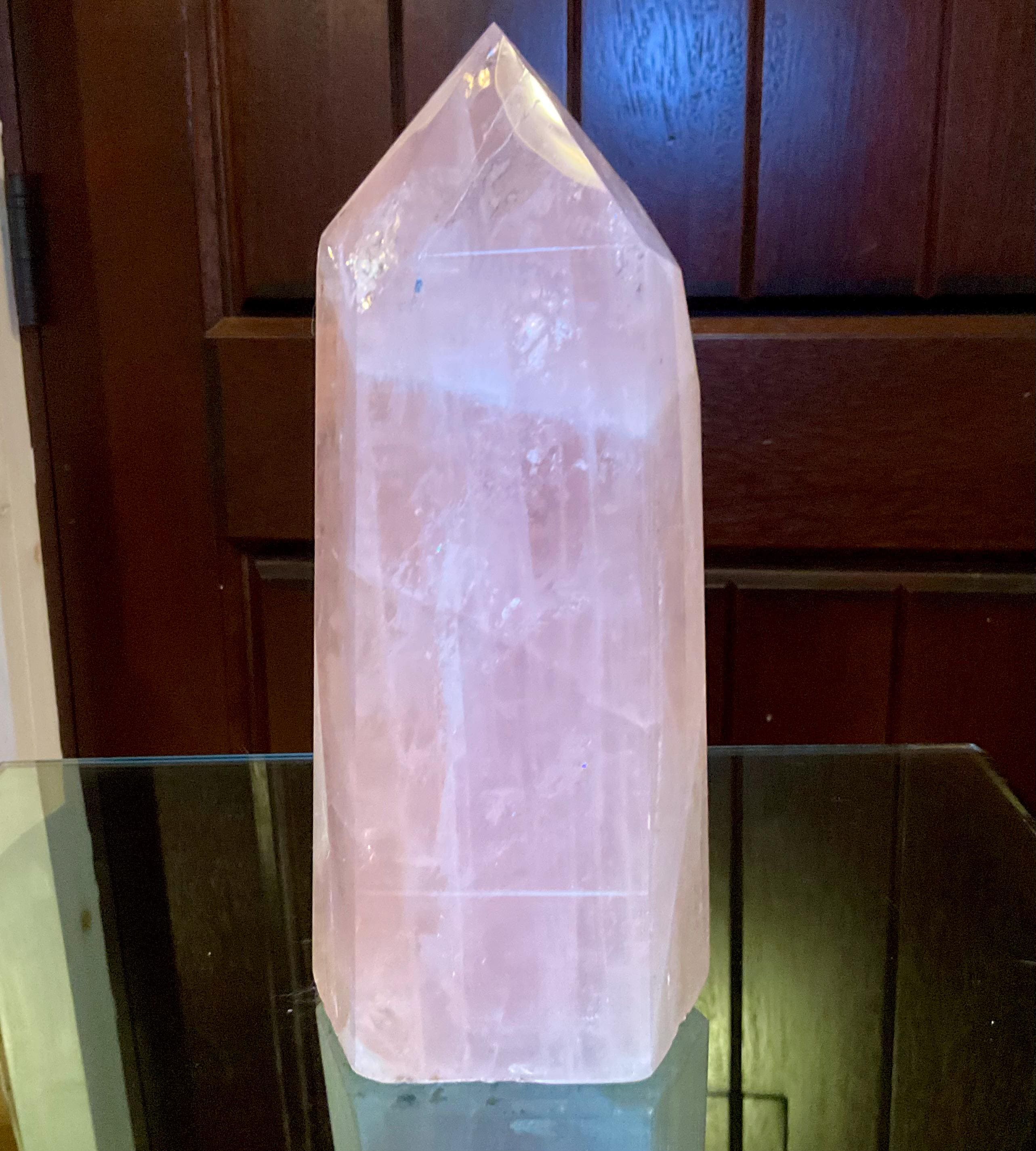 This is such a beautiful specimen of rose quartz, it is beautifully gem cut, the point is perfection, the generator is highly polished, and it is a large, glorious, chunky generator.