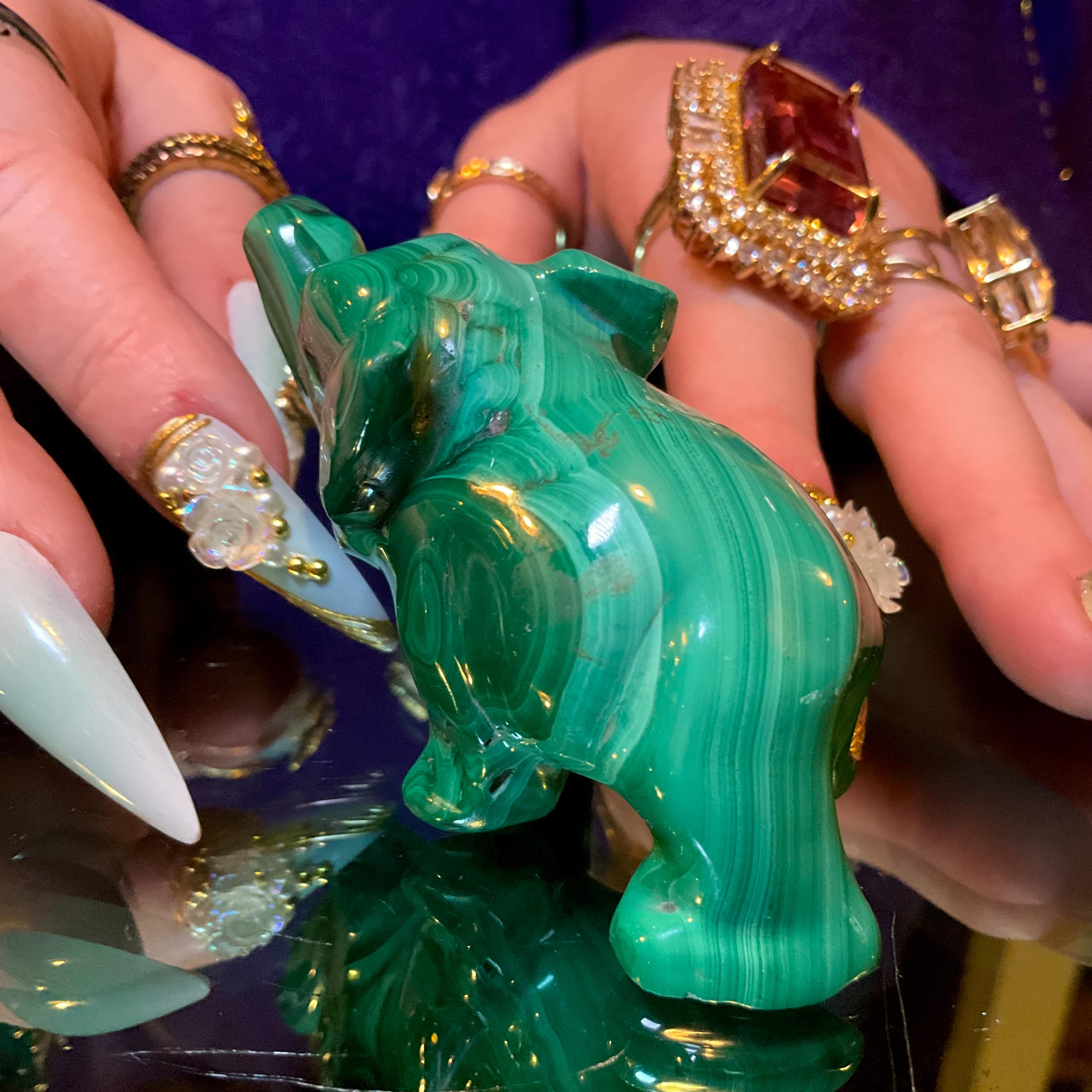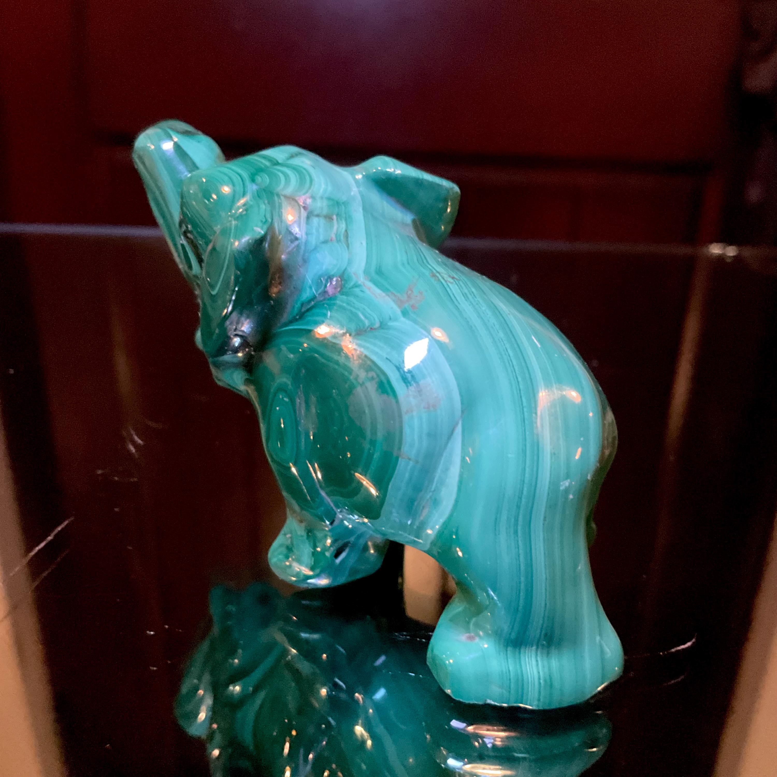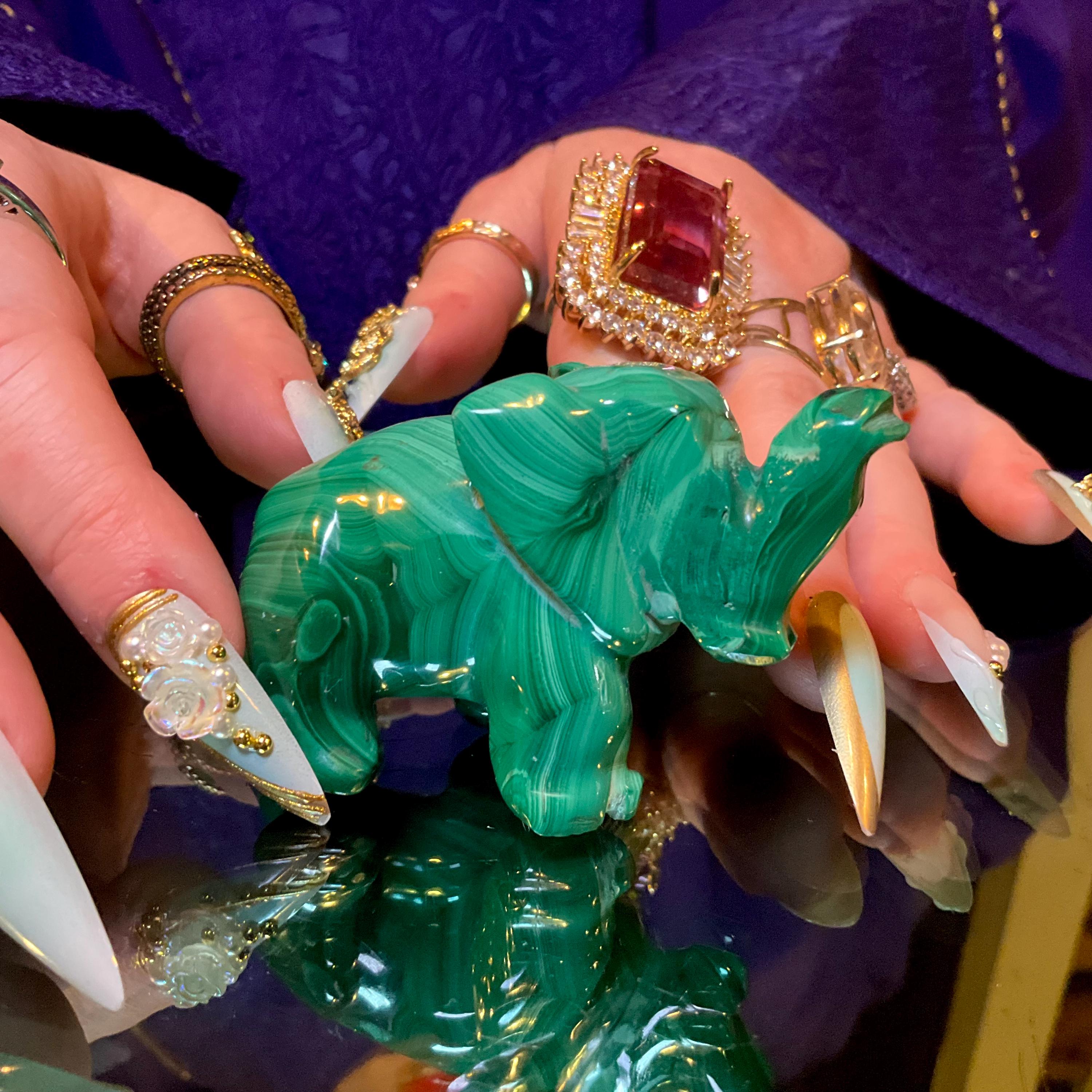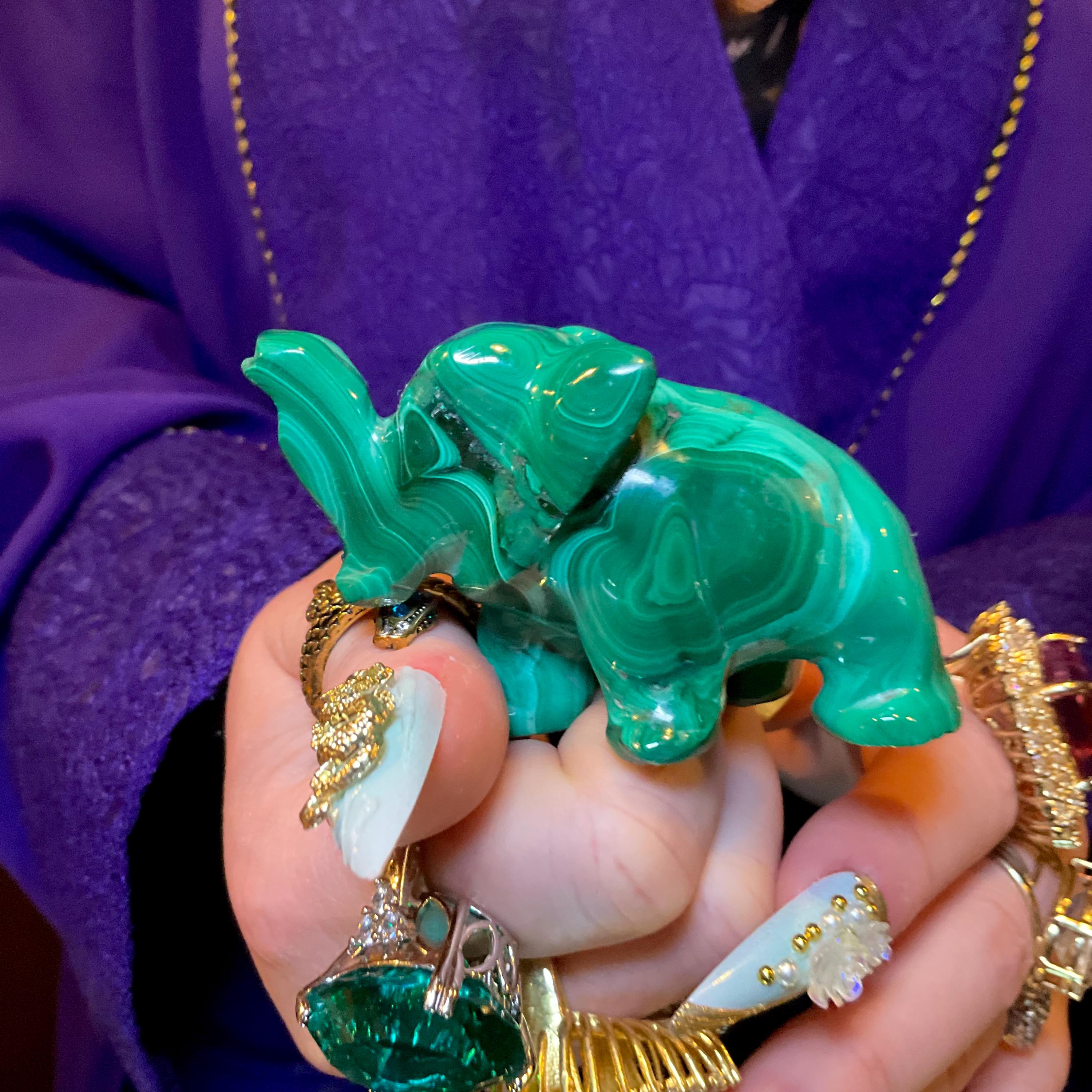 What makes this Malachite Elephant so special is age, patina, and its vintage deco free form style.