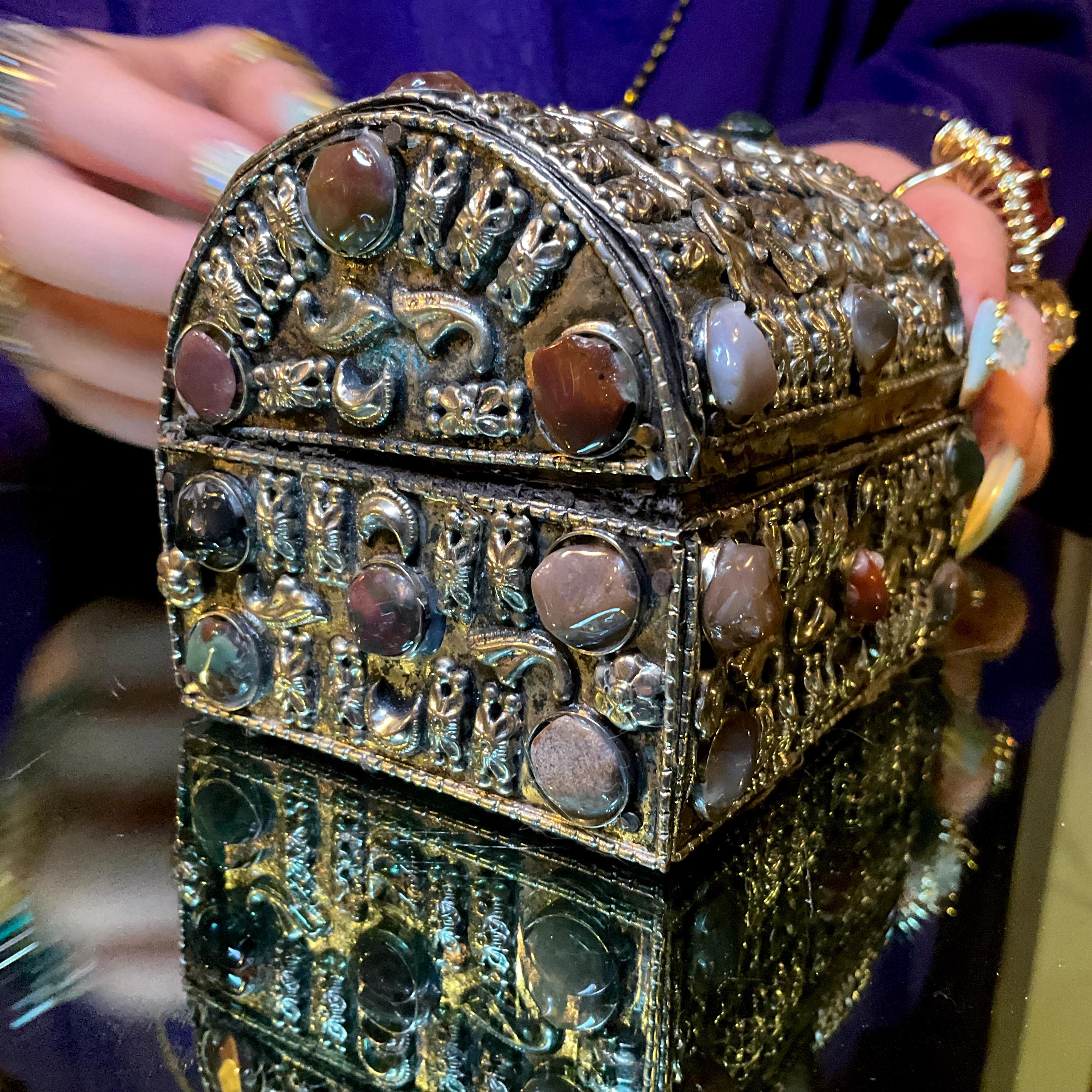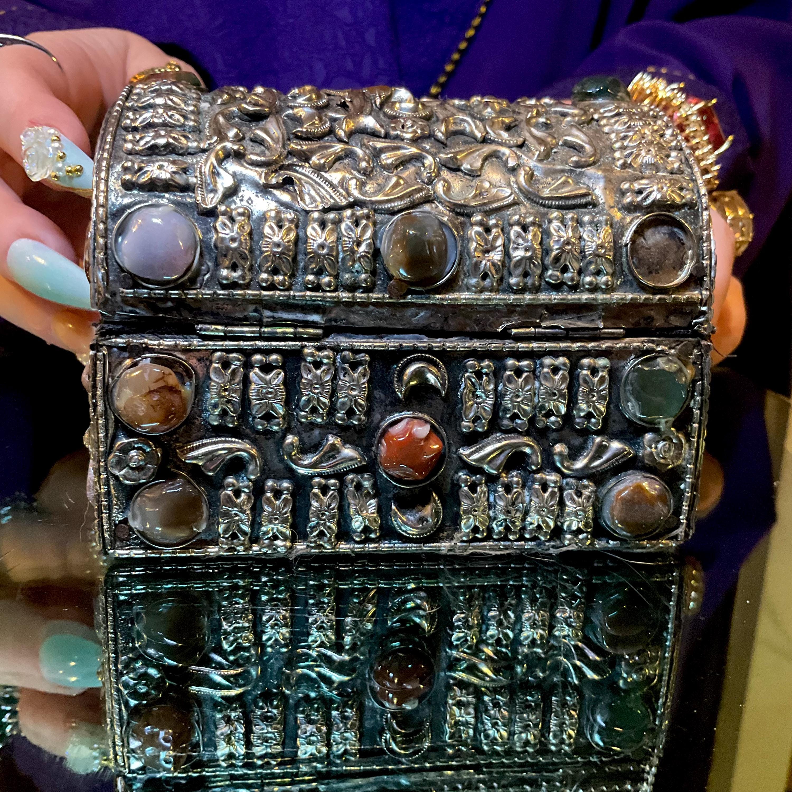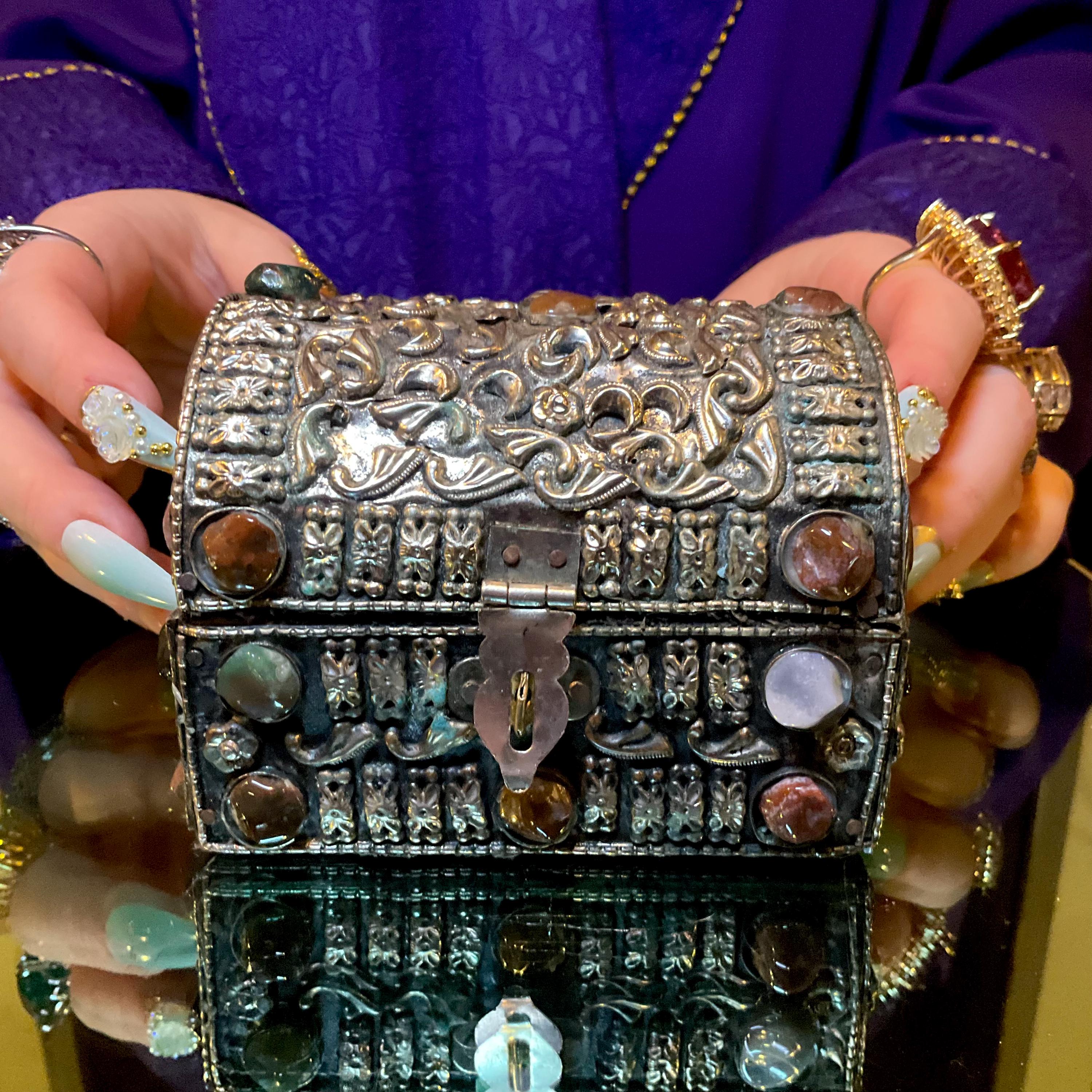 The Vintage Moroccan jewelry box is inlaid with semi-precious agate stones and covered with silvered metal filigree.