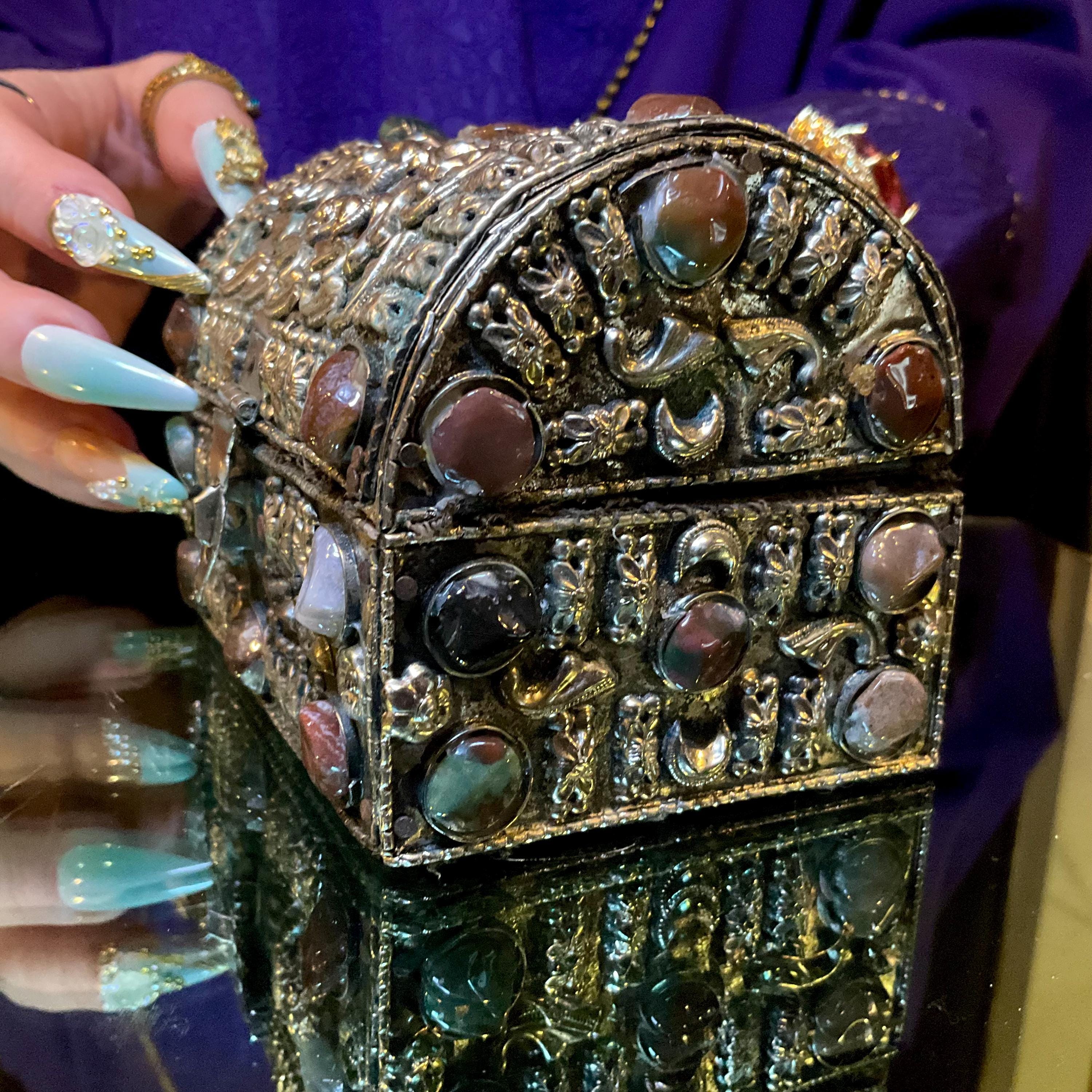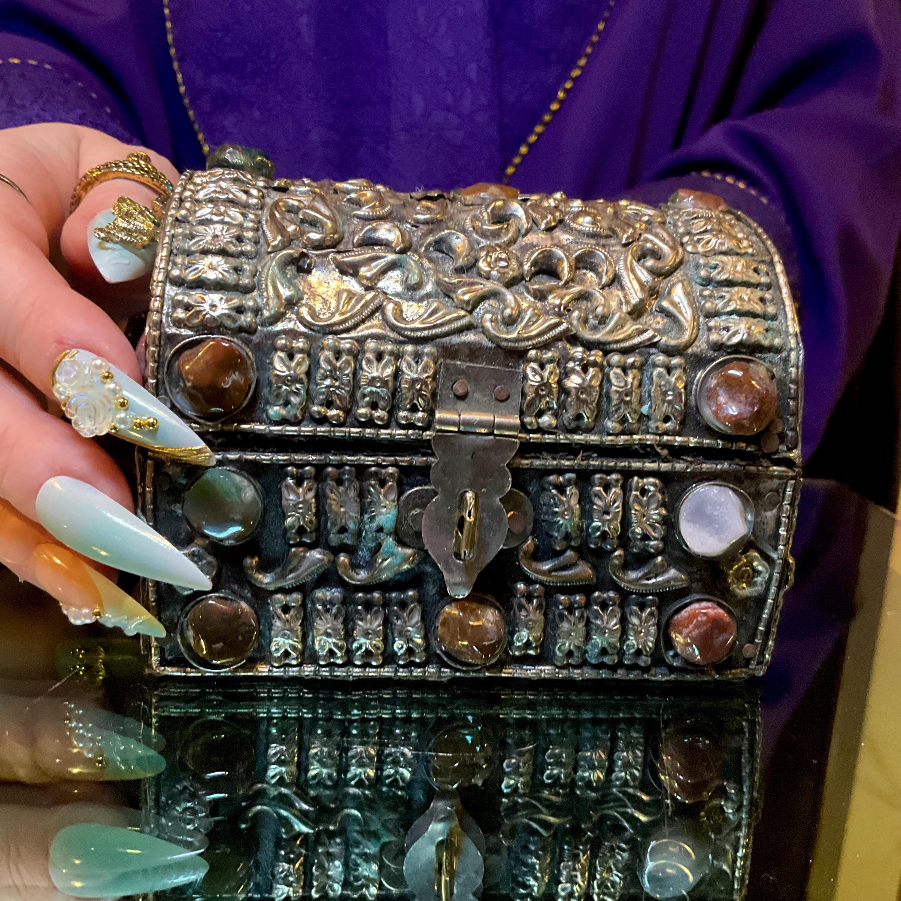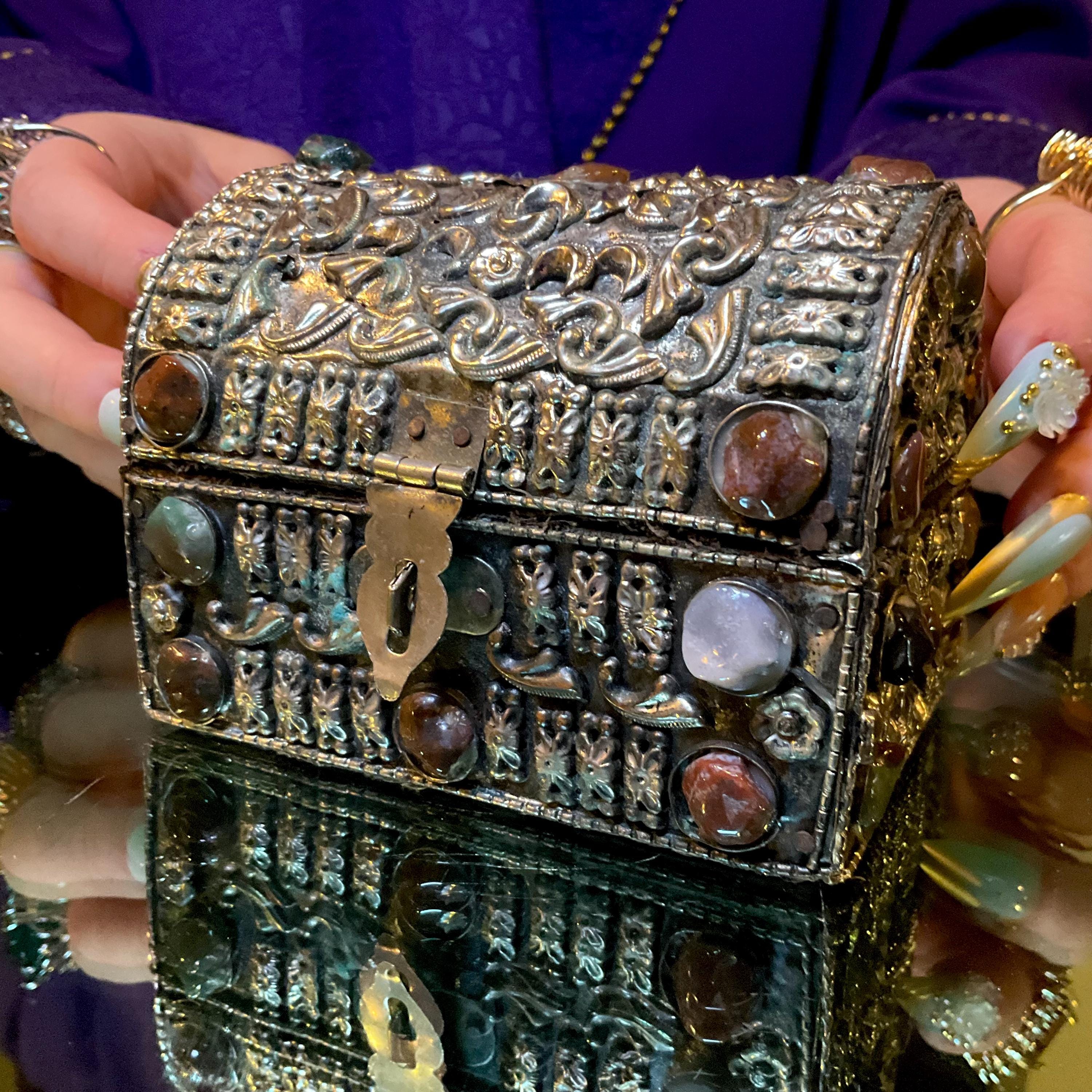 The Vintage Moroccan jewelry box is inlaid with semi-precious agate stones and covered with silvered metal filigree.