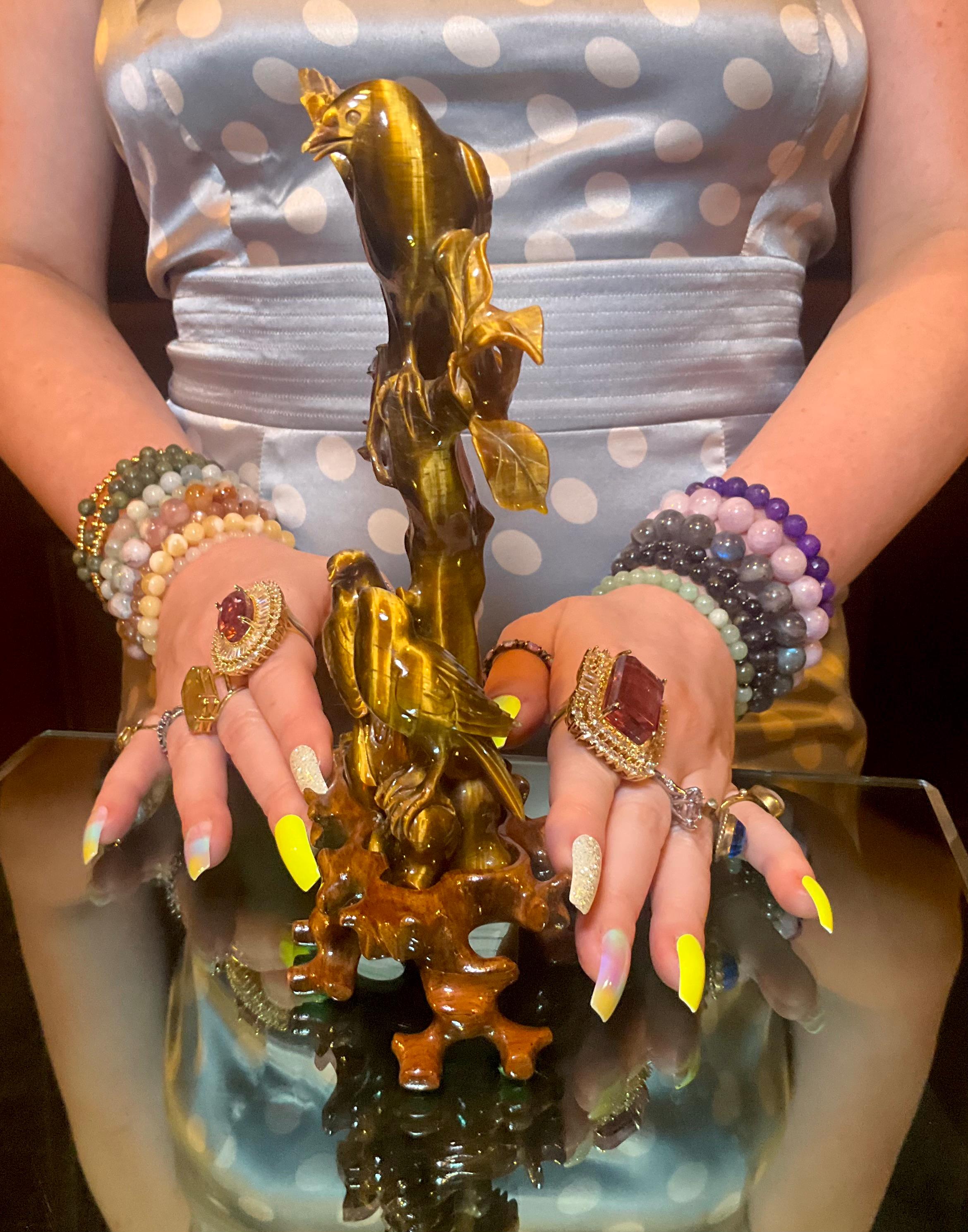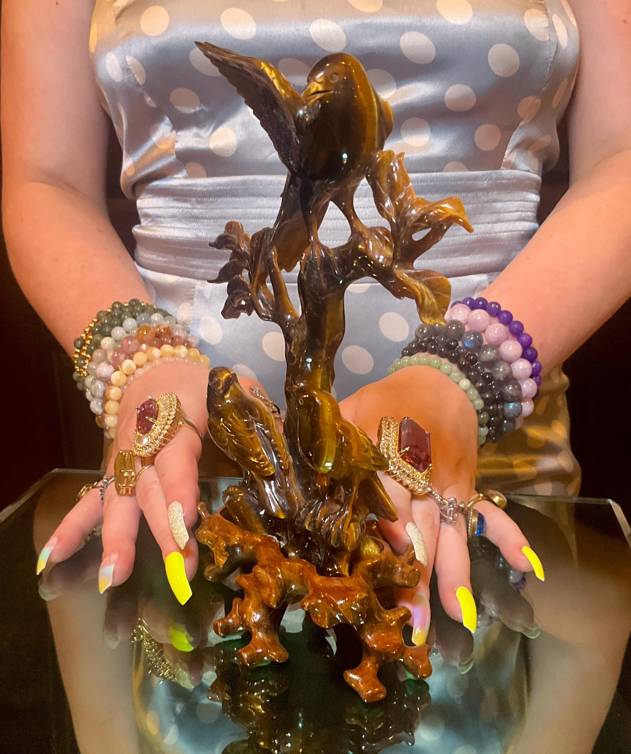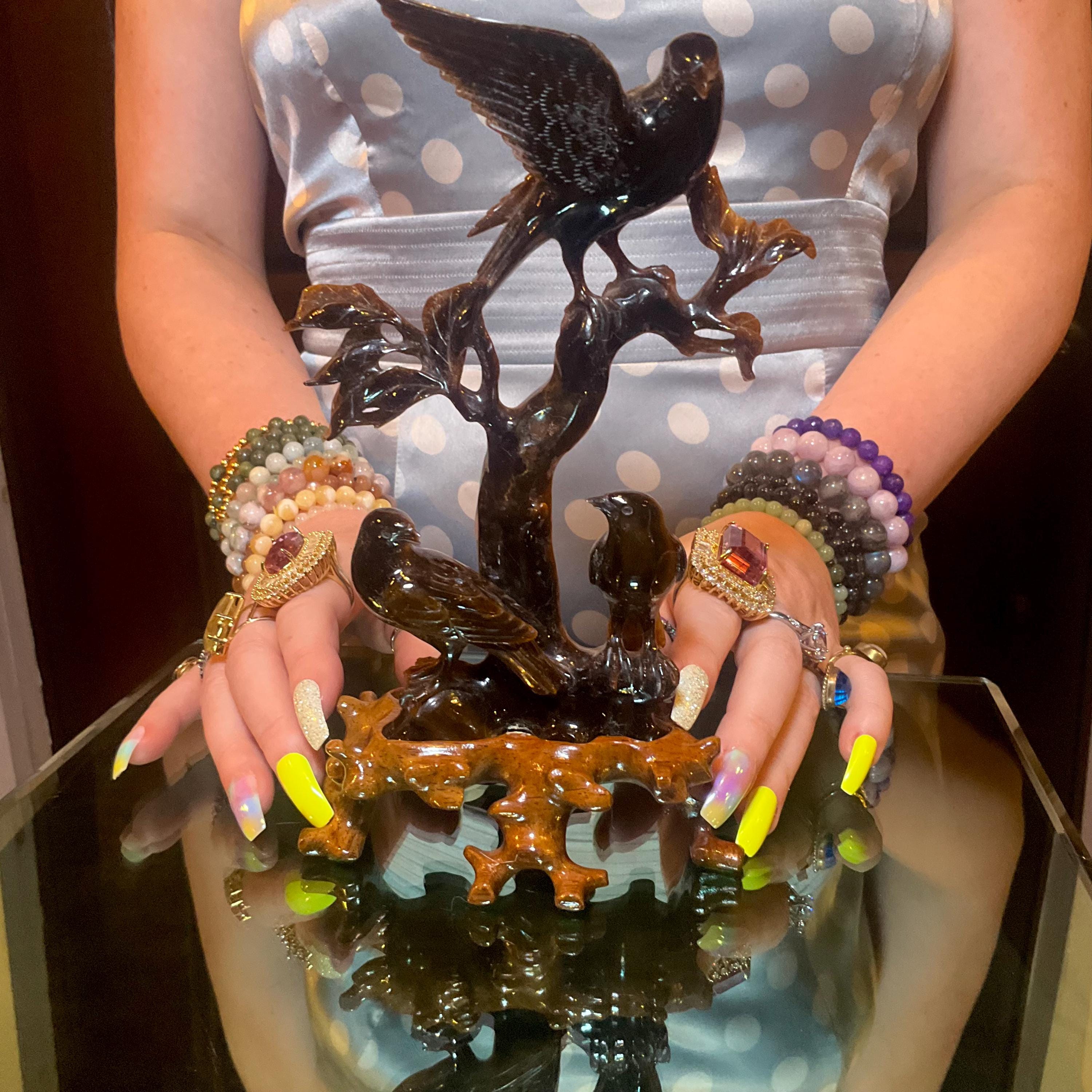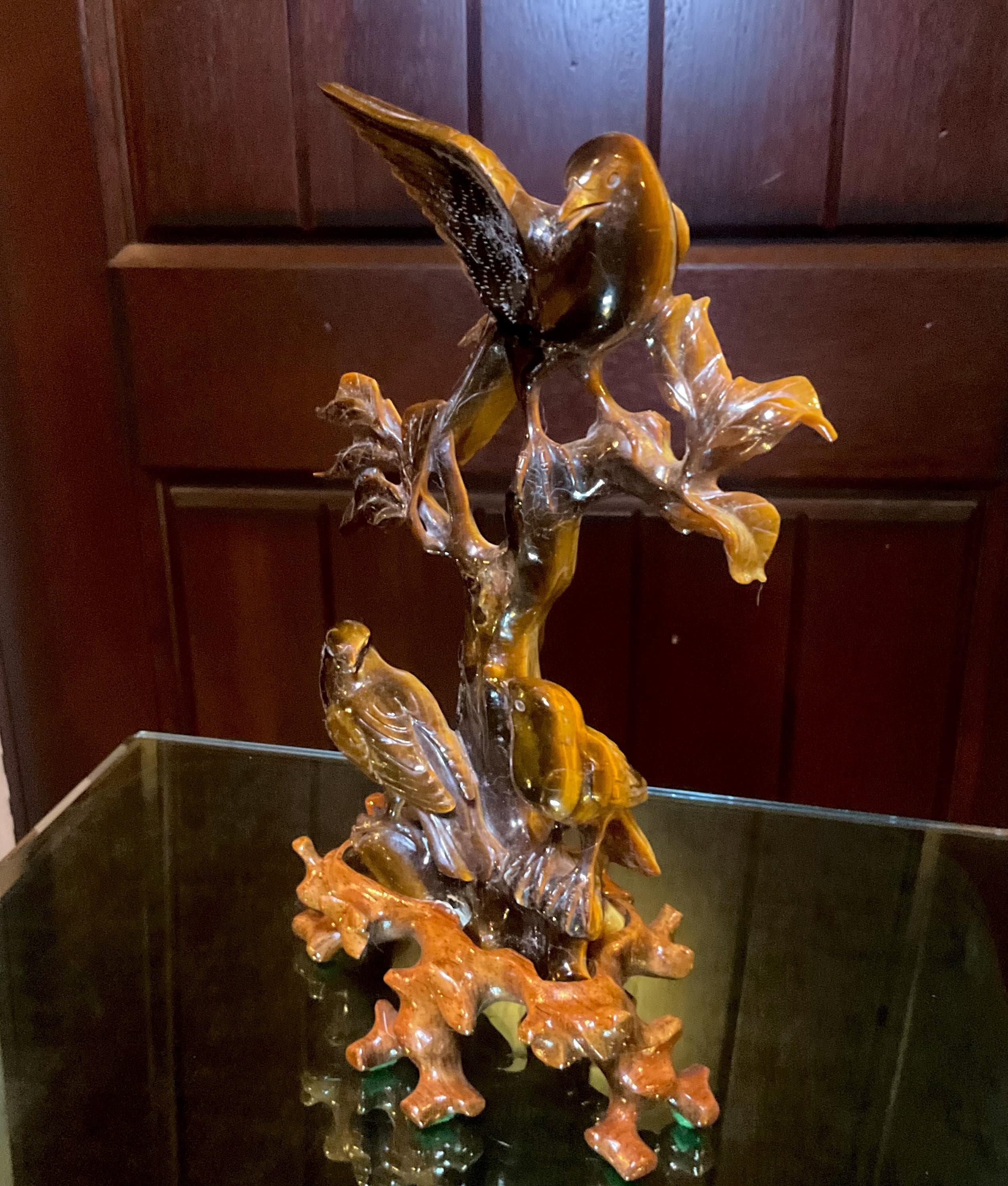 Tigers Eye Birds Crystal Carving ~ 7" Tall ~ Vintage Hand Carved Sculpture from Japan ~ Sparkling Red Gold & Black Colors